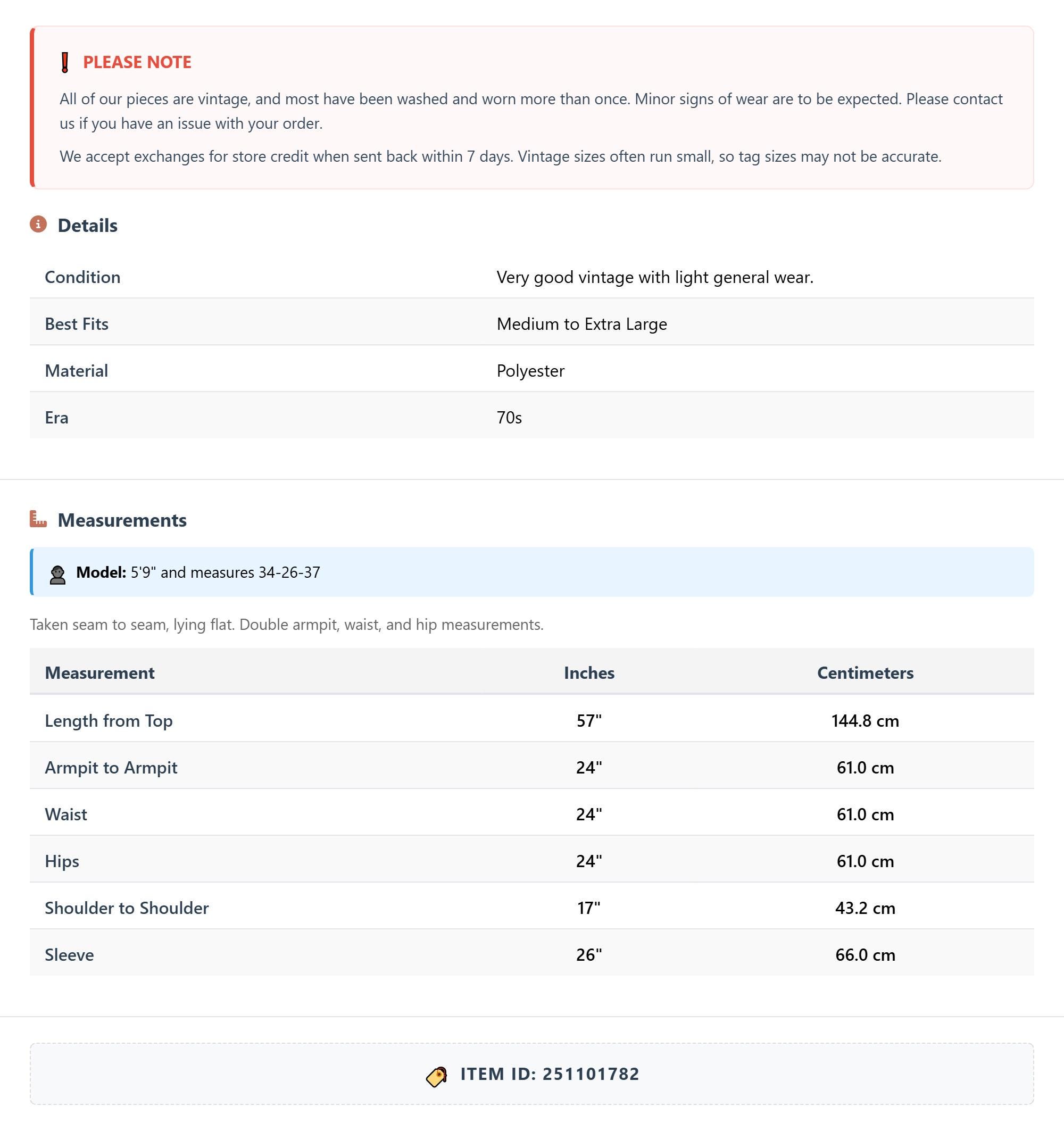 Measurements are taken laying flat and should be doubled where applicable. The "best fits" size is just an estimate, and vintage sizing can vary from modern sizing. Please use measurements to ensure proper fit. The best thing to do is measure a similar item of your own, and compare. When an item has stretch, we will list the unstretched dimensions with the stretched measurement afterwards.