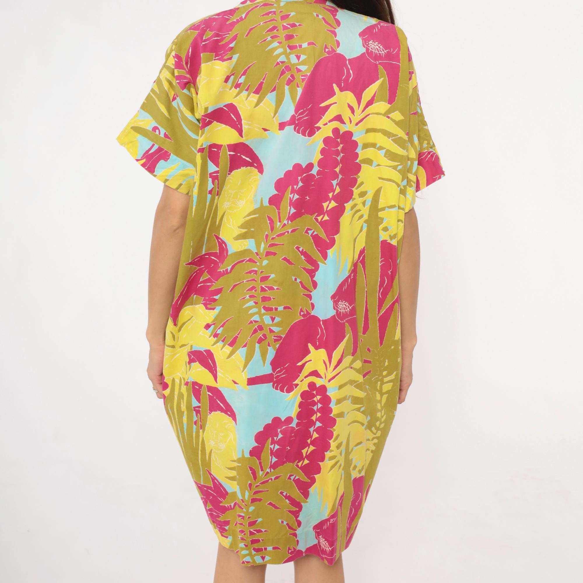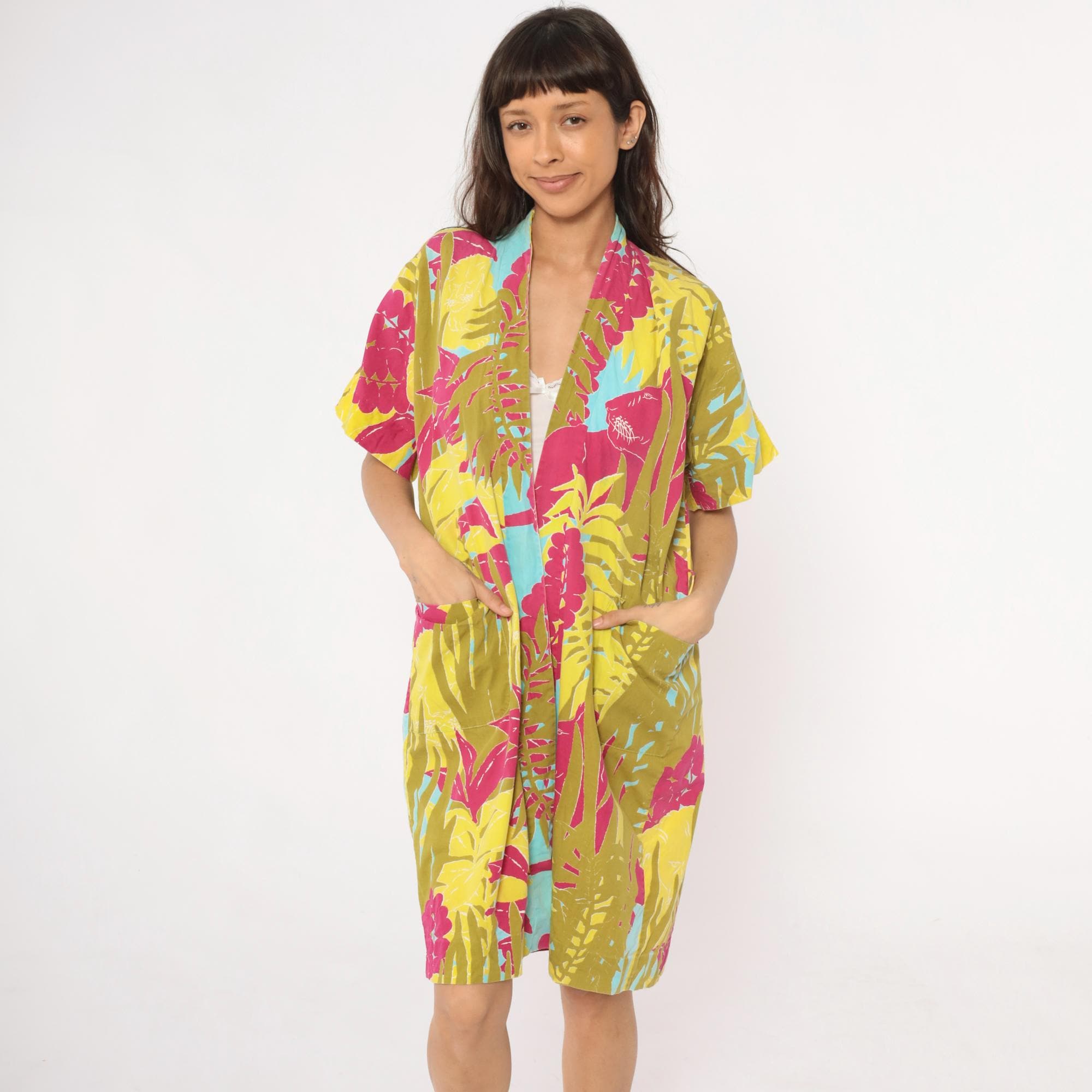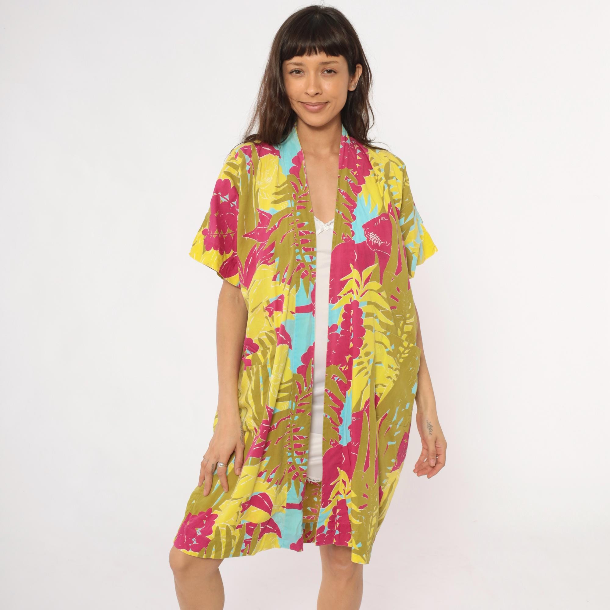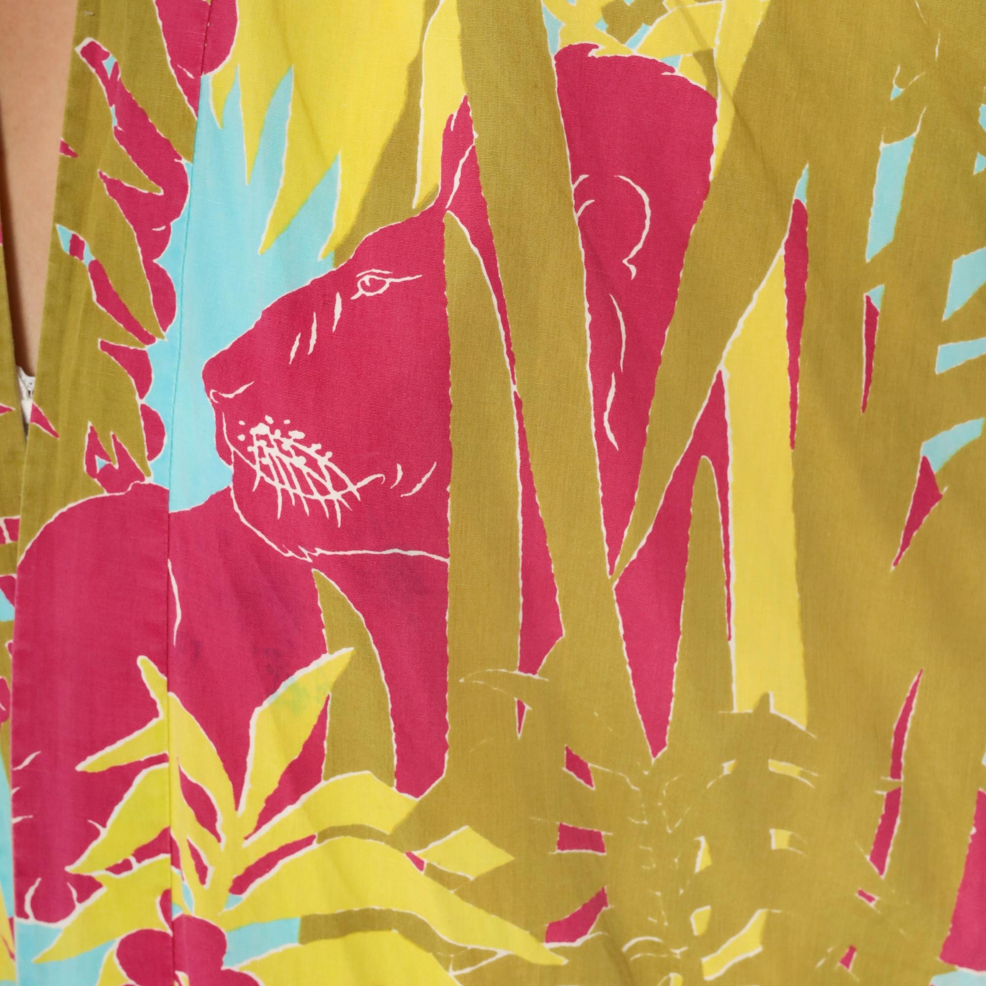 80s kimono robe with jungle foliage and lion print in olive green, mustard yellow, magenta pink, and light blue. Open front design with short sleeves and knee length. Lions depicted among tropical leaves and plants throughout the print.
