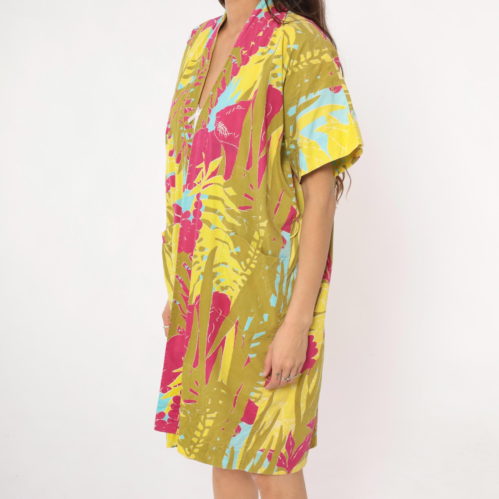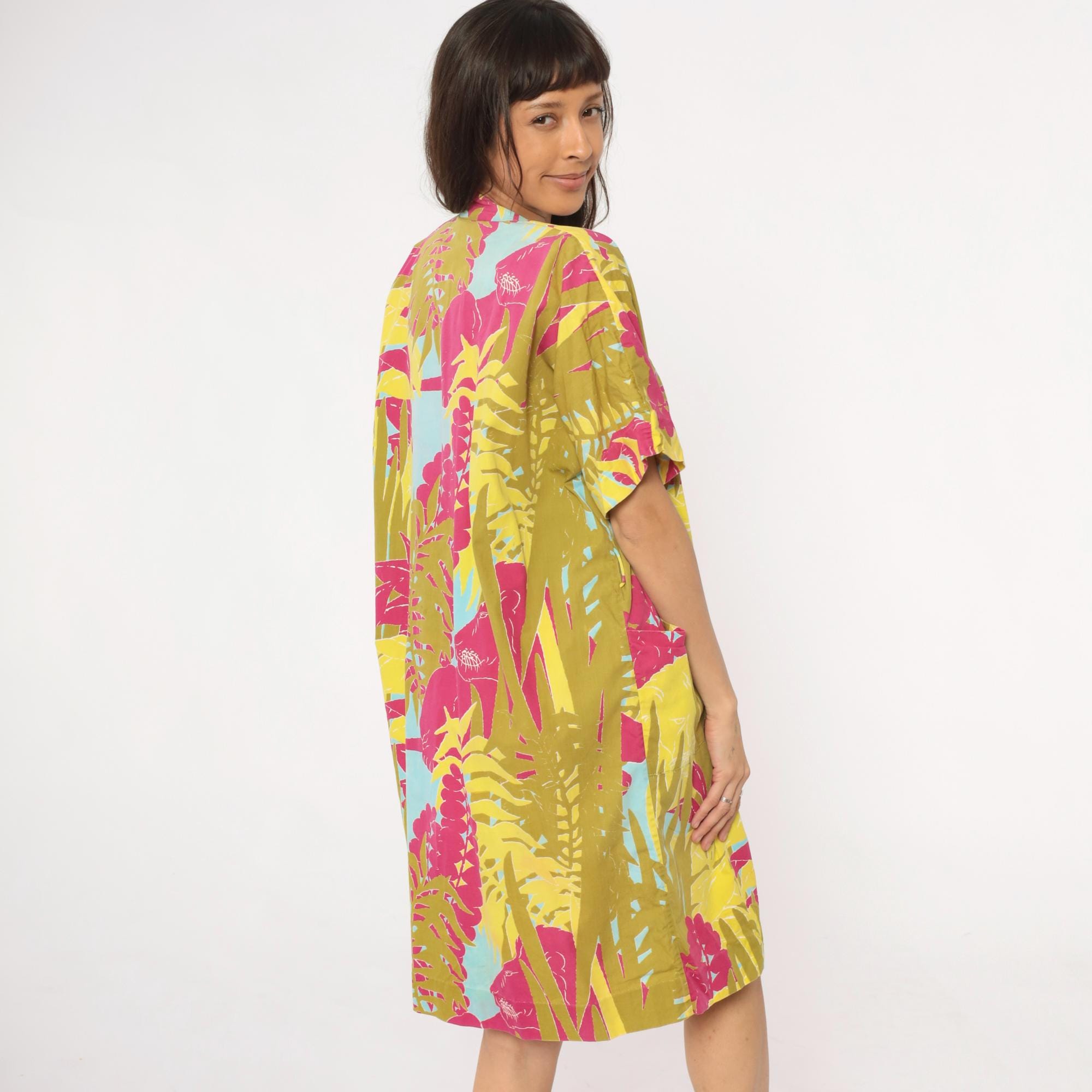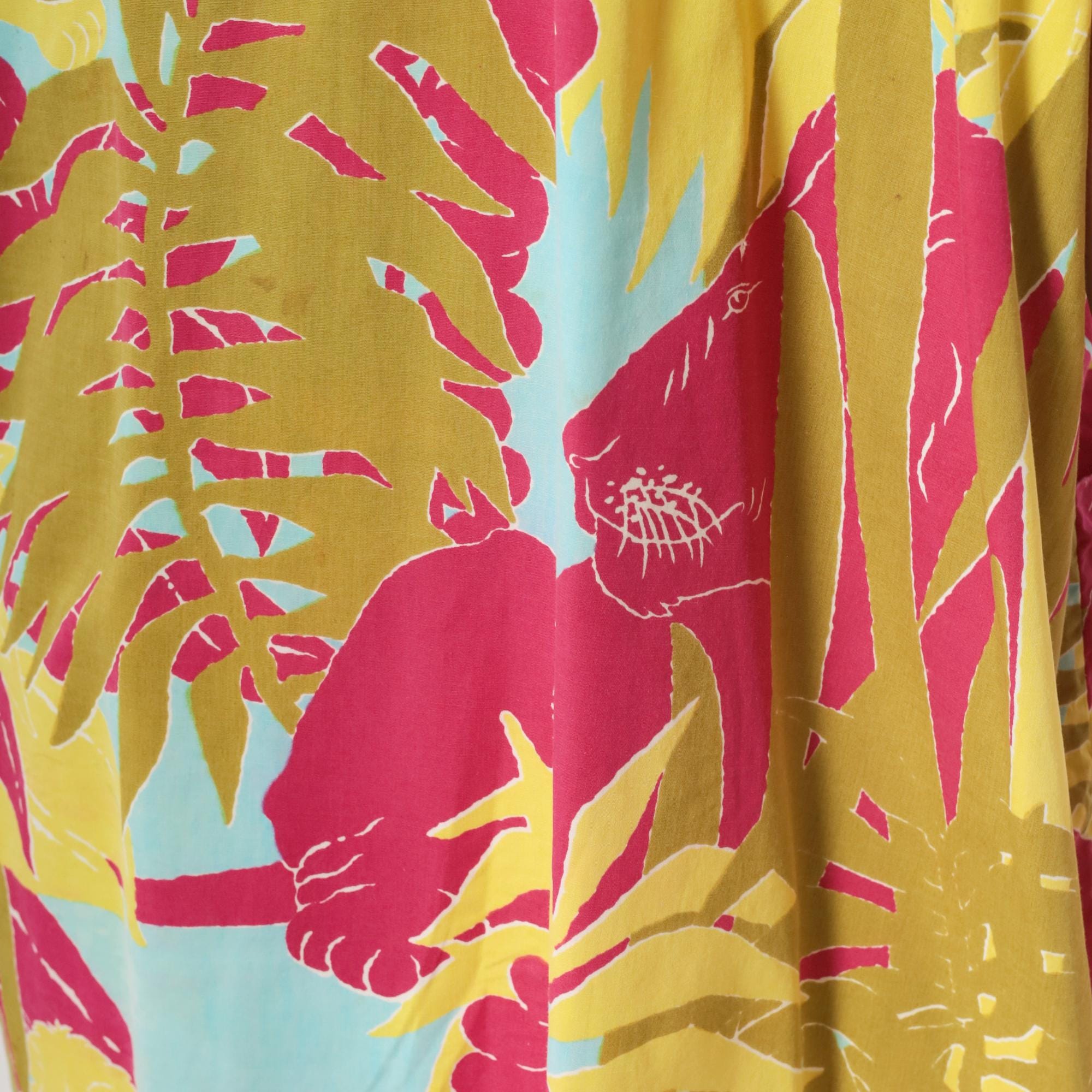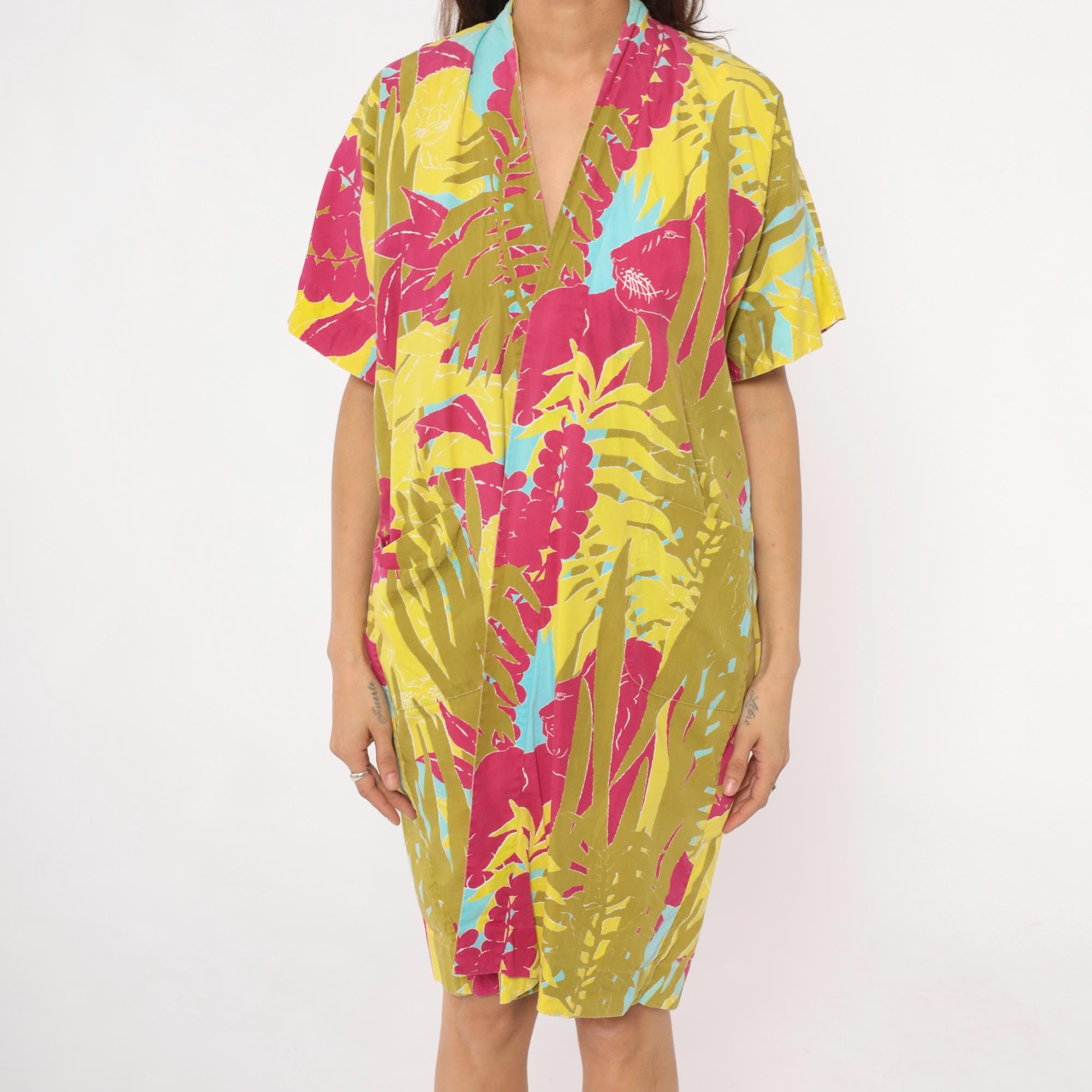 80s kimono robe with jungle foliage and lion print in olive green, mustard yellow, magenta pink, and light blue. Open front design with short sleeves and knee length. Lions depicted among tropical leaves and plants throughout the print.