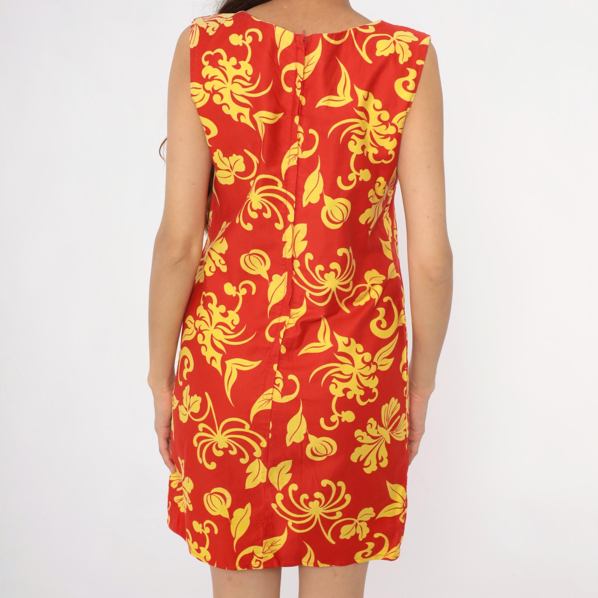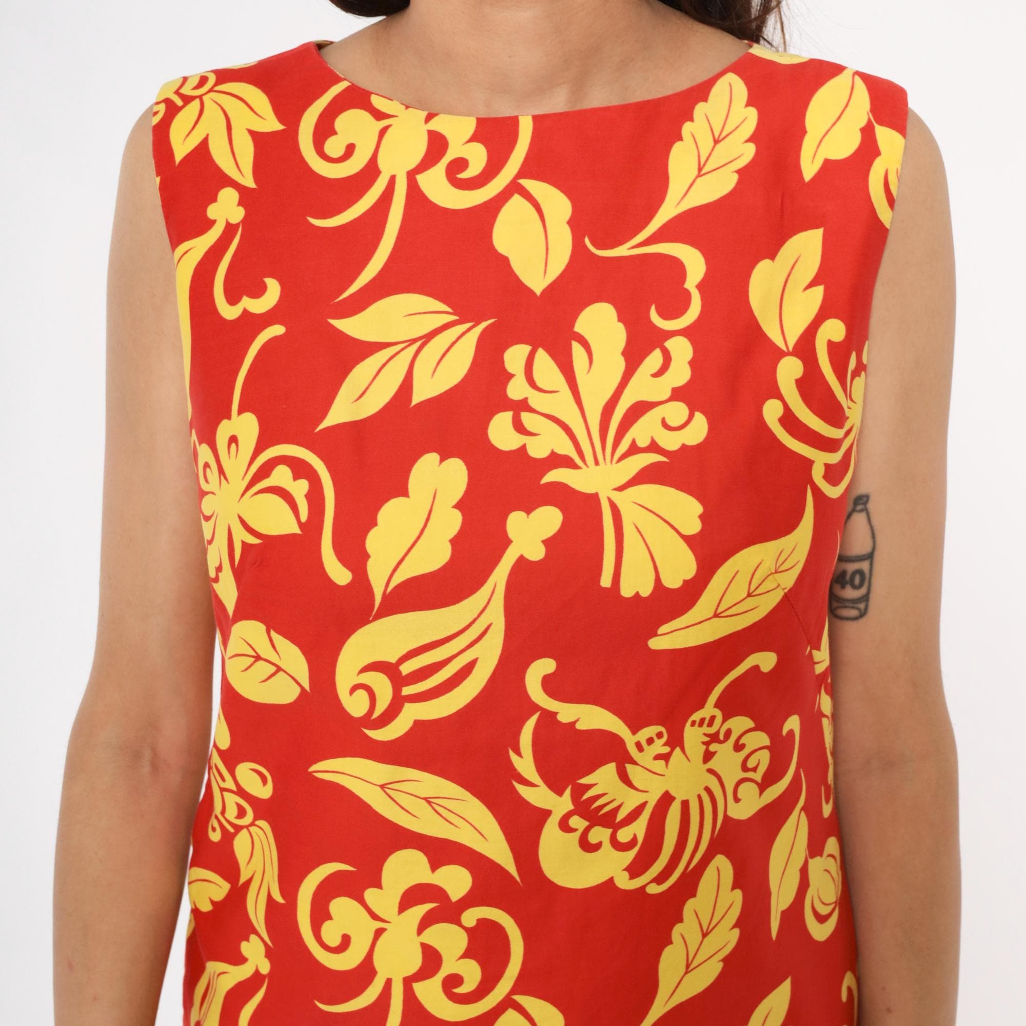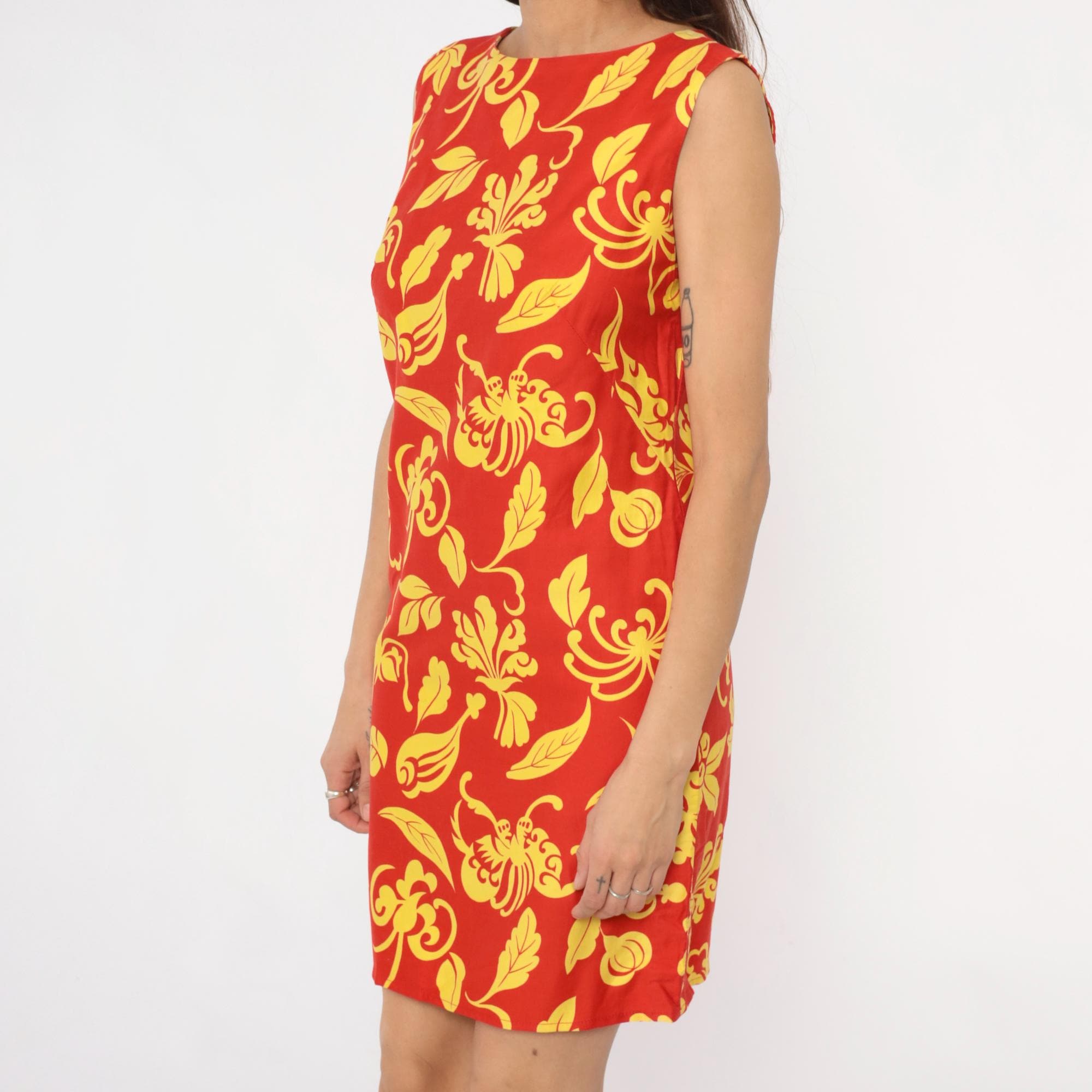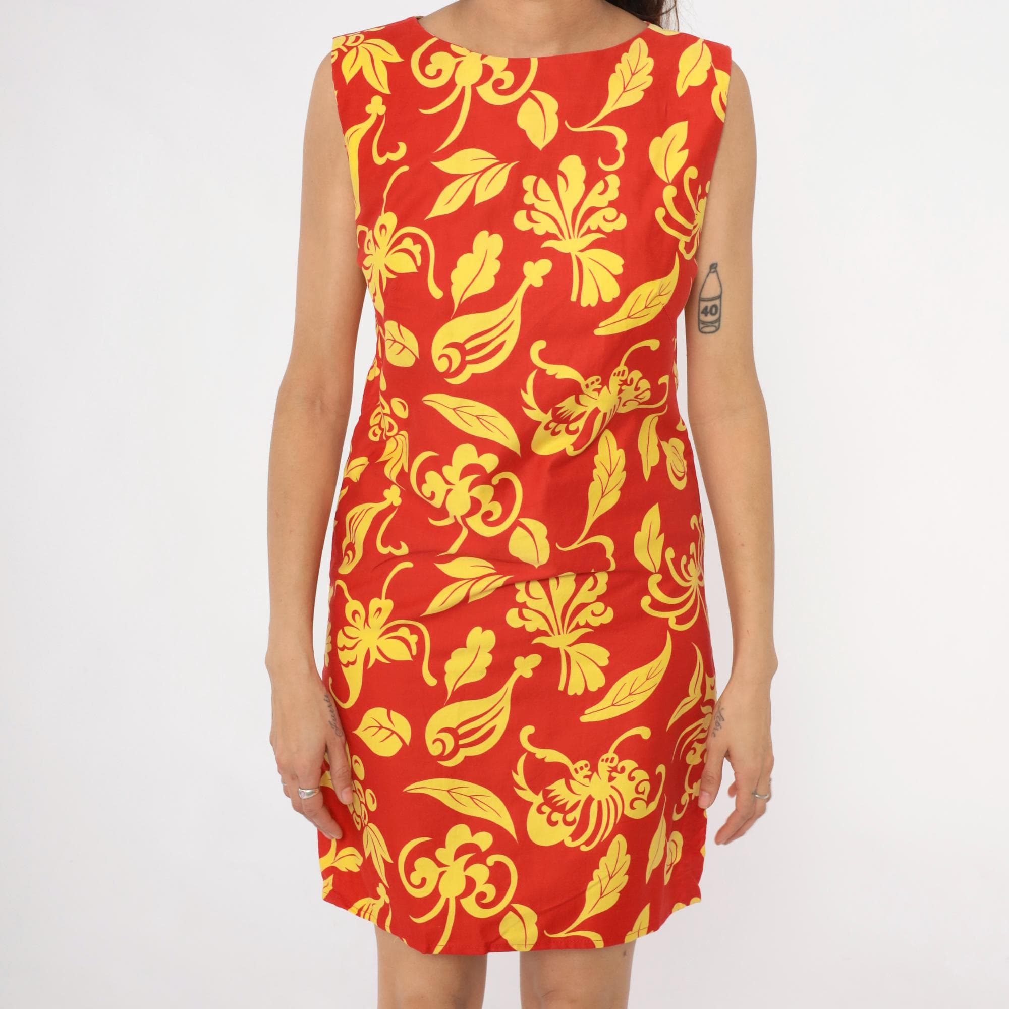 90s red and yellow floral shift dress with large-scale decorative print featuring scrolling leaves and botanical motifs across the fabric. Sleeveless with boat neckline, straight shift silhouette, and back zipper closure.