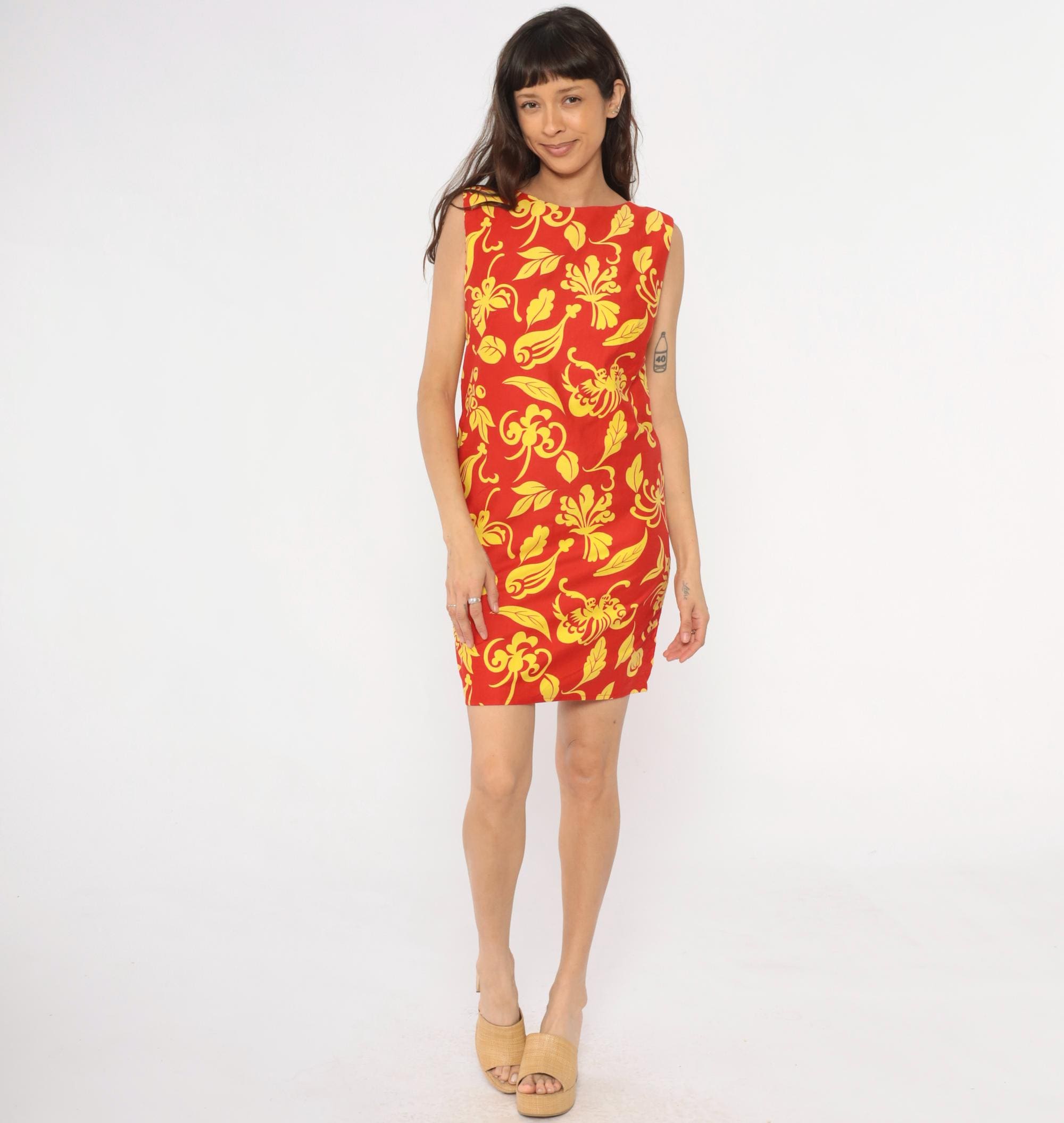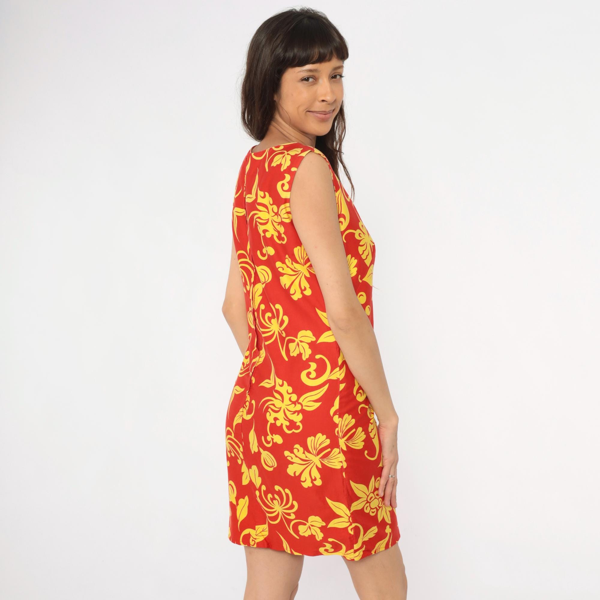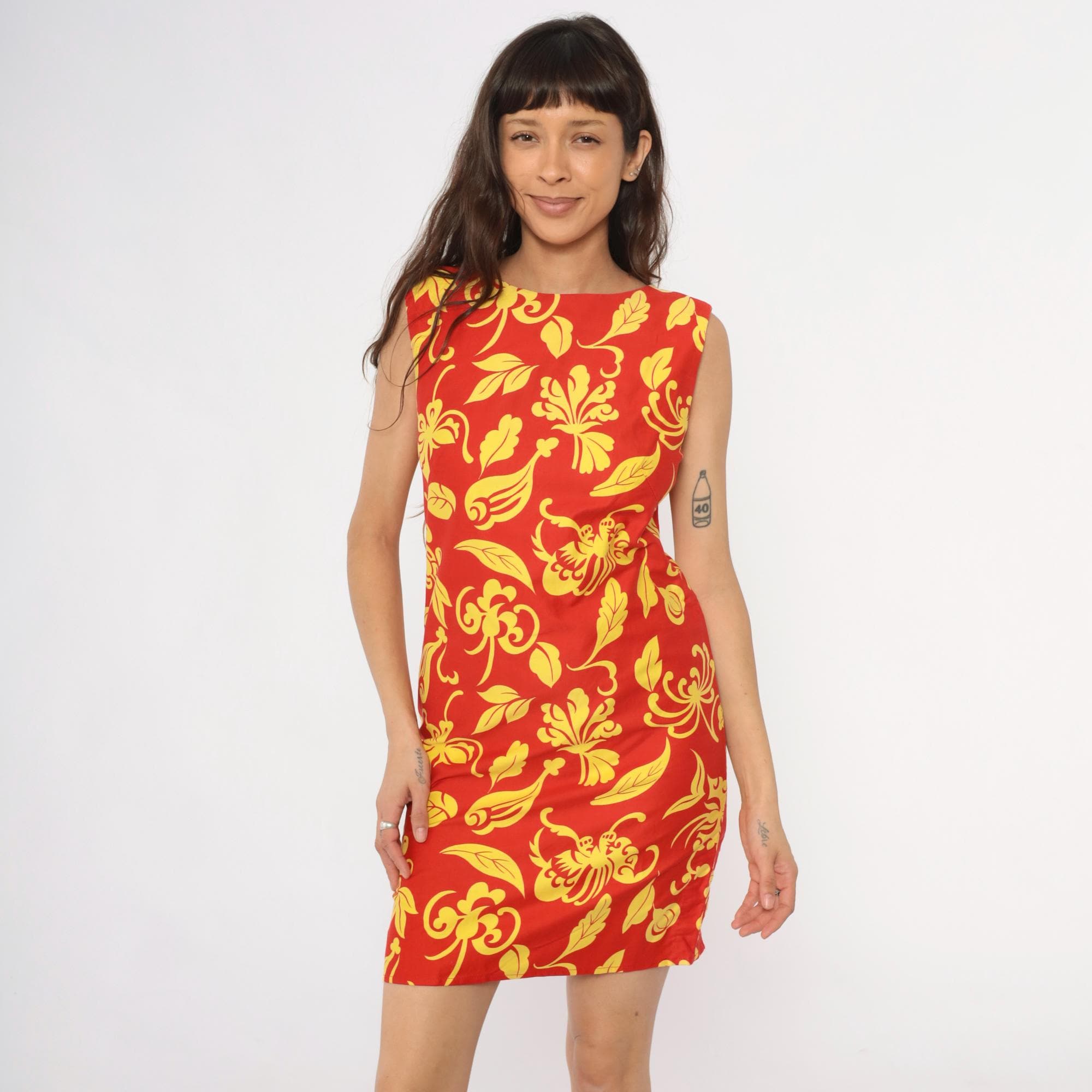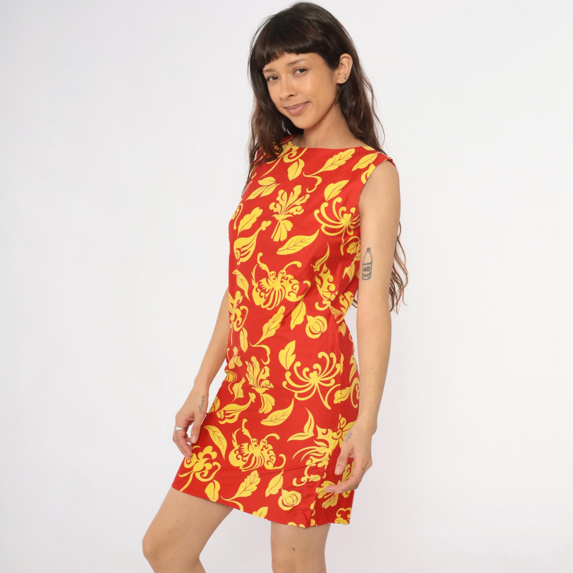 90s red and yellow floral shift dress with large-scale decorative print featuring scrolling leaves and botanical motifs across the fabric. Sleeveless with boat neckline, straight shift silhouette, and back zipper closure.