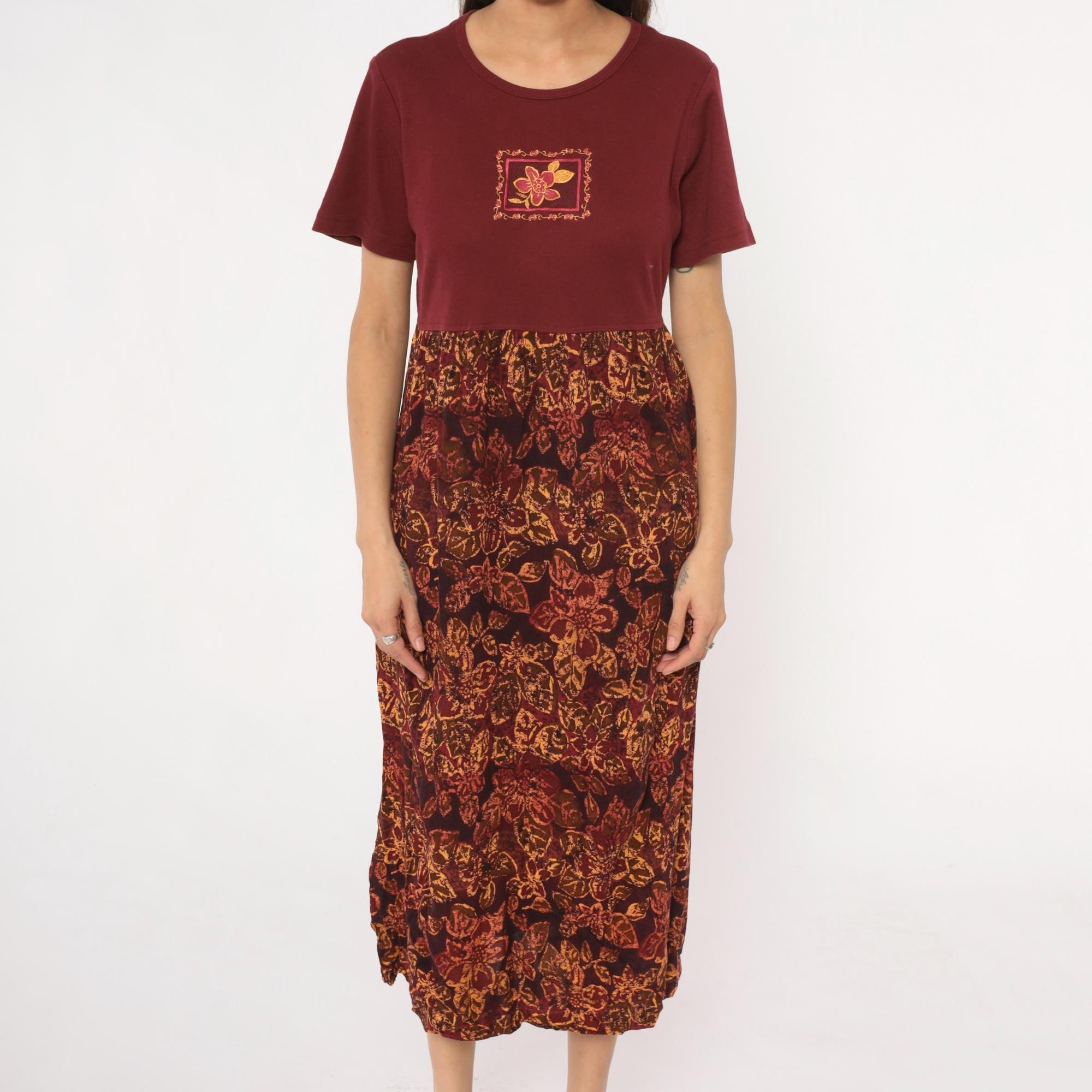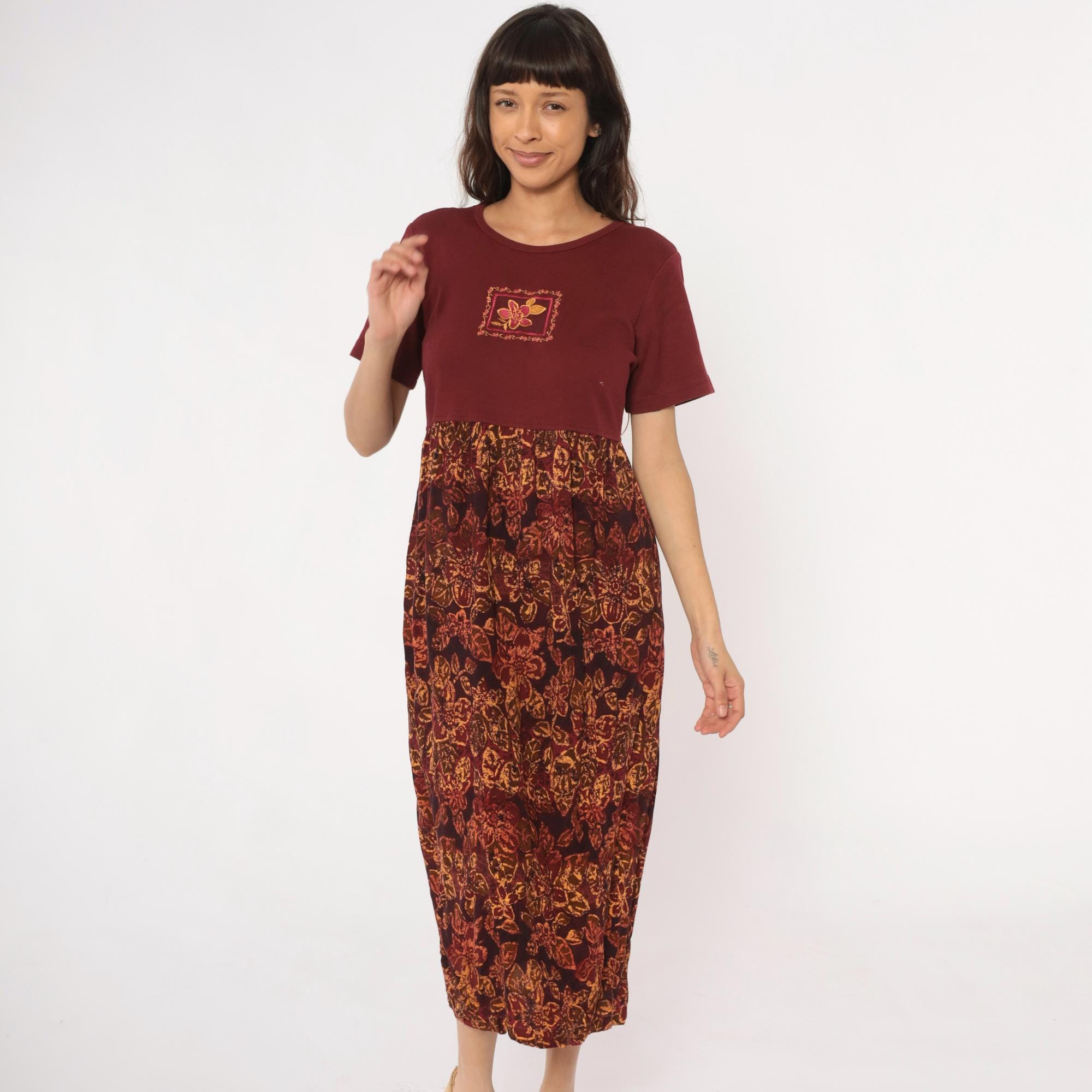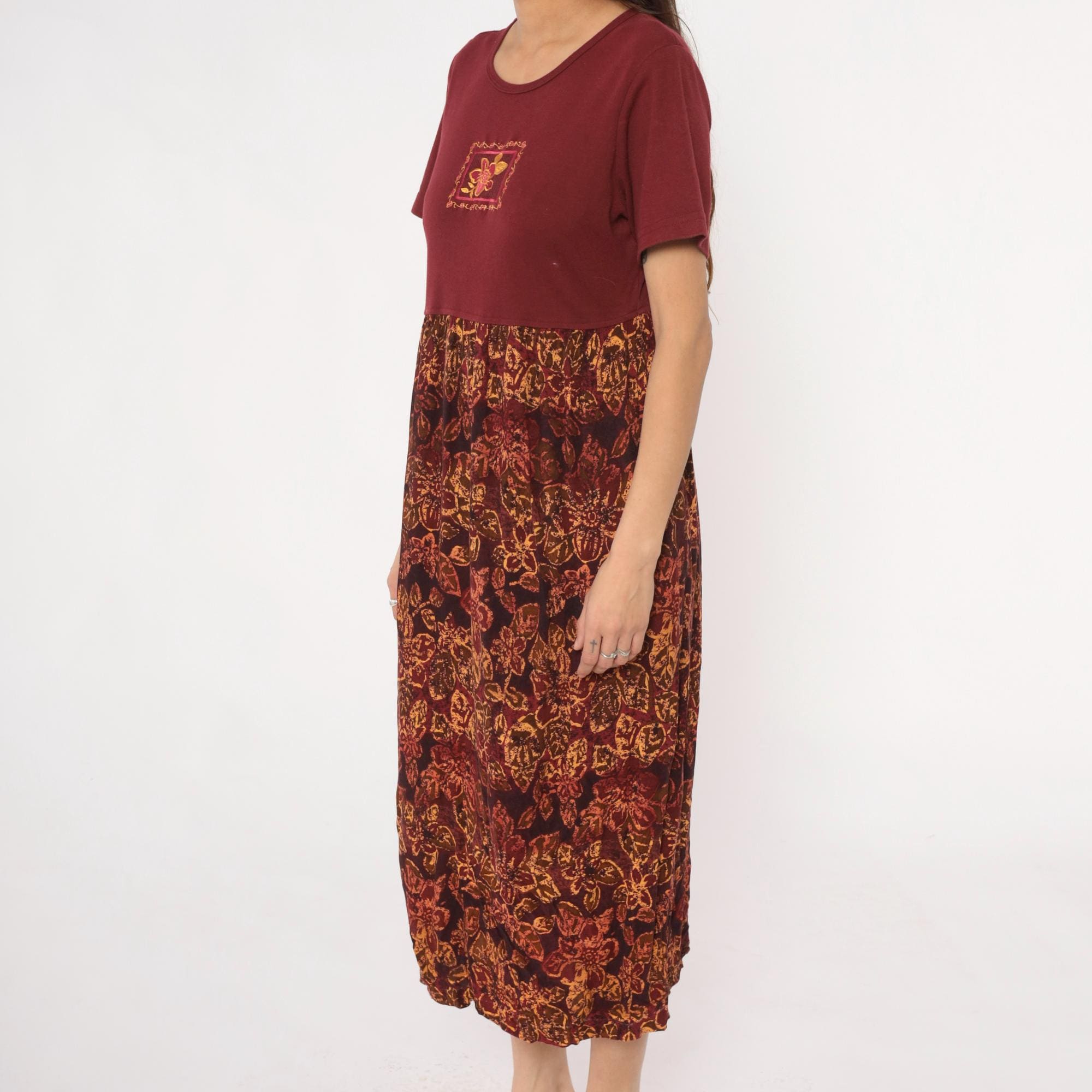 90s burgundy color block dress with solid maroon bodice and patterned rayon skirt. Orange and gold floral print across the lower portion, embroidered flower motif on chest. Round neckline, short sleeves.