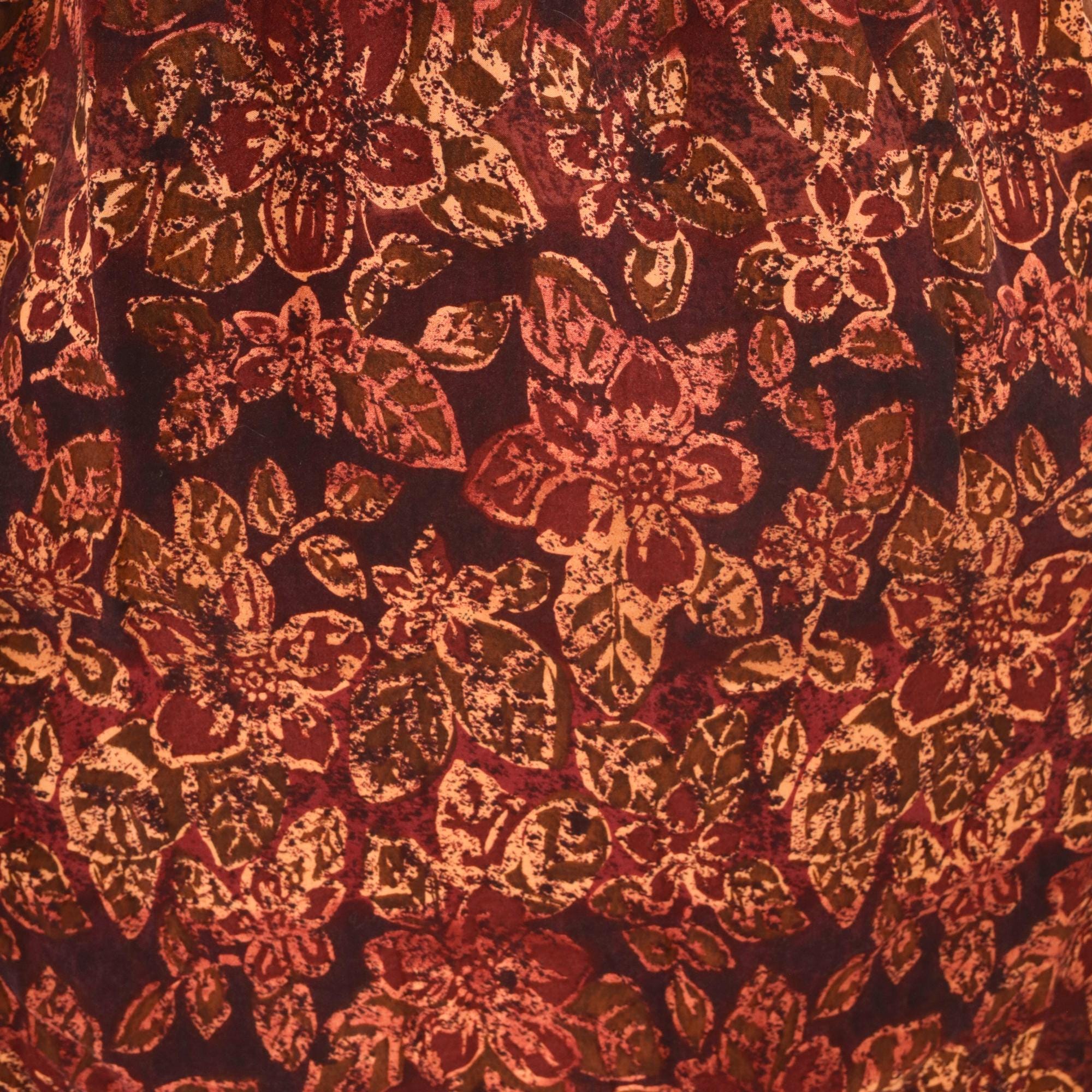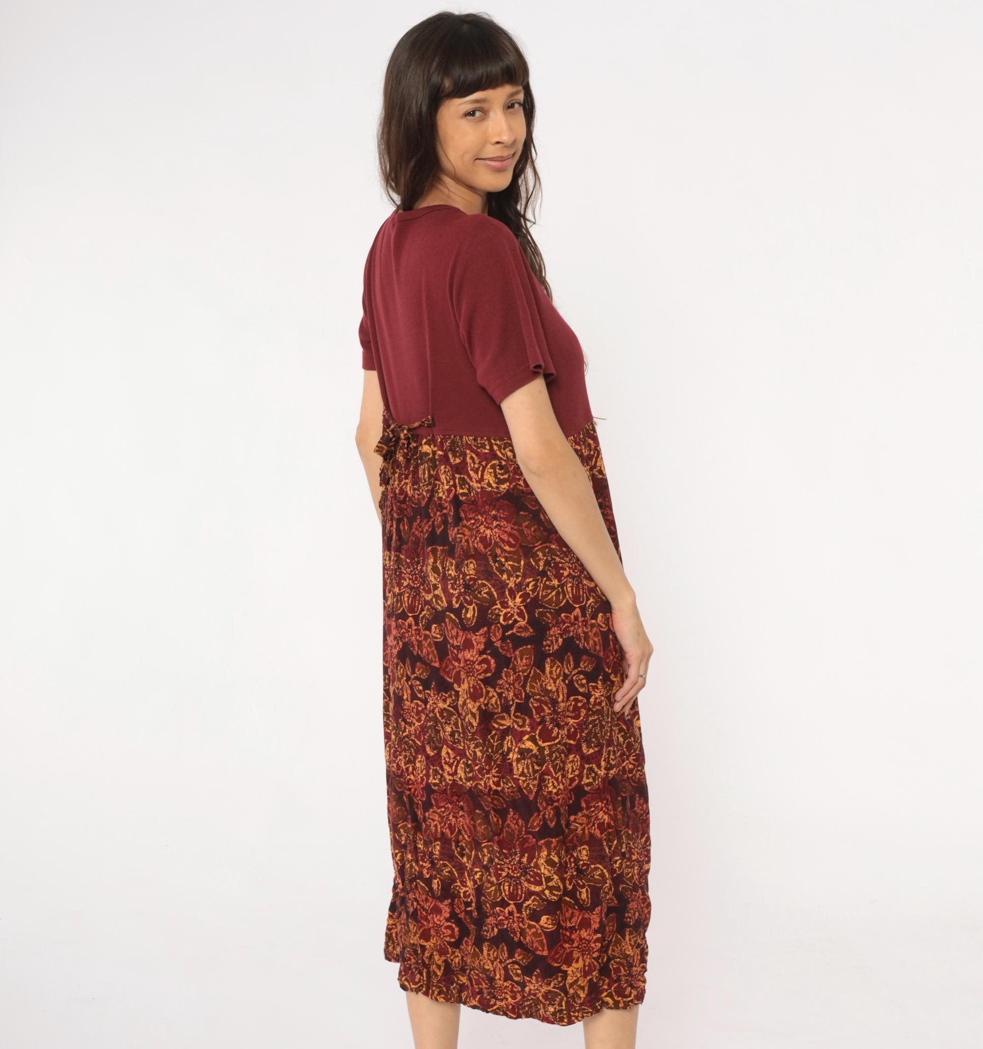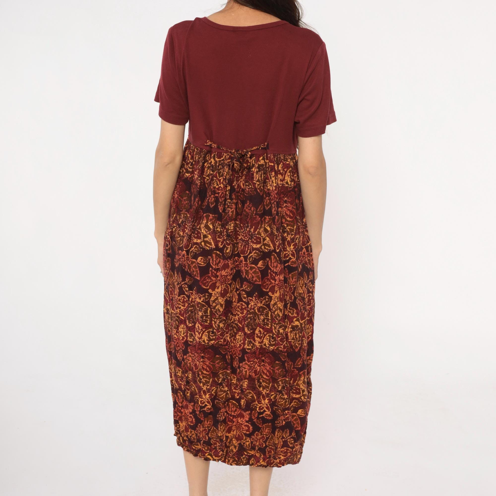 90s burgundy color block dress with solid maroon bodice and patterned rayon skirt. Orange and gold floral print across the lower portion, embroidered flower motif on chest. Round neckline, short sleeves.