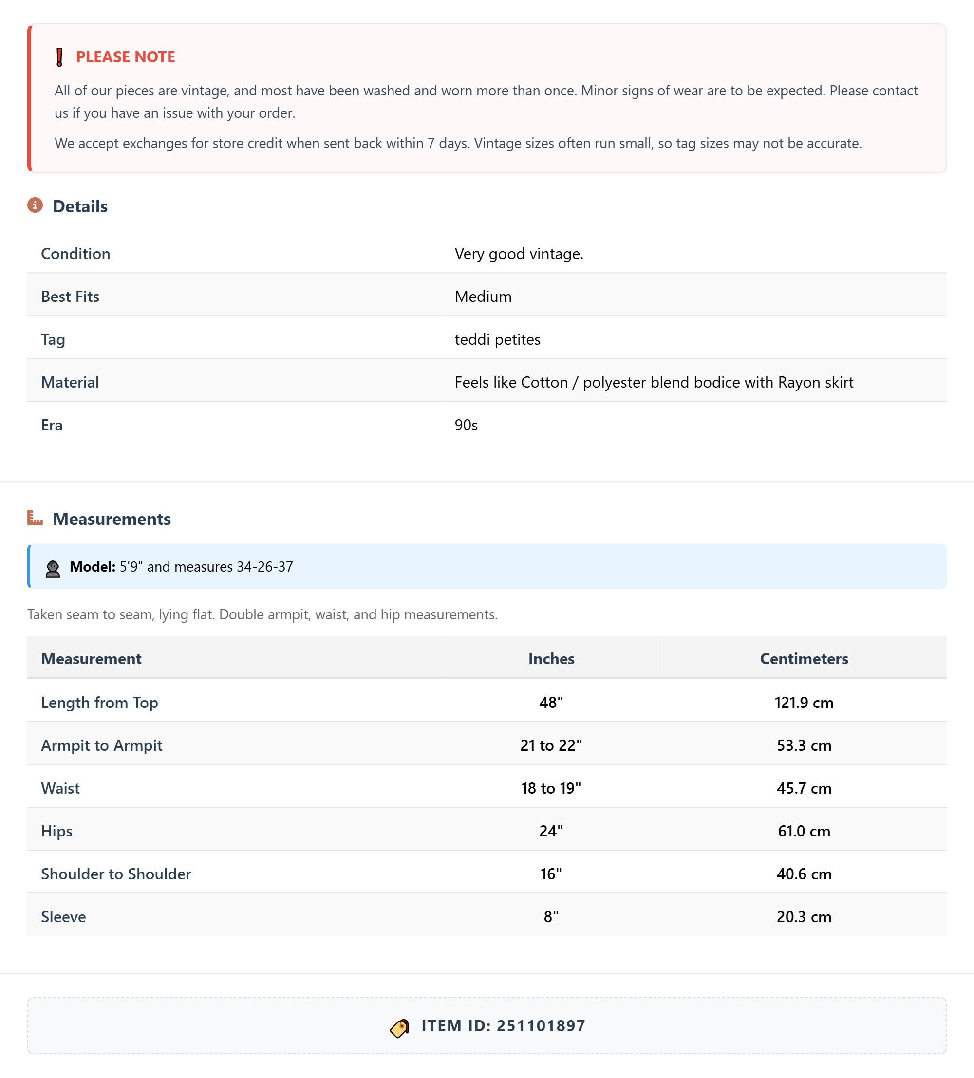 Measurements are taken laying flat and should be doubled where applicable. The "best fits" size is just an estimate, and vintage sizing can vary from modern sizing. Please use measurements to ensure proper fit. The best thing to do is measure a similar item of your own, and compare. When an item has stretch, we will list the unstretched dimensions with the stretched measurement afterwards.