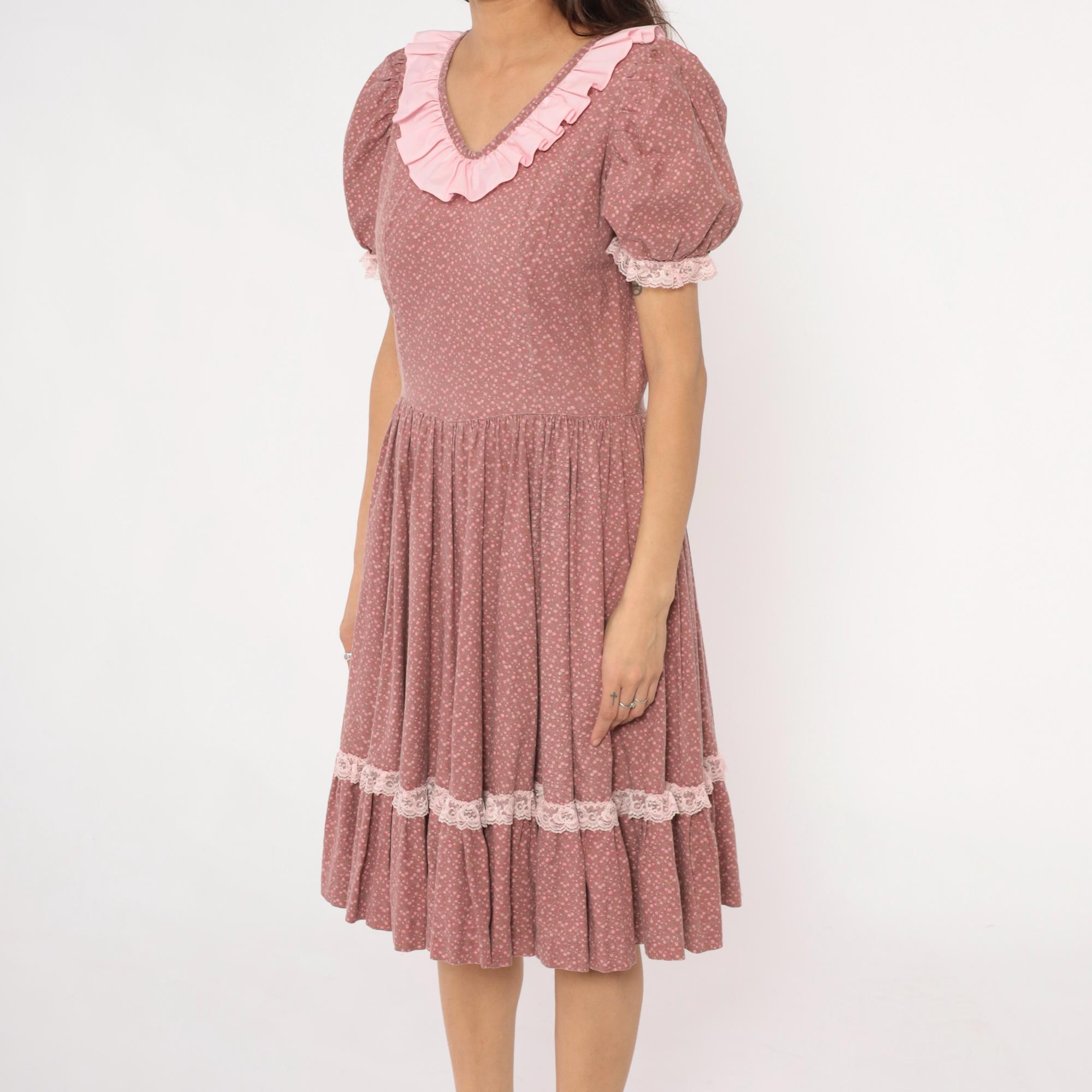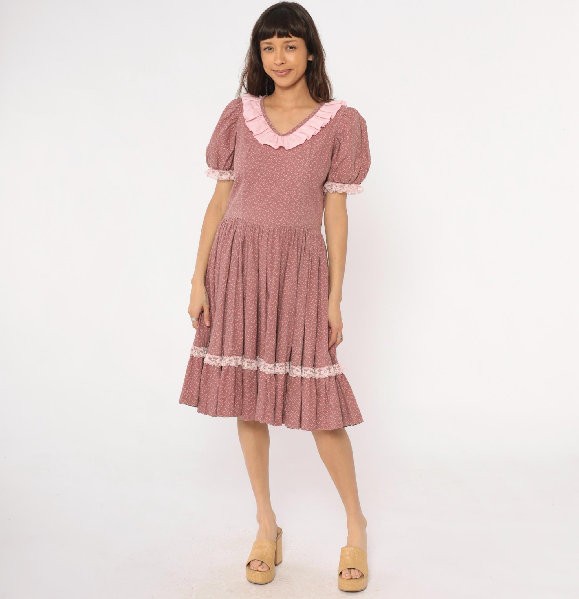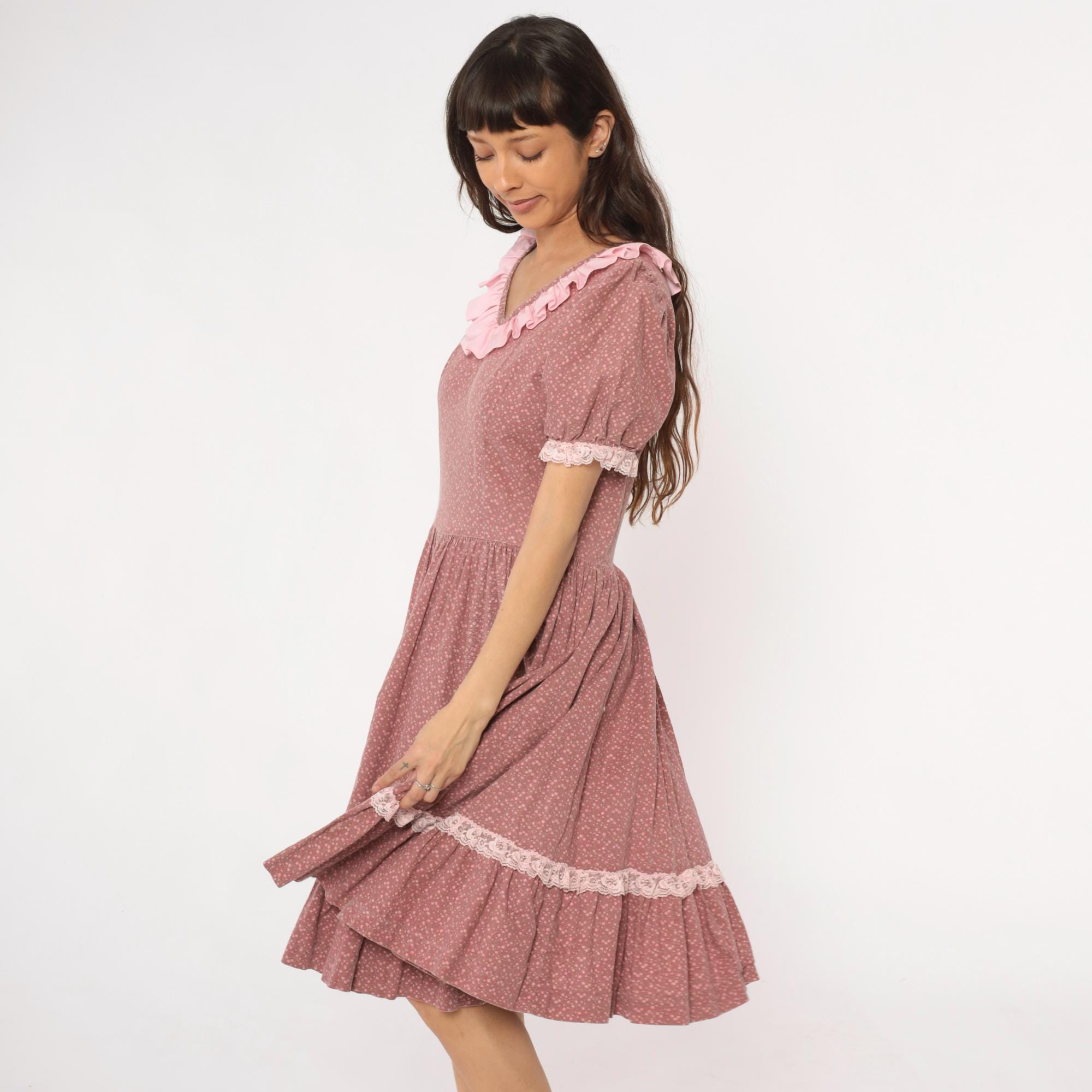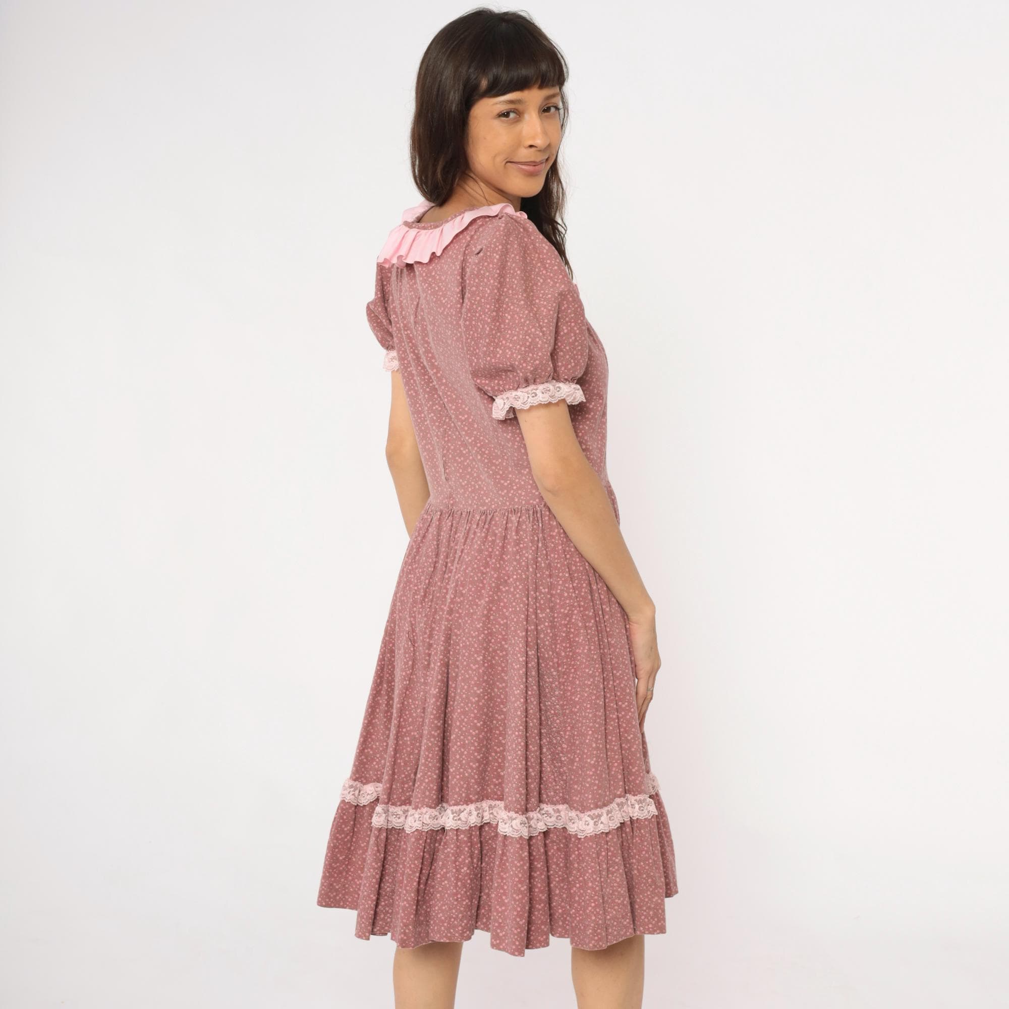 70s dusty rose prairie dress with small white floral print scattered across the fabric. Ruffle collar in solid pale pink, puff sleeves with white lace trim at cuffs, white lace trim at the tiered skirt. Fitted bodice with gathered waist, full A-line skirt with two tiers, back zipper closure.