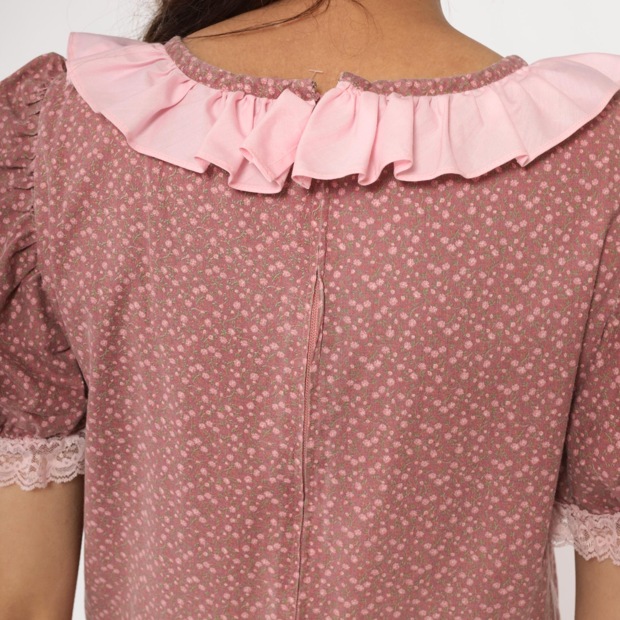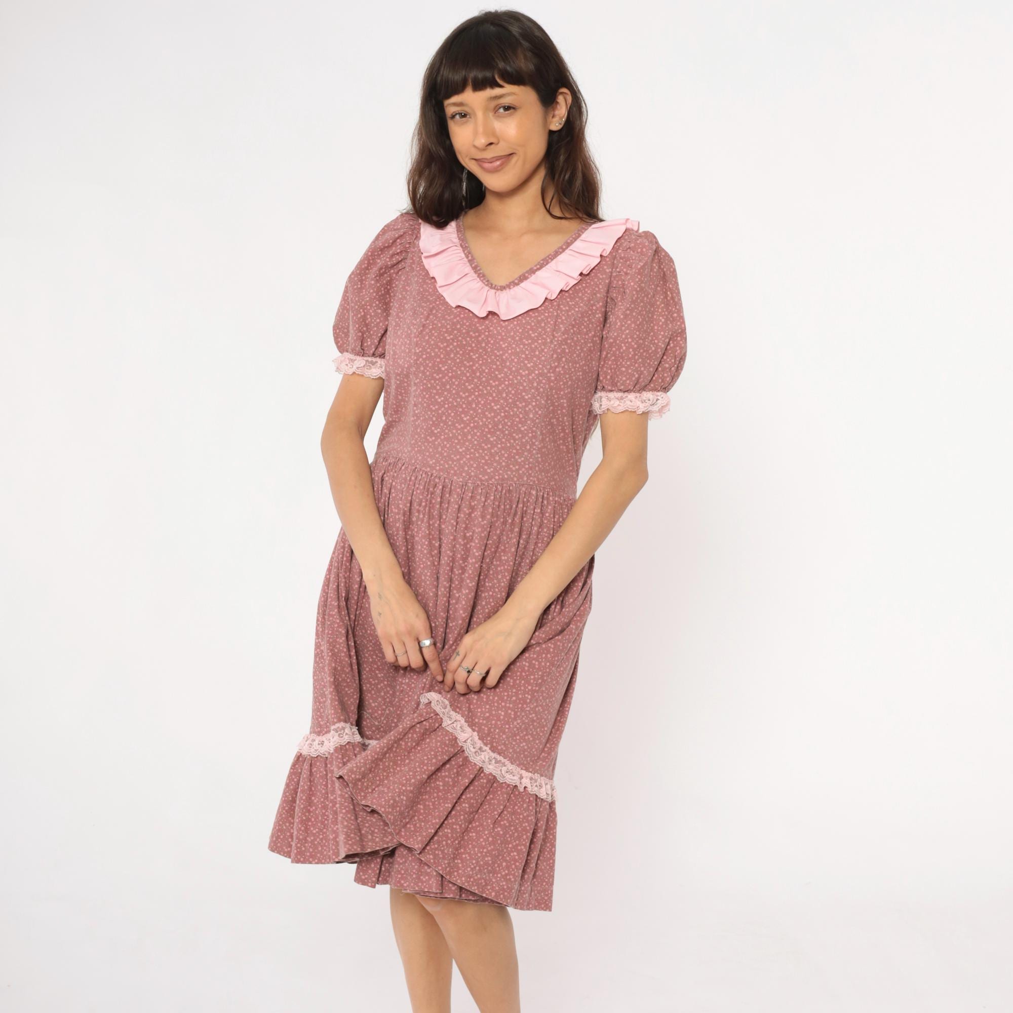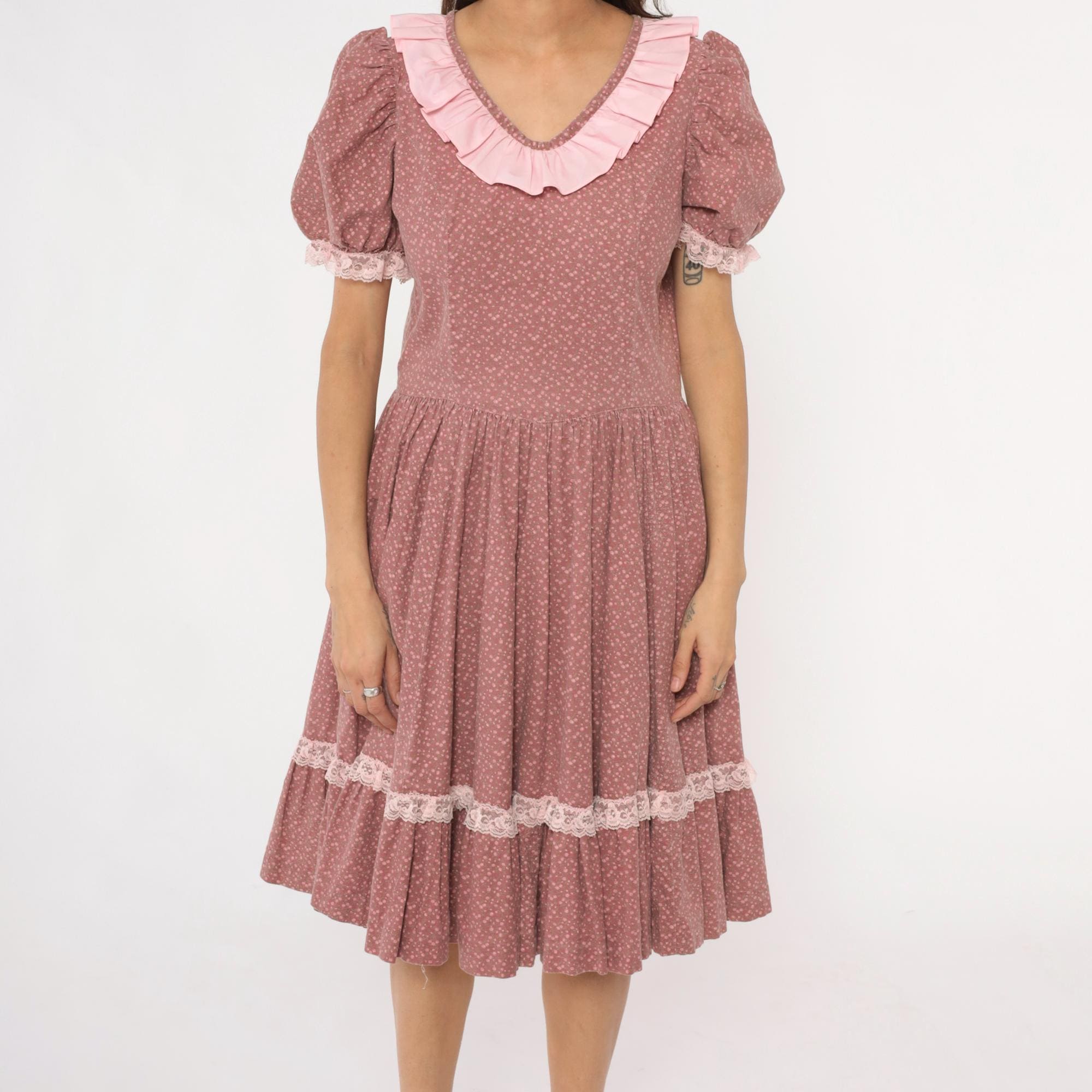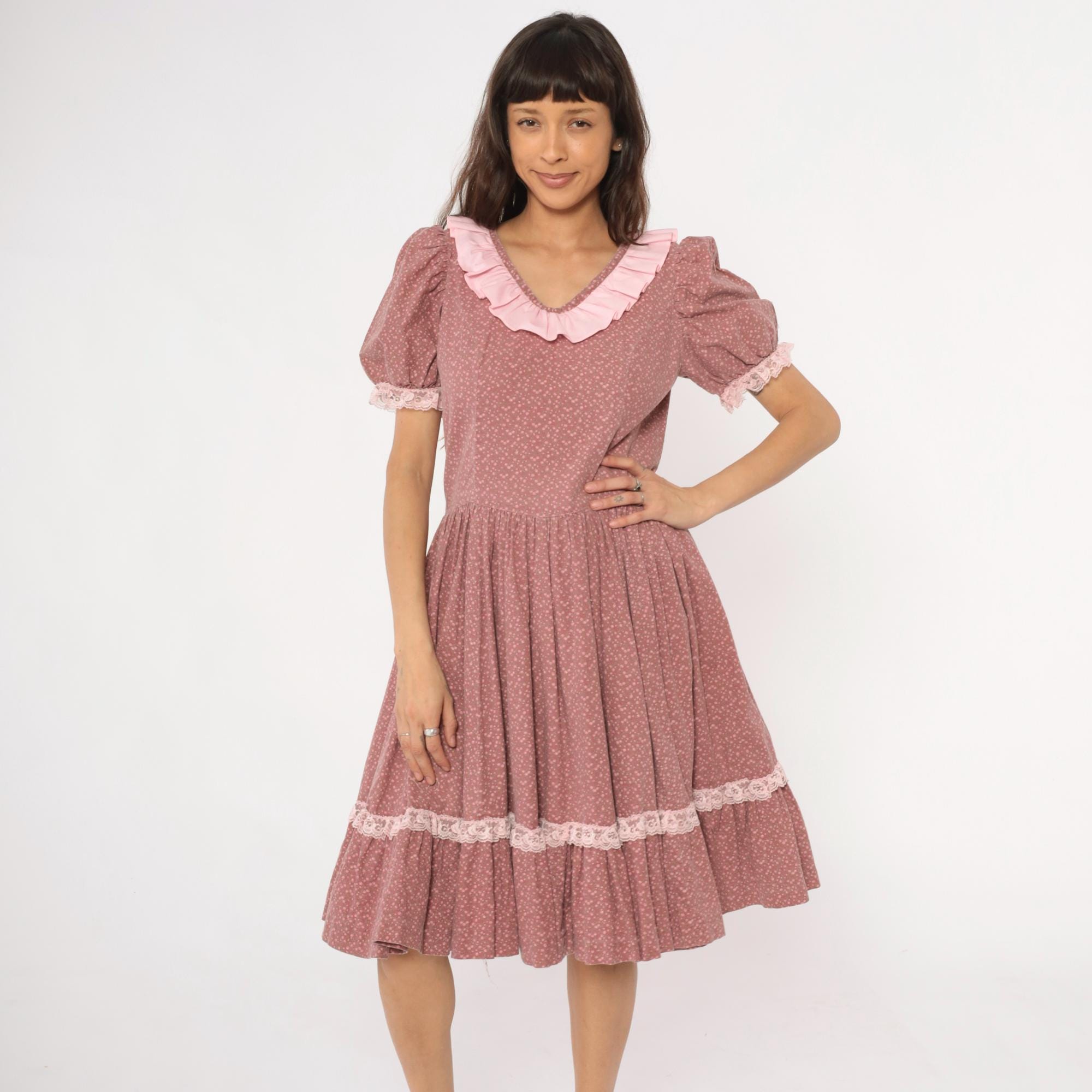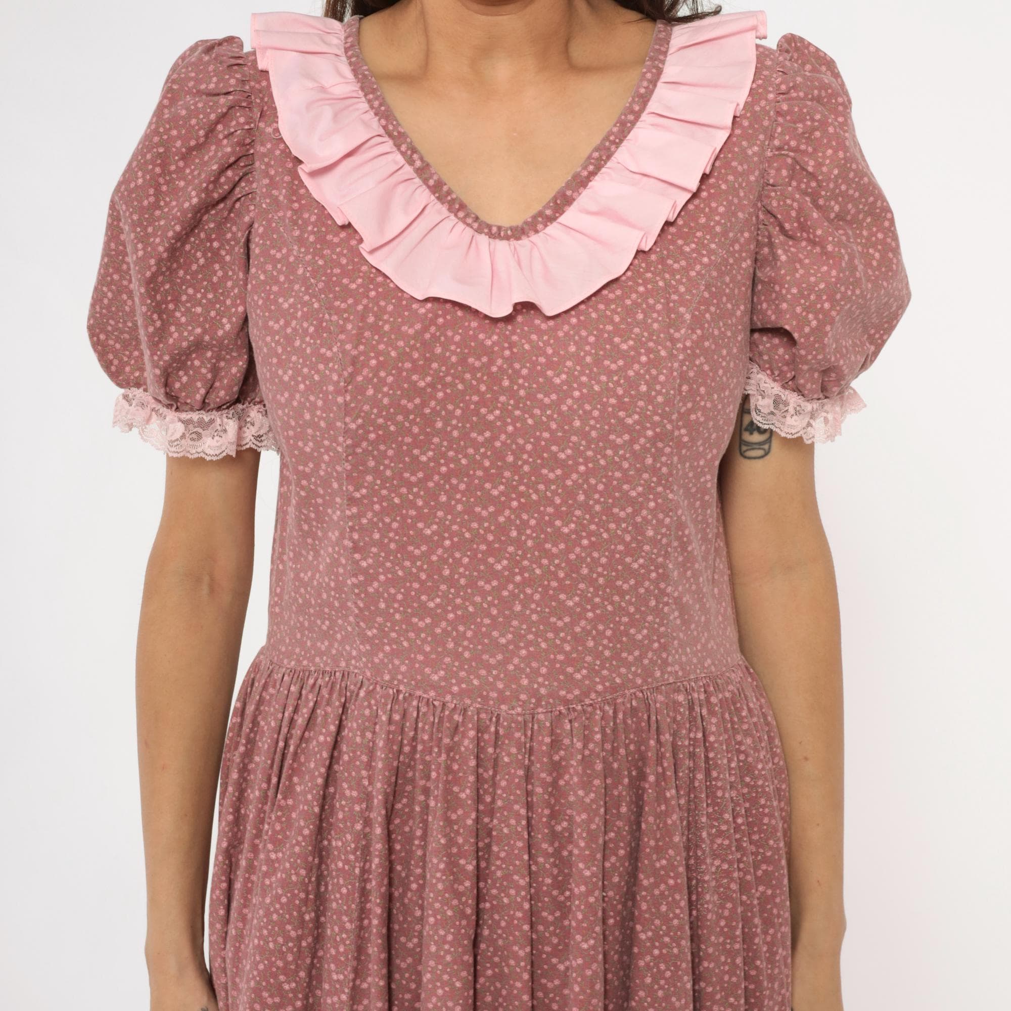 70s dusty rose prairie dress with small white floral print scattered across the fabric. Ruffle collar in solid pale pink, puff sleeves with white lace trim at cuffs, white lace trim at the tiered skirt. Fitted bodice with gathered waist, full A-line skirt with two tiers, back zipper closure.