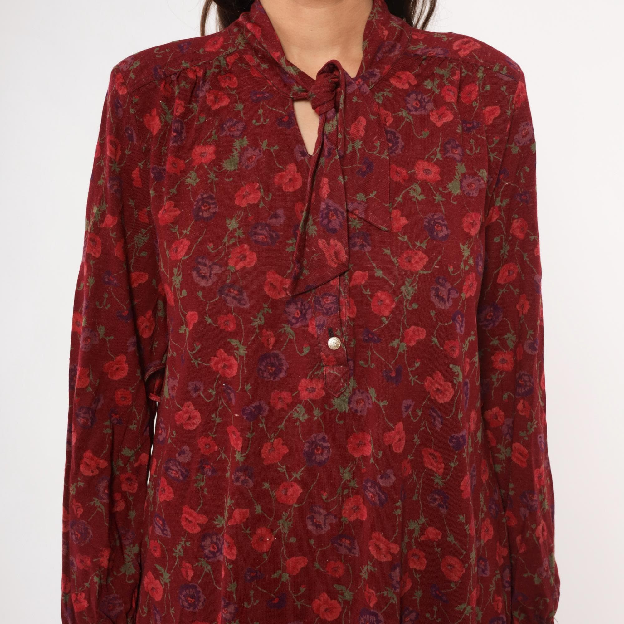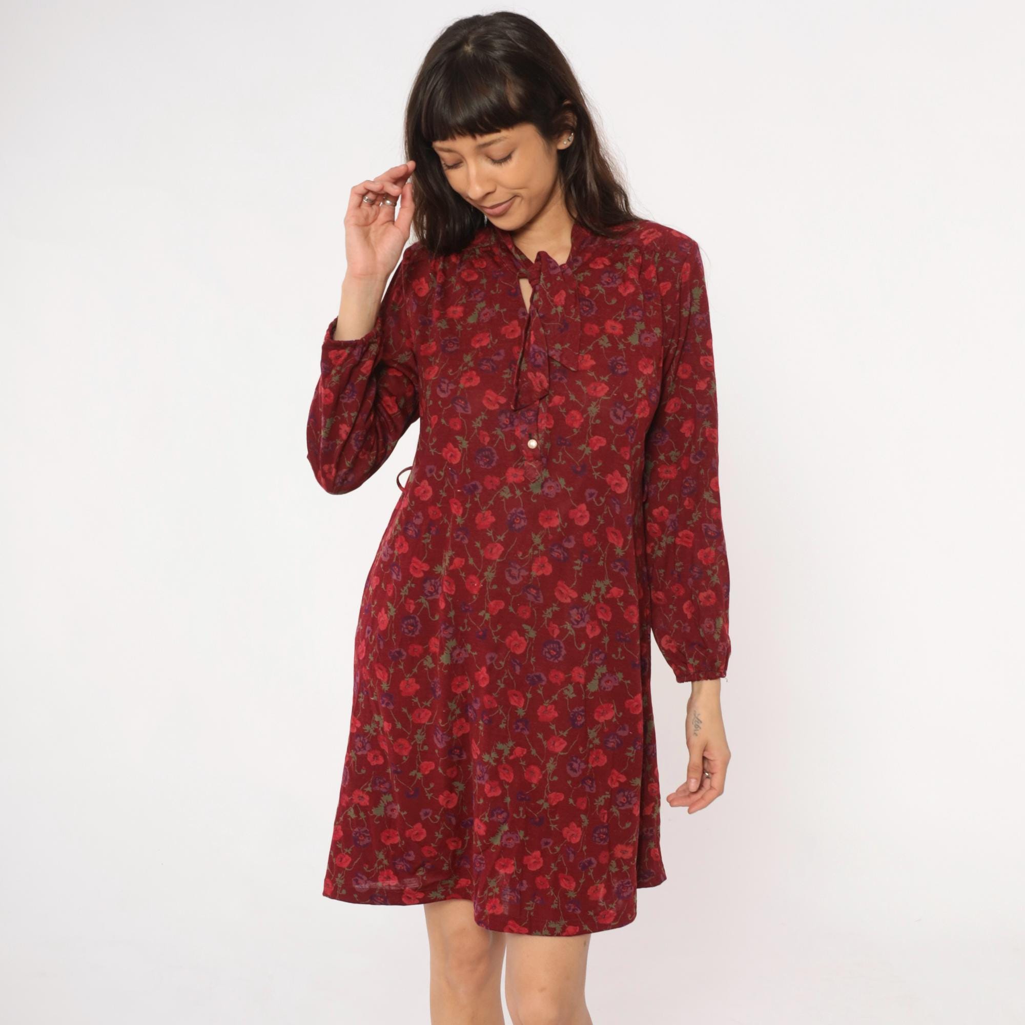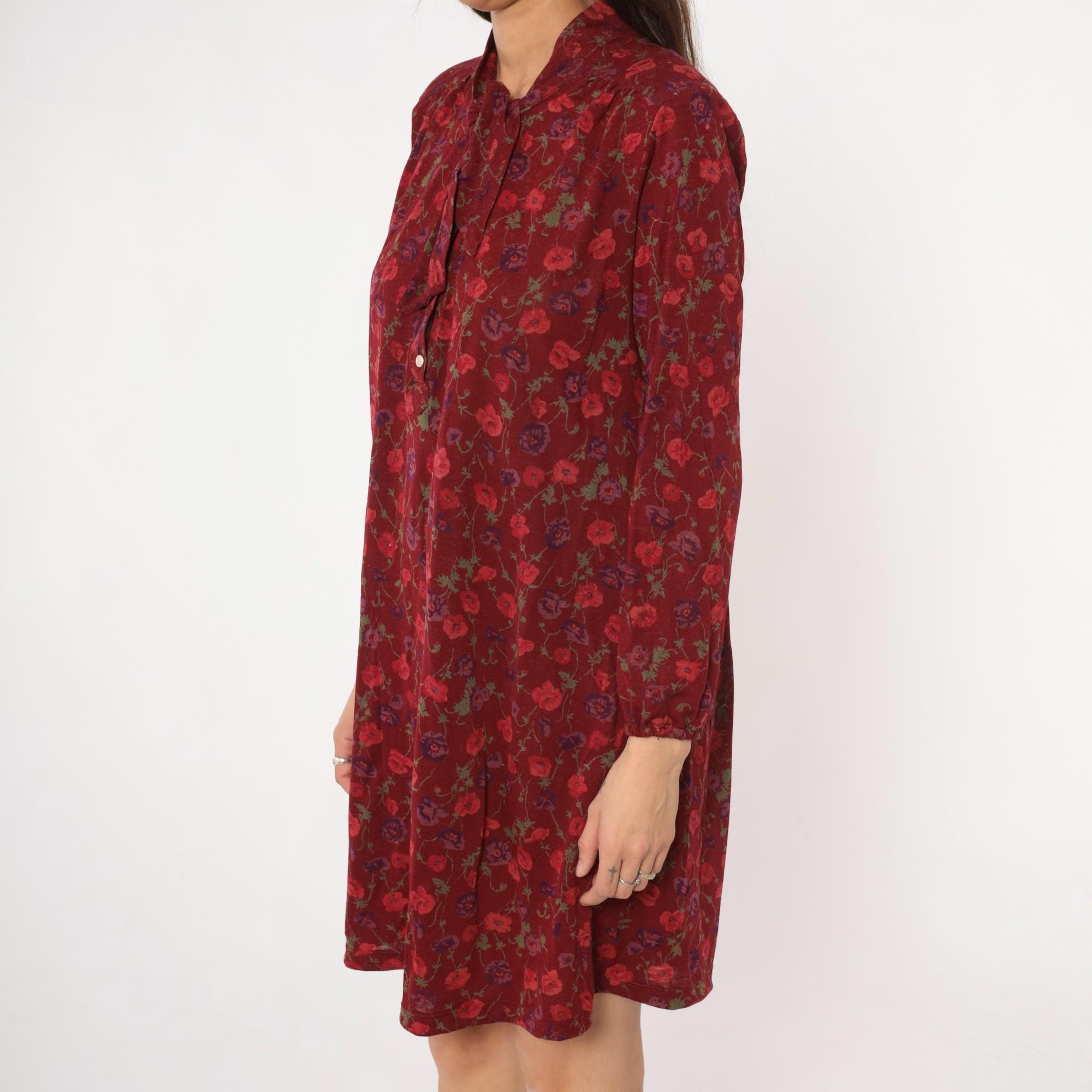 80s burgundy floral dress in wine-colored base with red, pink, and purple flowers across the fabric. Collar with neck tie detail, long sleeves, button front closure.