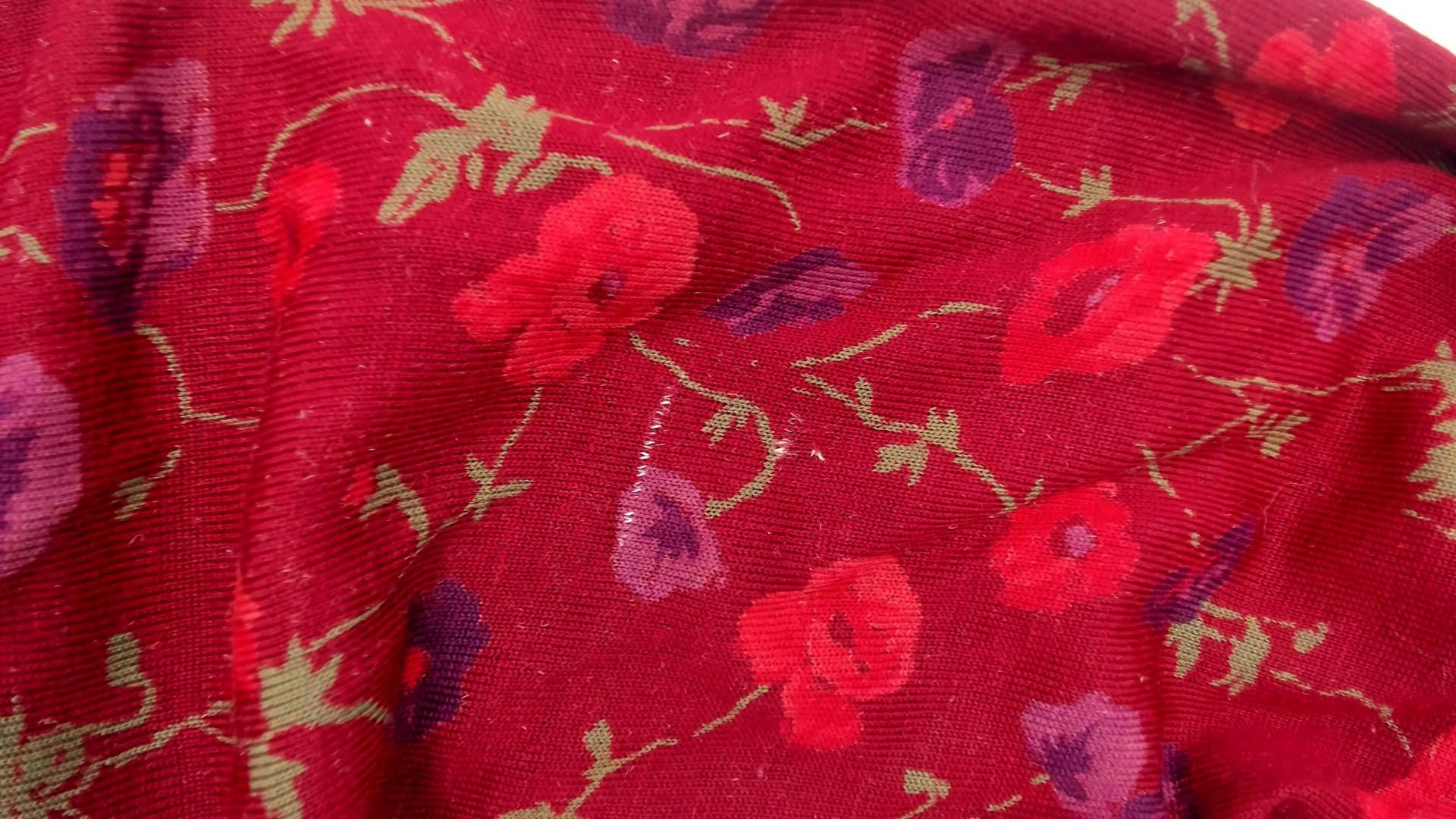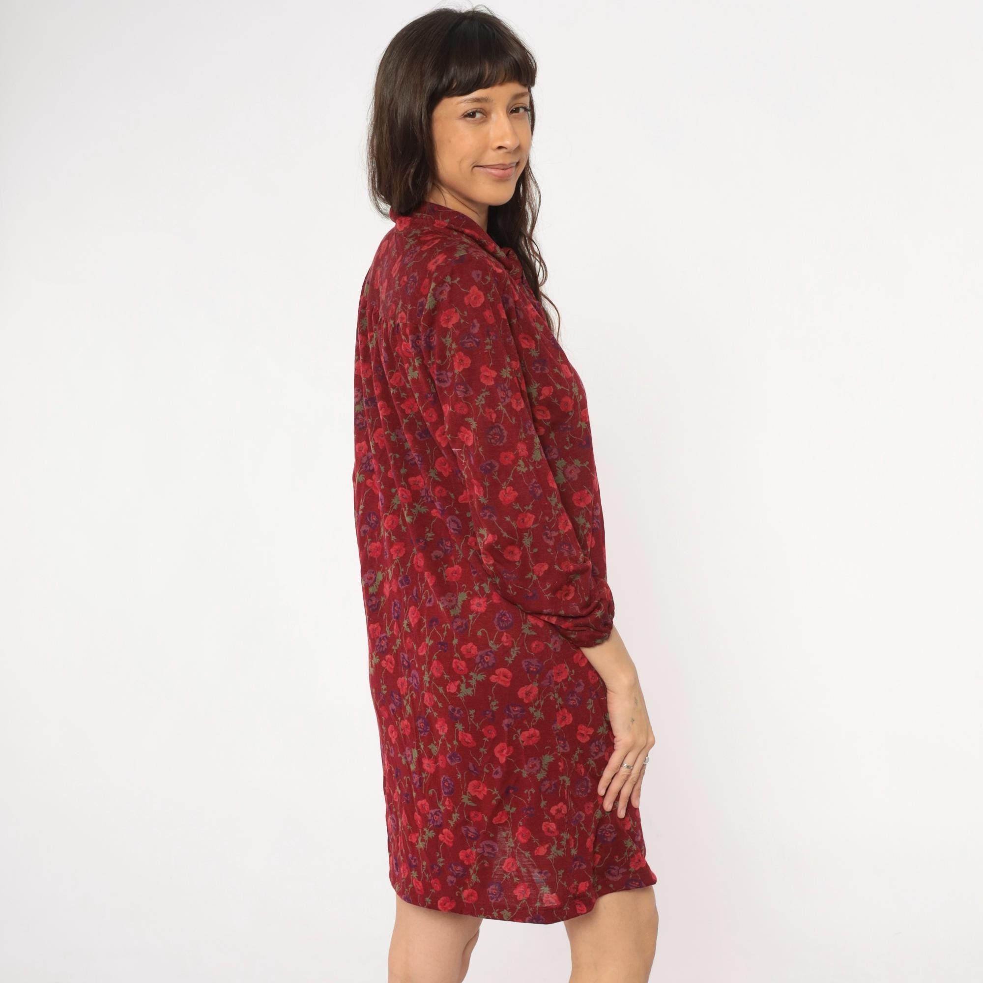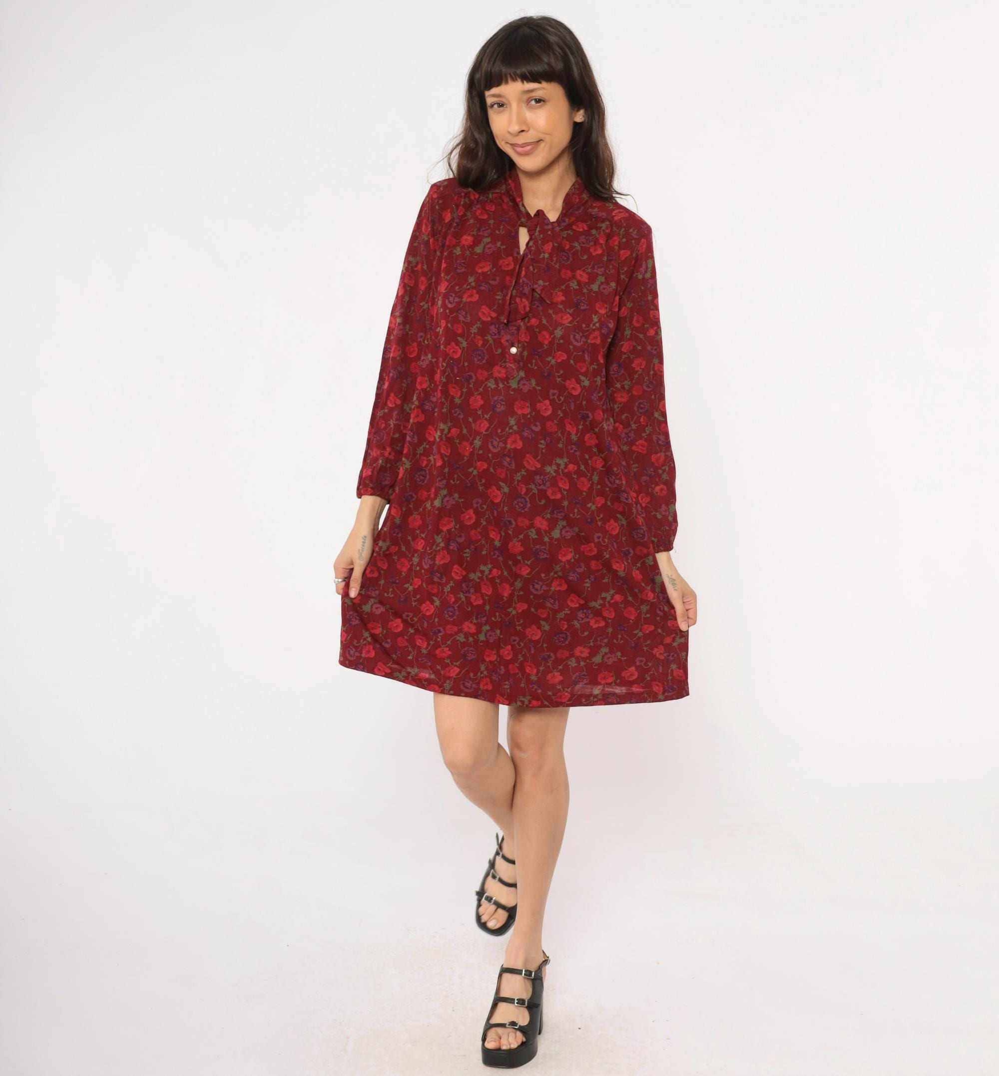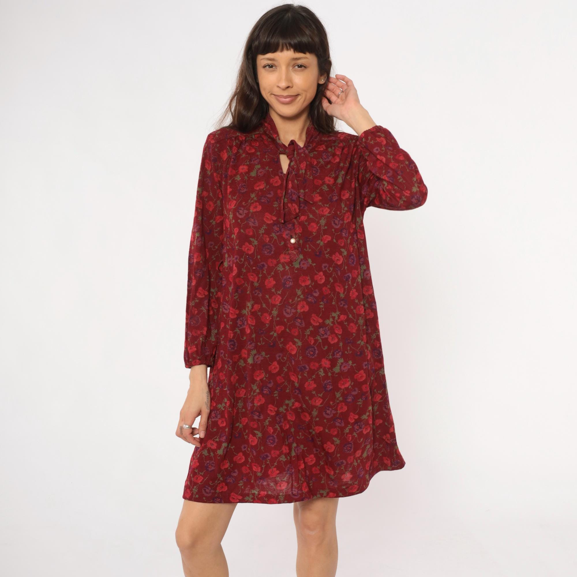 80s burgundy floral dress in wine-colored base with red, pink, and purple flowers across the fabric. Collar with neck tie detail, long sleeves, button front closure.