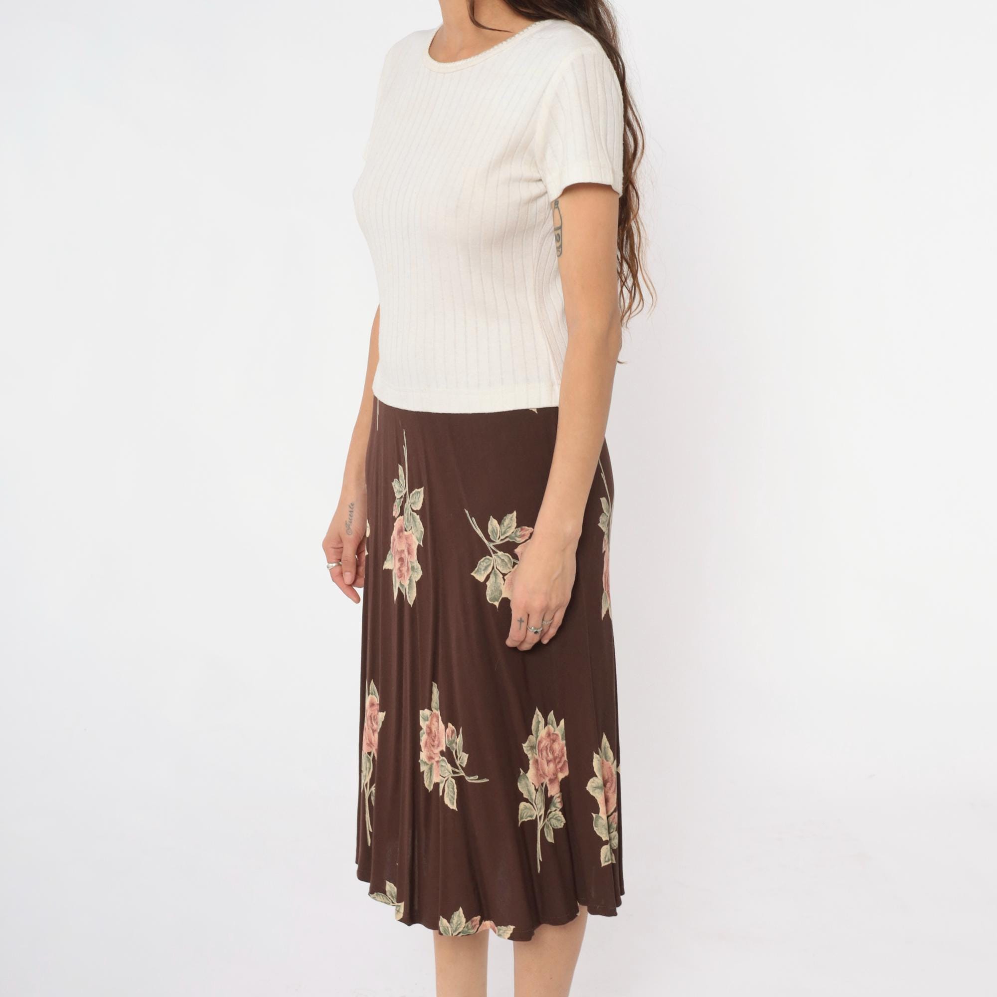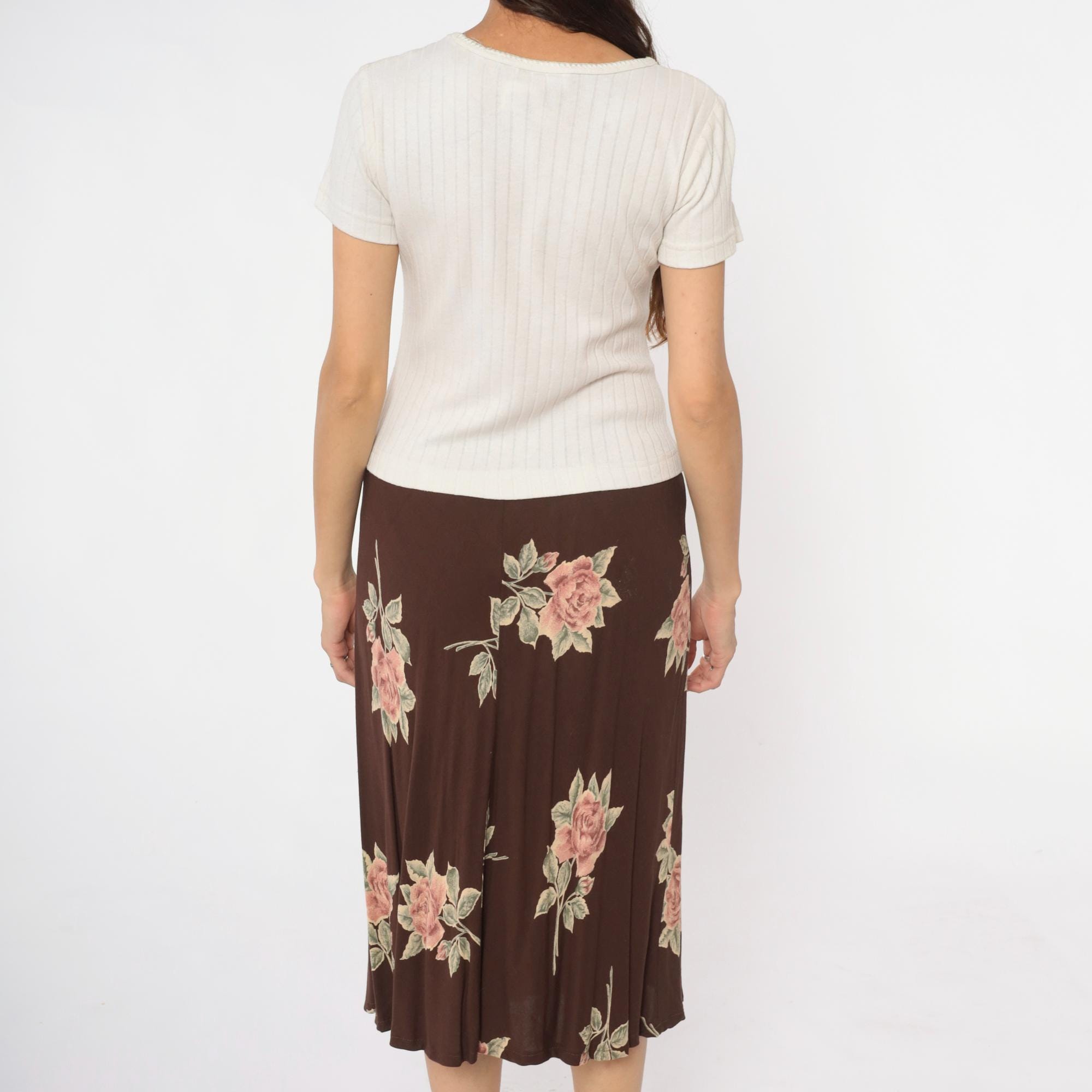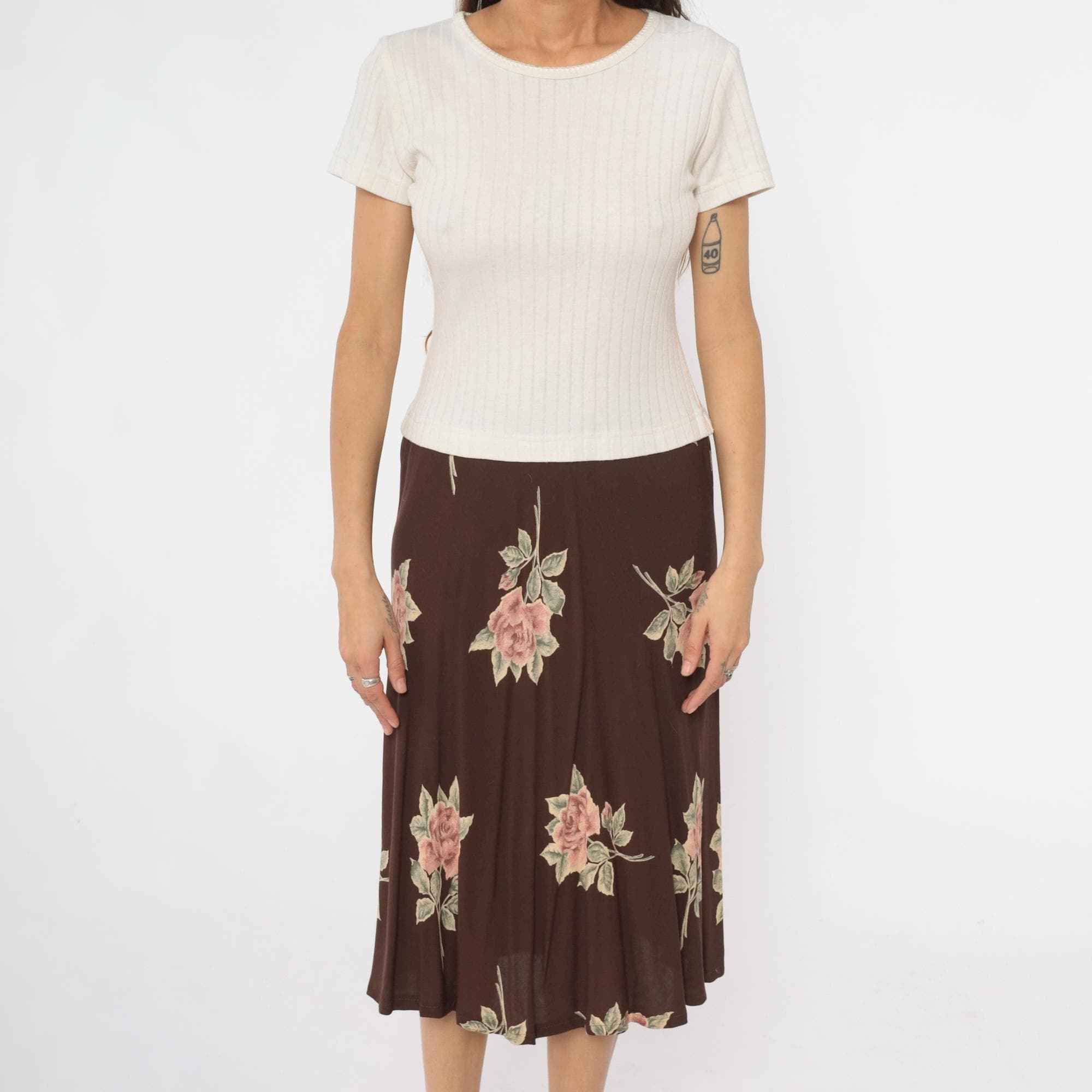 90s colorblock midi dress from Cristina with cream ribbed knit bodice and brown floral printed skirt. Short sleeves, crew neckline, fitted top section with vertical ribbing. A-line skirt with pink rose and green leaf pattern on chocolate brown base.