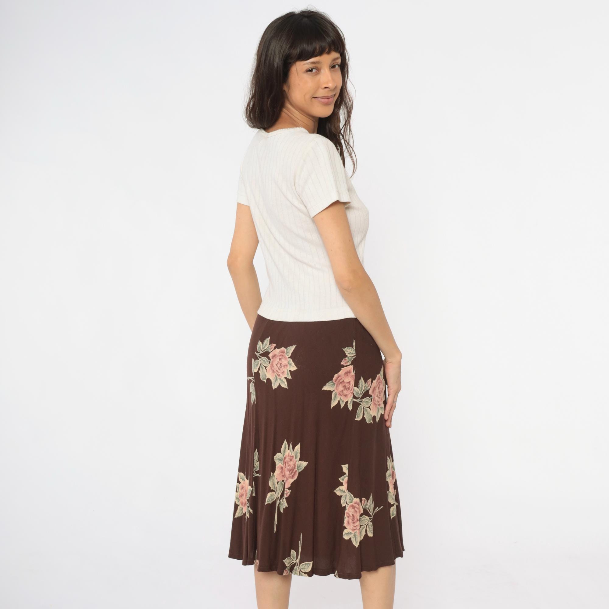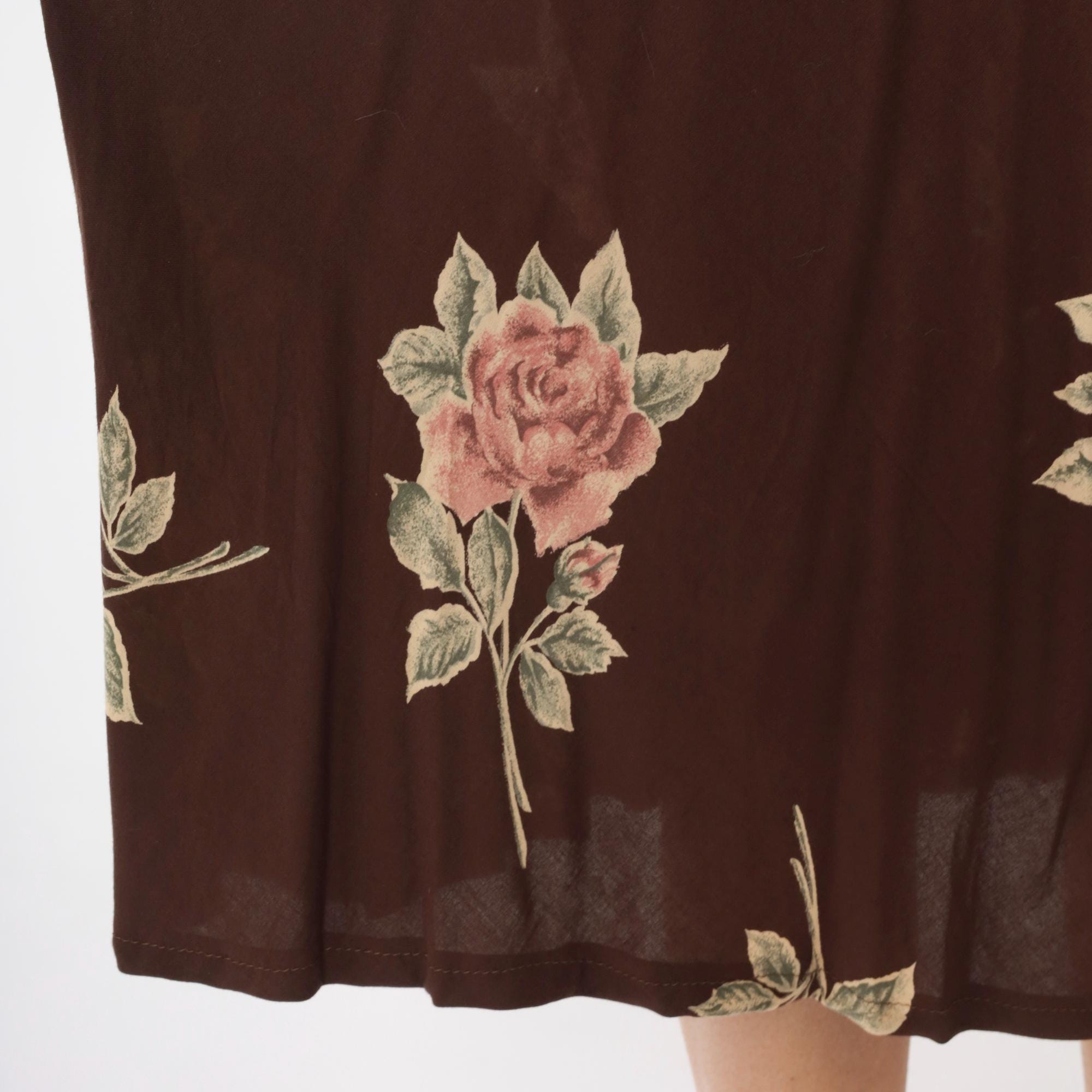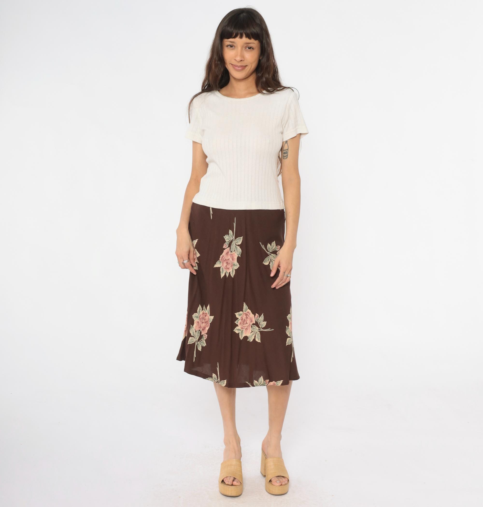 90s colorblock midi dress from Cristina with cream ribbed knit bodice and brown floral printed skirt. Short sleeves, crew neckline, fitted top section with vertical ribbing. A-line skirt with pink rose and green leaf pattern on chocolate brown base.