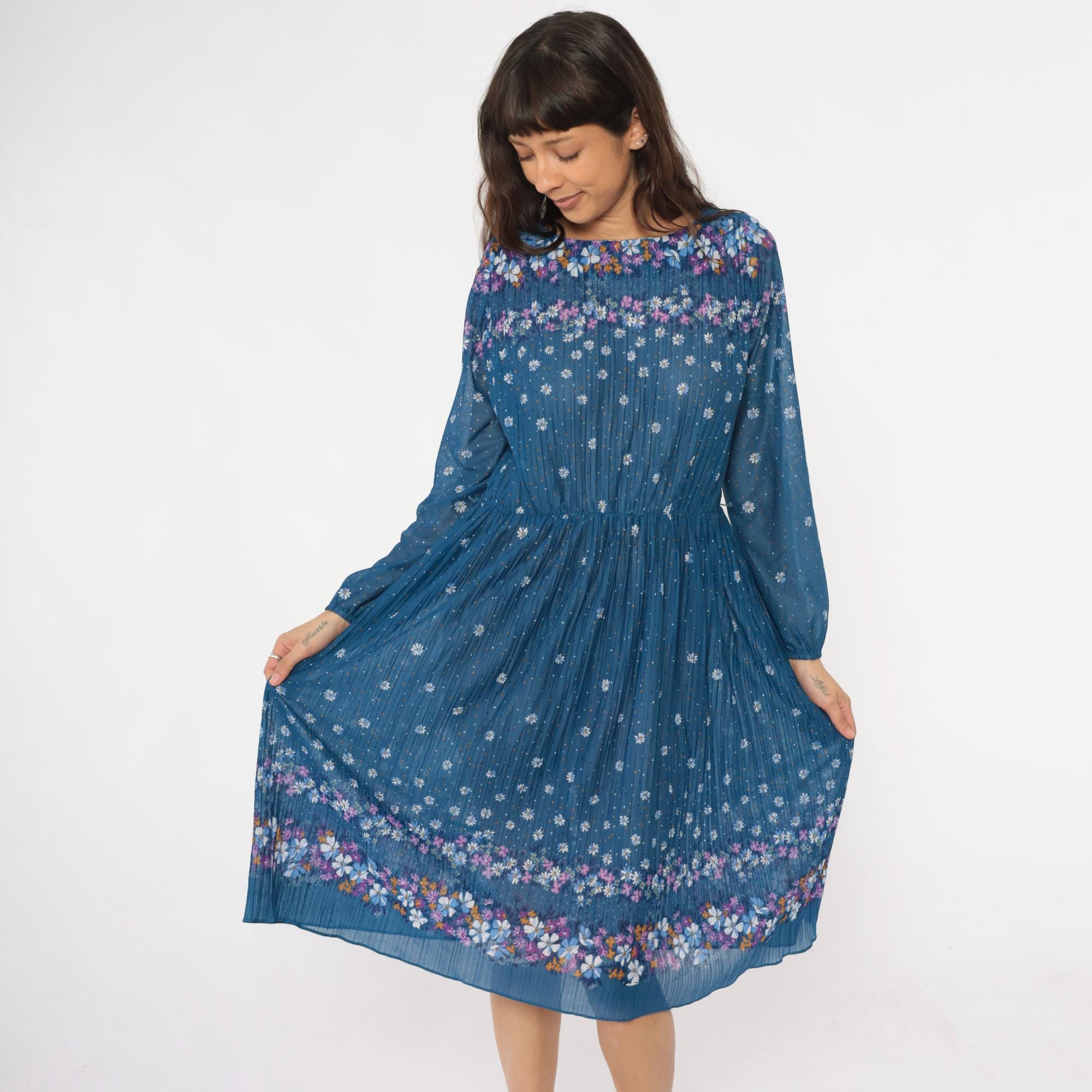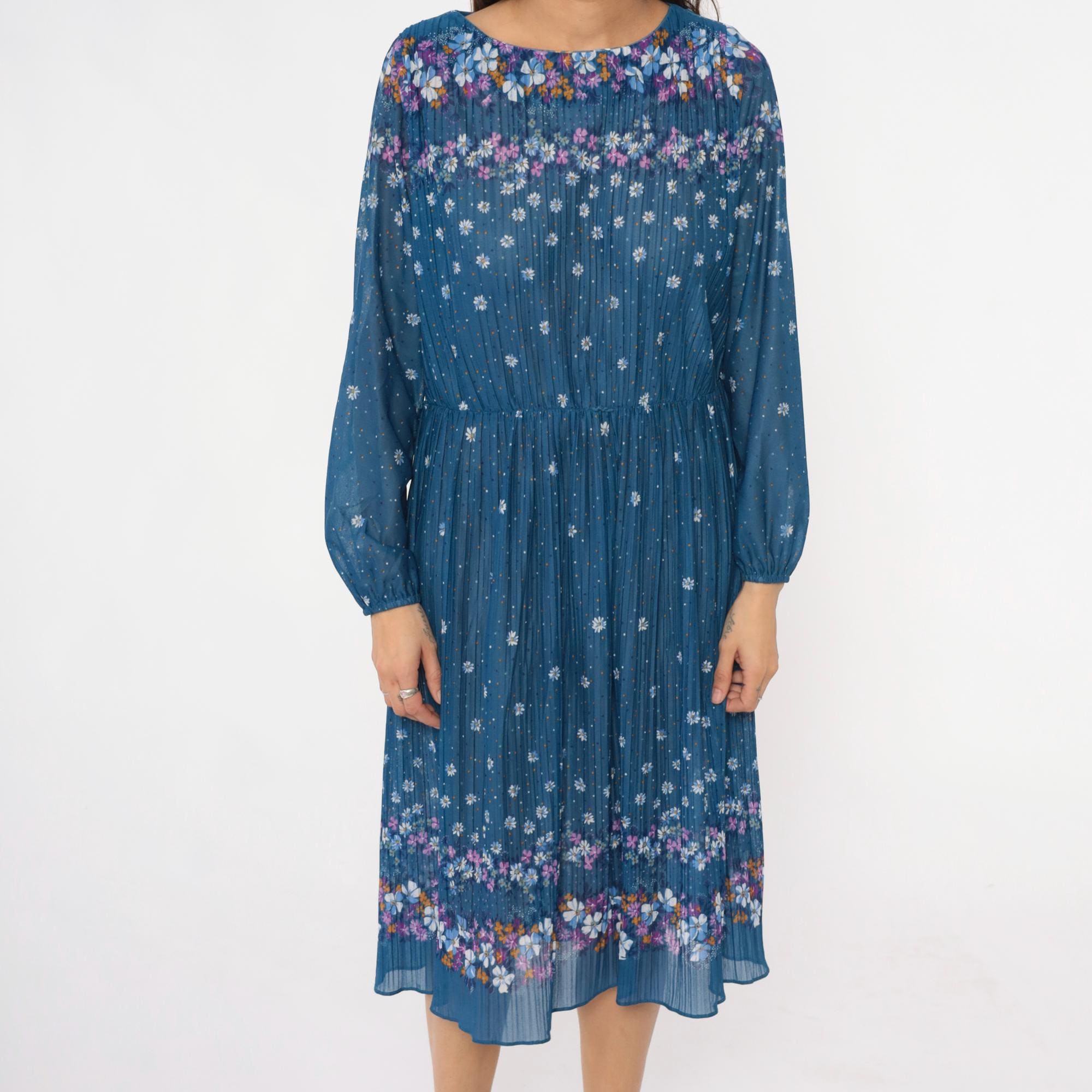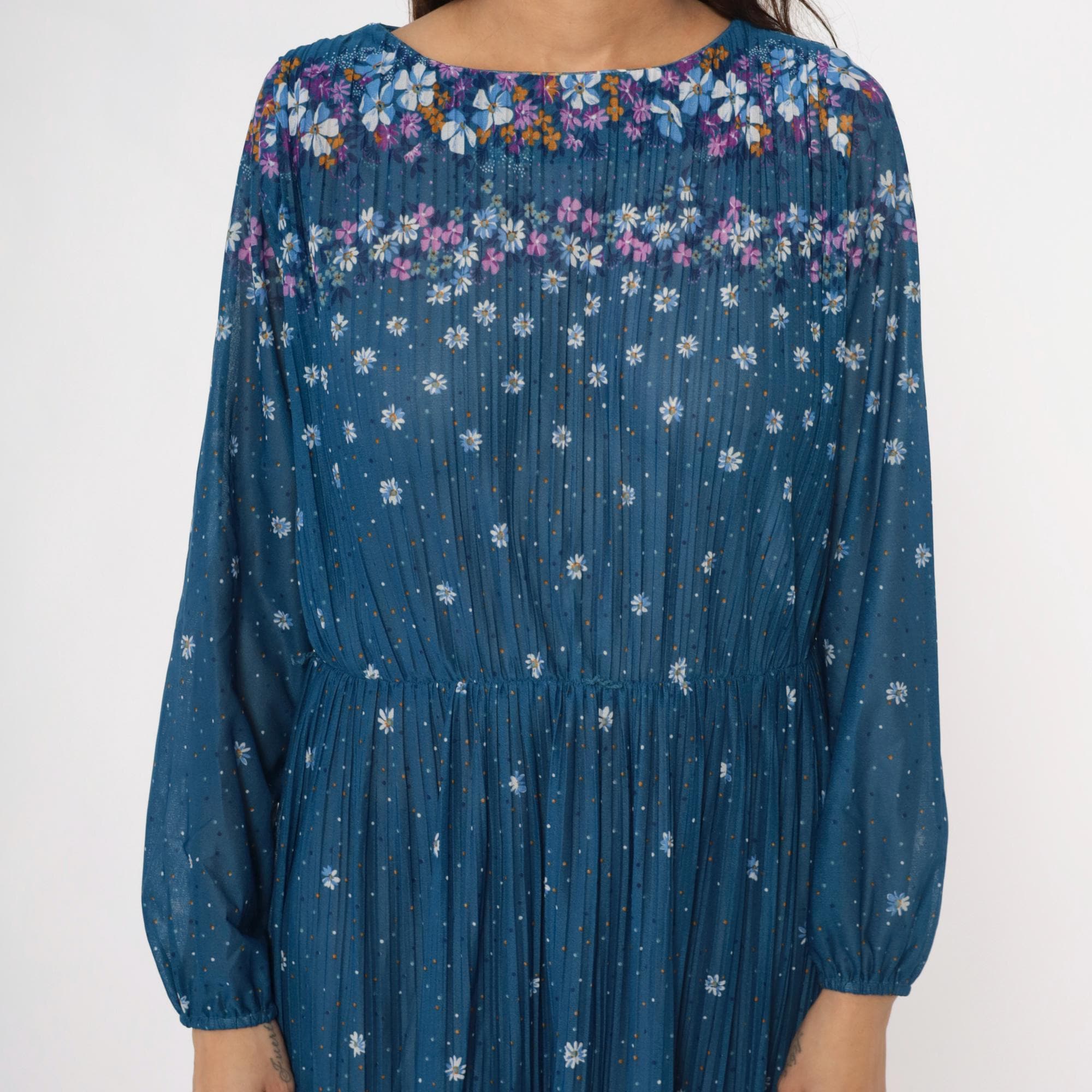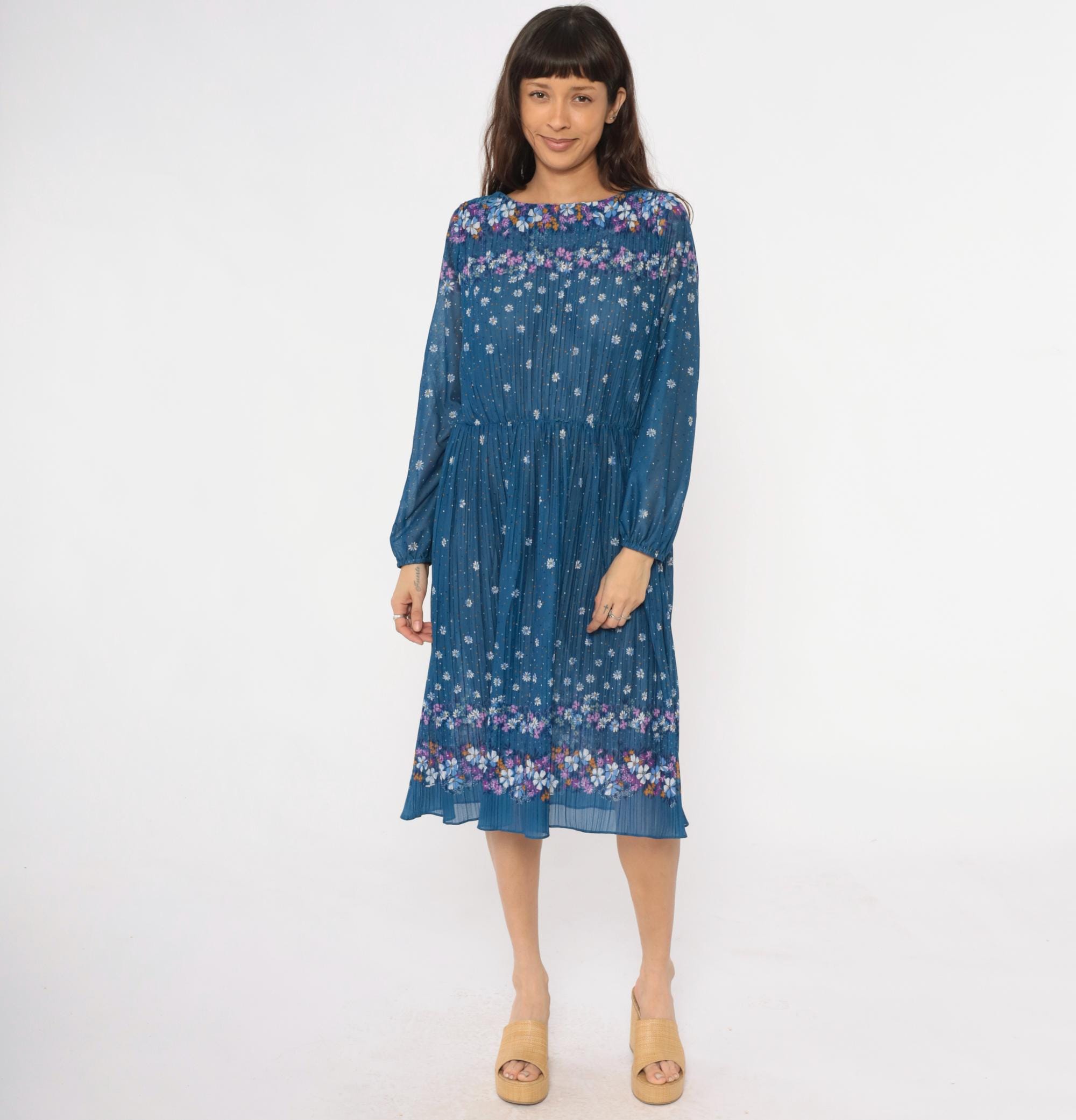 80s blue floral midi dress from malouf of dallas with pleated fabric throughout. Dense floral pattern in white, pink, purple, and orange at neckline and hem, scattered flowers across body. Long sleeves with elasticated cuffs, elastic waist, round elastic neckline.