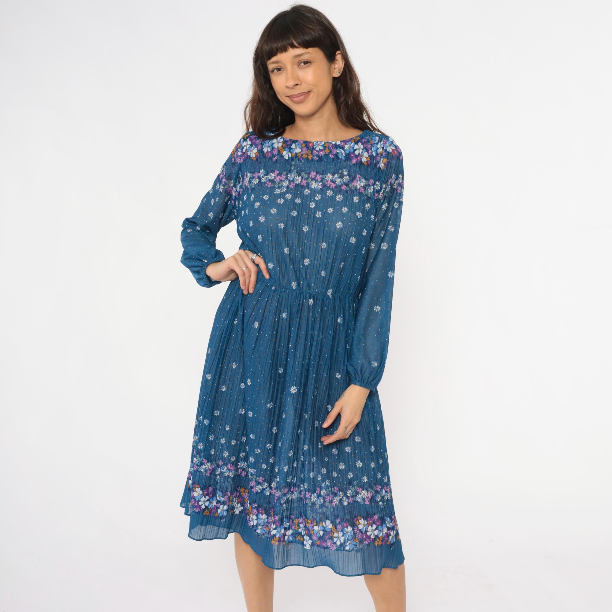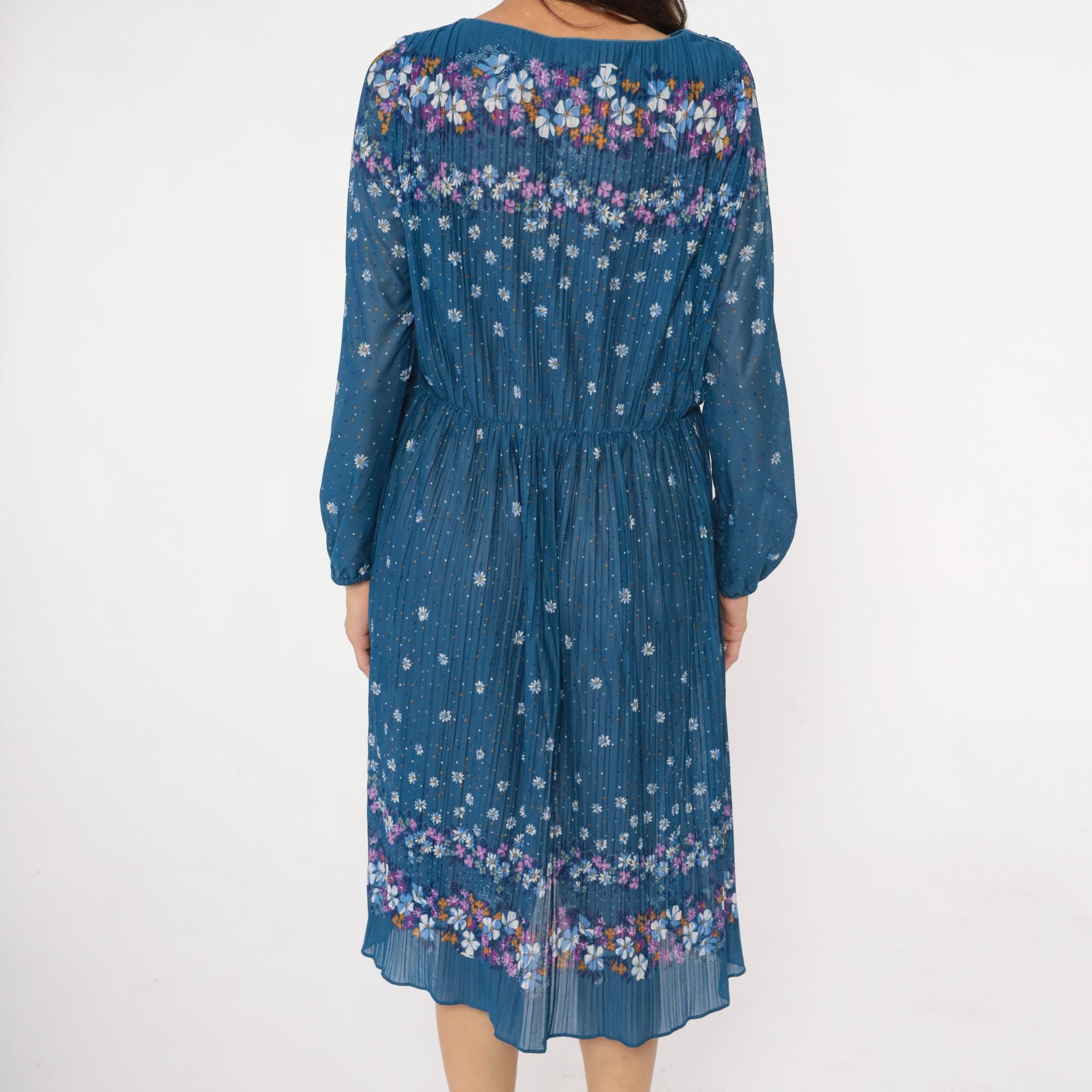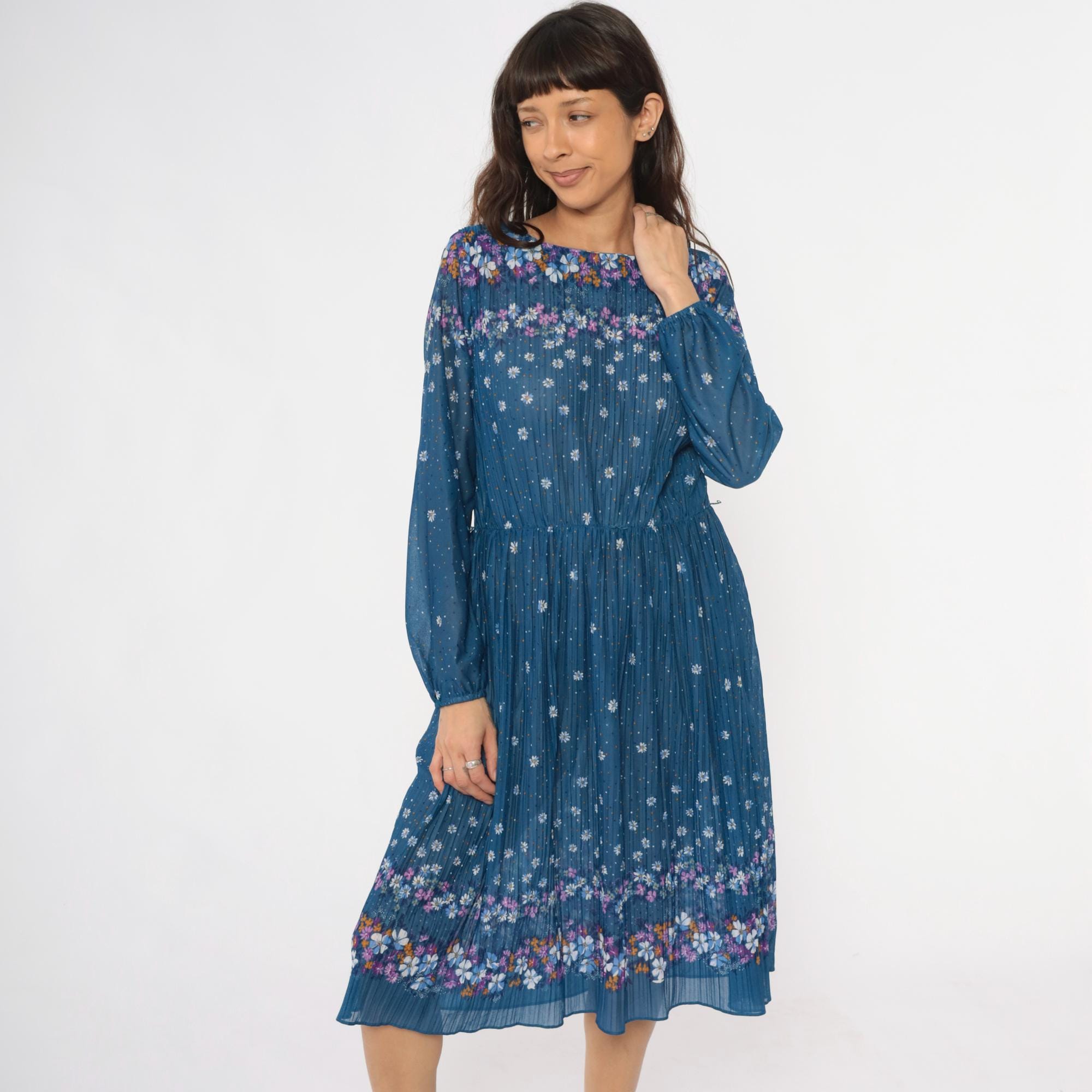80s blue floral midi dress from malouf of dallas with pleated fabric throughout. Dense floral pattern in white, pink, purple, and orange at neckline and hem, scattered flowers across body. Long sleeves with elasticated cuffs, elastic waist, round elastic neckline.
