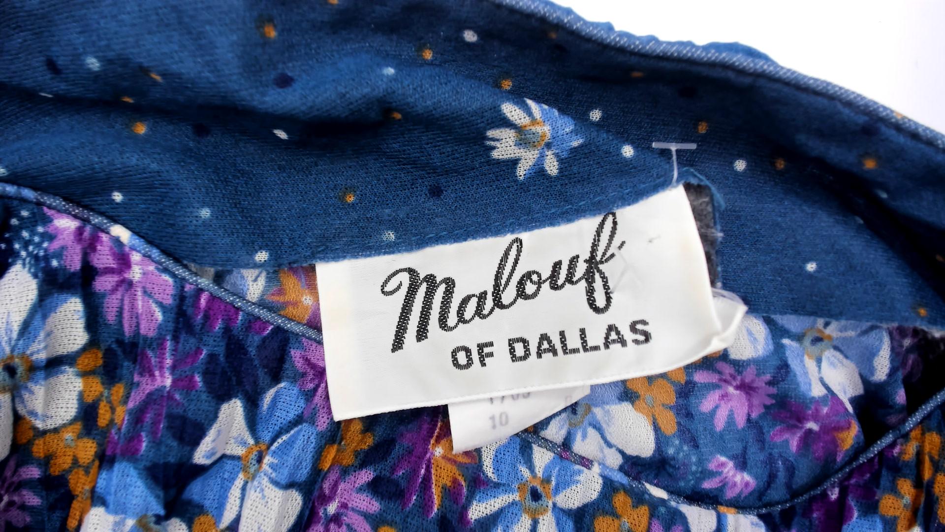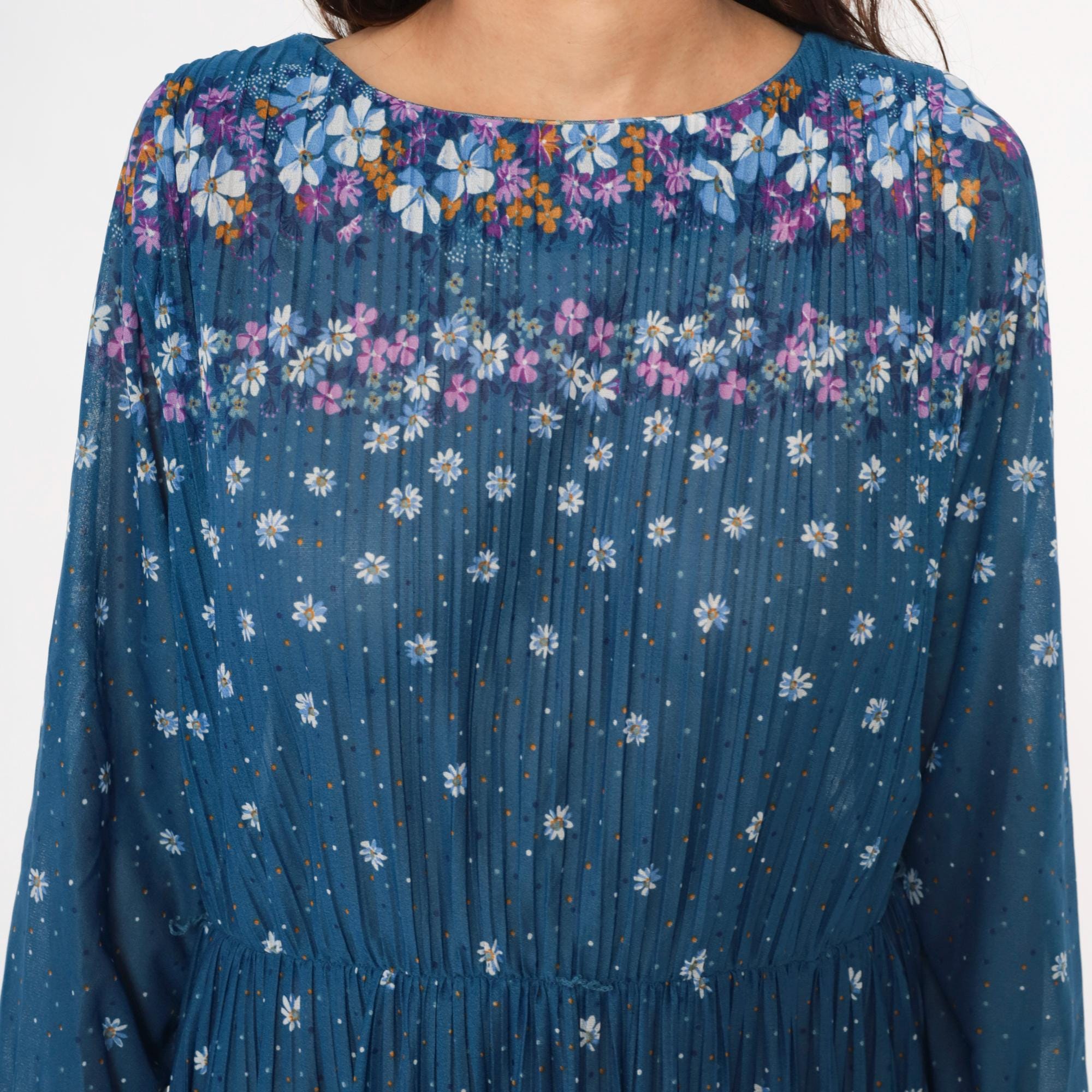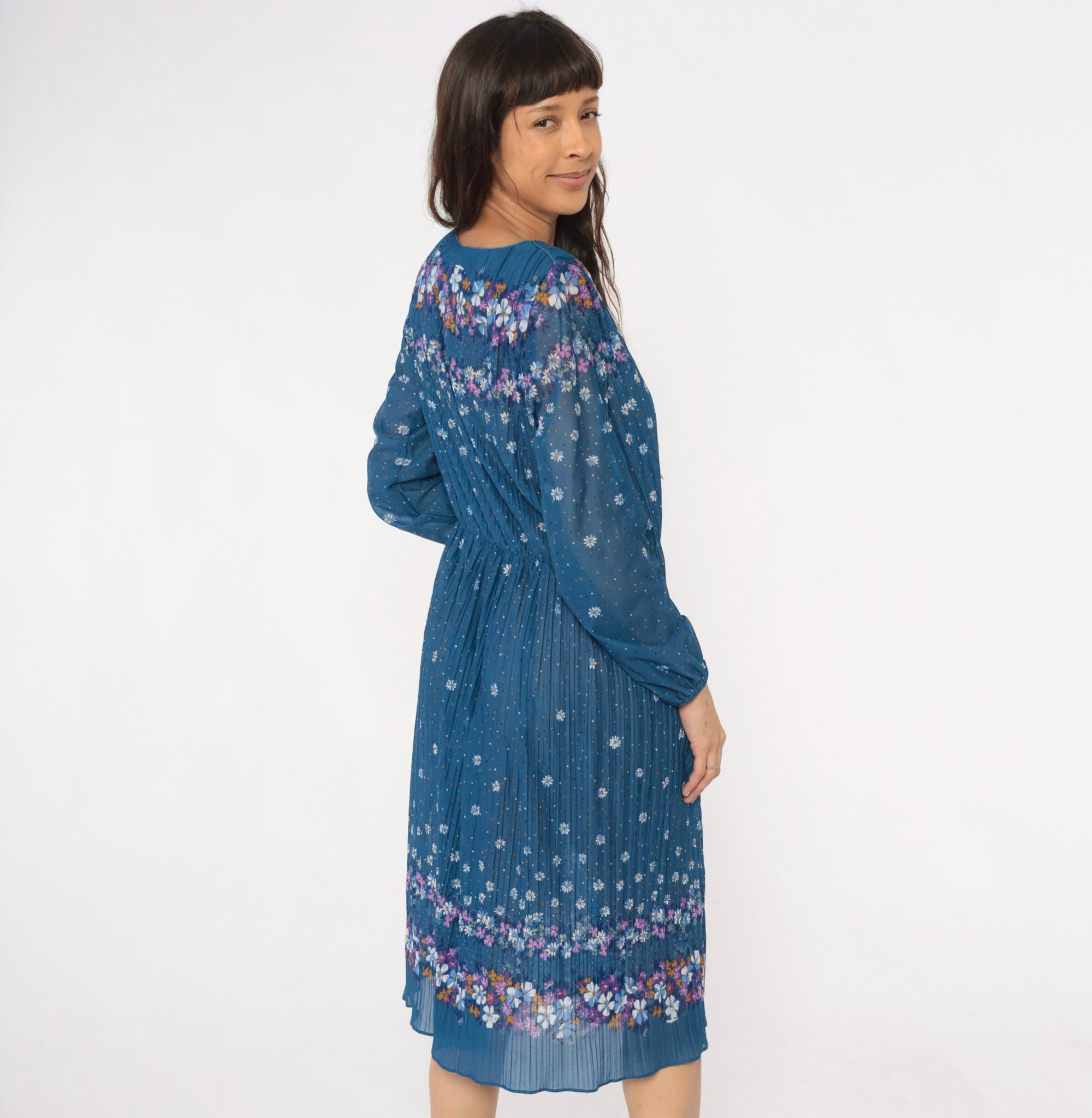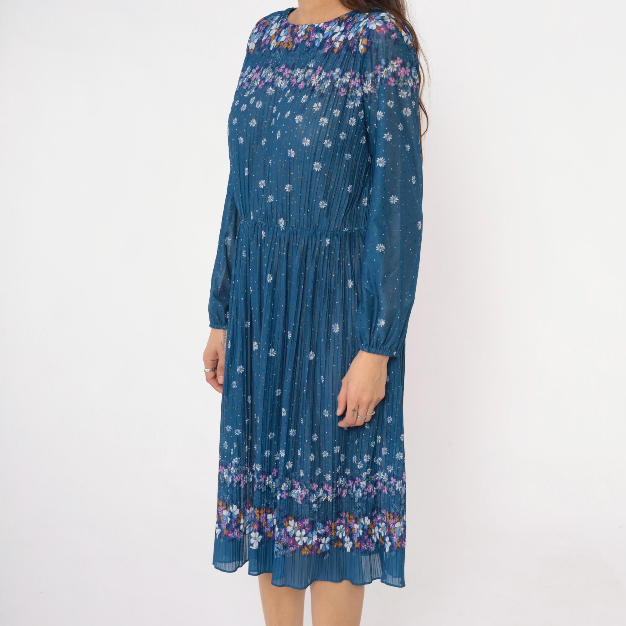 80s blue floral midi dress from malouf of dallas with pleated fabric throughout. Dense floral pattern in white, pink, purple, and orange at neckline and hem, scattered flowers across body. Long sleeves with elasticated cuffs, elastic waist, round elastic neckline.