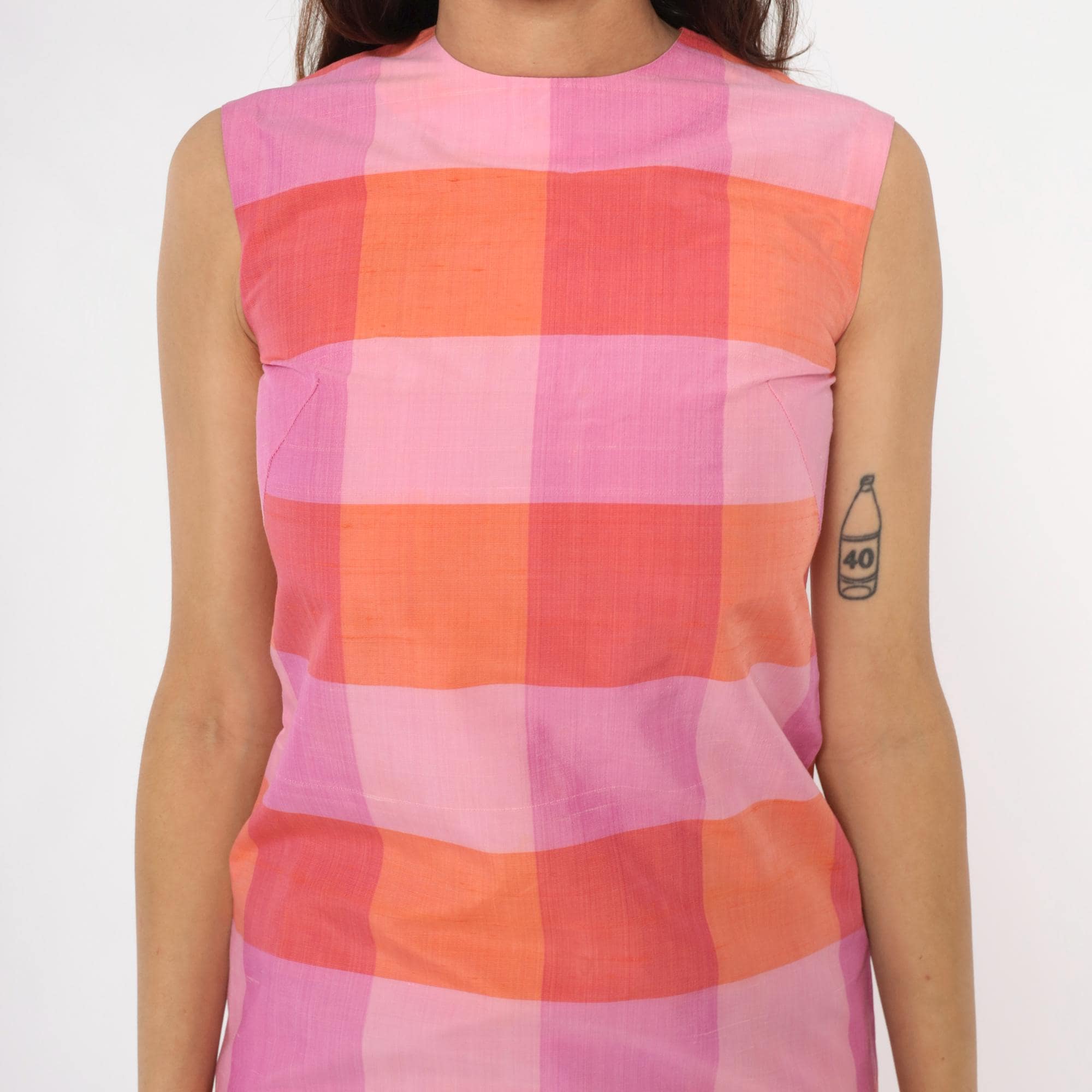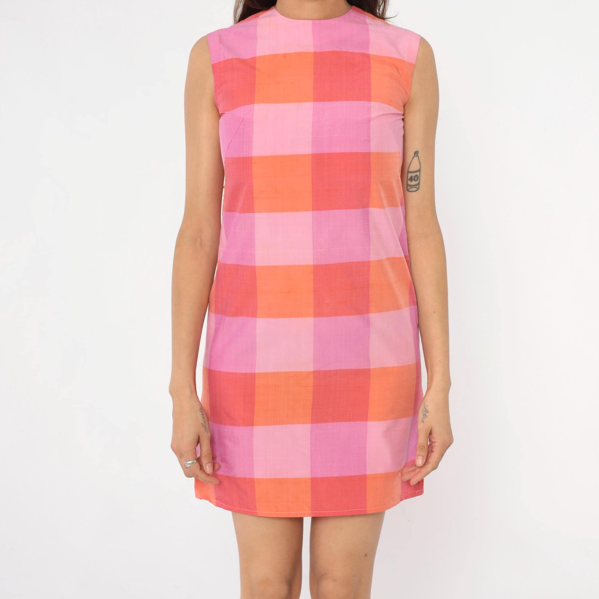 90s pink and orange gingham check mini dress in a sleeveless shift silhouette. Large buffalo check pattern in shades of light pink, medium pink, coral, and orange.