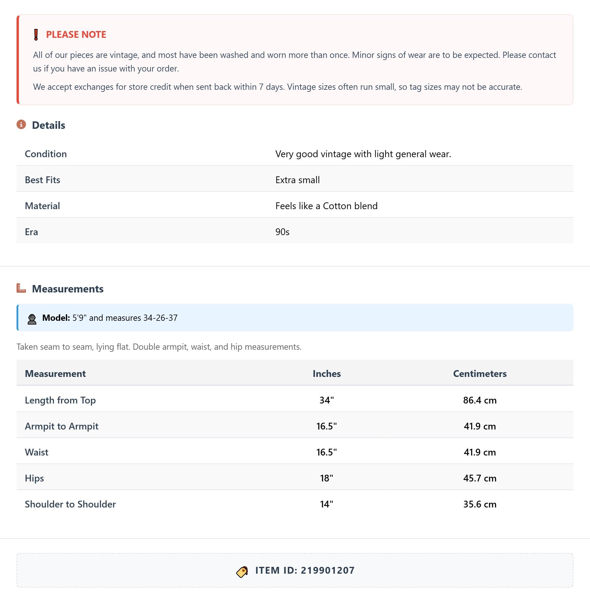 All of our pieces are vintage, and most have been washed and worn more than once. Minor signs of wear are to be expected. Please contact us if you have an issue with your order. We accept exchanges for store credit when sent back within 7 days.