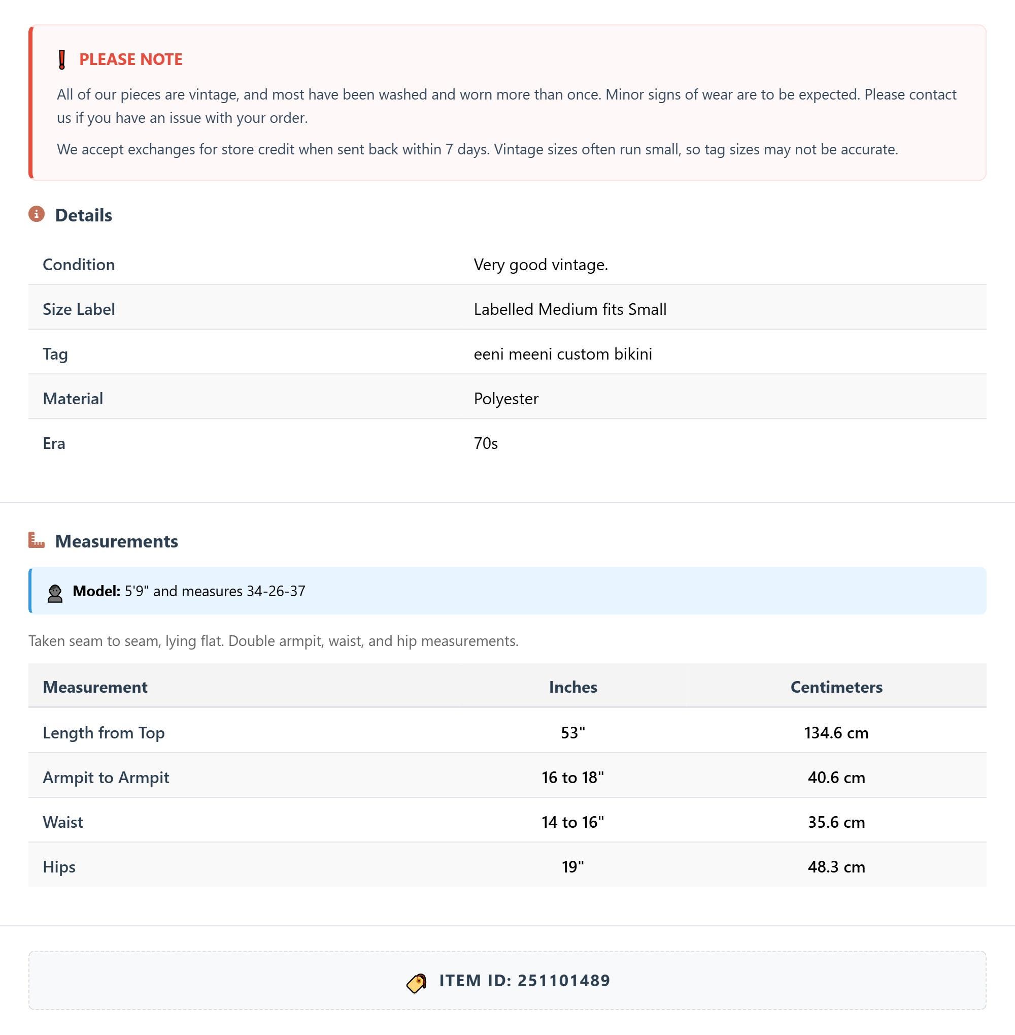 All of our pieces are vintage, and most have been washed and worn more than once. Minor signs of wear are to be expected. Please contact us if you have an issue with your order. We accept exchanges for store credit when sent back within 7 days.