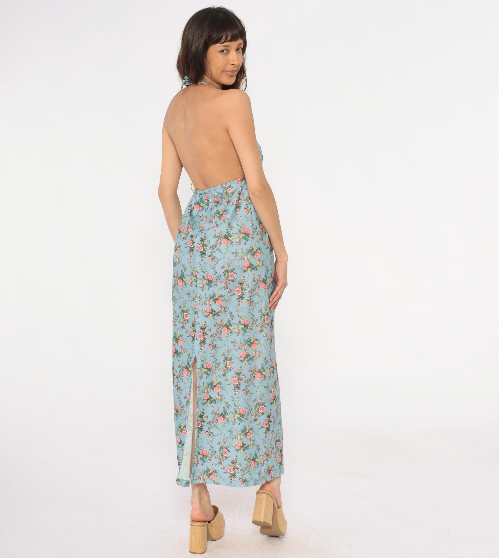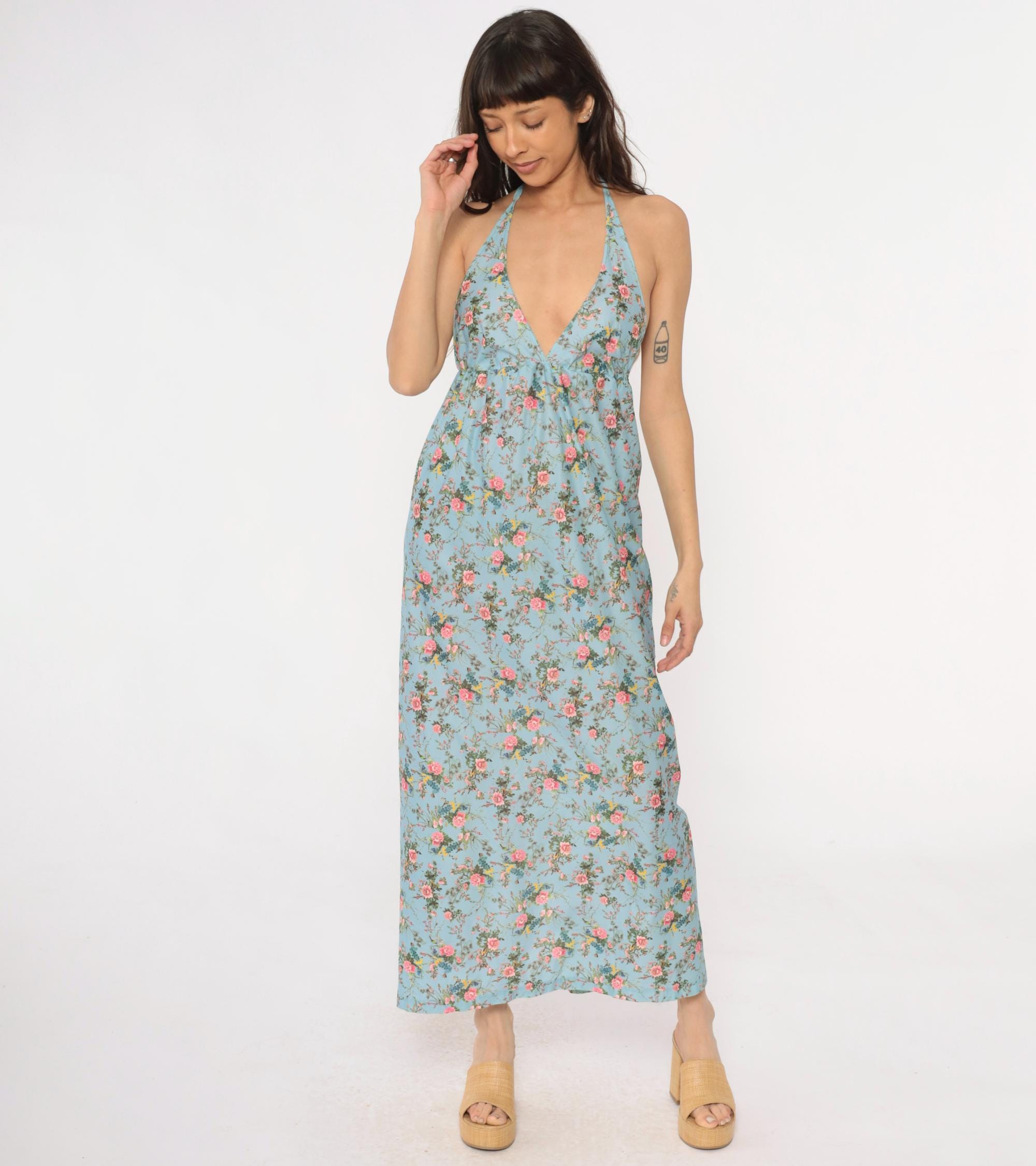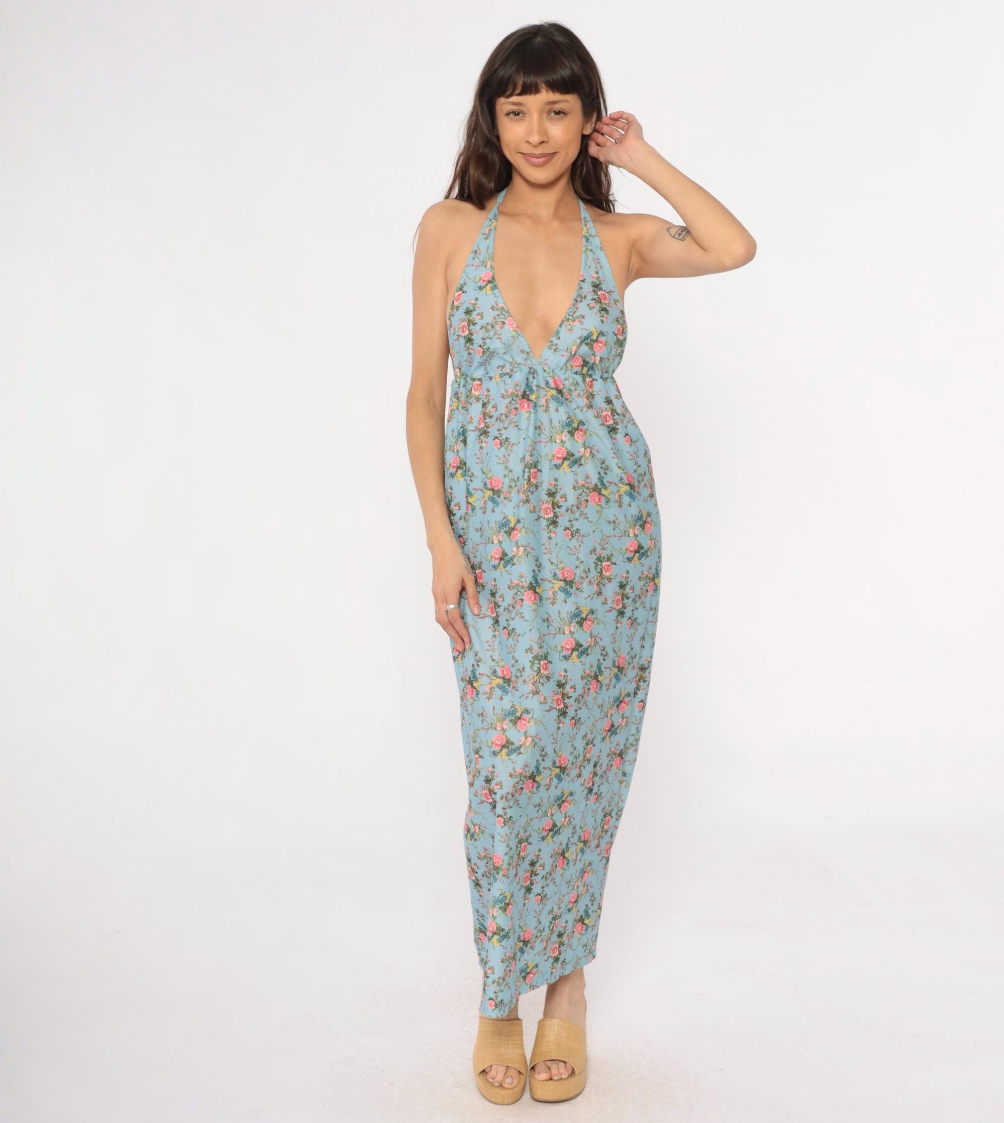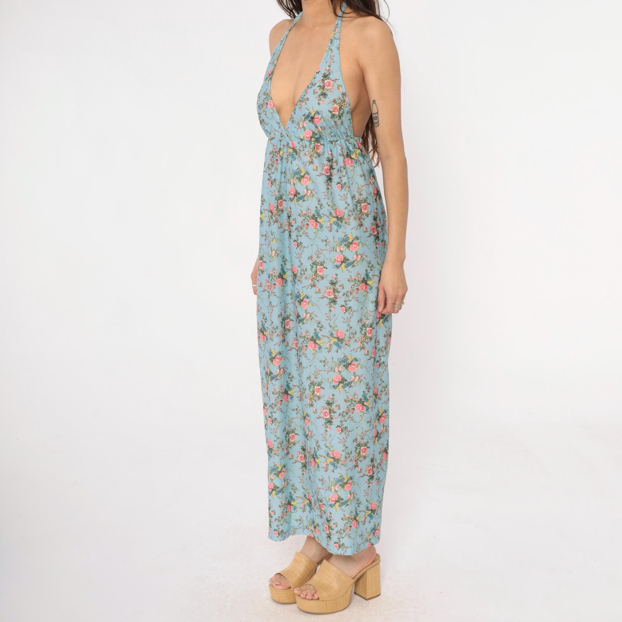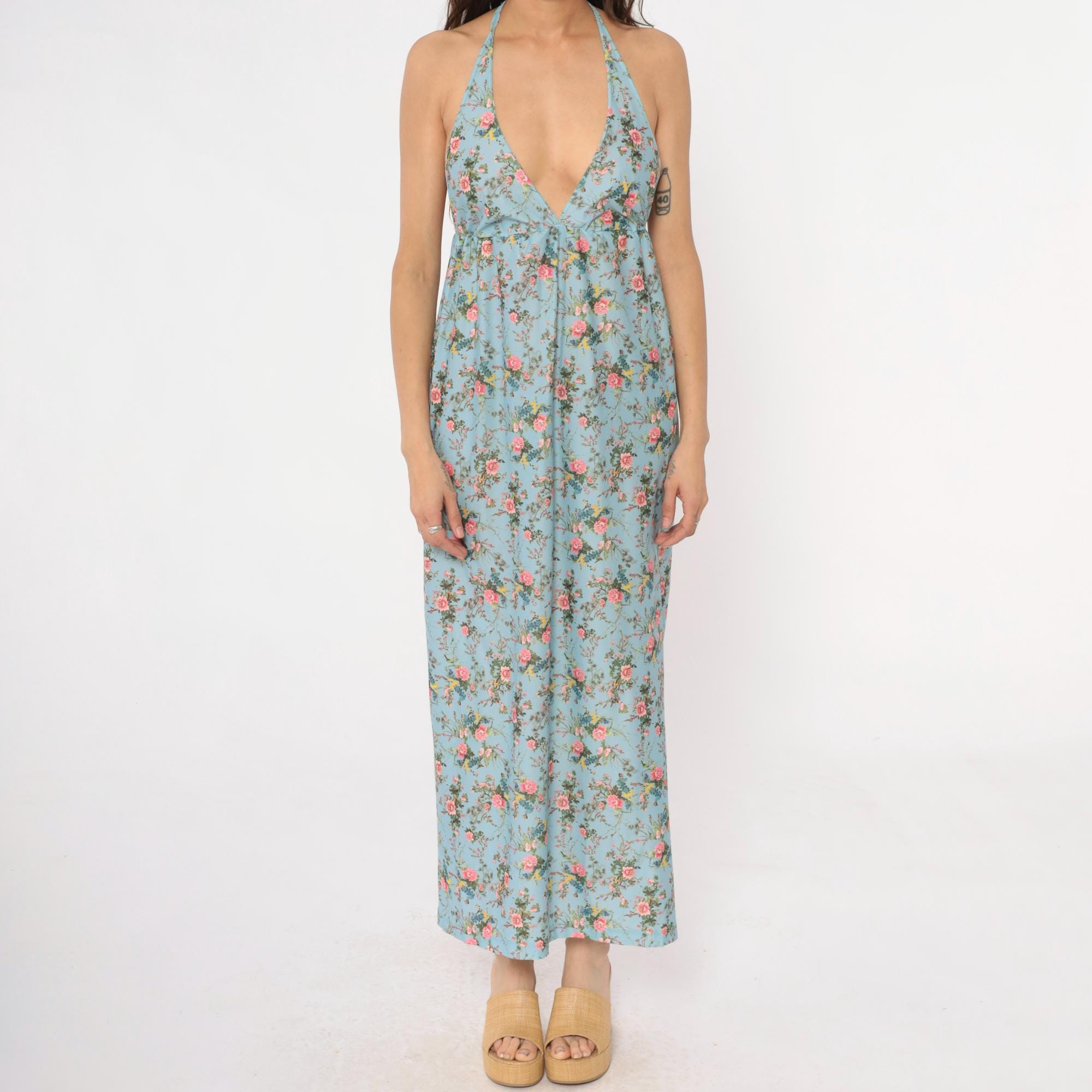 70s light blue floral maxi dress with halter neck ties and deep V-neckline. Empire waist with gathering below the bust, pink roses and birds printed across the fabric with yellow and green accents.