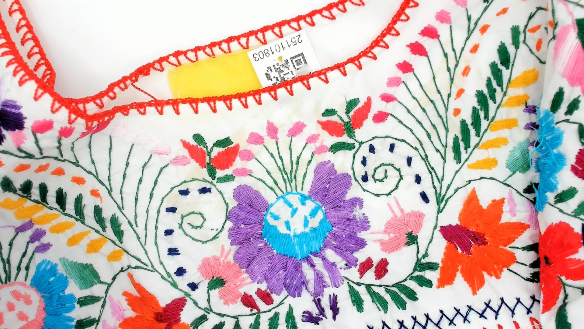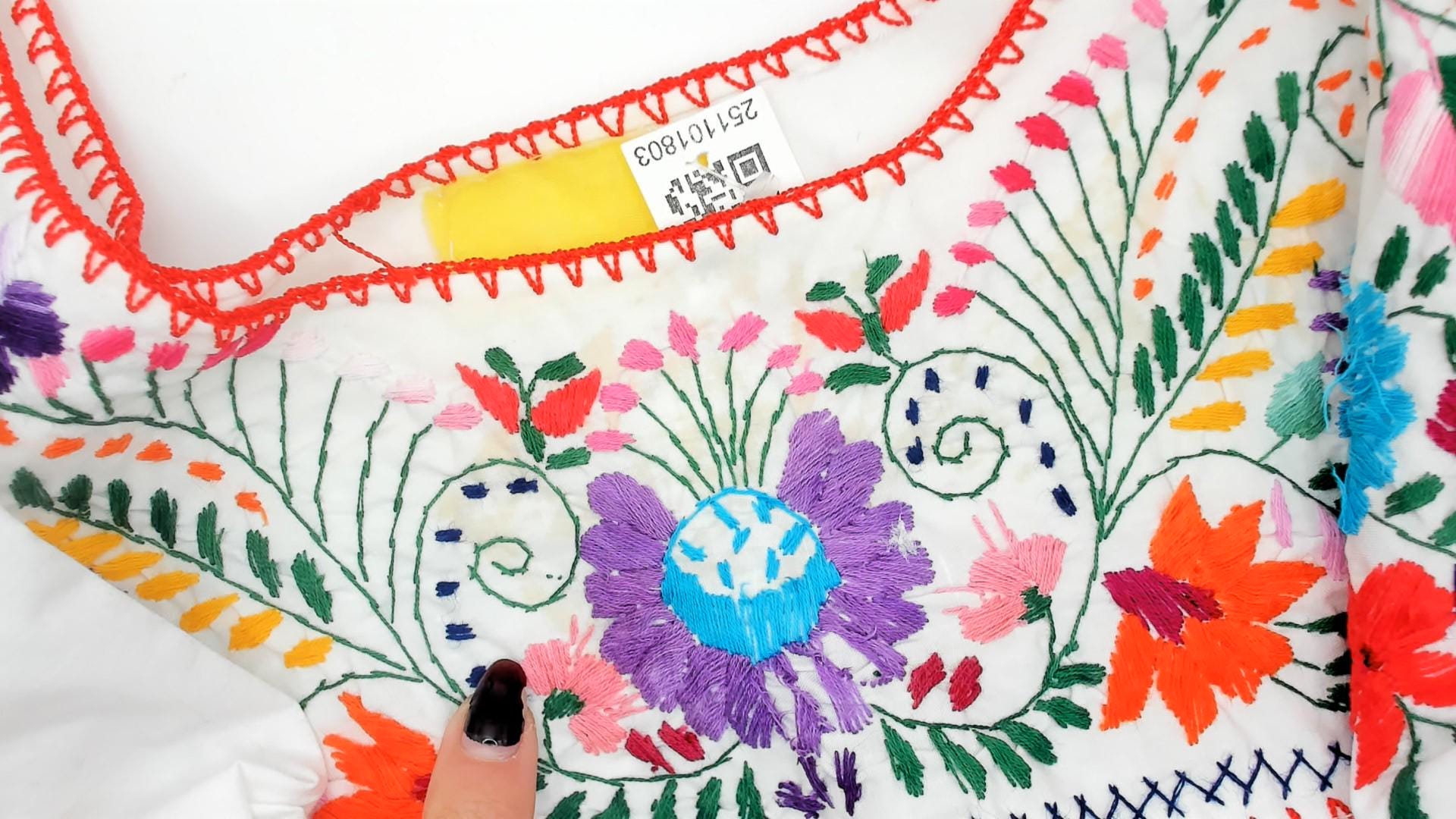 90s white maxi dress with colorful hand-embroidered floral designs across the chest and along the bottom hem in traditional Mexican style. Round neckline with red stitching, short sleeves, raised empire waist seam. Multicolored embroidery includes red, pink, yellow, blue, purple, orange, and green flowers and vines.