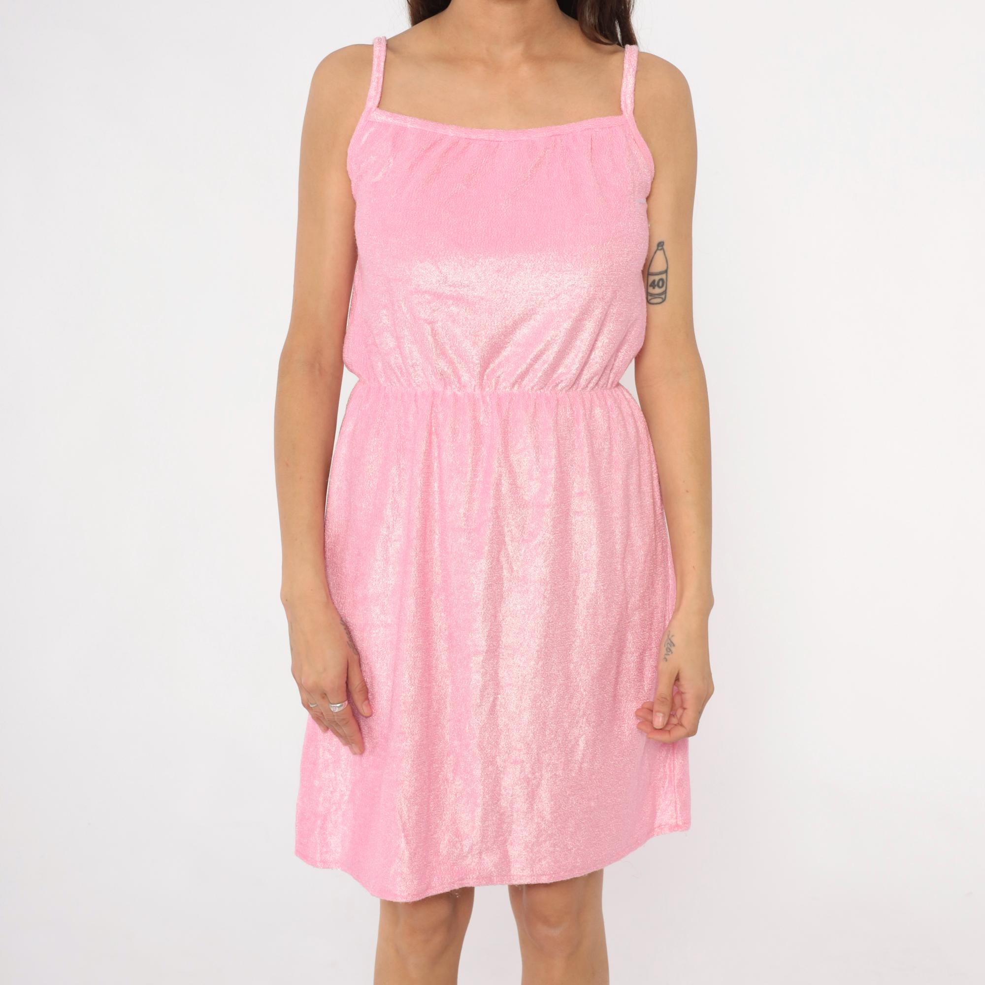 70s pink metallic spaghetti strap dress with shimmery finish across the fabric. Straight neckline, fitted bodice, elastic gathered waist, A-line skirt.