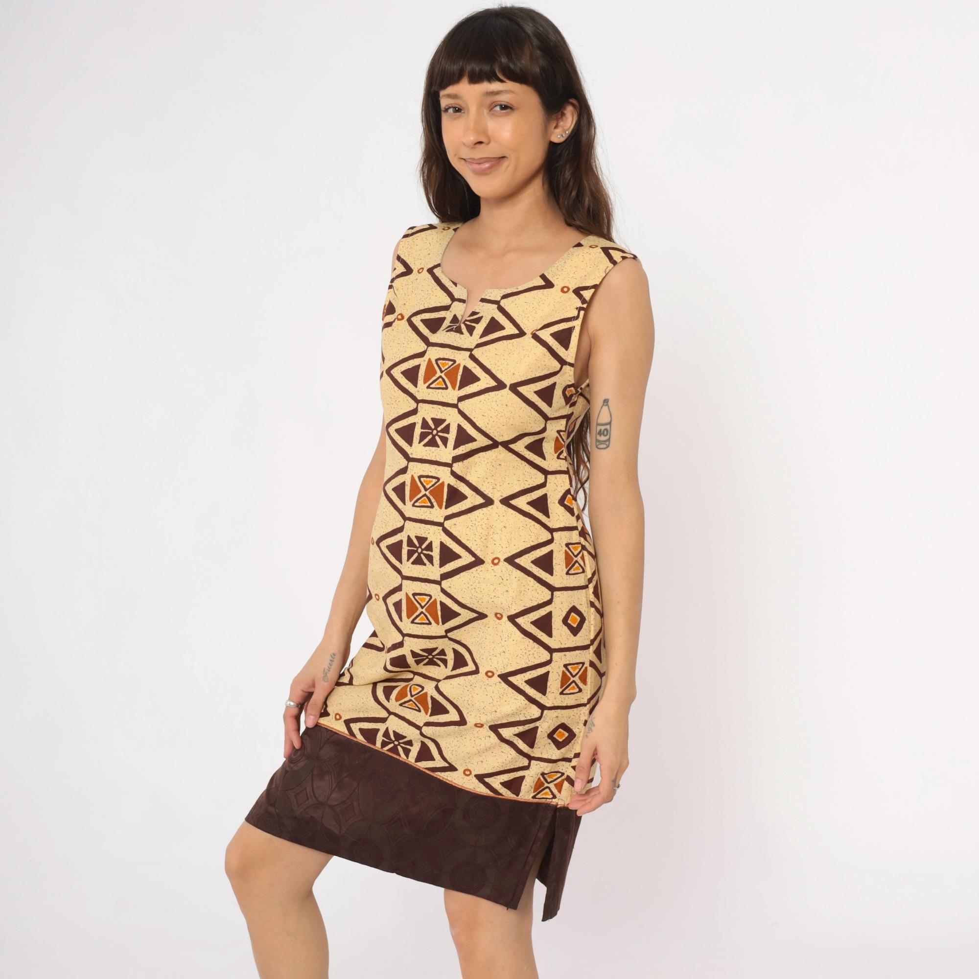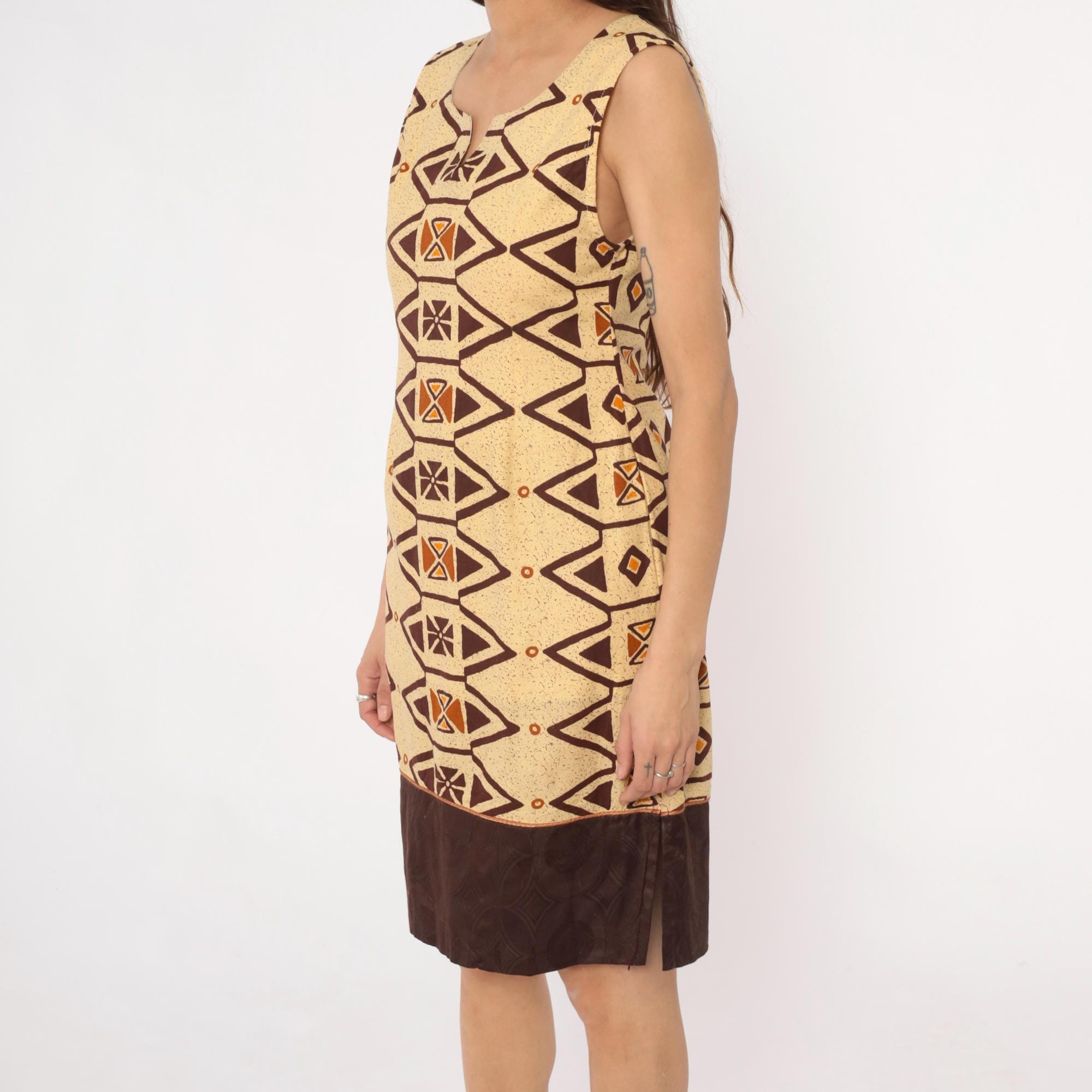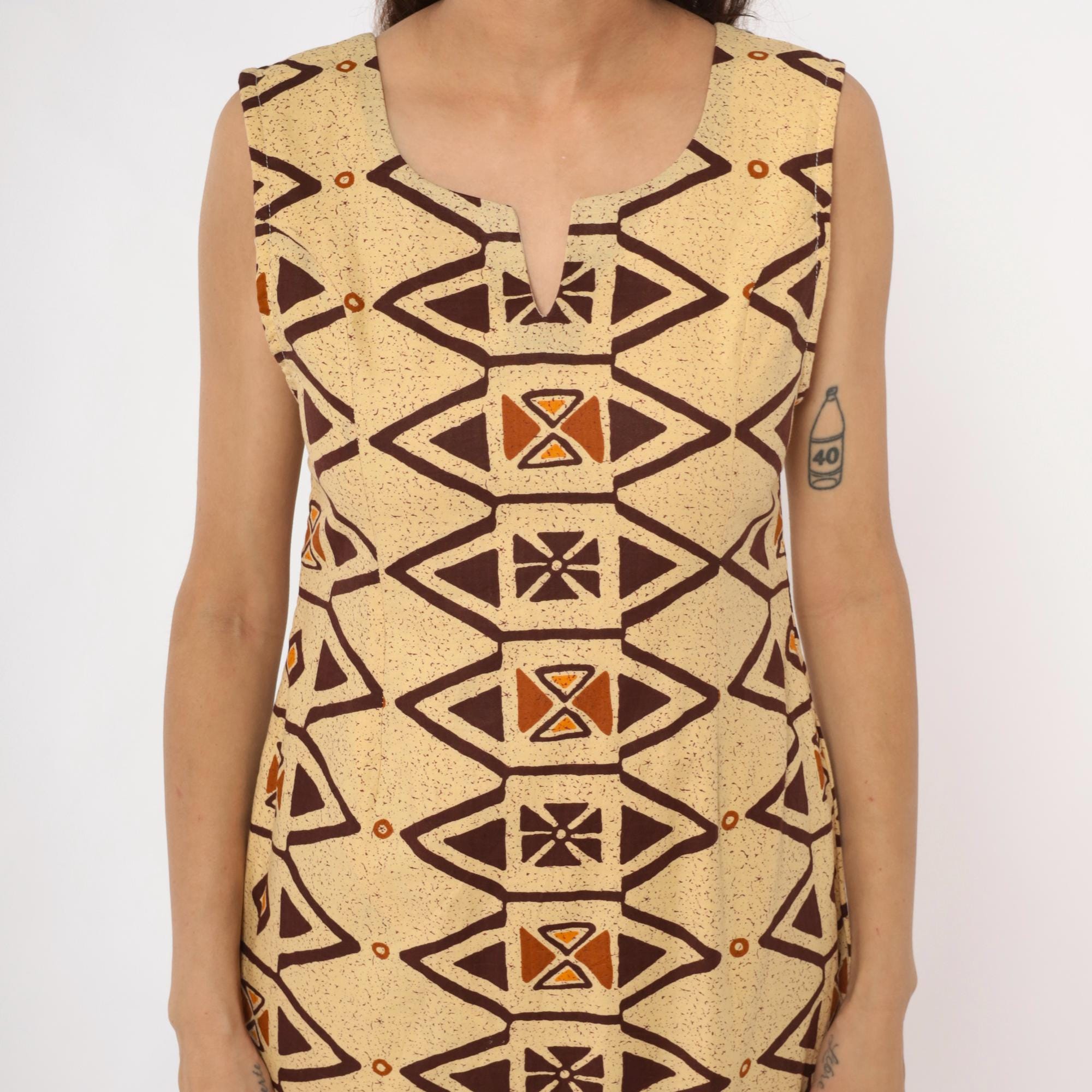 Y2k sleeveless shift dress with geometric tribal print in cream, brown, and orange tones. Diamond and triangle motifs arranged in vertical mirror pattern down the front and back, brown textured border at hem. Round neckline, straight silhouette with side seam construction.