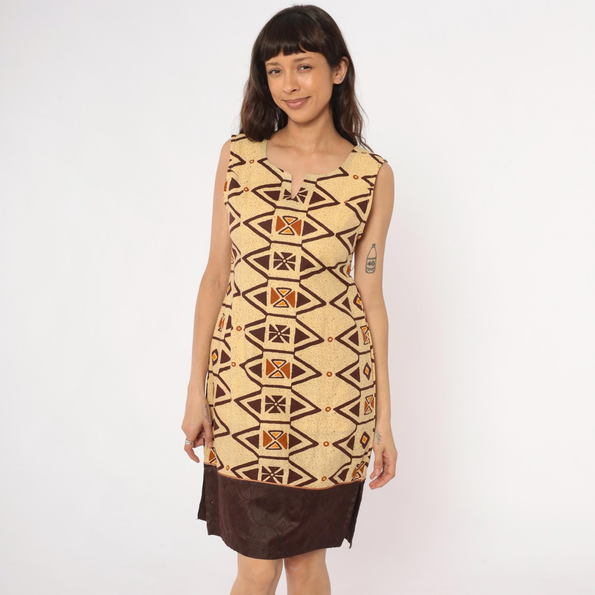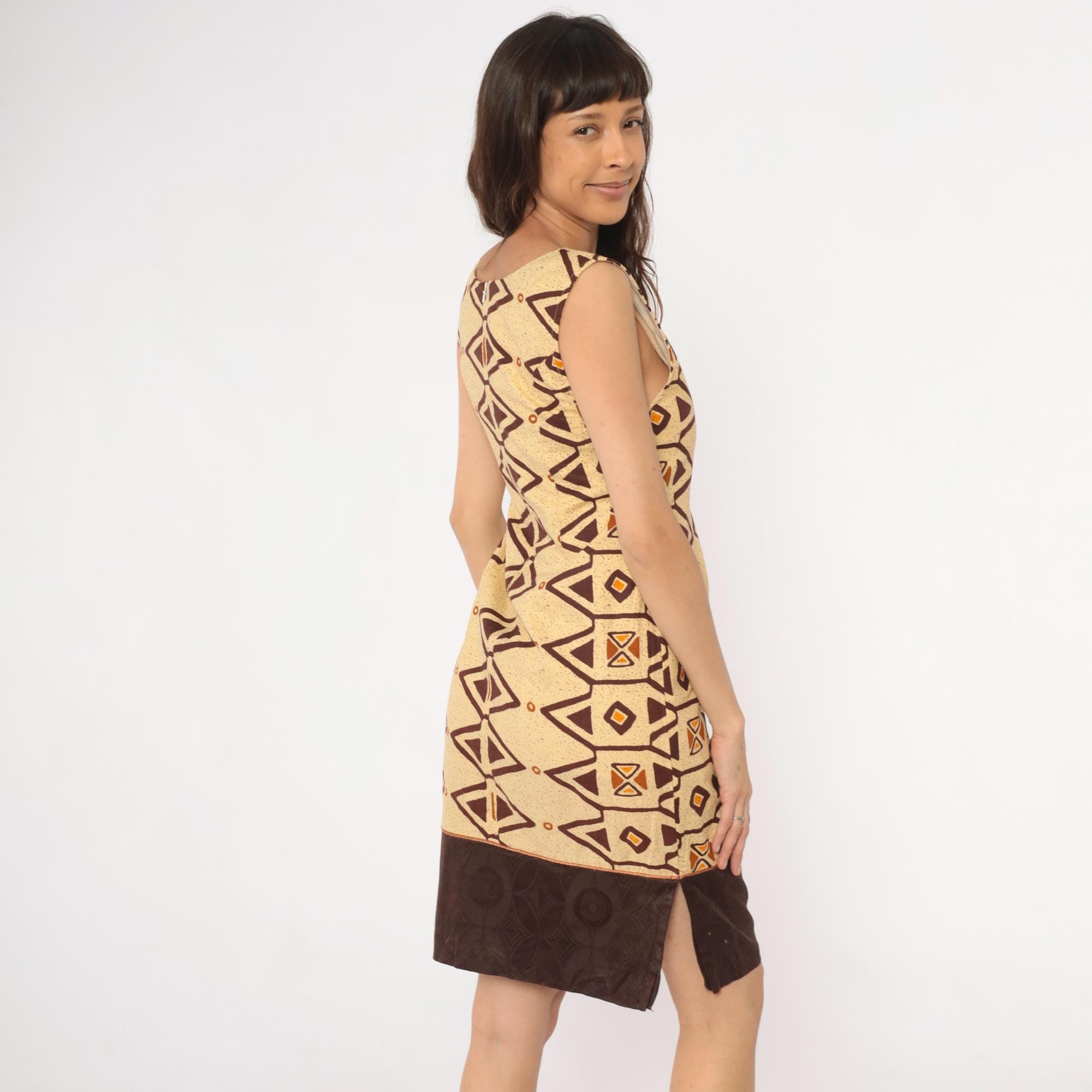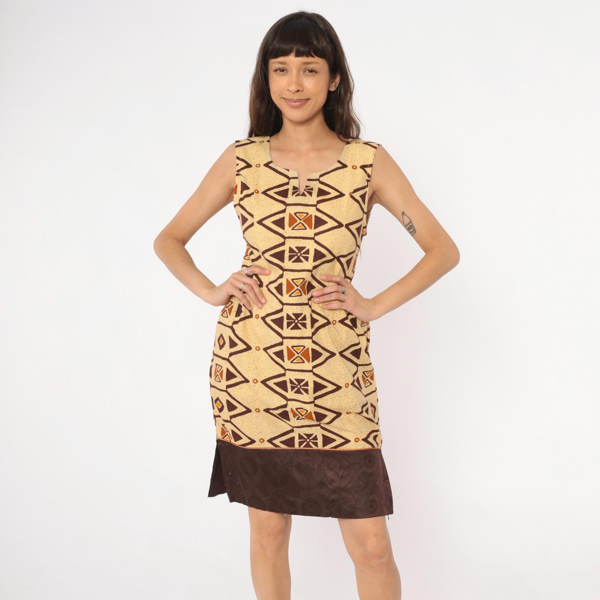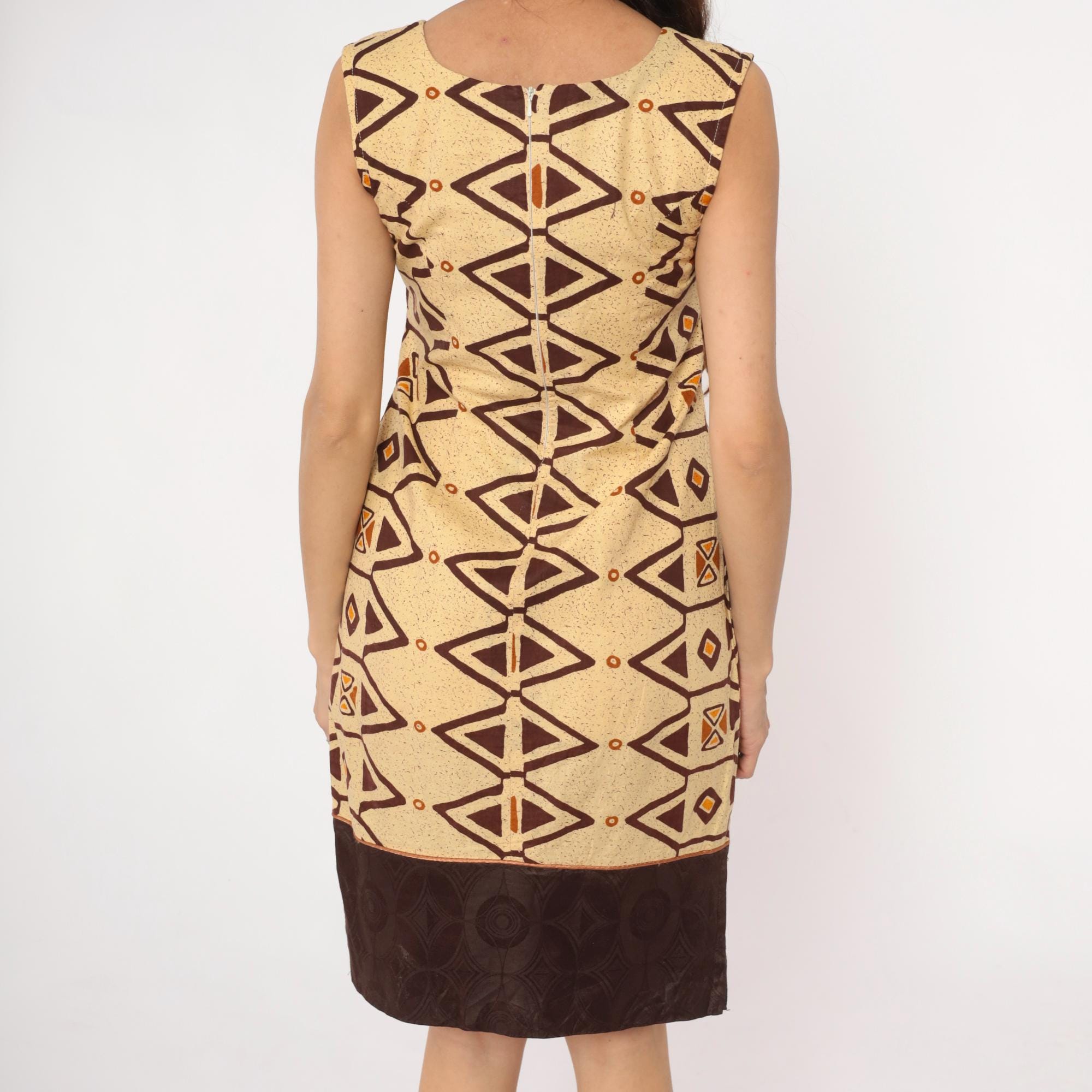 Y2k sleeveless shift dress with geometric tribal print in cream, brown, and orange tones. Diamond and triangle motifs arranged in vertical mirror pattern down the front and back, brown textured border at hem. Round neckline, straight silhouette with side seam construction.