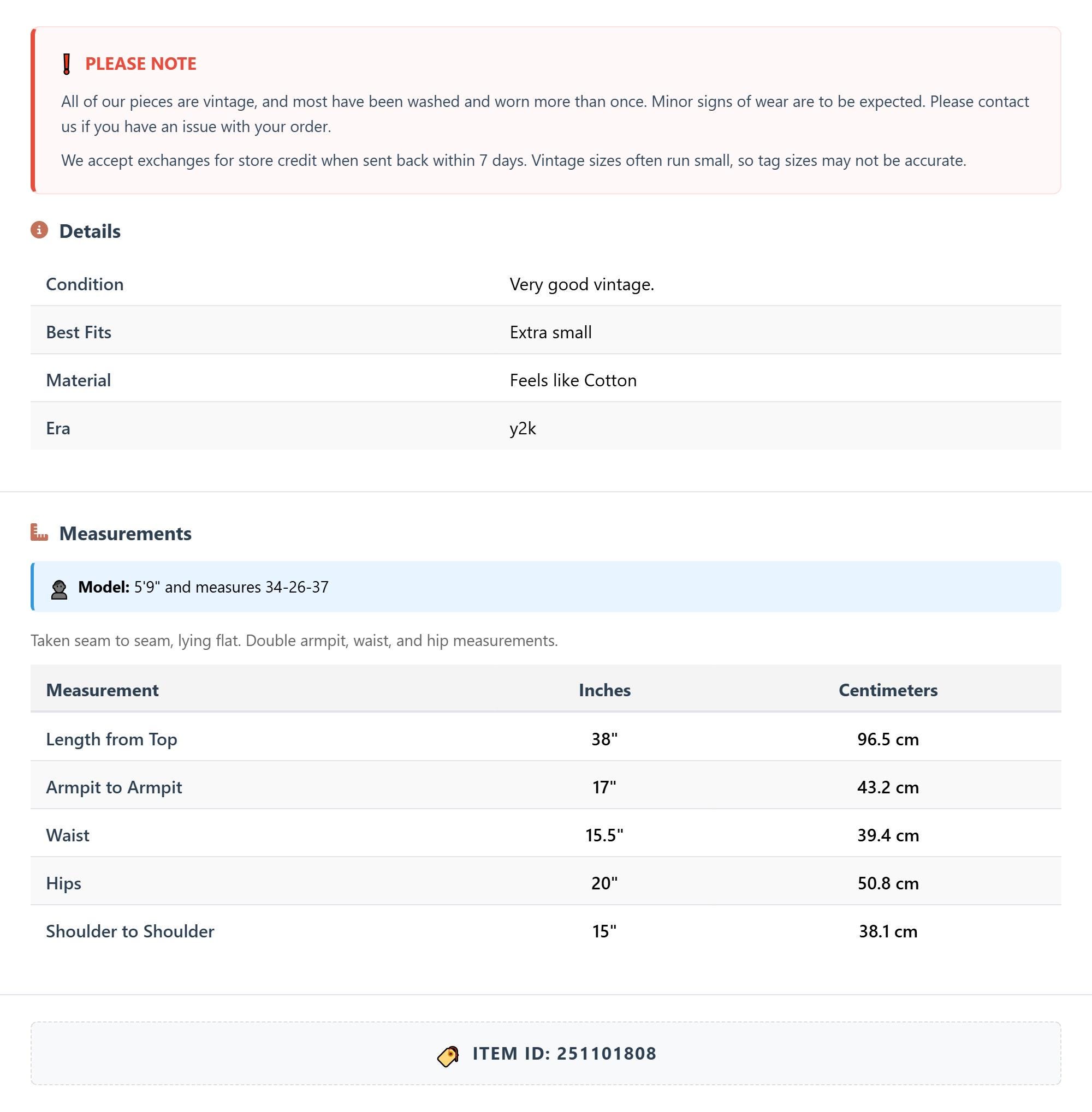 Suggested sizes are estimates only; see measurements for exact sizing. Vintage sizes often run small, so tag sizes may not be accurate.