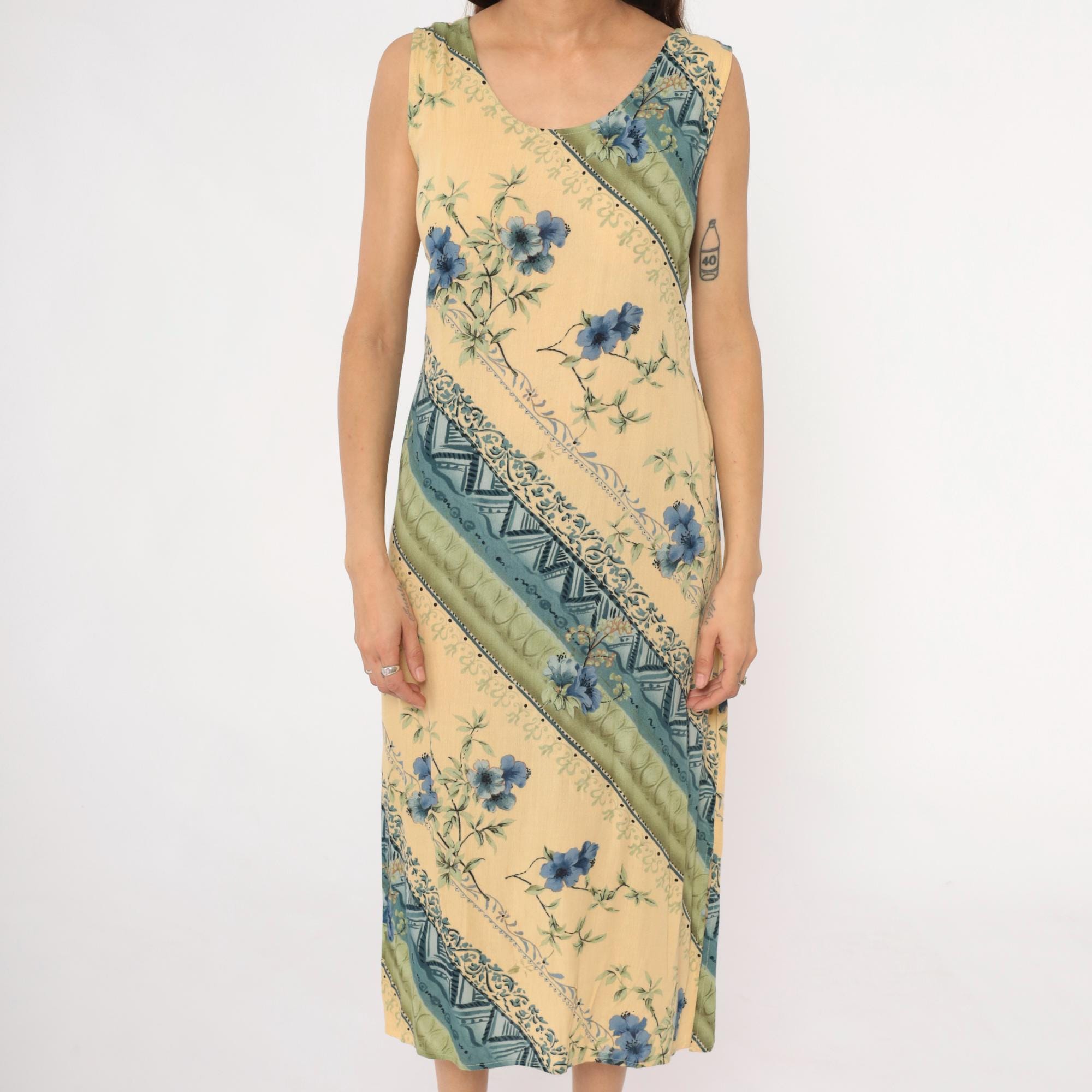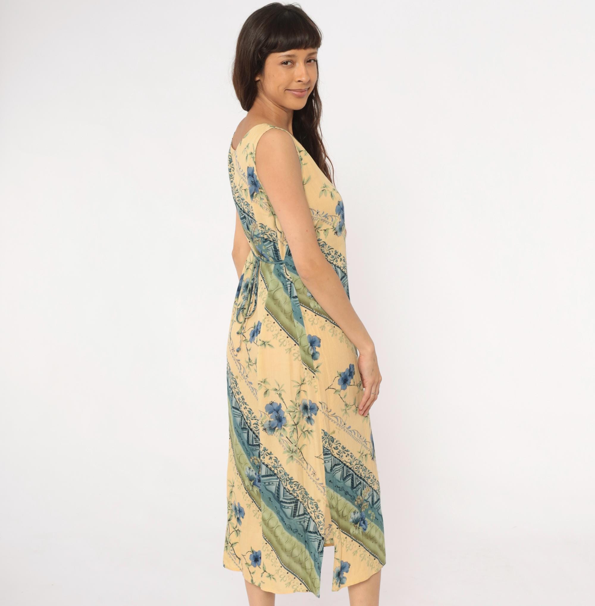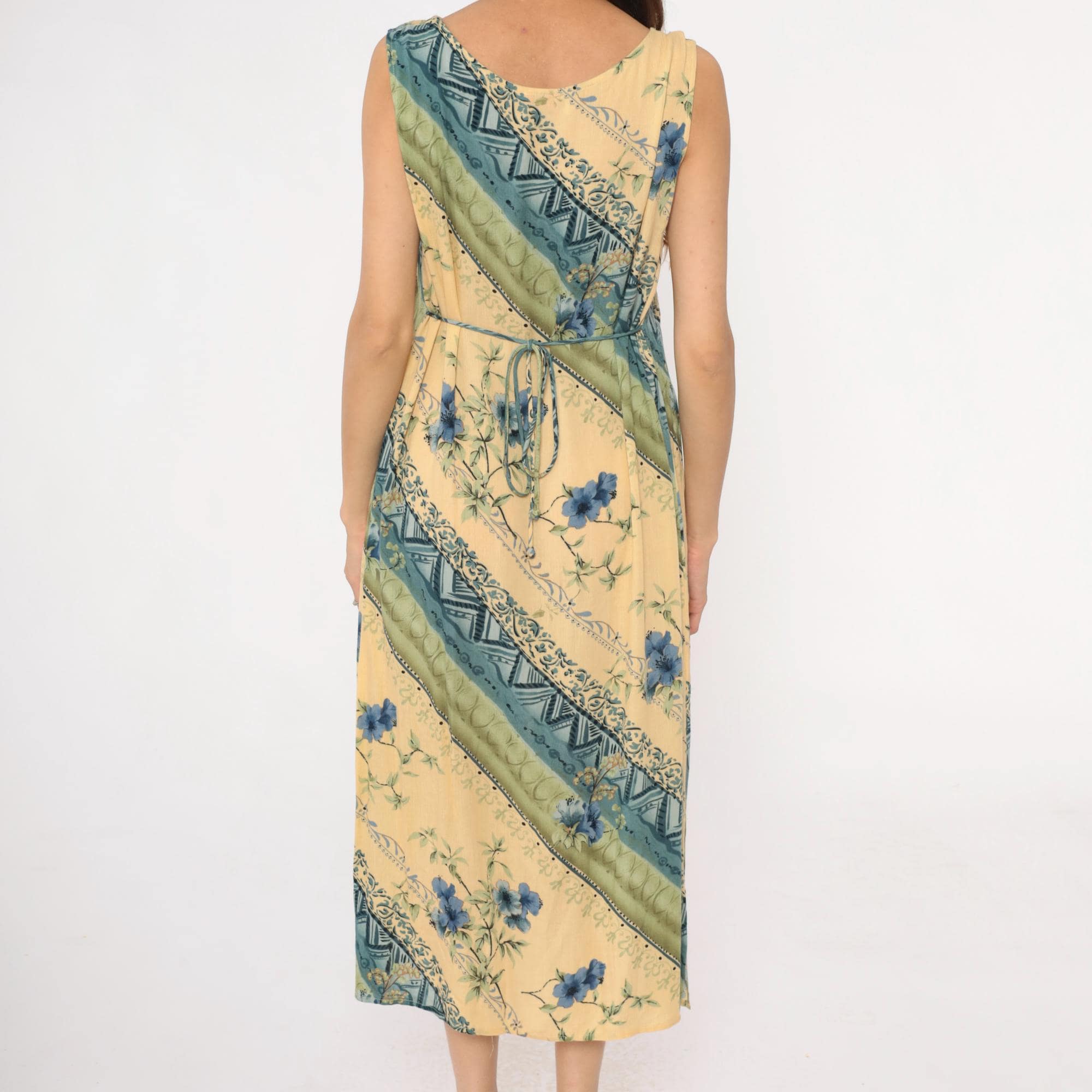 90s yellow midi dress from r&k originals with diagonal stripe pattern throughout. Blue floral print alternates with geometric tribal motifs and dotted bands across the fabric. Scoop neckline, sleeveless, tie belt at back waist.