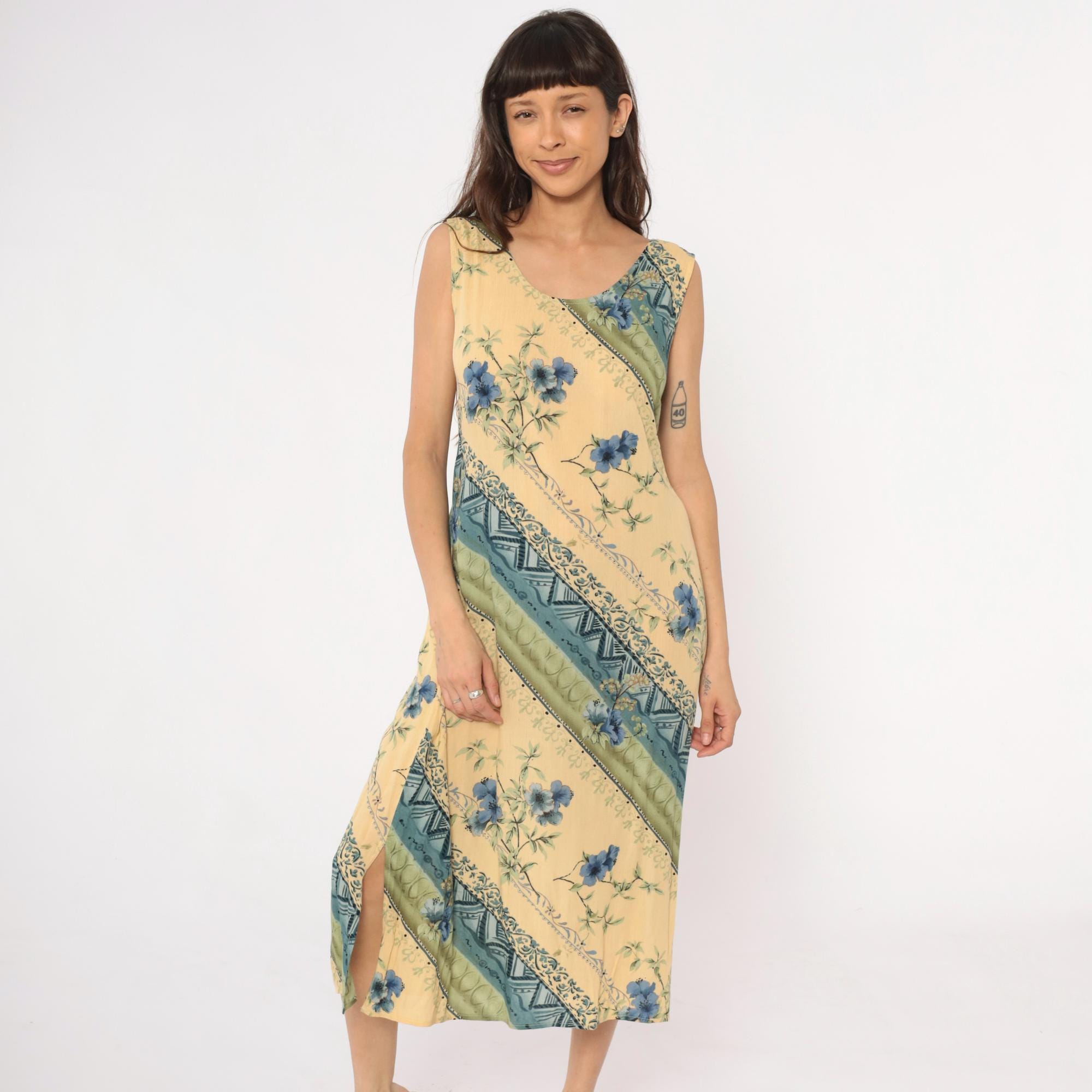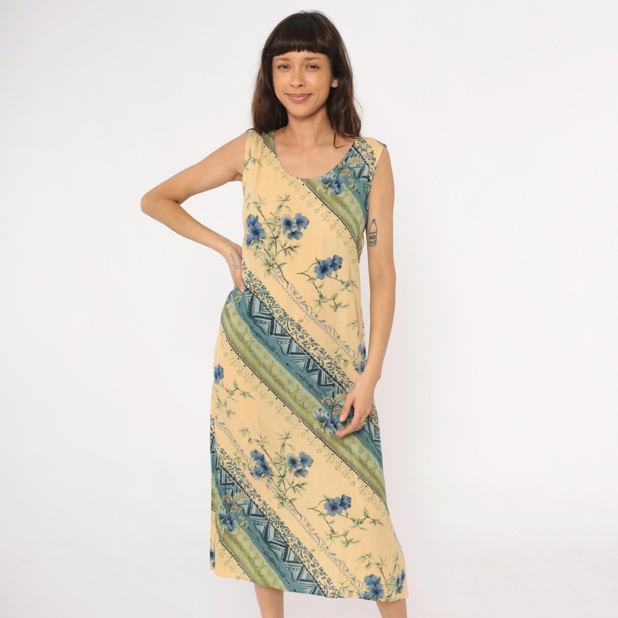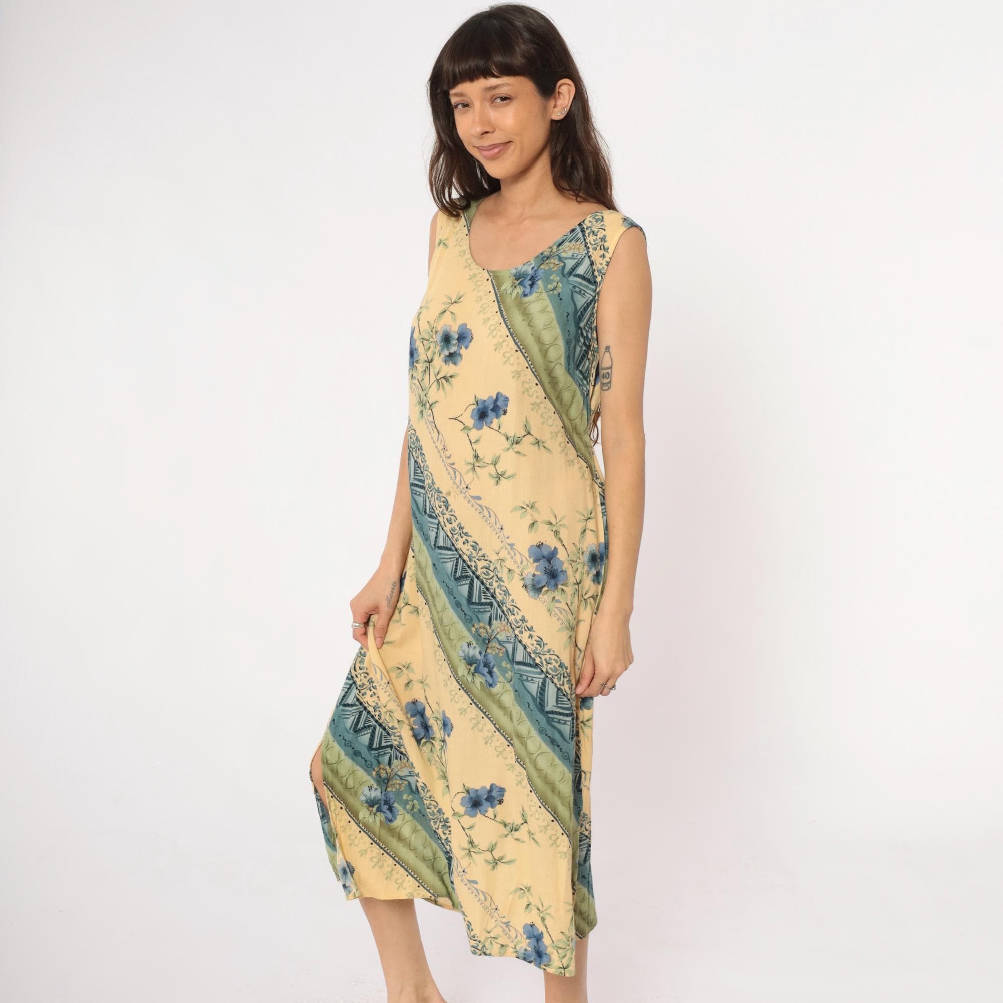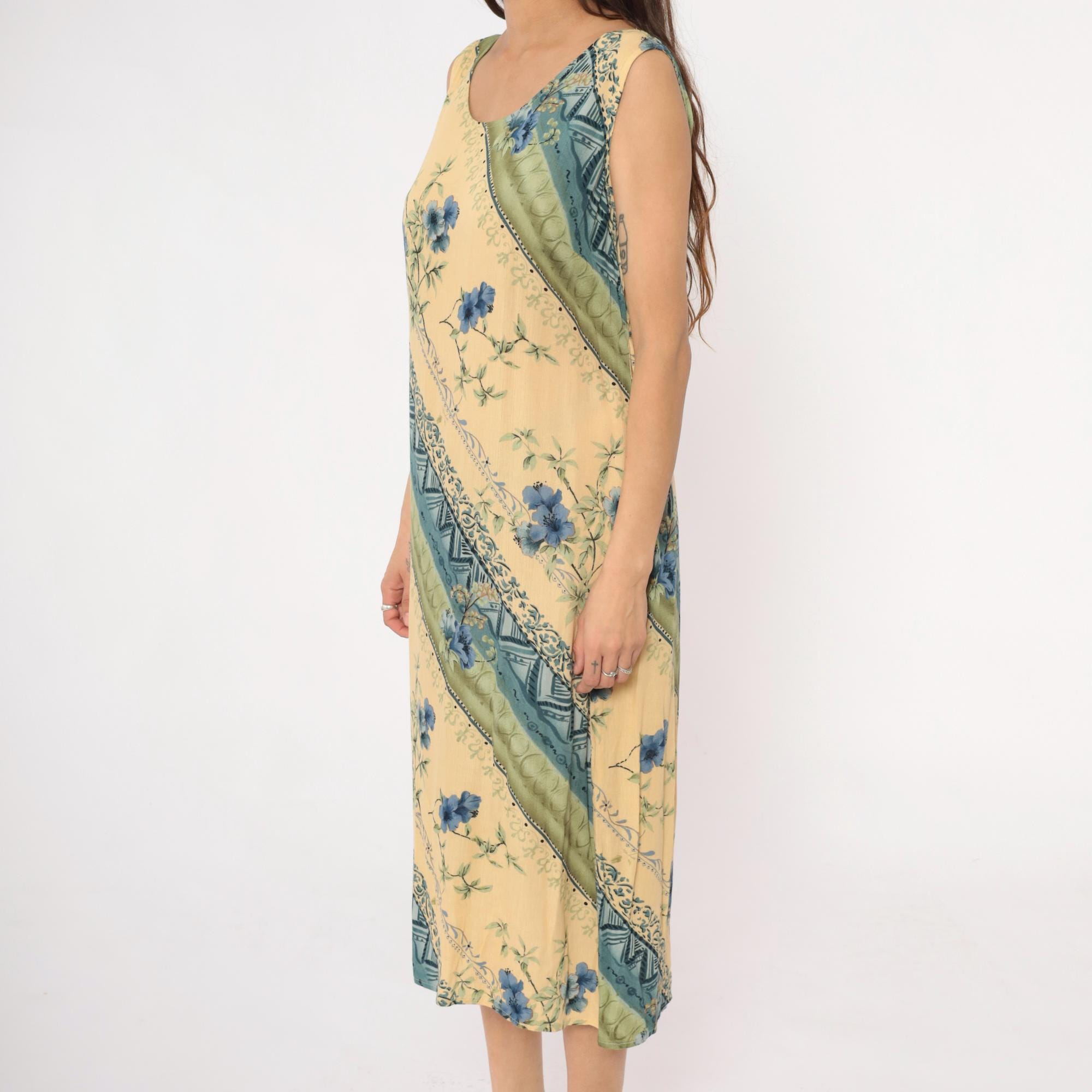 90s yellow midi dress from r&k originals with diagonal stripe pattern throughout. Blue floral print alternates with geometric tribal motifs and dotted bands across the fabric. Scoop neckline, sleeveless, tie belt at back waist.