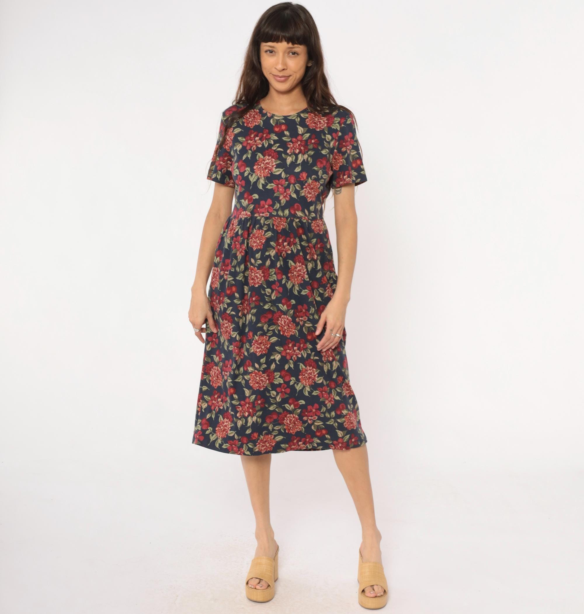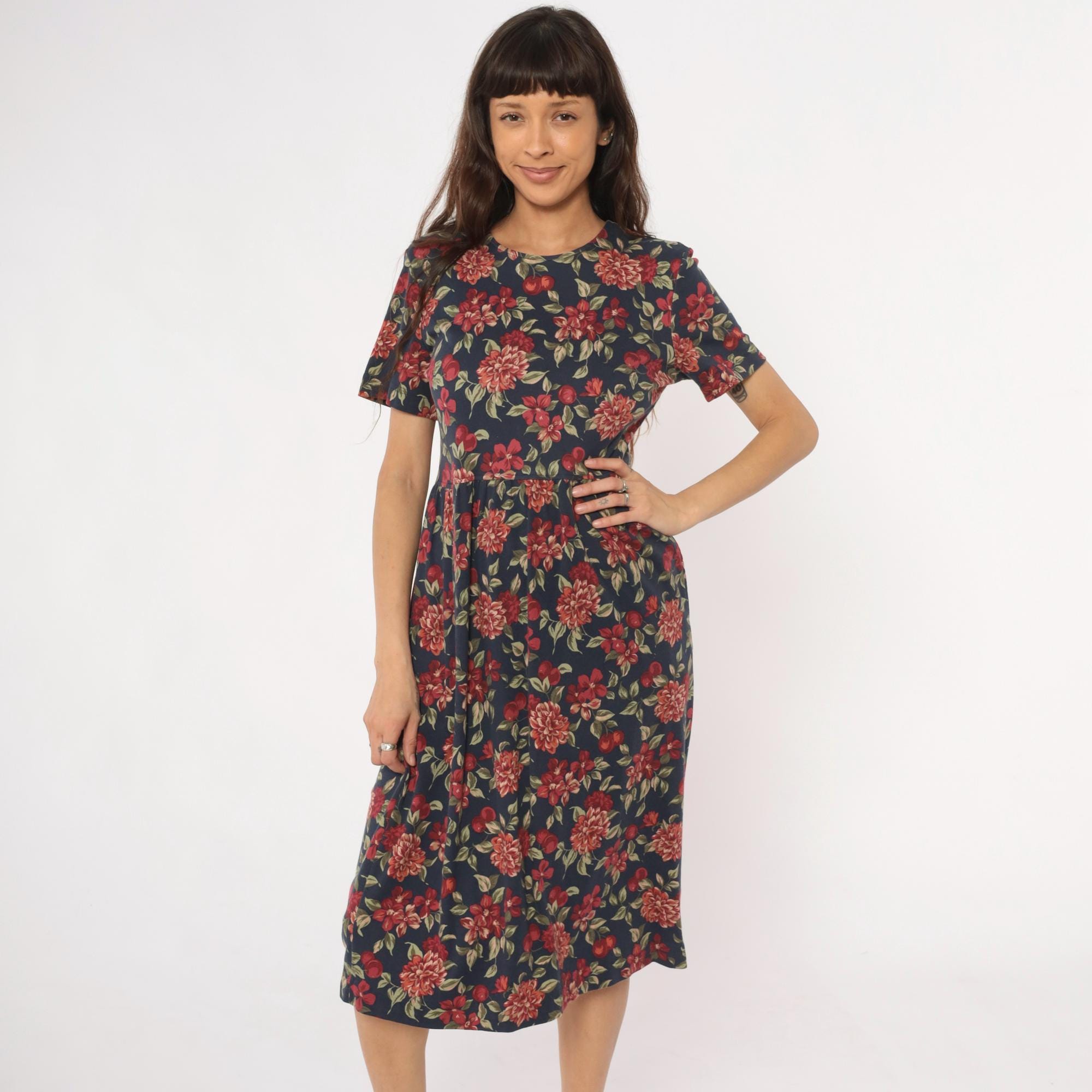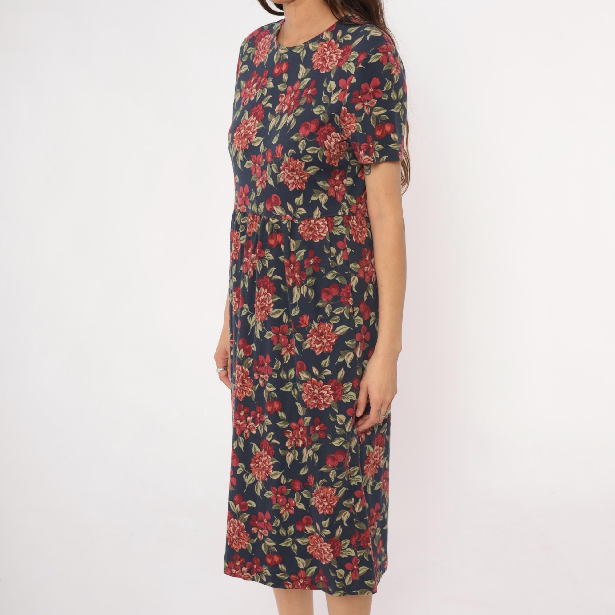 90s navy blue floral midi dress from Talbots with red, pink, and coral dahlias, smaller flowers, cherries, and green leaves across the fabric. Round neckline, short sleeves, fitted bodice with gathered waist, and A-line skirt.