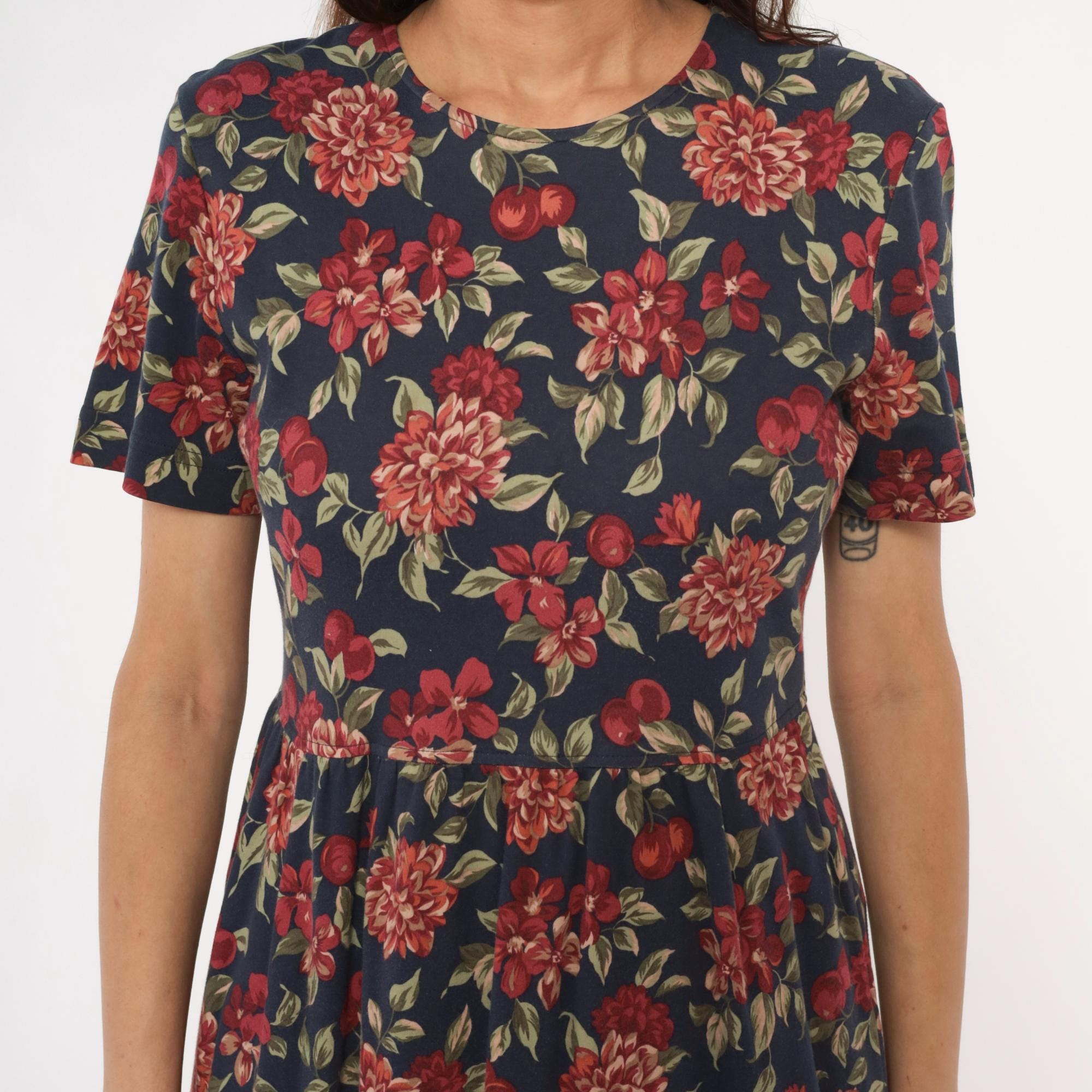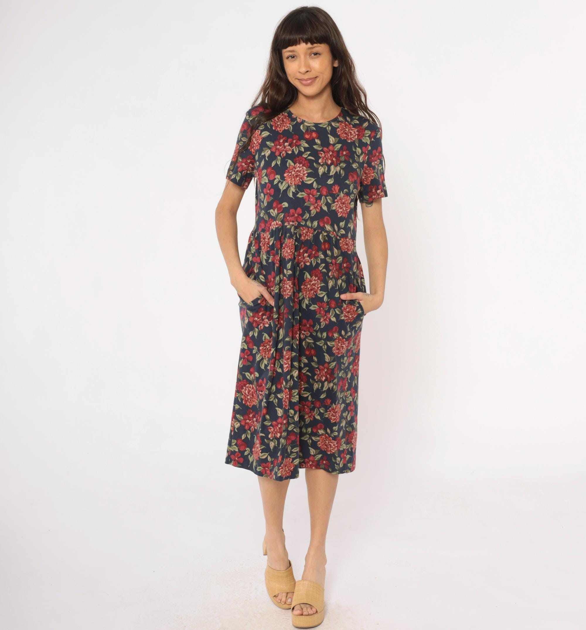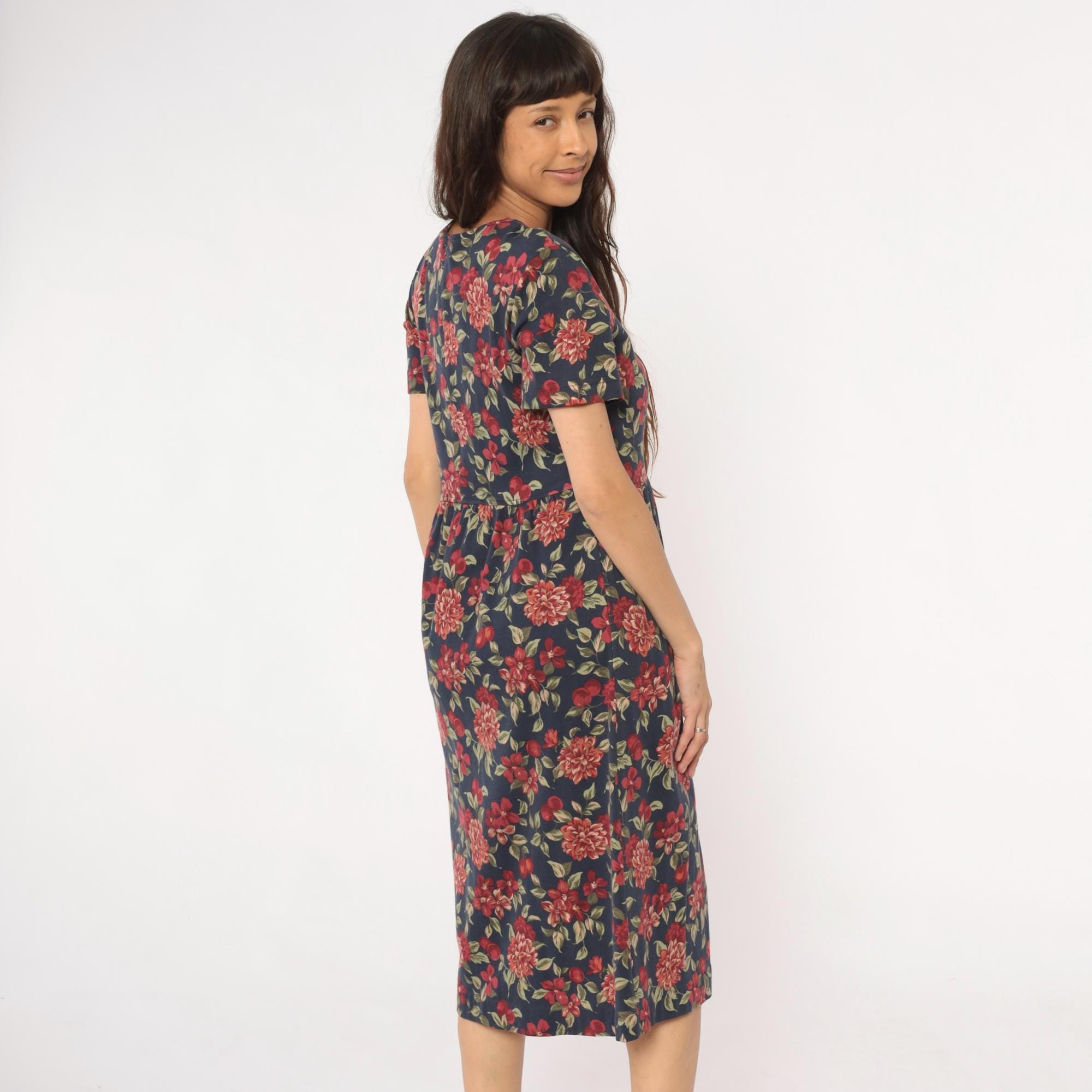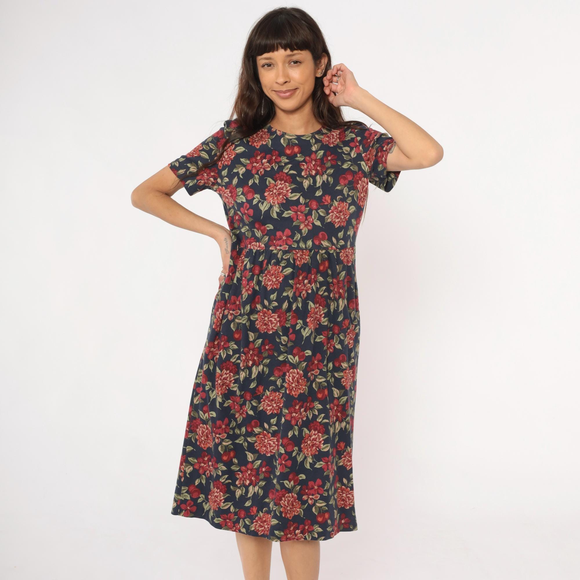 90s navy blue floral midi dress from Talbots with red, pink, and coral dahlias, smaller flowers, cherries, and green leaves across the fabric. Round neckline, short sleeves, fitted bodice with gathered waist, and A-line skirt.