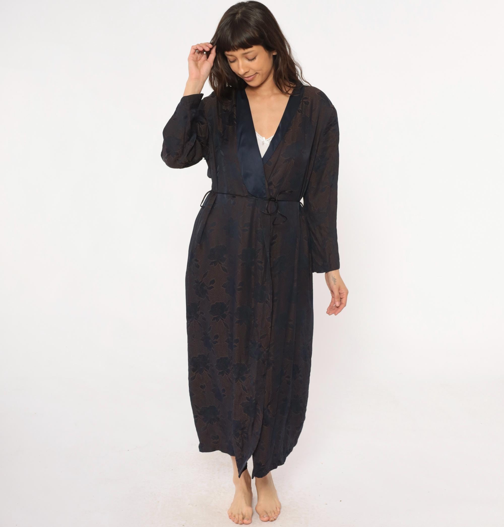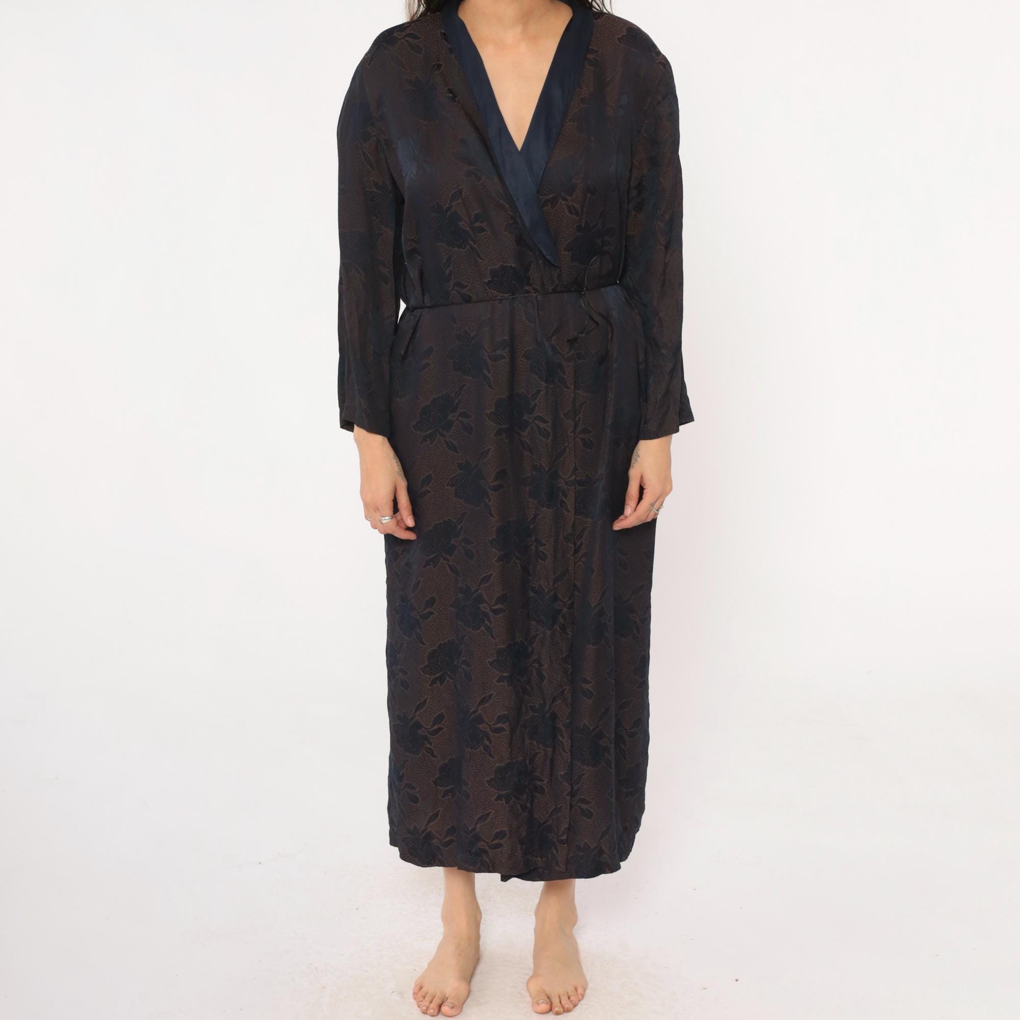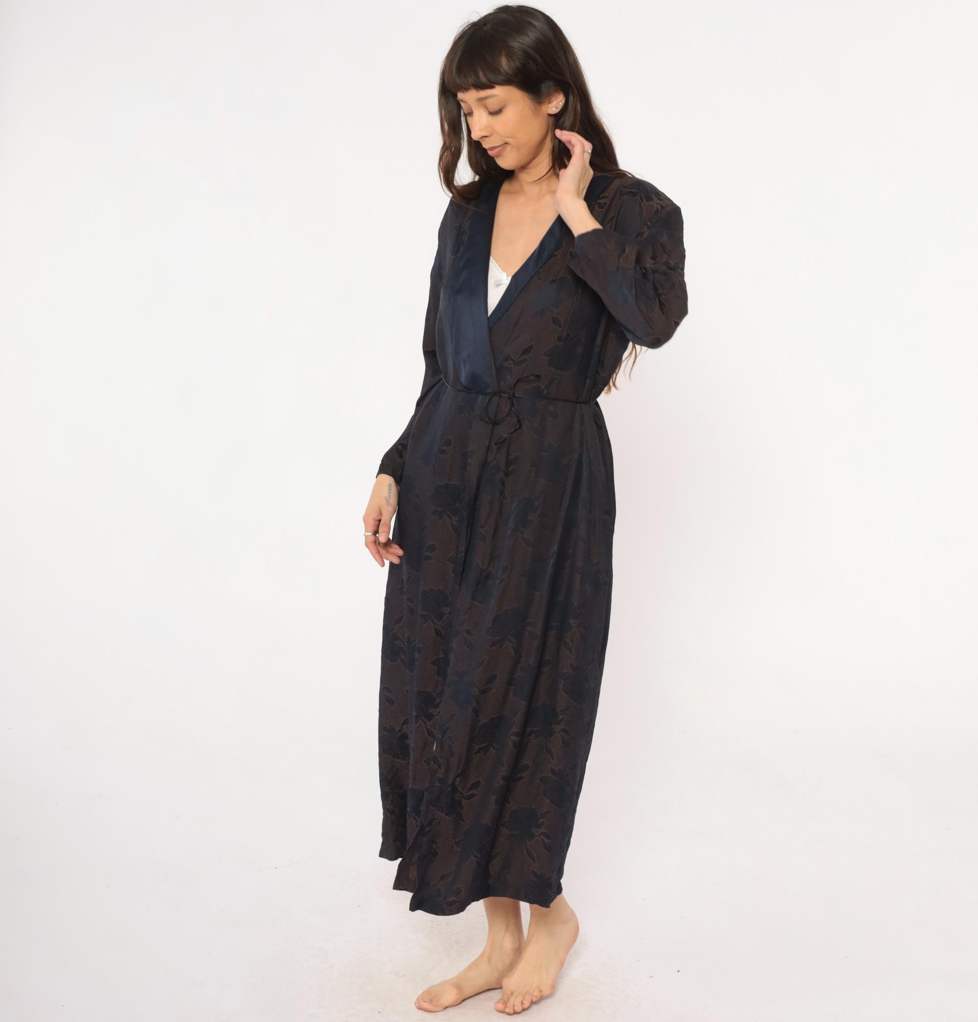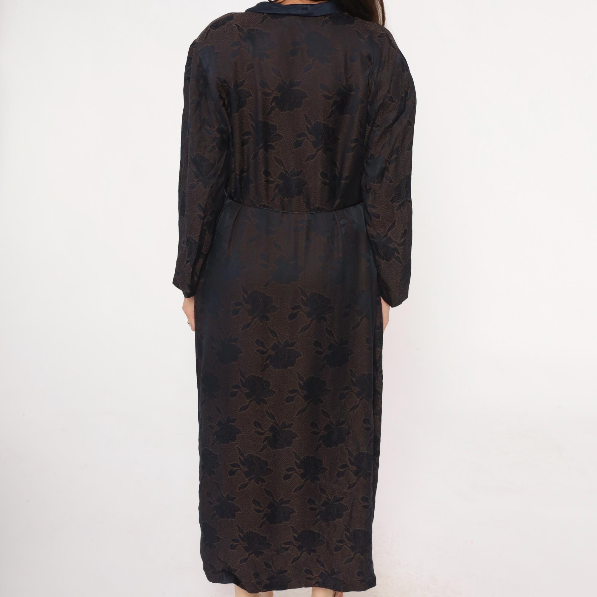 80s black maxi robe from Oscar de la Renta with tone-on-tone floral jacquard pattern across the fabric. Wrap front with attached tie belt, shawl collar with solid black trim, long sleeves.