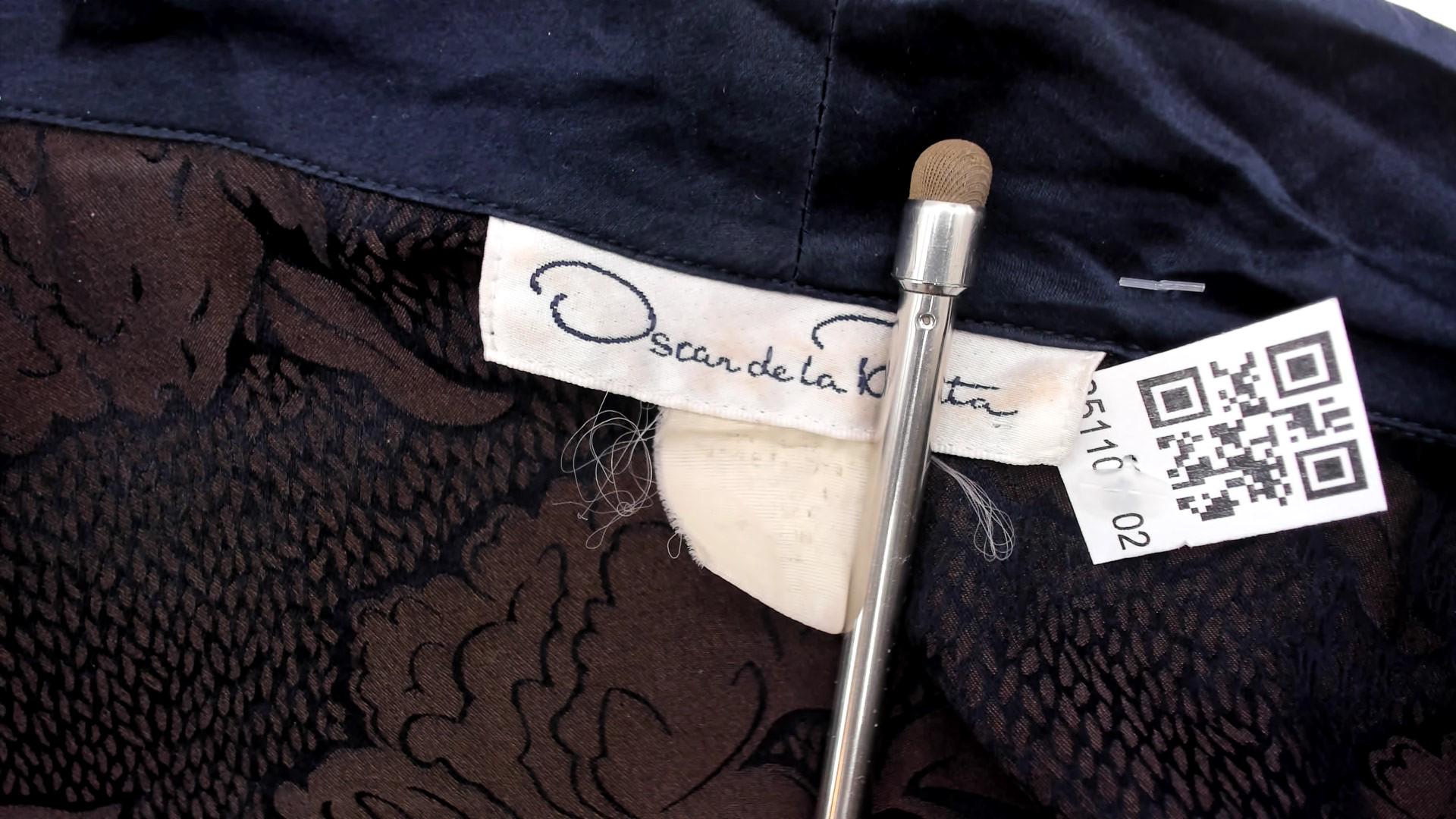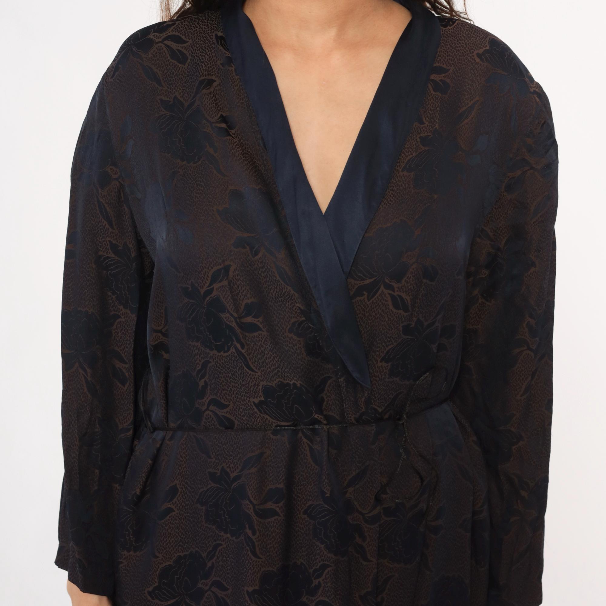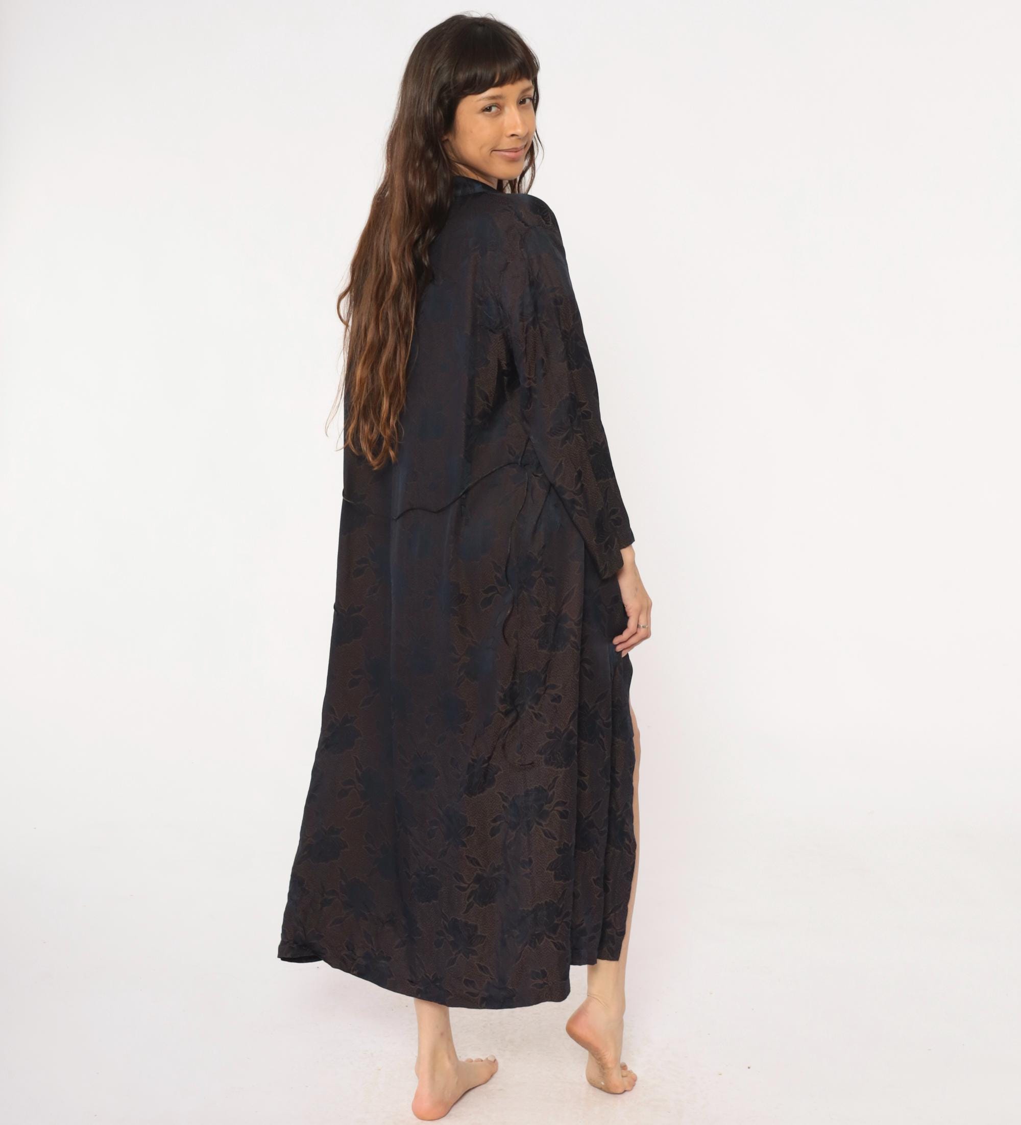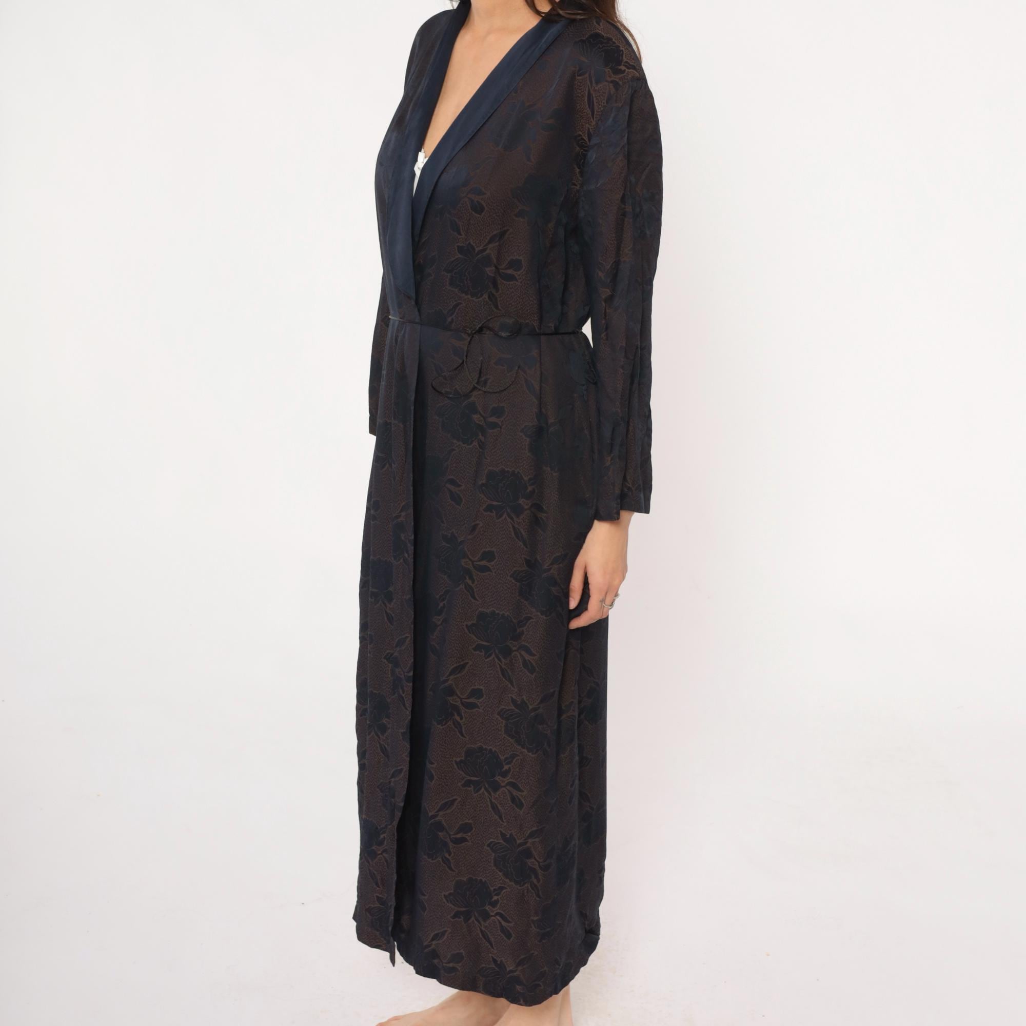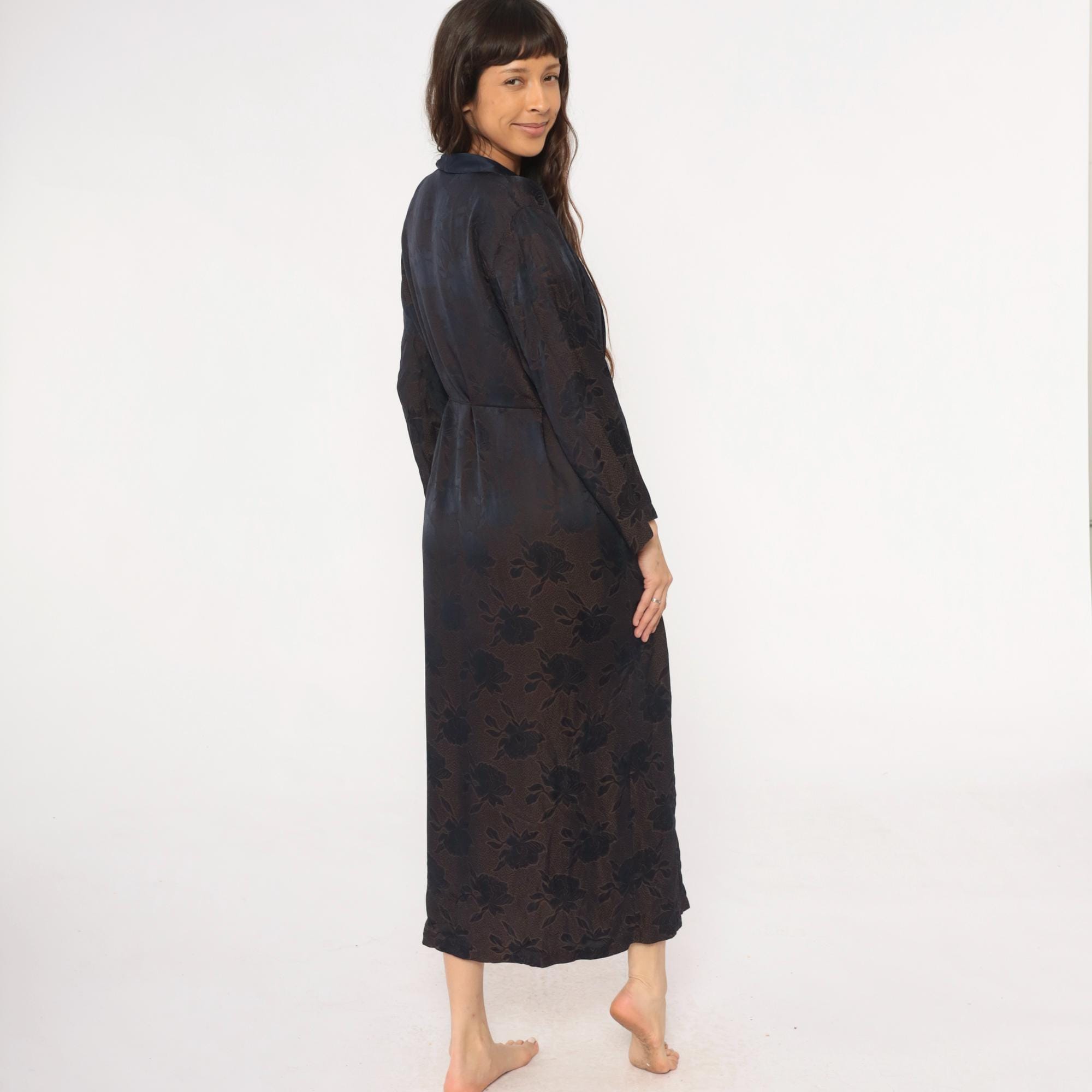 80s black maxi robe from Oscar de la Renta with tone-on-tone floral jacquard pattern across the fabric. Wrap front with attached tie belt, shawl collar with solid black trim, long sleeves.