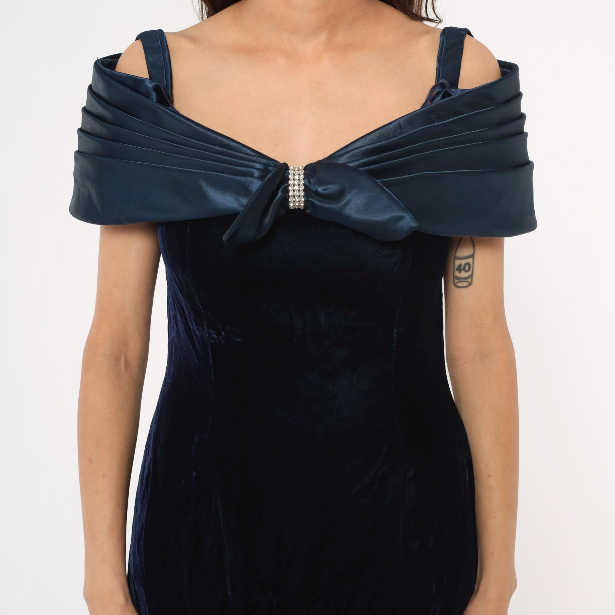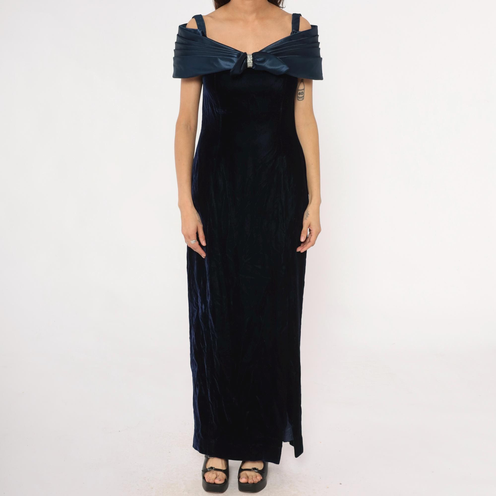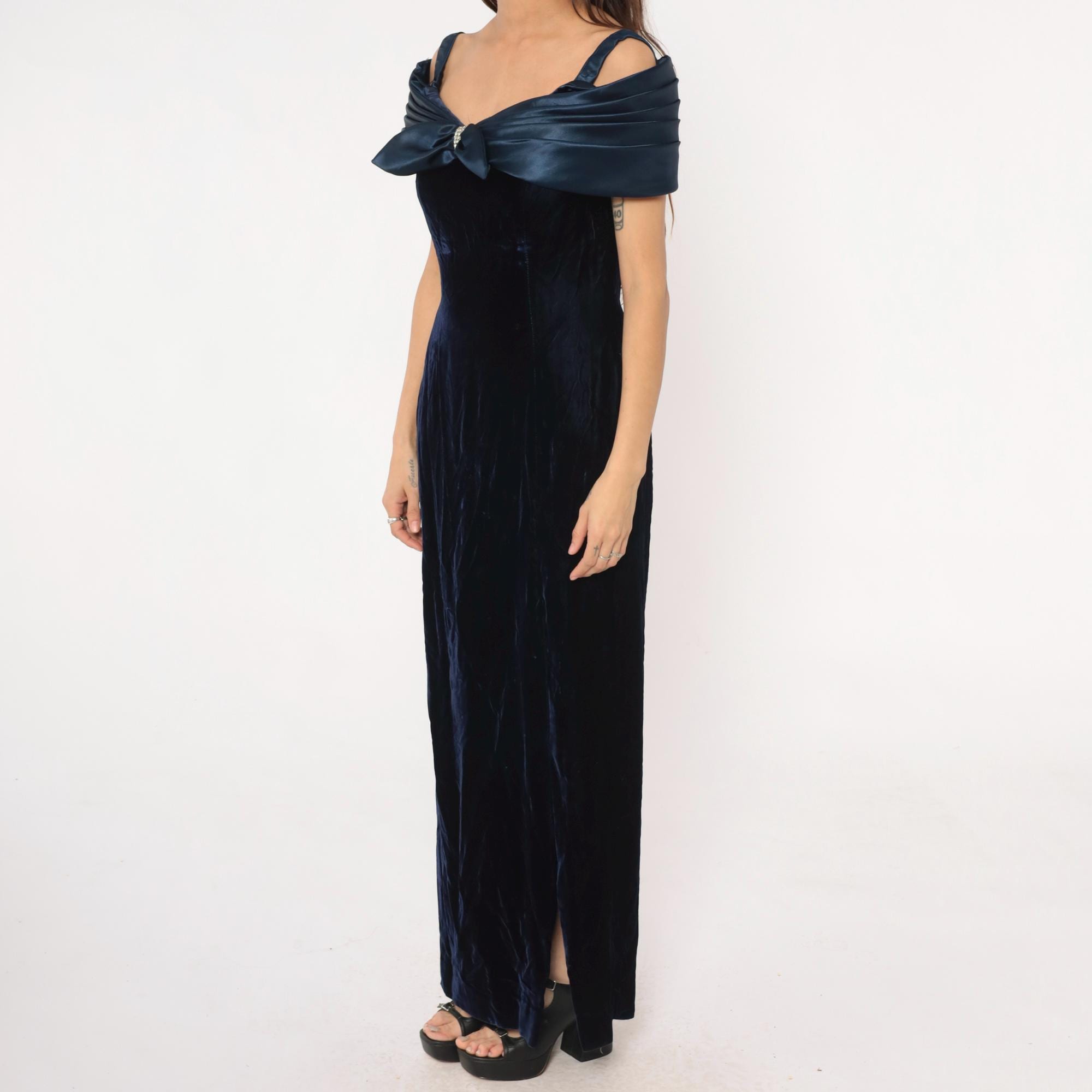 90s navy blue velvet maxi dress from reggio with navy satin off-shoulder bow detail and rhinestone center embellishment. Off-shoulder straps, fitted bodice, straight skirt with side slit.