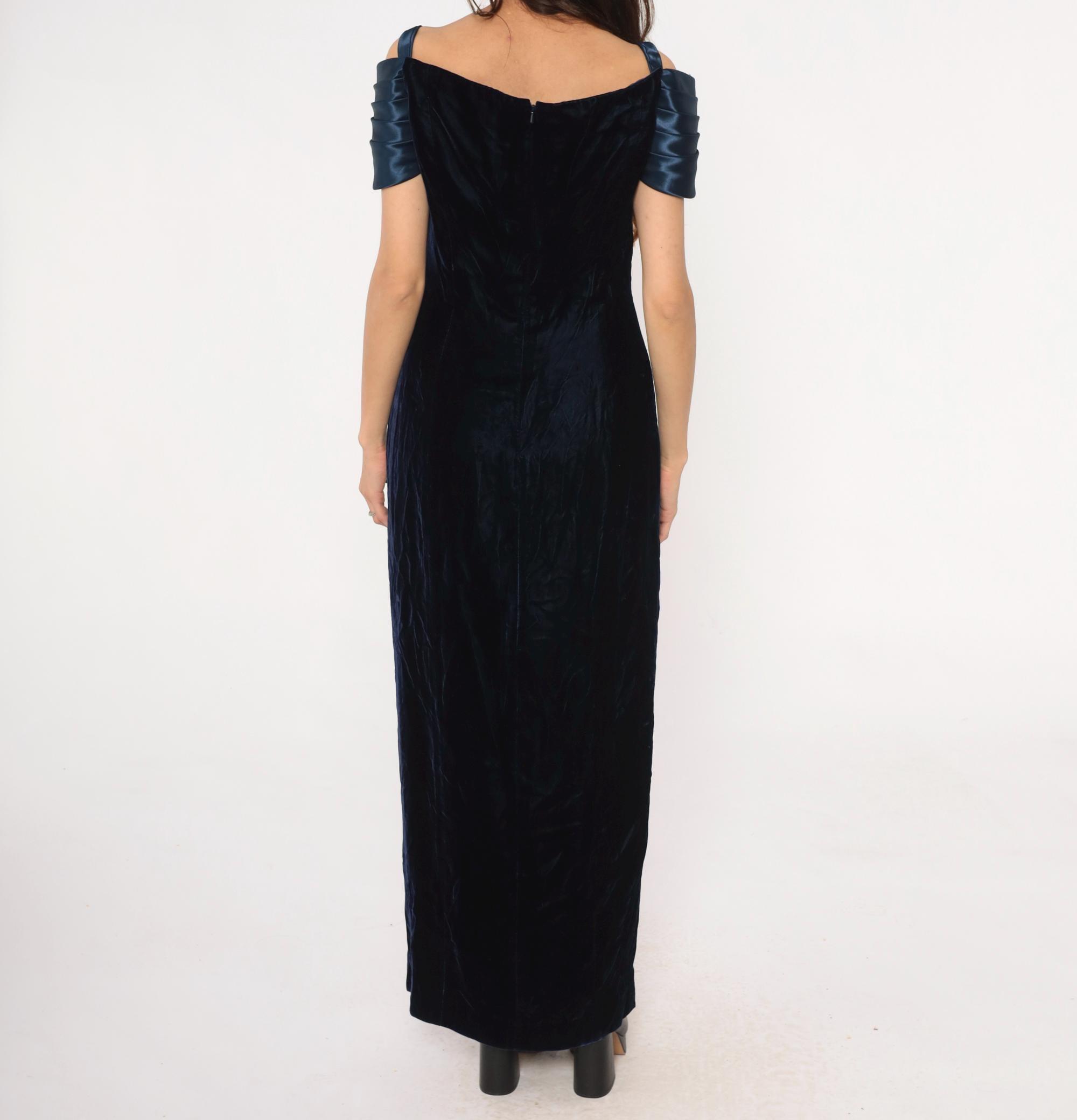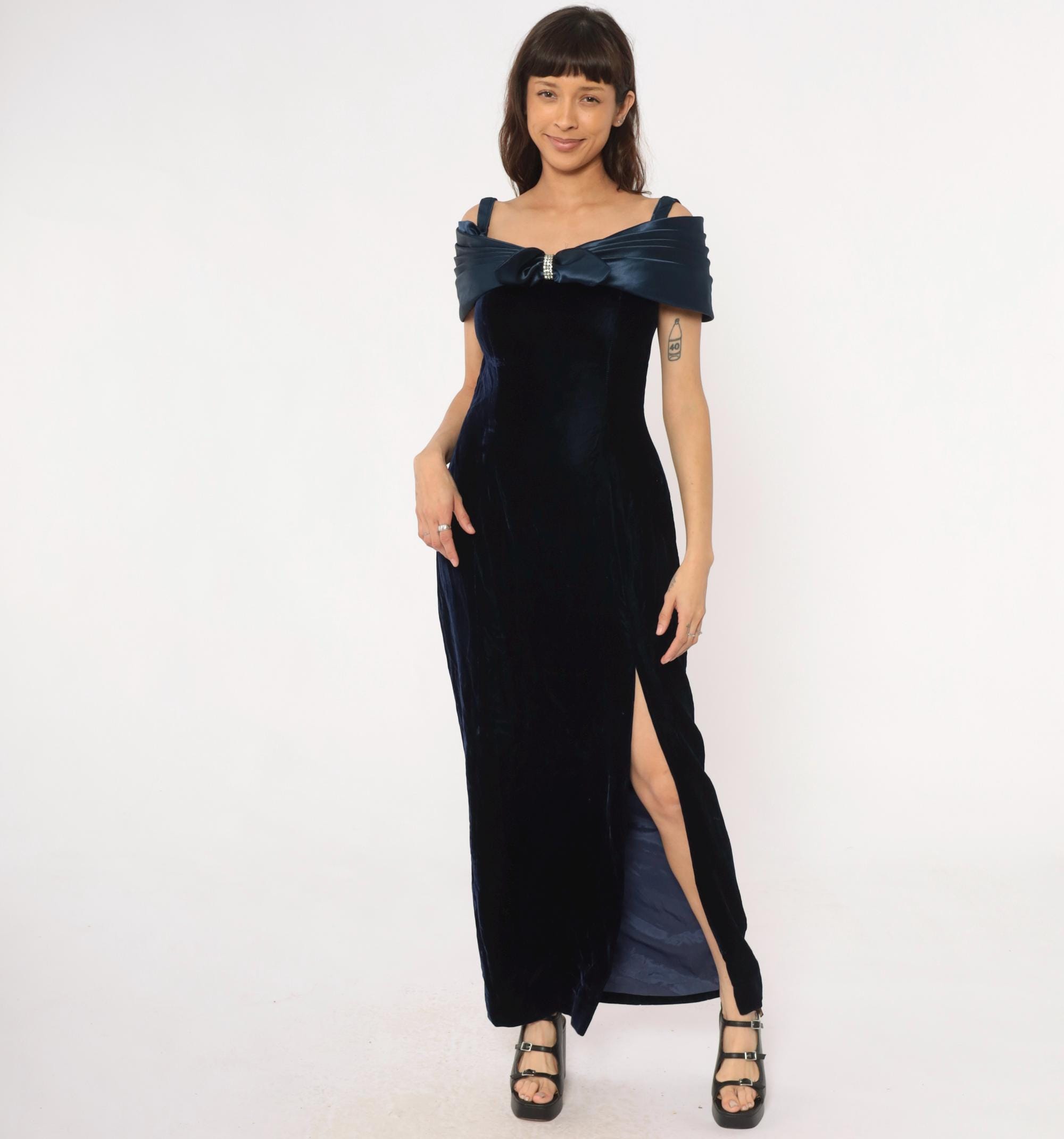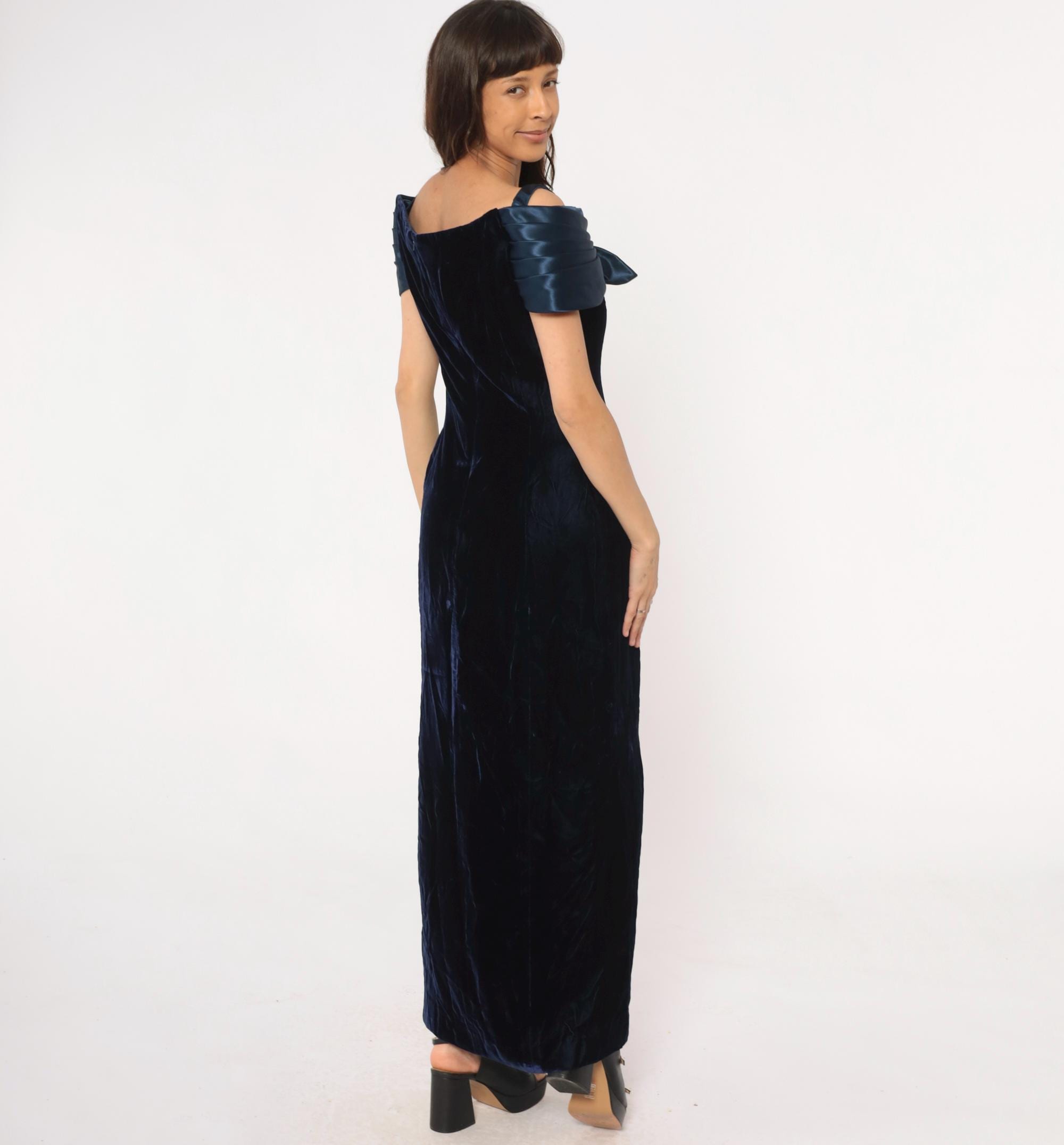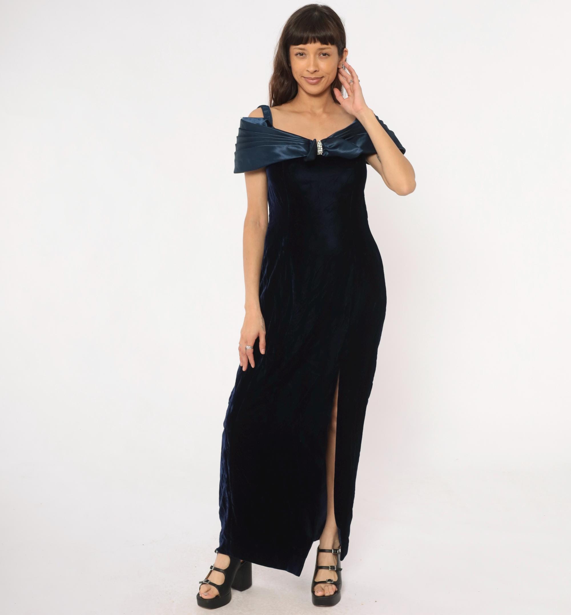 90s navy blue velvet maxi dress from reggio with navy satin off-shoulder bow detail and rhinestone center embellishment. Off-shoulder straps, fitted bodice, straight skirt with side slit.