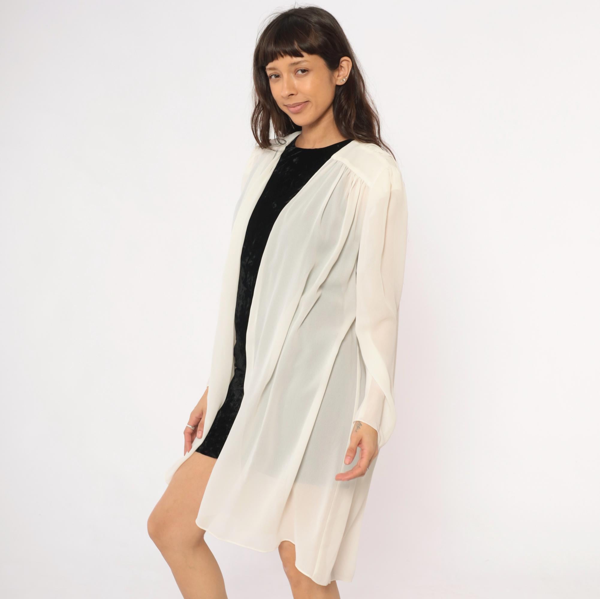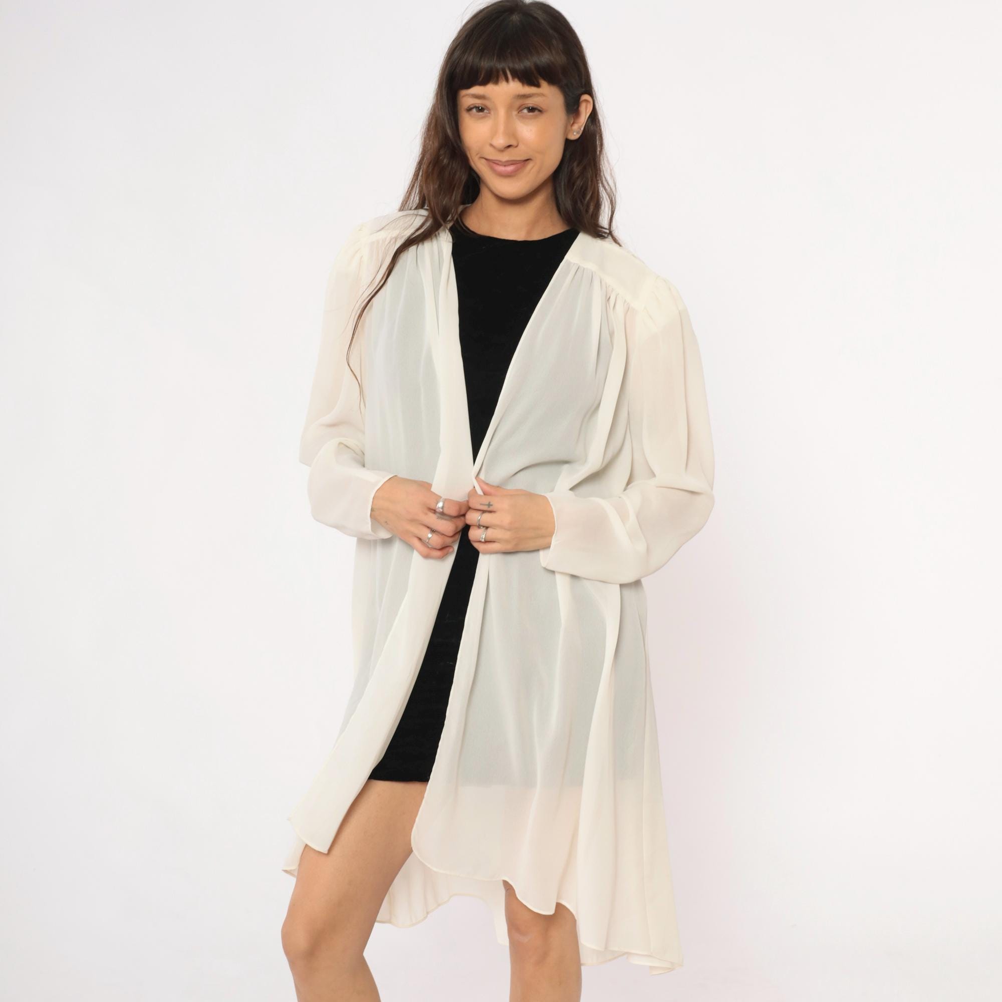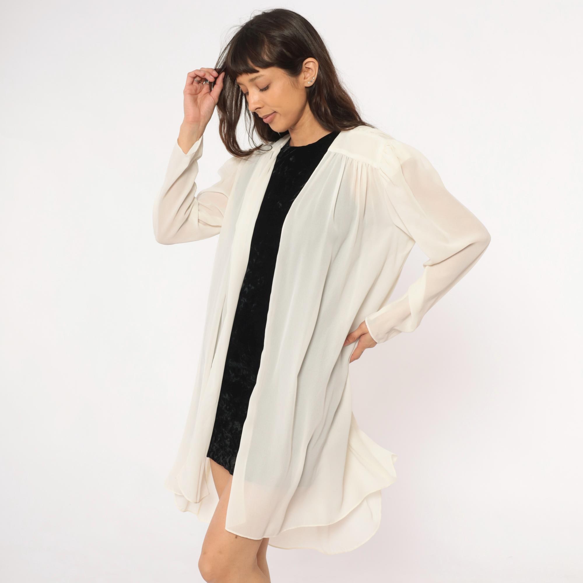 90s cream sheer duster from patra with open front and gathered shoulder detail. Long sleeves and extended length, worn open as a lightweight layer.