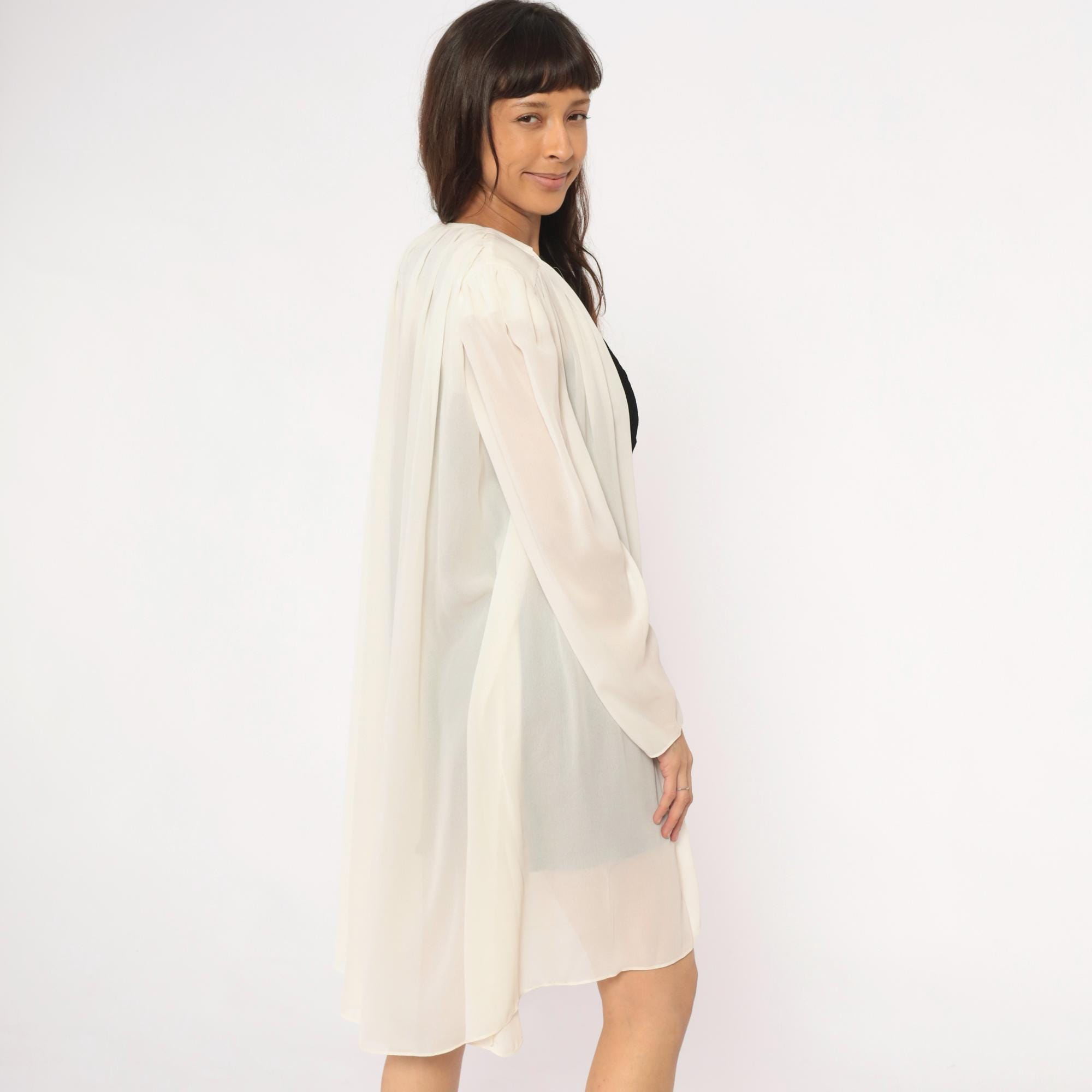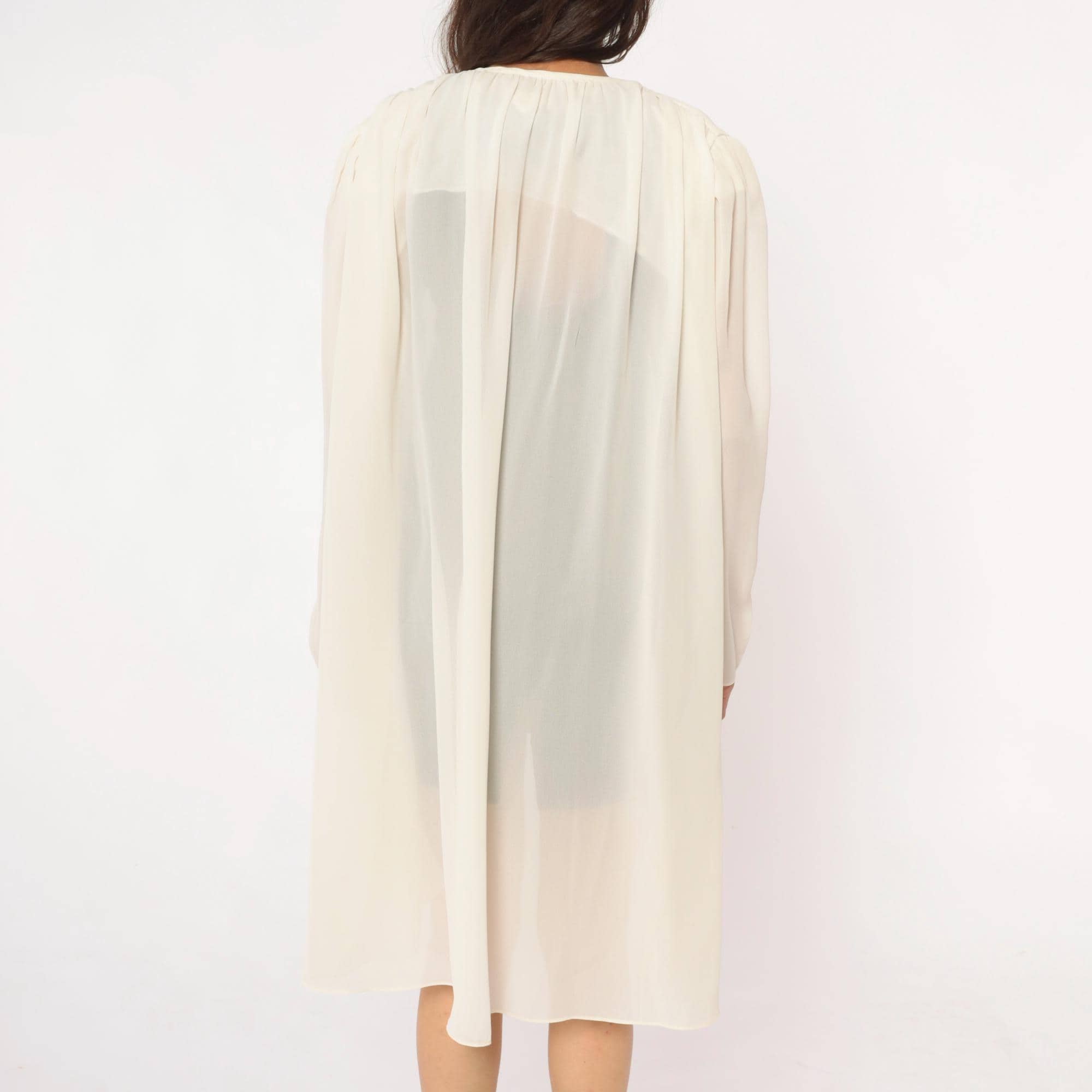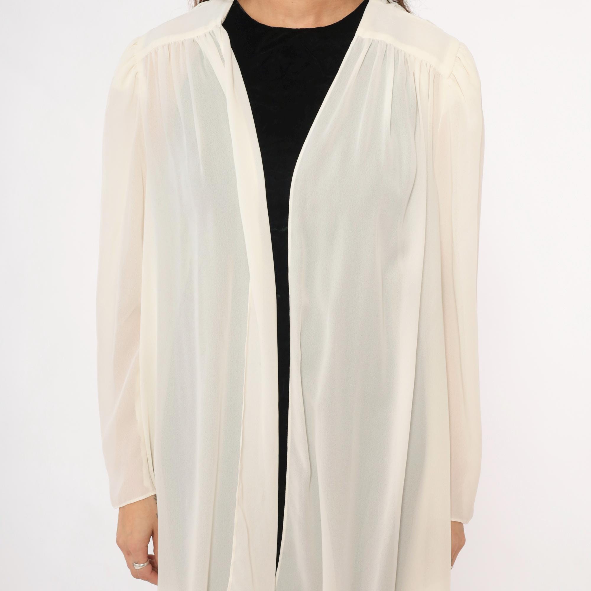 90s cream sheer duster from patra with open front and gathered shoulder detail. Long sleeves and extended length, worn open as a lightweight layer.