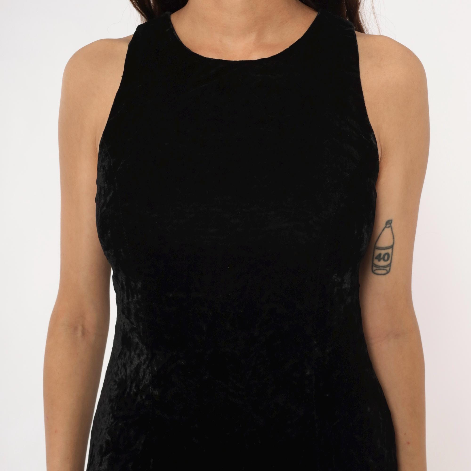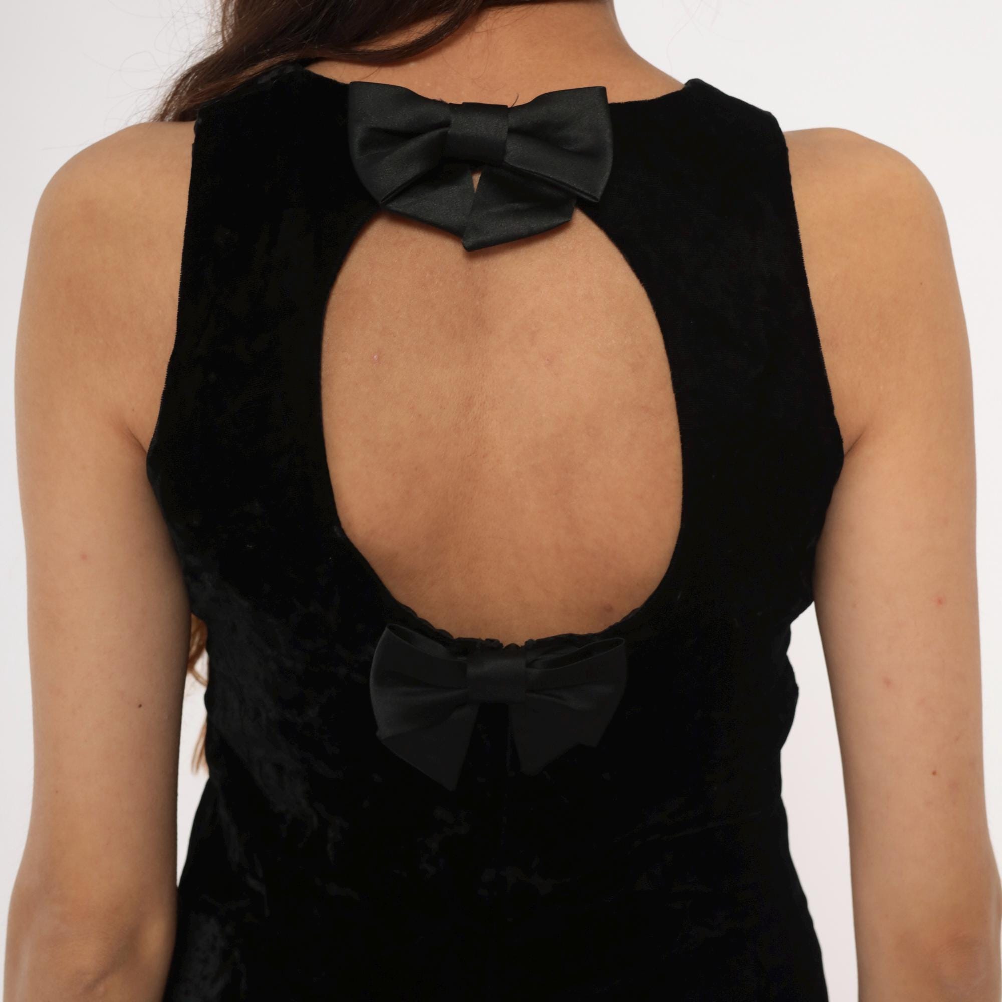 90s black velvet mini dress from donna ricco with sleeveless bodice, high round neckline, and open back keyhole cutout. Two black satin bows at back neckline and lower back, fitted silhouette with short inseam.