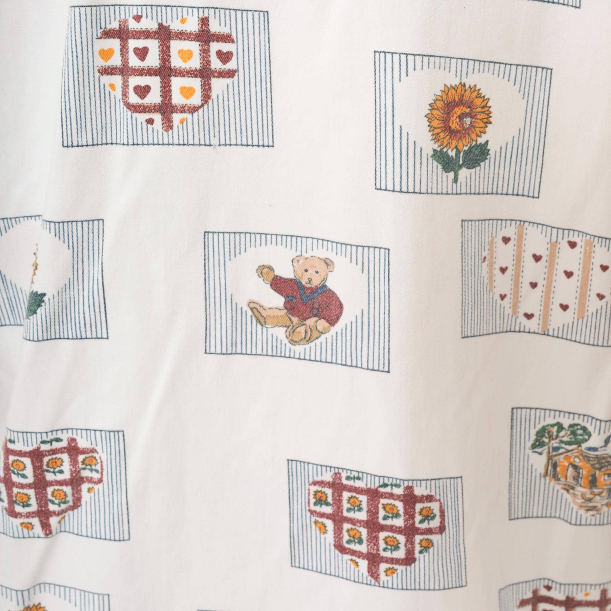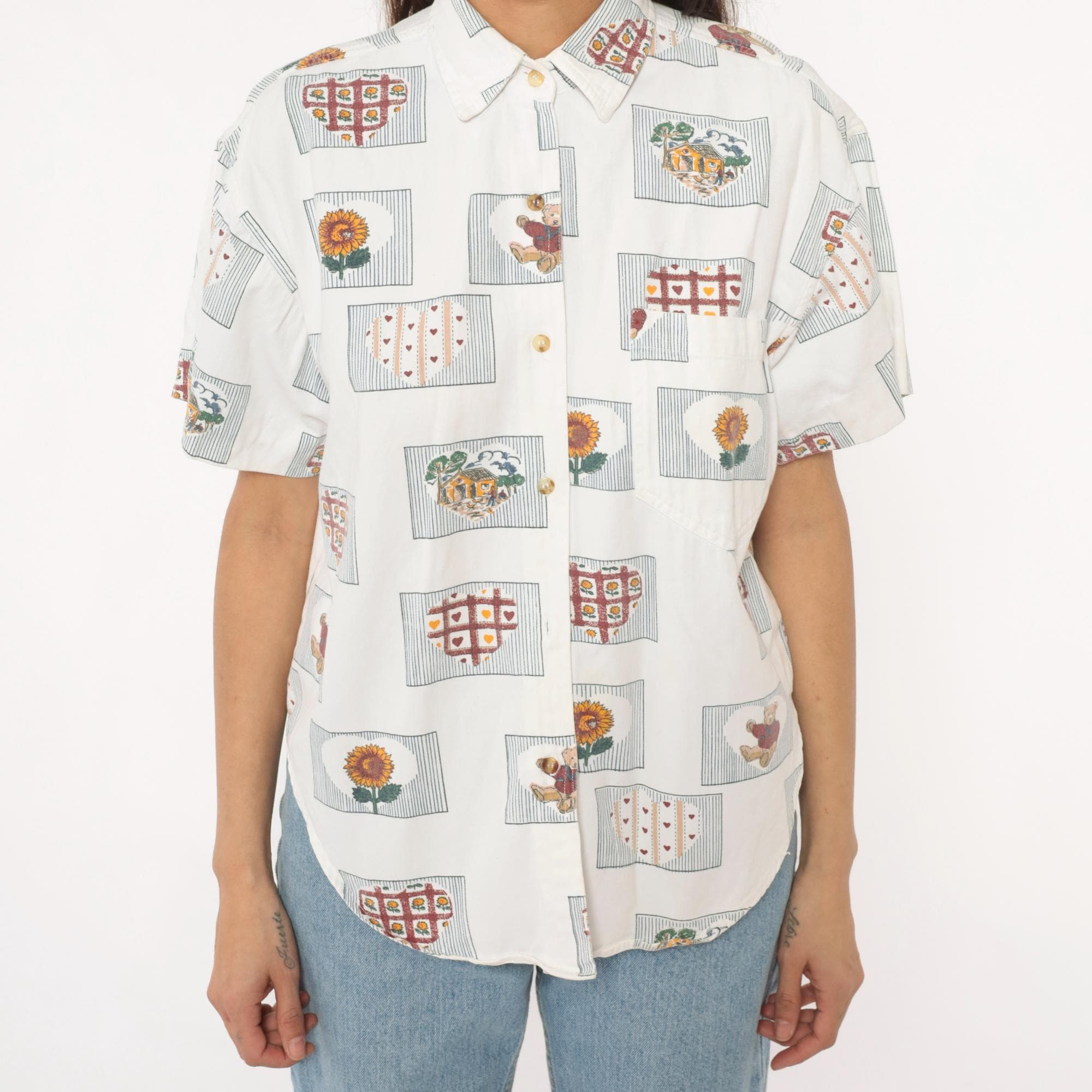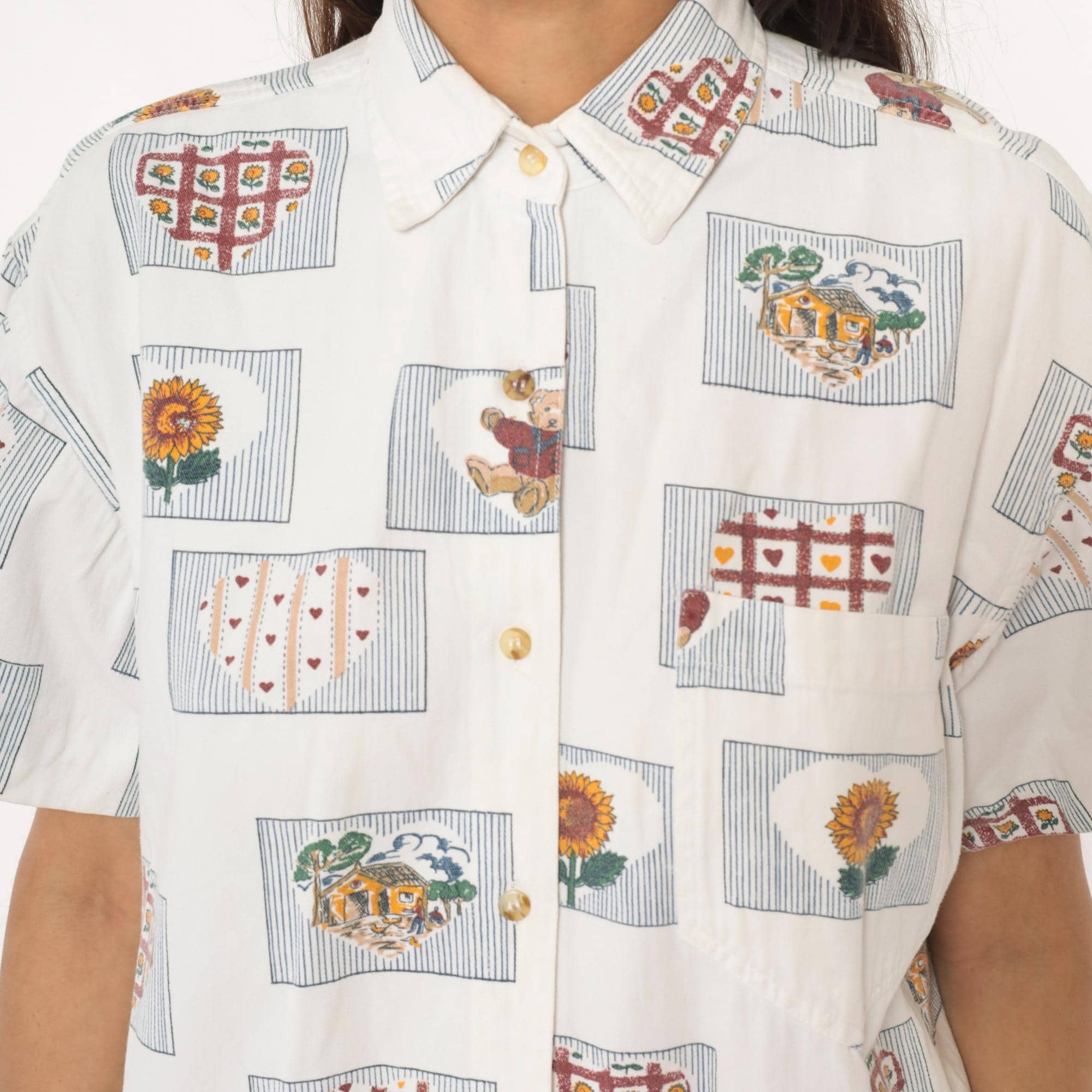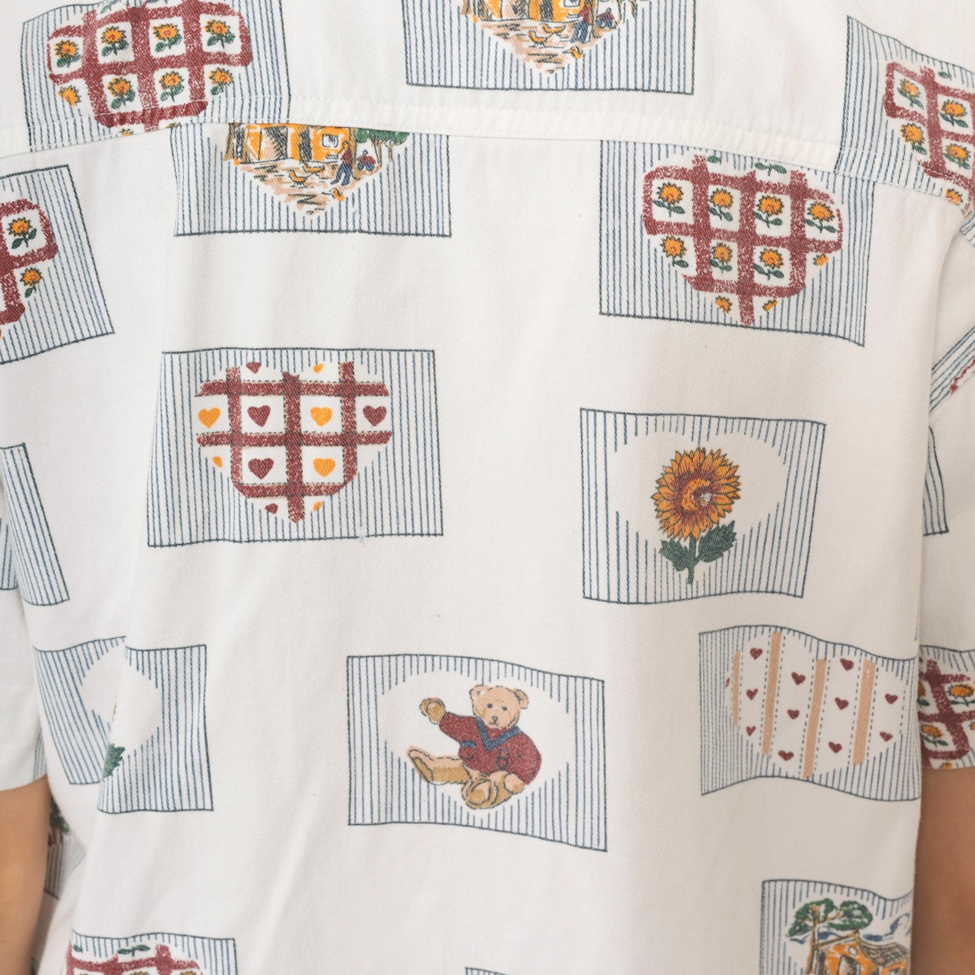 90s cream short-sleeve button-up shirt with all-over novelty print of framed motifs including sunflowers, teddy bears, heart grids, and trees. Each image sits within a rectangular frame with striped borders in burgundy, gold, green, and blue. Classic collar, button front closure, and short sleeves.