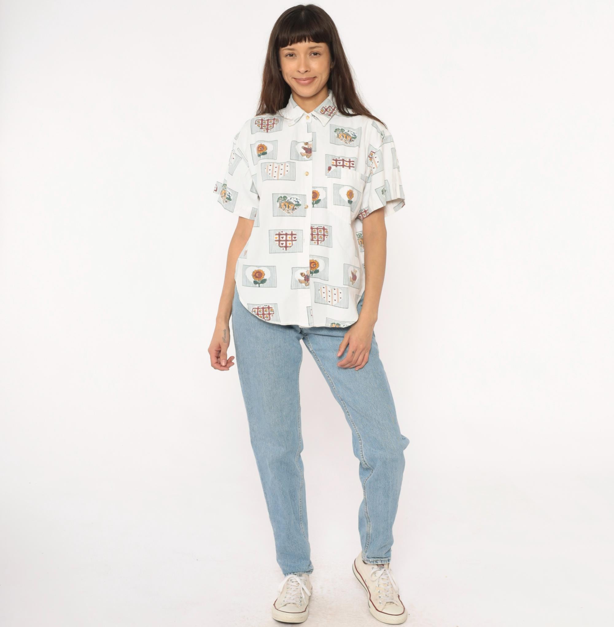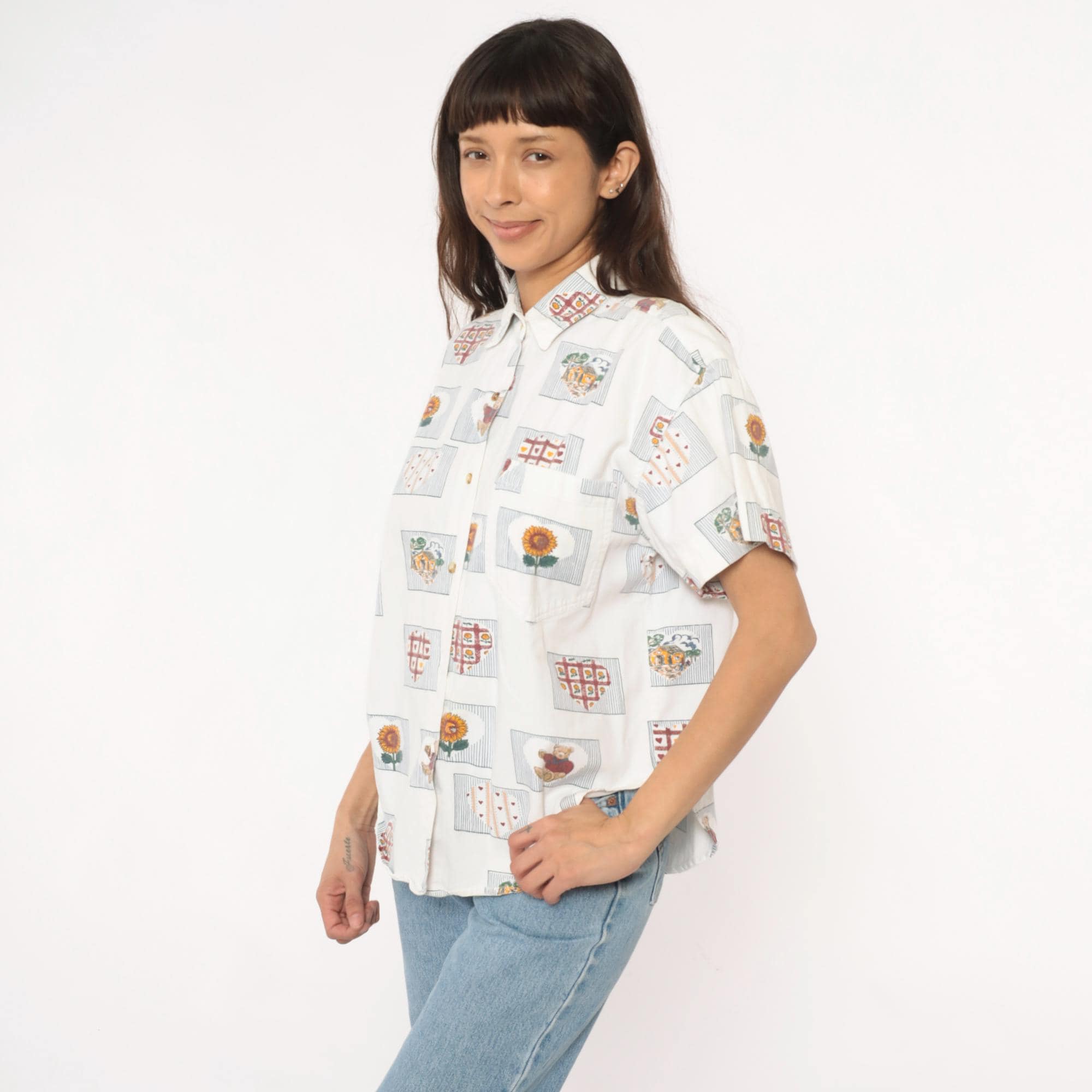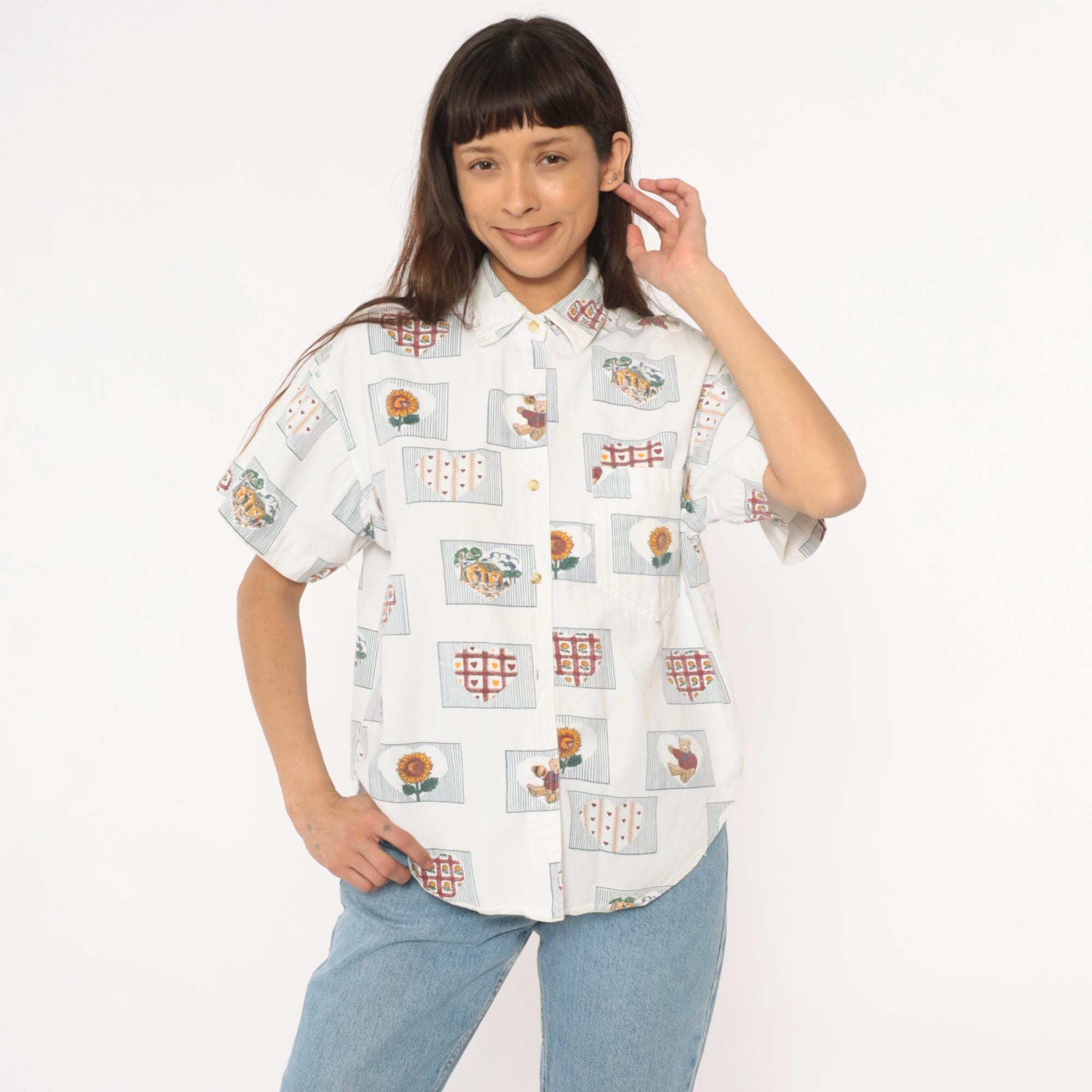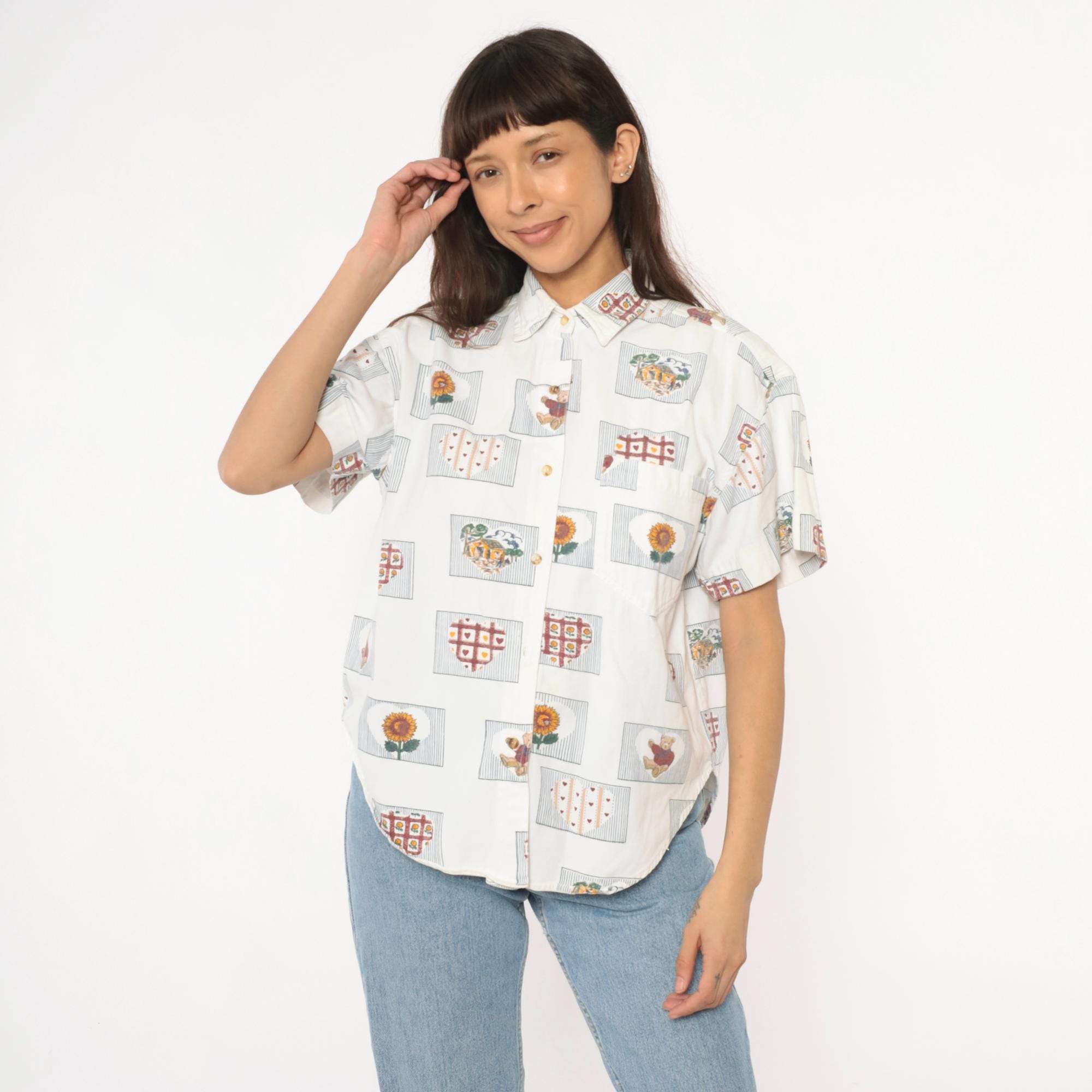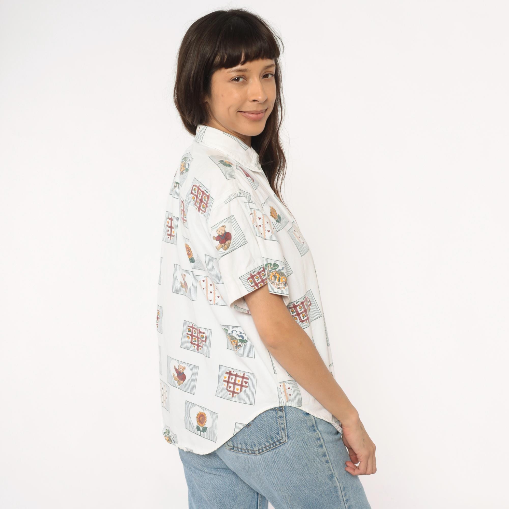 90s cream short-sleeve button-up shirt with all-over novelty print of framed motifs including sunflowers, teddy bears, heart grids, and trees. Each image sits within a rectangular frame with striped borders in burgundy, gold, green, and blue. Classic collar, button front closure, and short sleeves.
