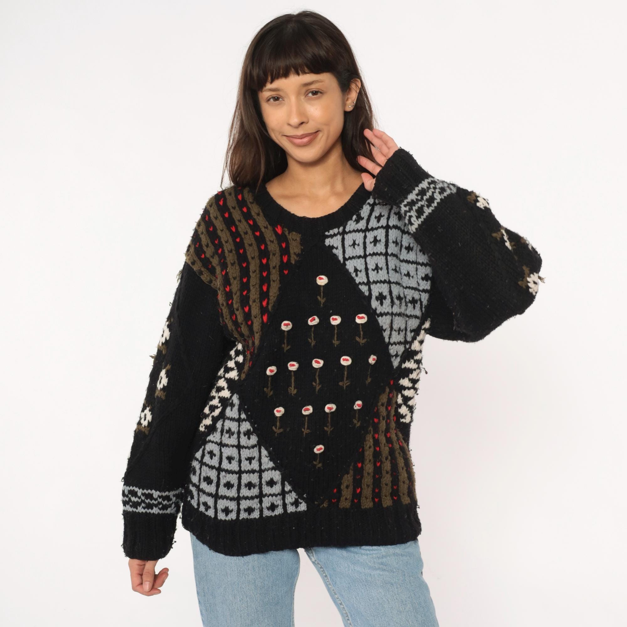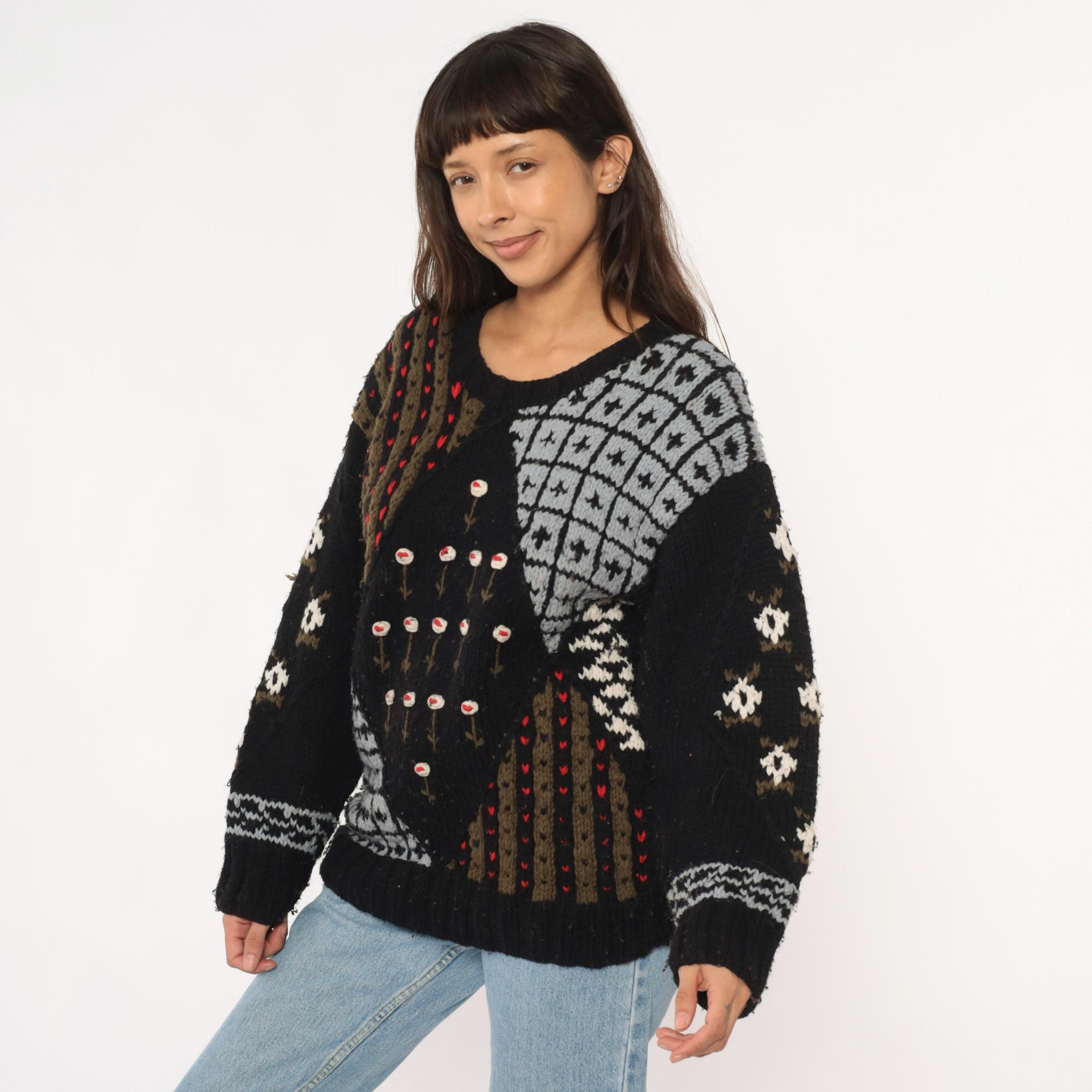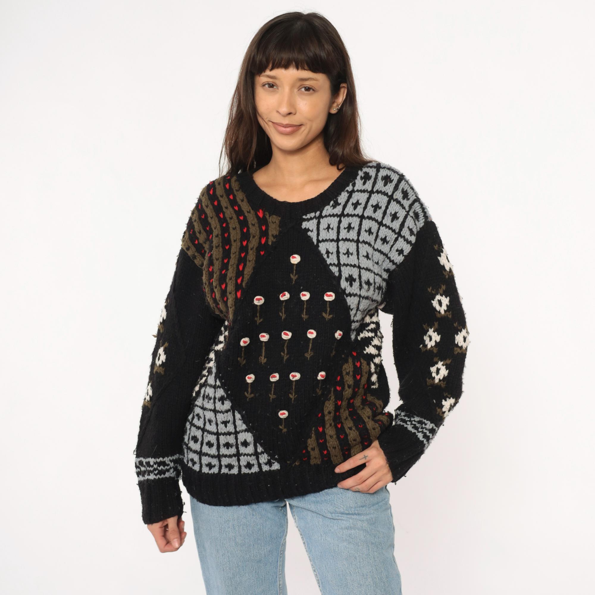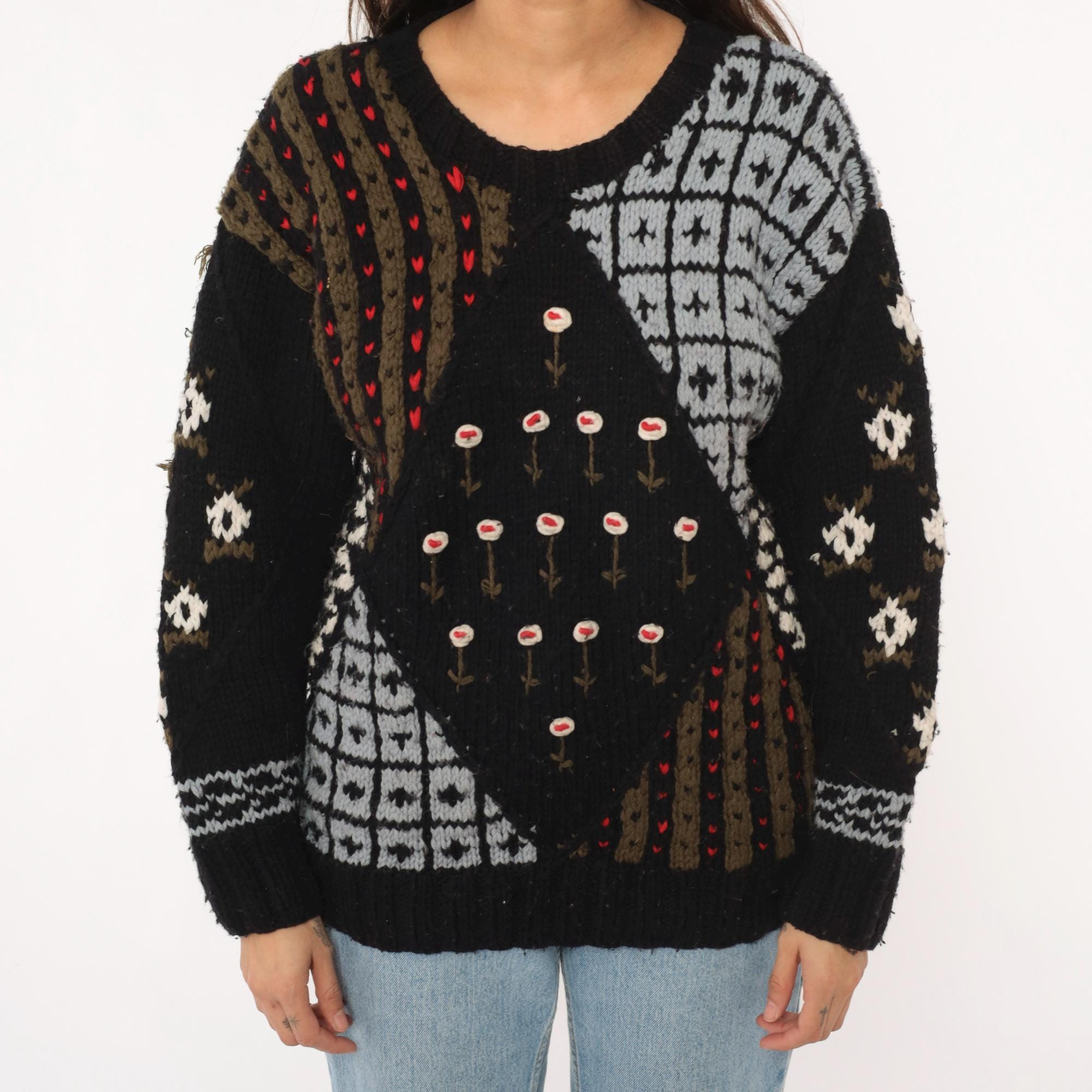 80s black patchwork sweater from midnight blues with fuzzy textured knit throughout. Geometric white and gray sections including diamond patterns and grid designs, brown and olive vertical stripes with red accent dots, and white flowers with red centers arranged across the front.