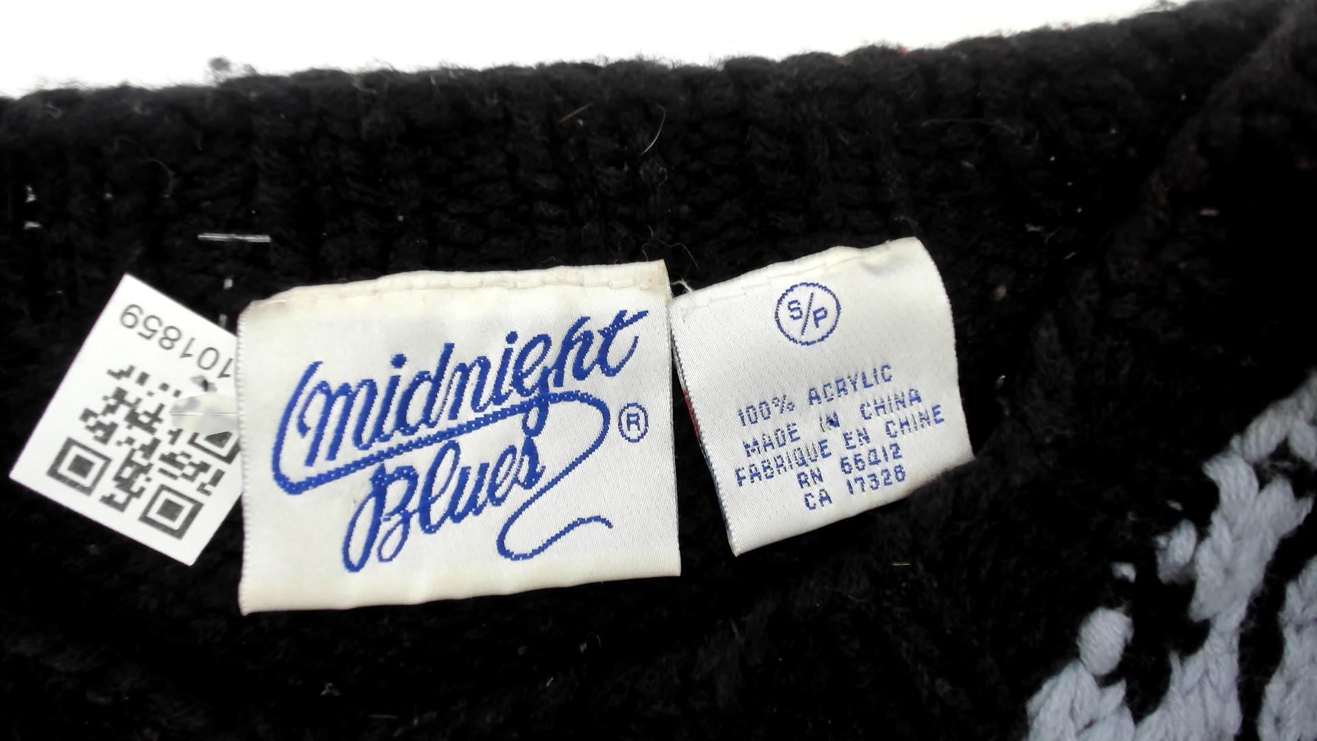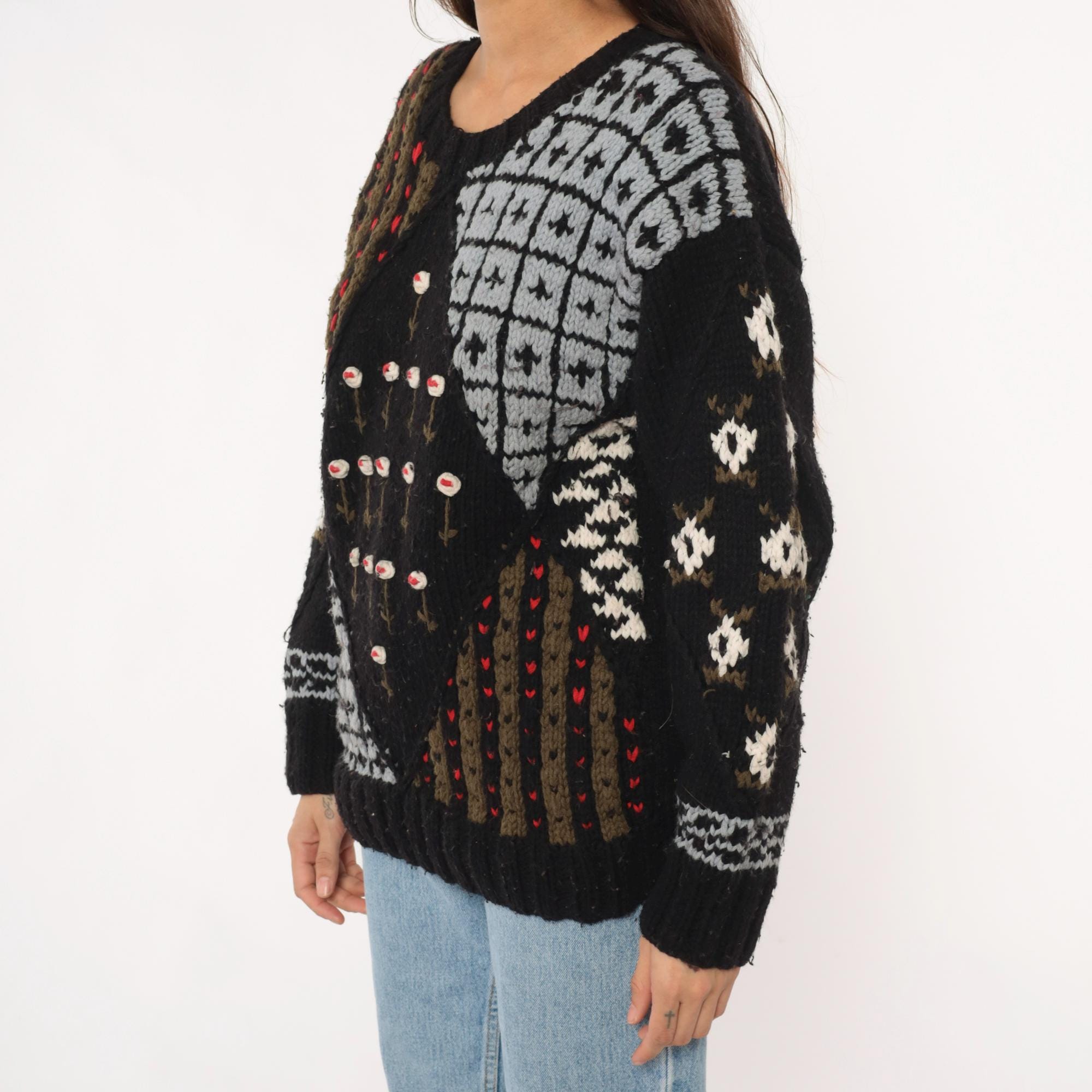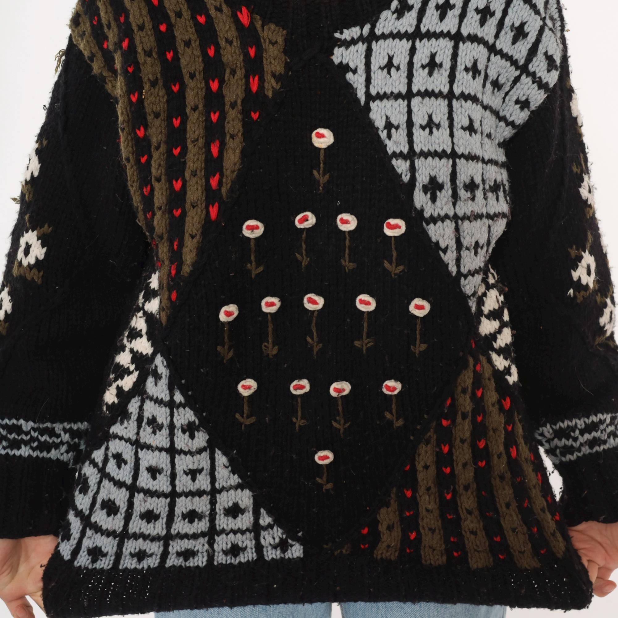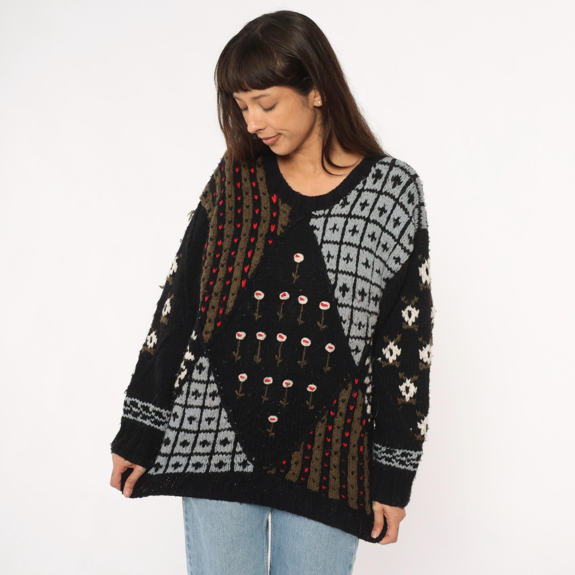 80s black patchwork sweater from midnight blues with fuzzy textured knit throughout. Geometric white and gray sections including diamond patterns and grid designs, brown and olive vertical stripes with red accent dots, and white flowers with red centers arranged across the front.