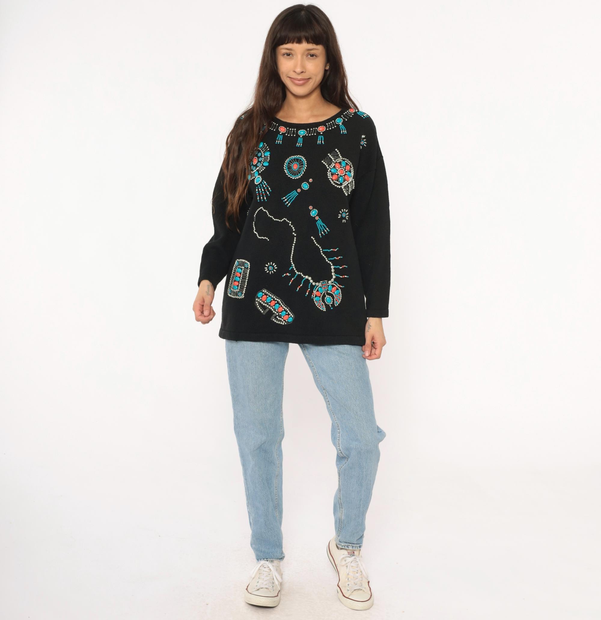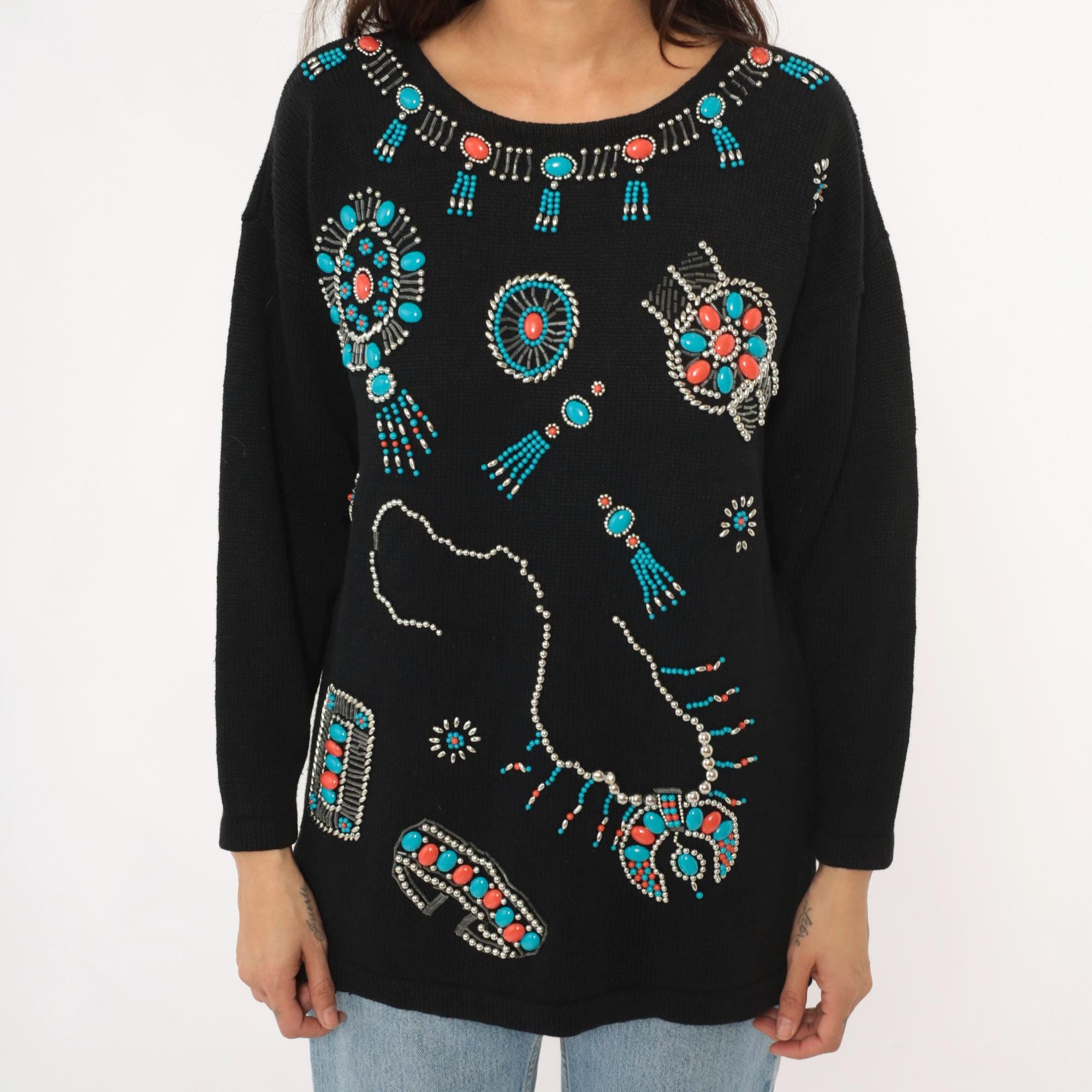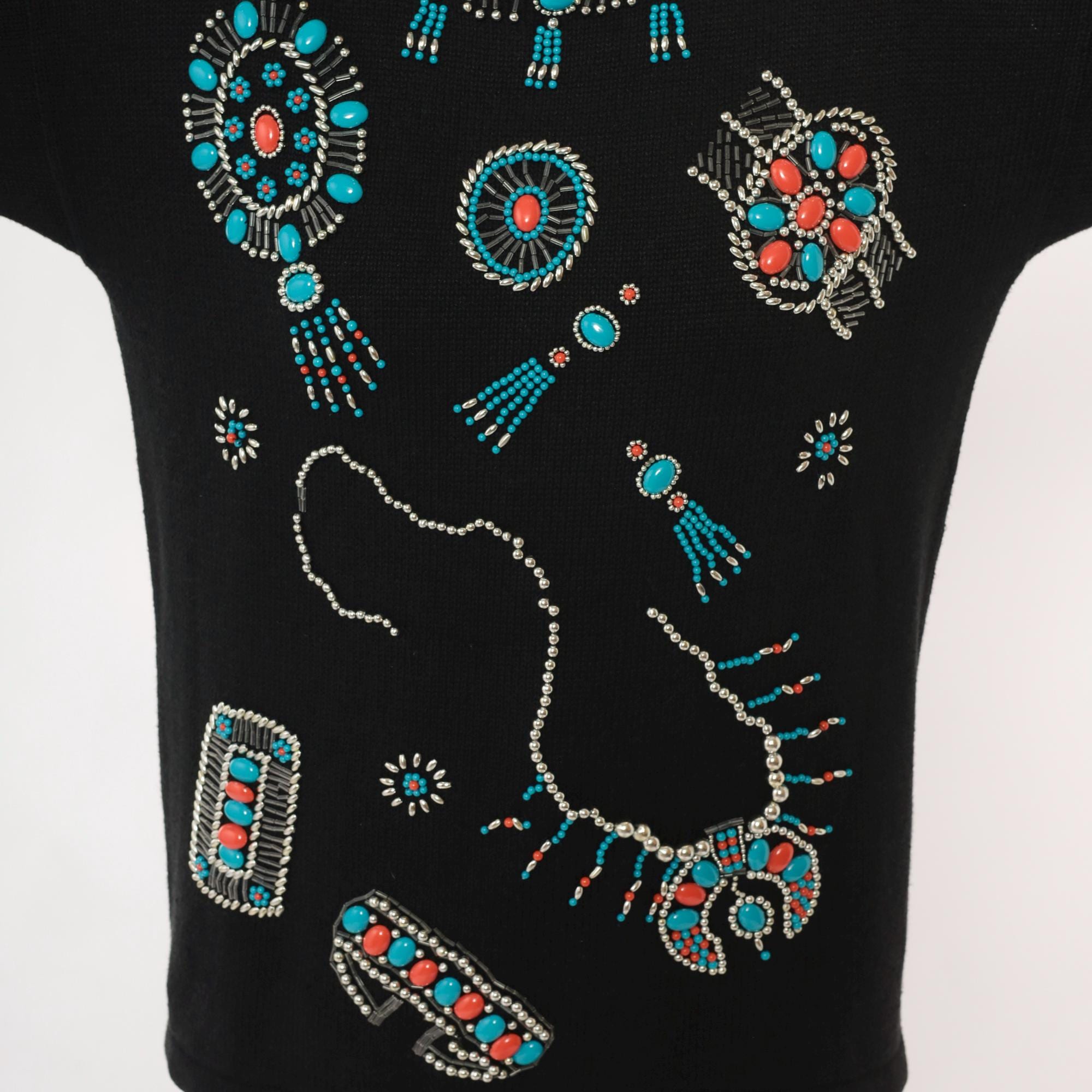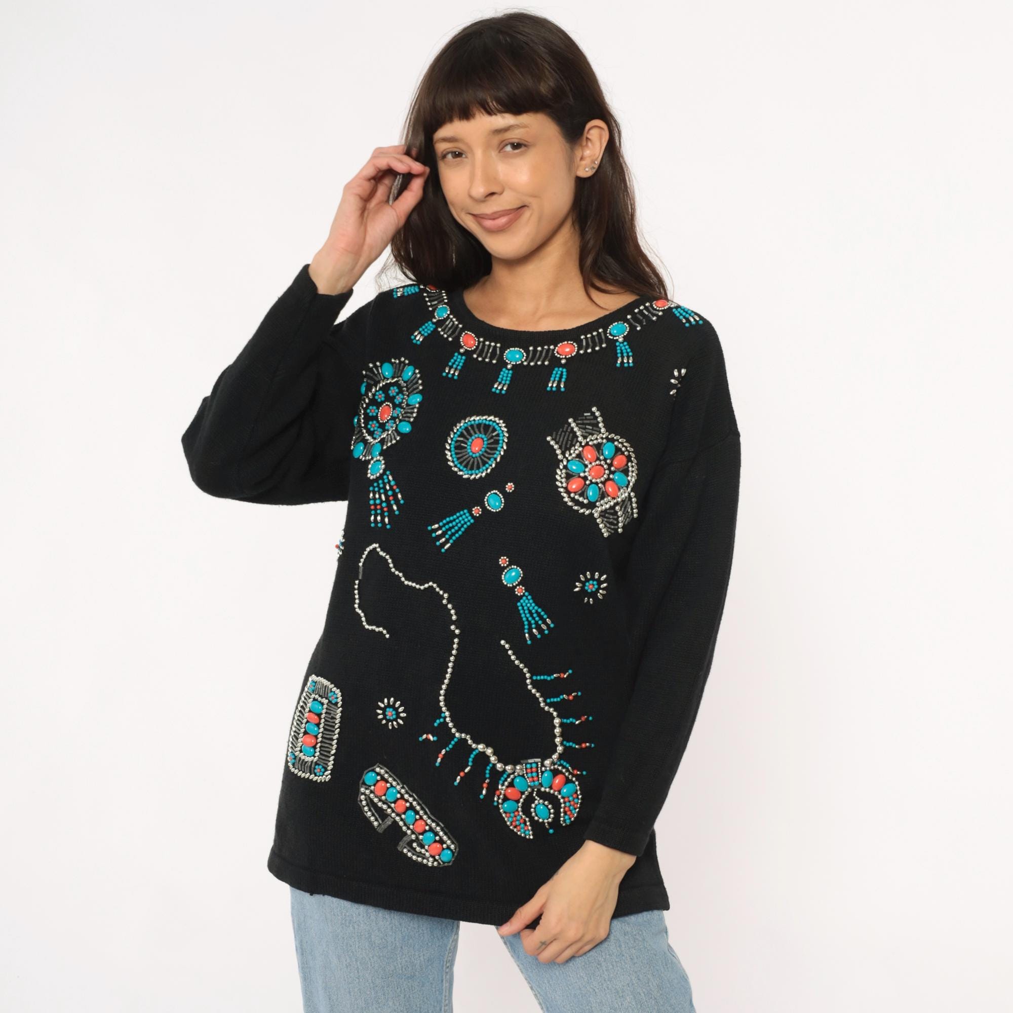 90s black sweatshirt from Victoria Jones with all-over southwestern jewelry print depicting turquoise, coral, and silver beaded designs including concho belt, squash blossom necklace, bolo tie, and coyote figure.