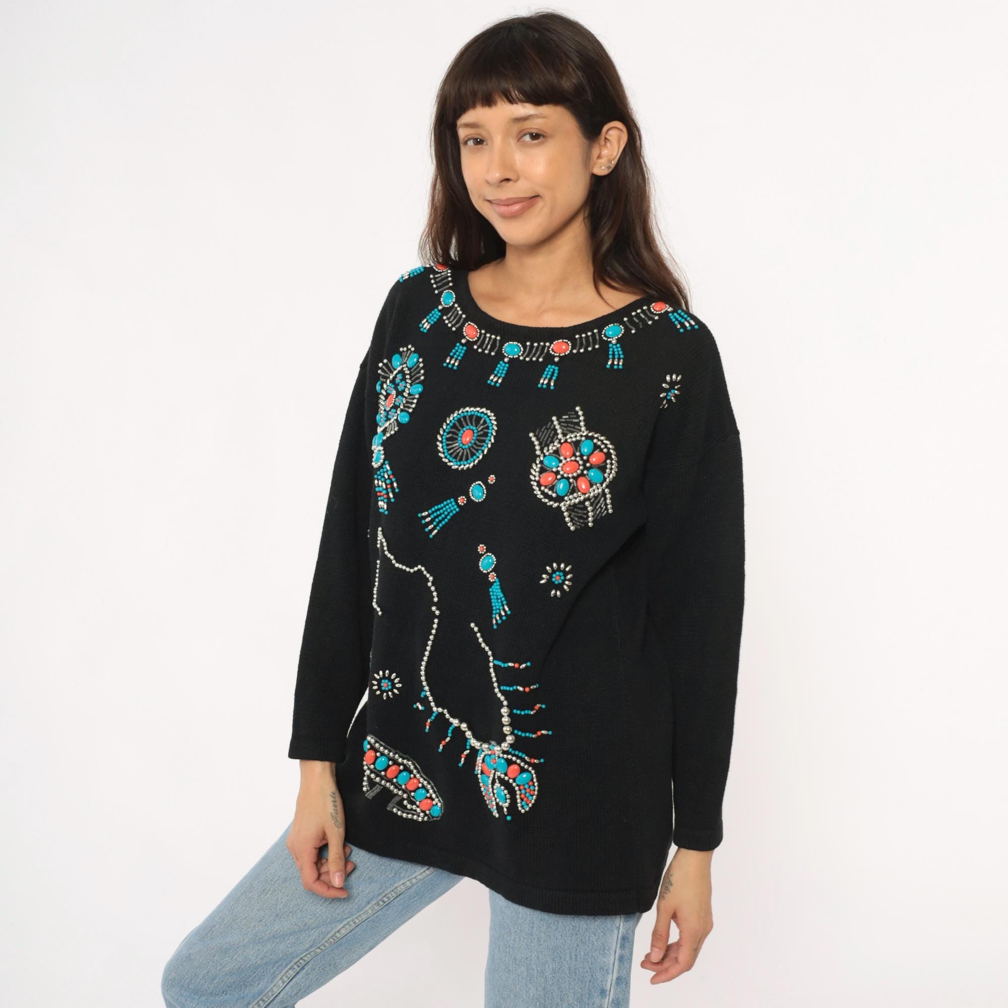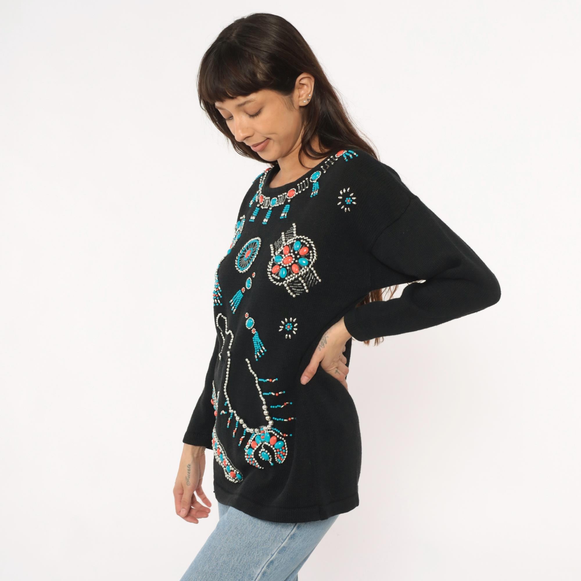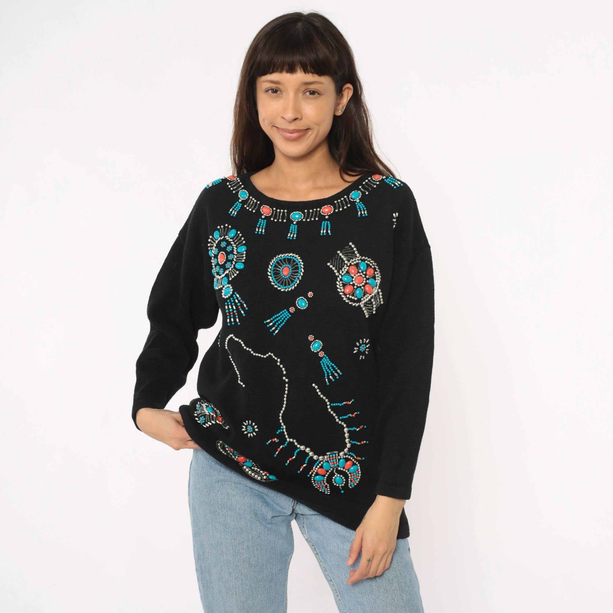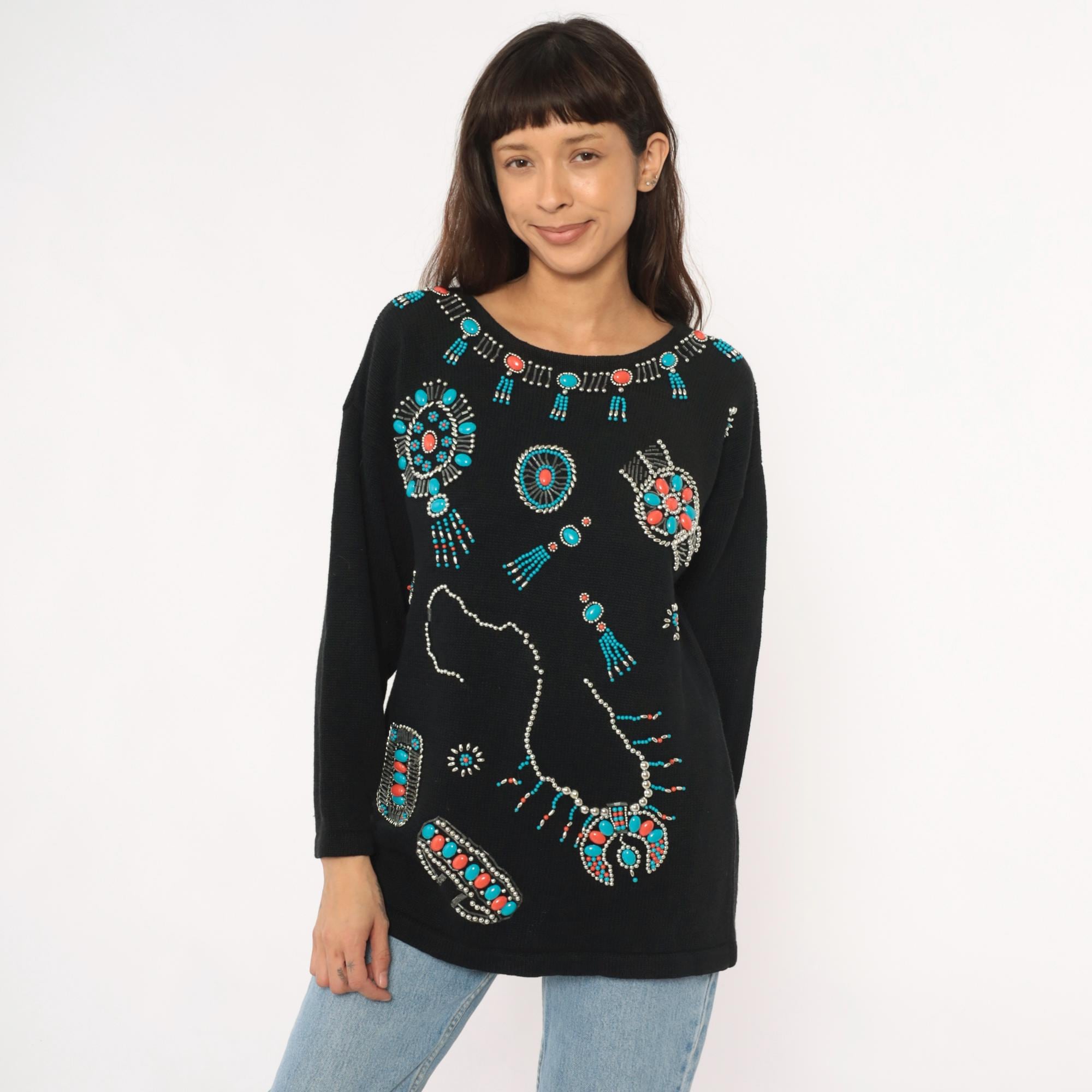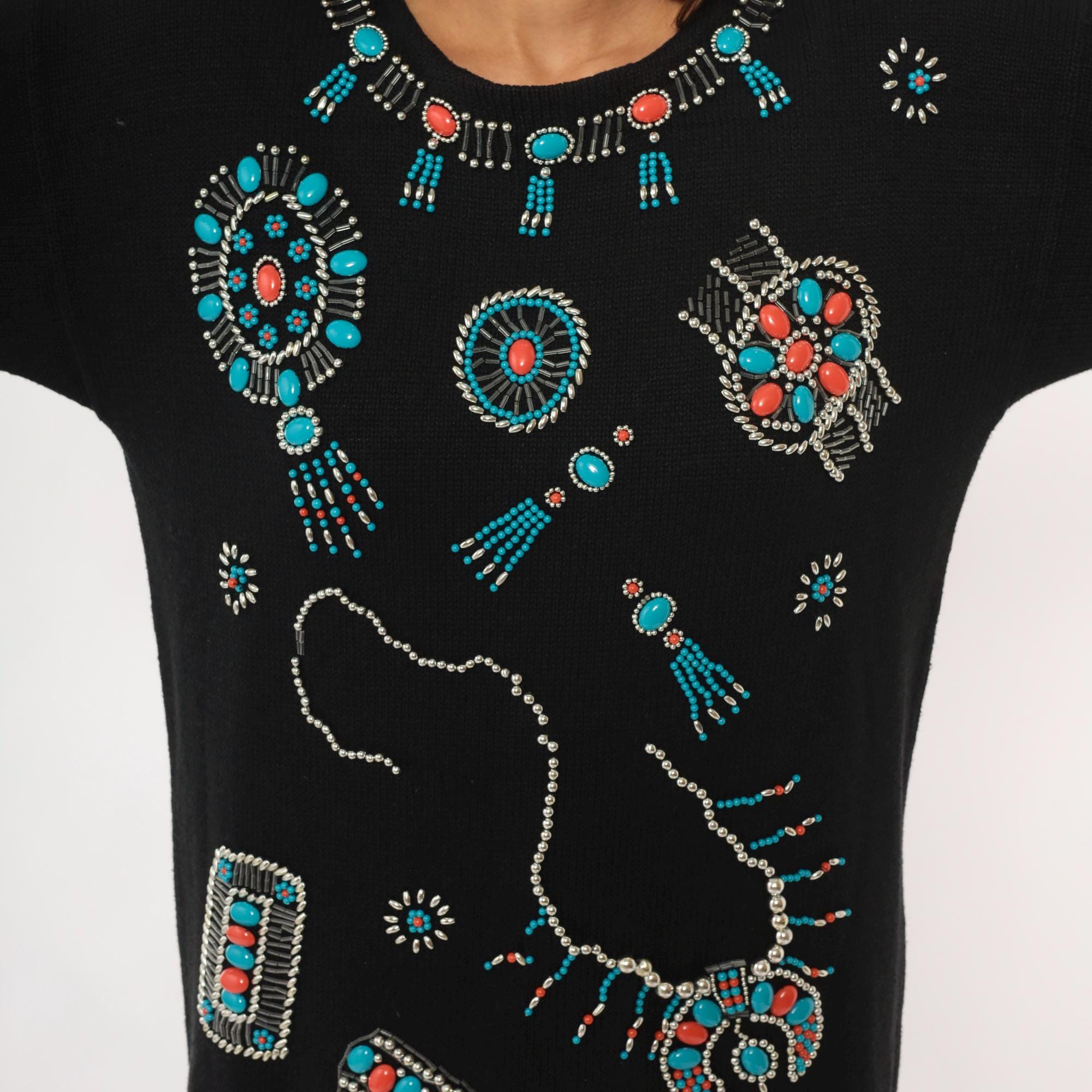 90s black sweatshirt from Victoria Jones with all-over southwestern jewelry print depicting turquoise, coral, and silver beaded designs including concho belt, squash blossom necklace, bolo tie, and coyote figure.