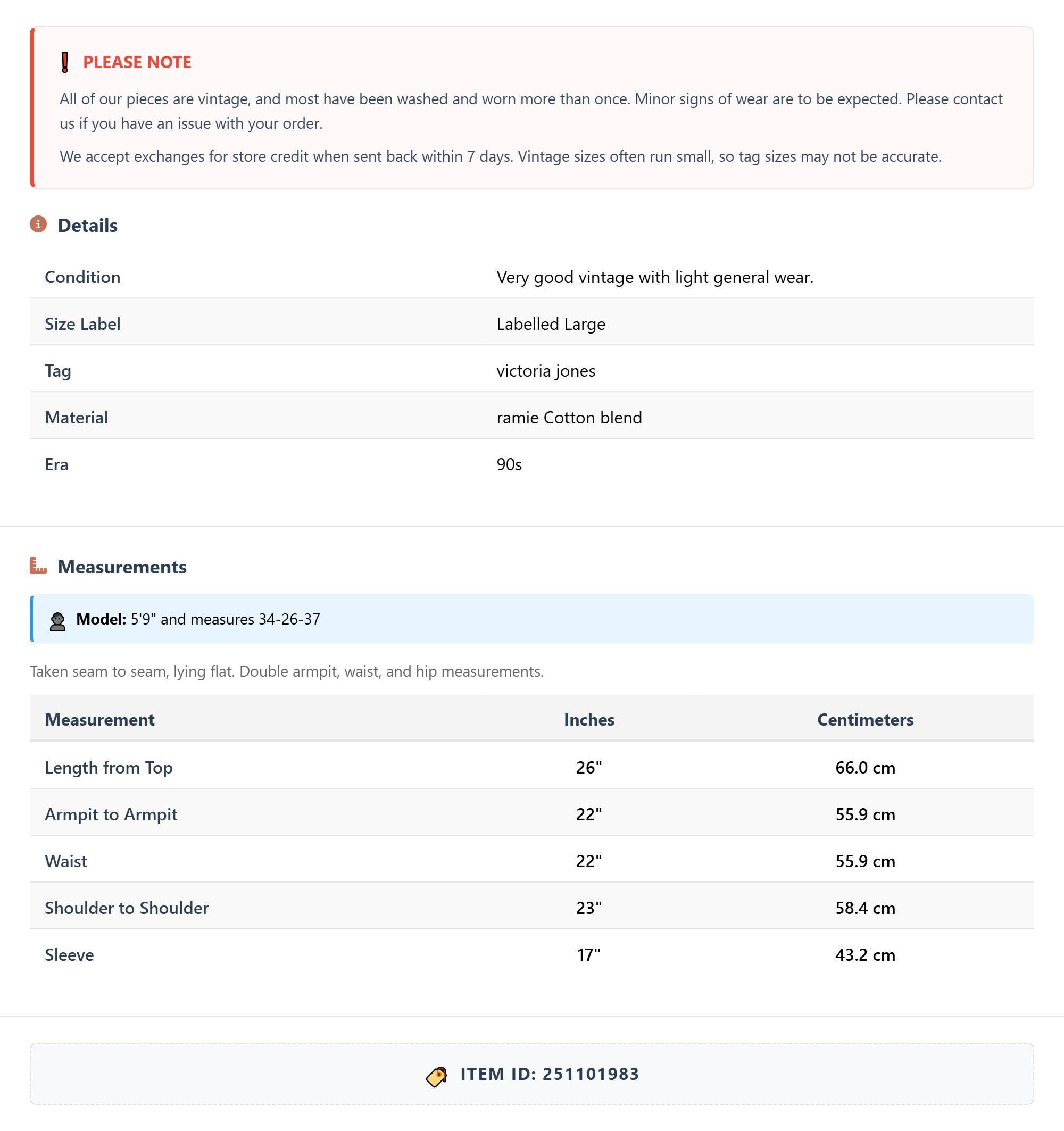 All of our pieces are vintage, and most have been washed and worn more than once. Minor signs of wear are to be expected. Please contact us if you have an issue with your order. We accept exchanges for store credit when sent back within 7 days.