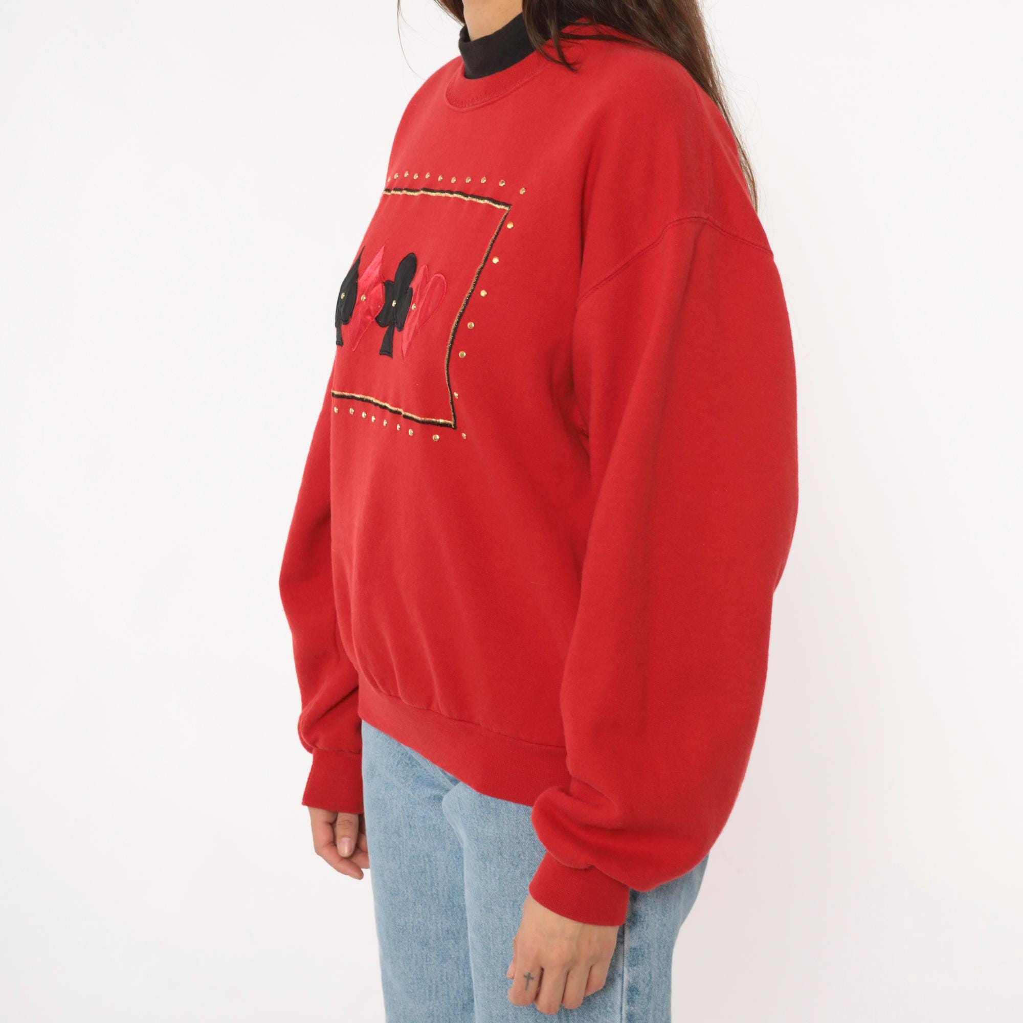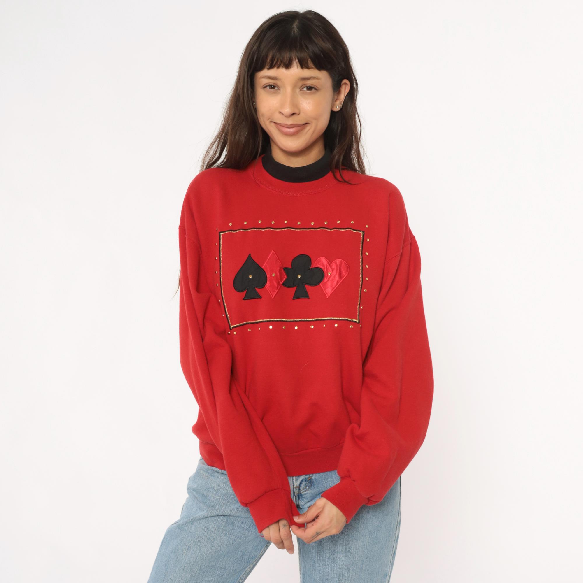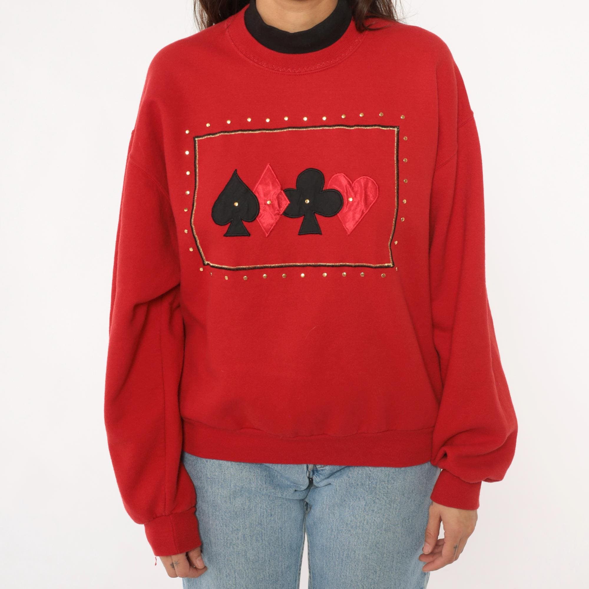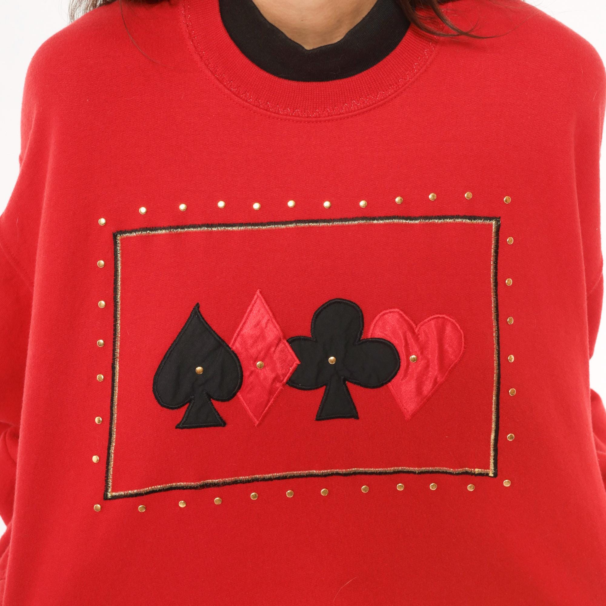 90s red sweatshirt from jerzees with playing card suit appliqués and casino theme design. Black satin spade and club appliqués, red satin diamond and heart appliqués on front within gold metallic stud border, card suits also on back.
