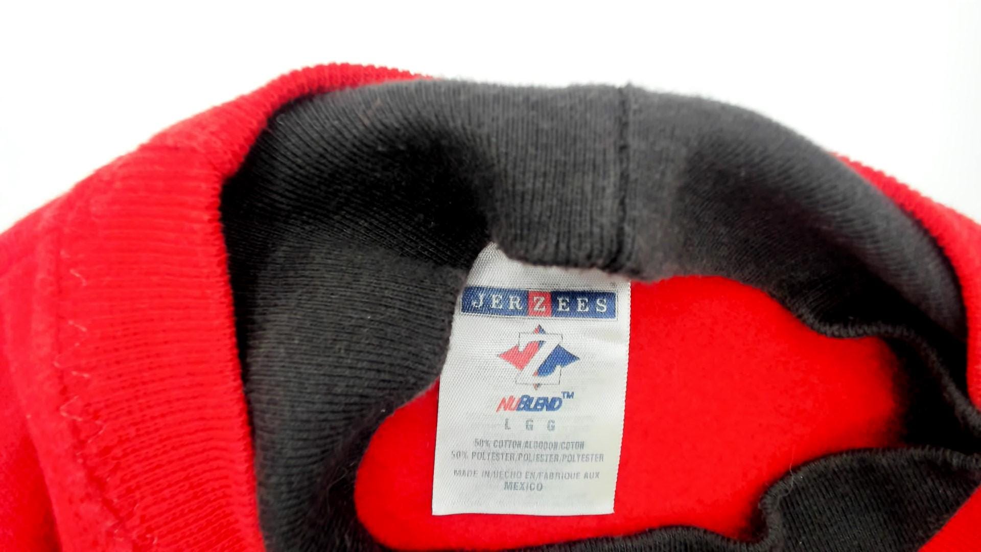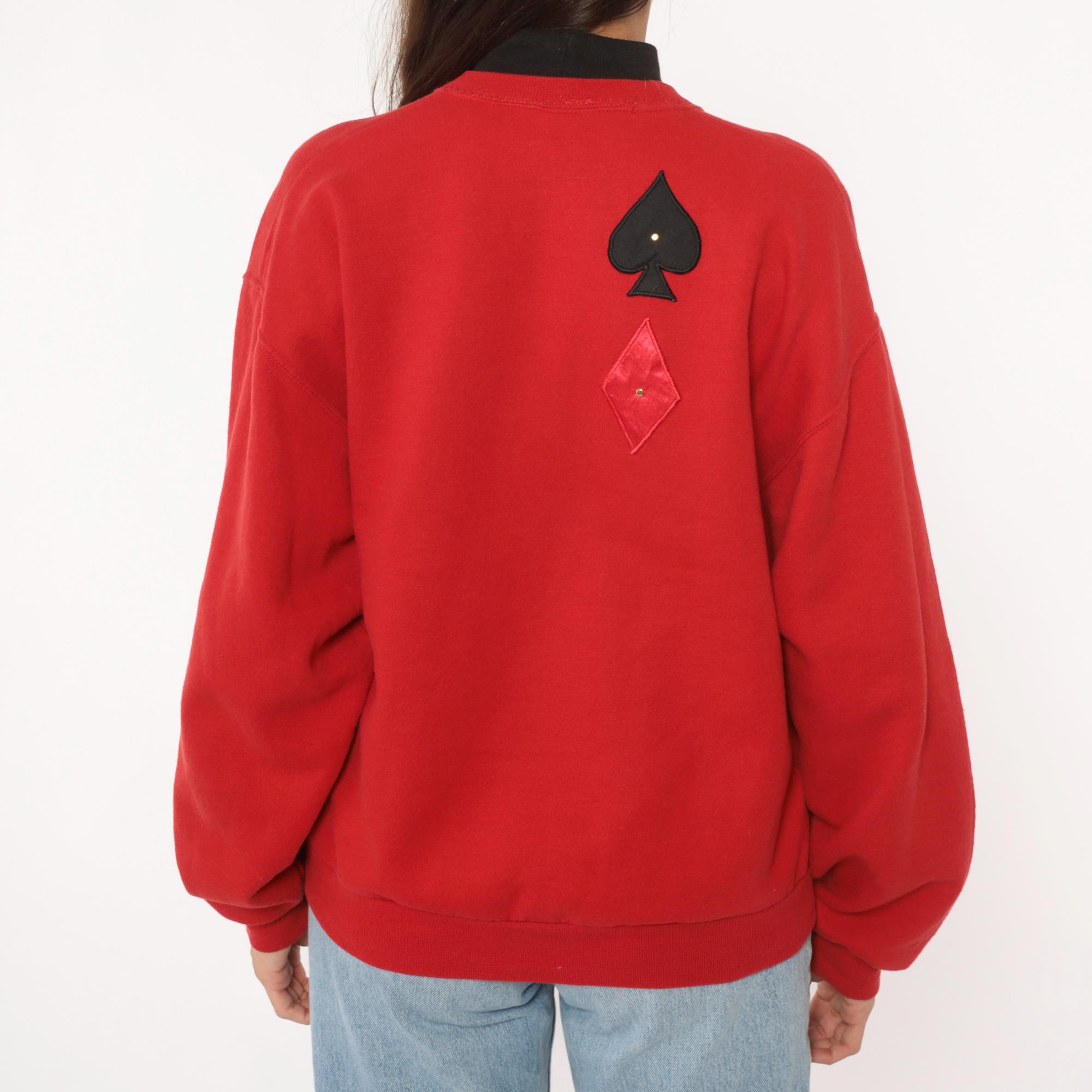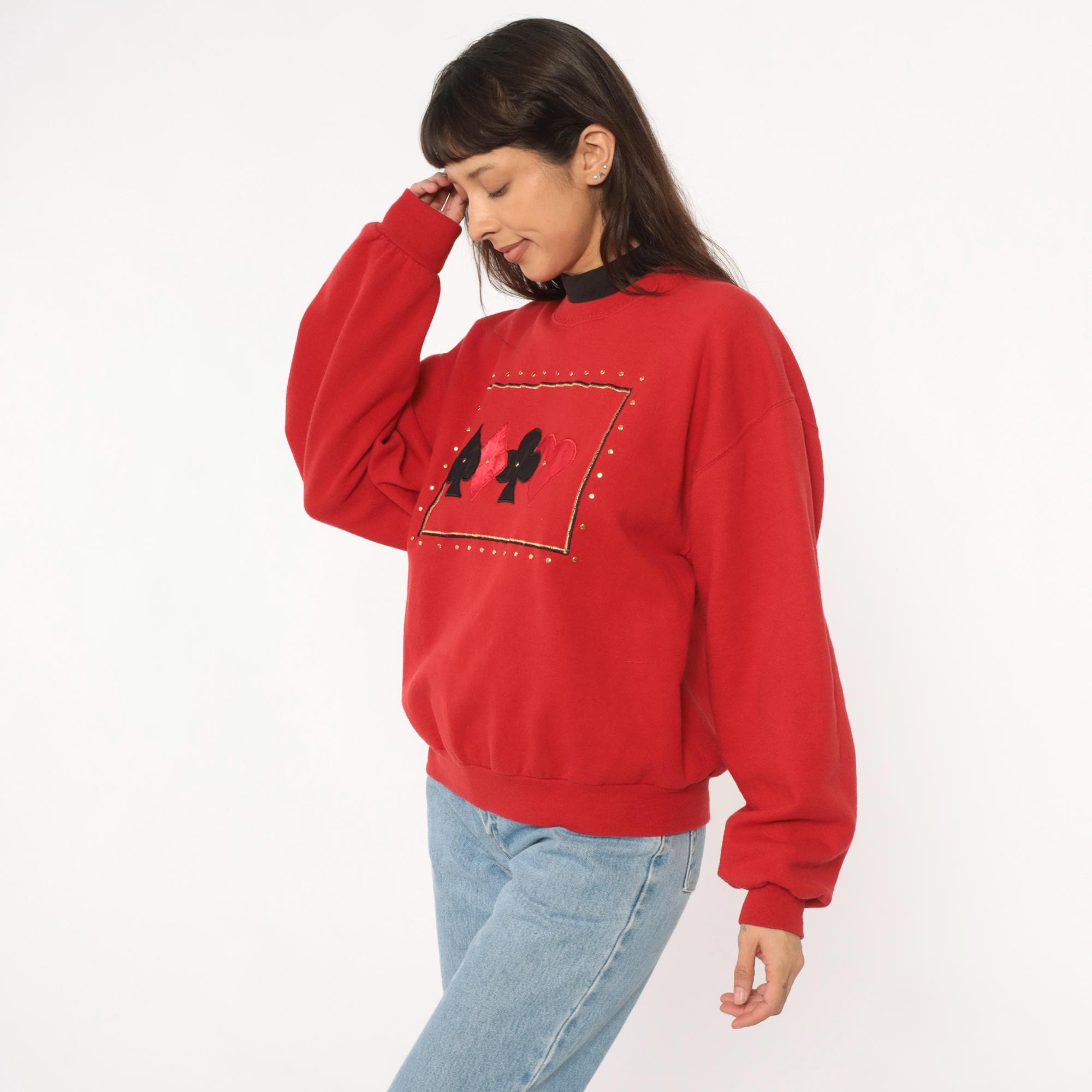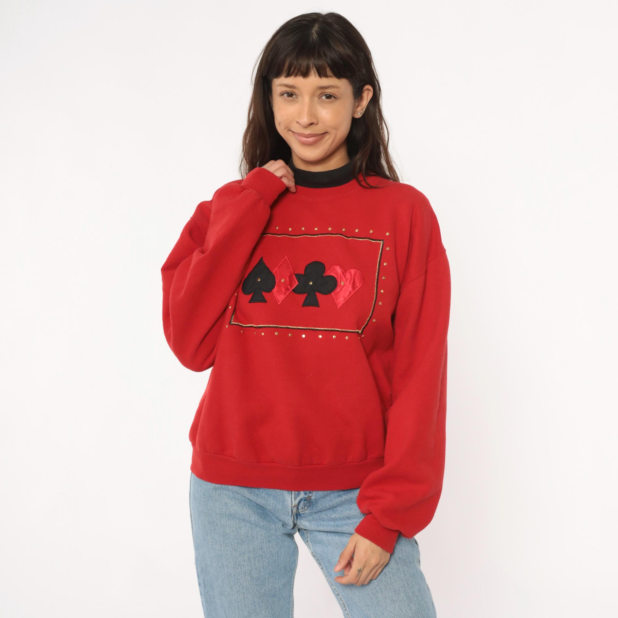 90s red sweatshirt from jerzees with playing card suit appliqués and casino theme design. Black satin spade and club appliqués, red satin diamond and heart appliqués on front within gold metallic stud border, card suits also on back.