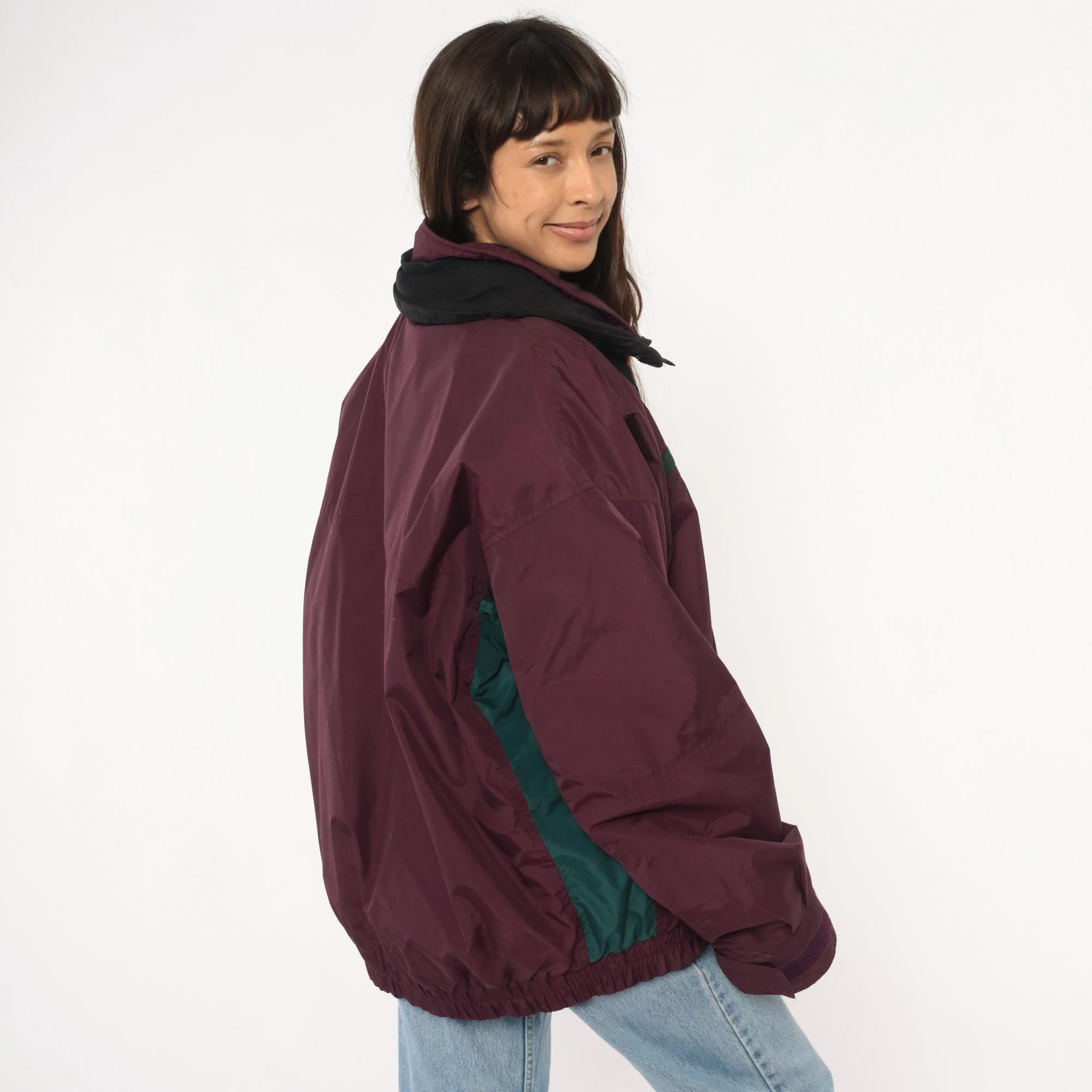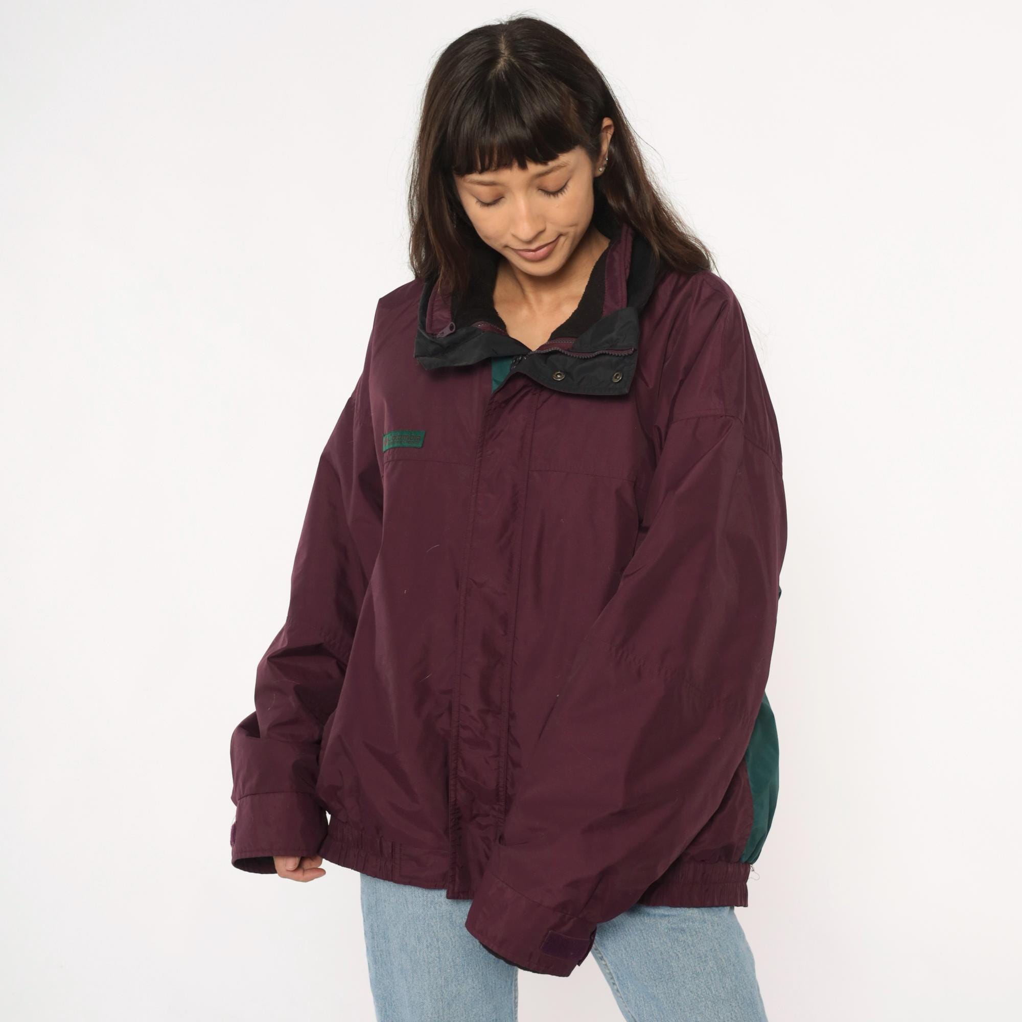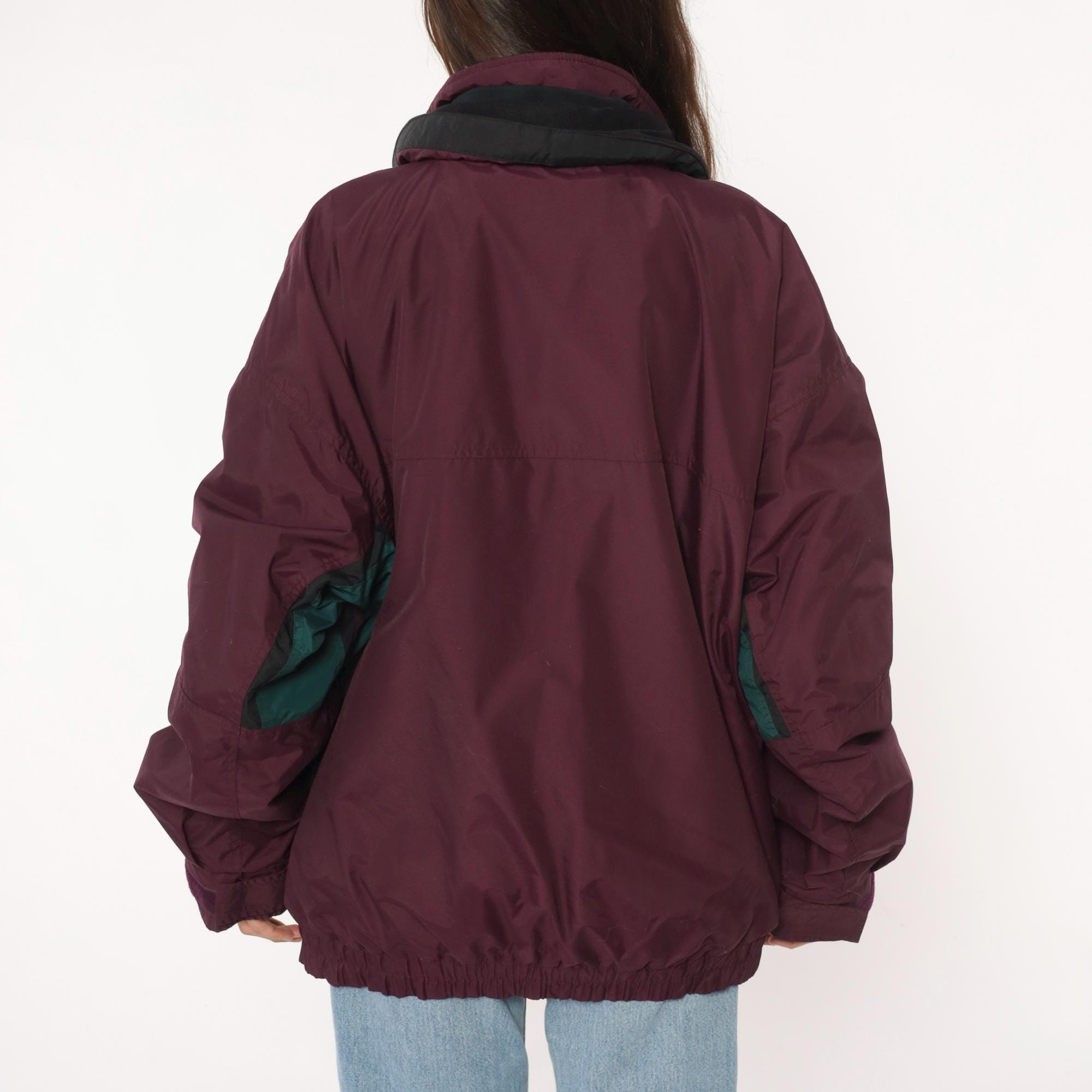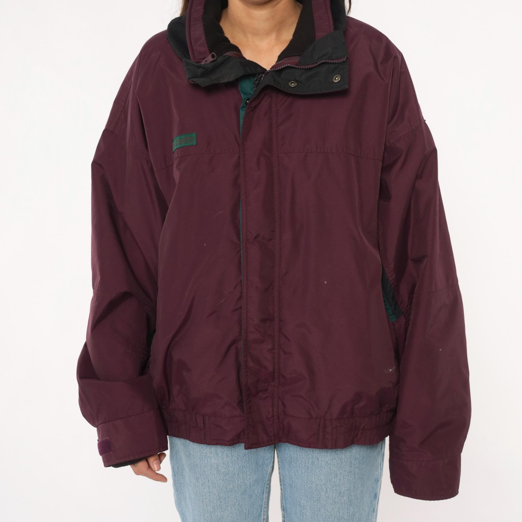 90s burgundy windbreaker from Columbia with dark green contrast panels on sleeves and full zip front closure. Black collar with hood, elastic cuffs and hem, side pockets.