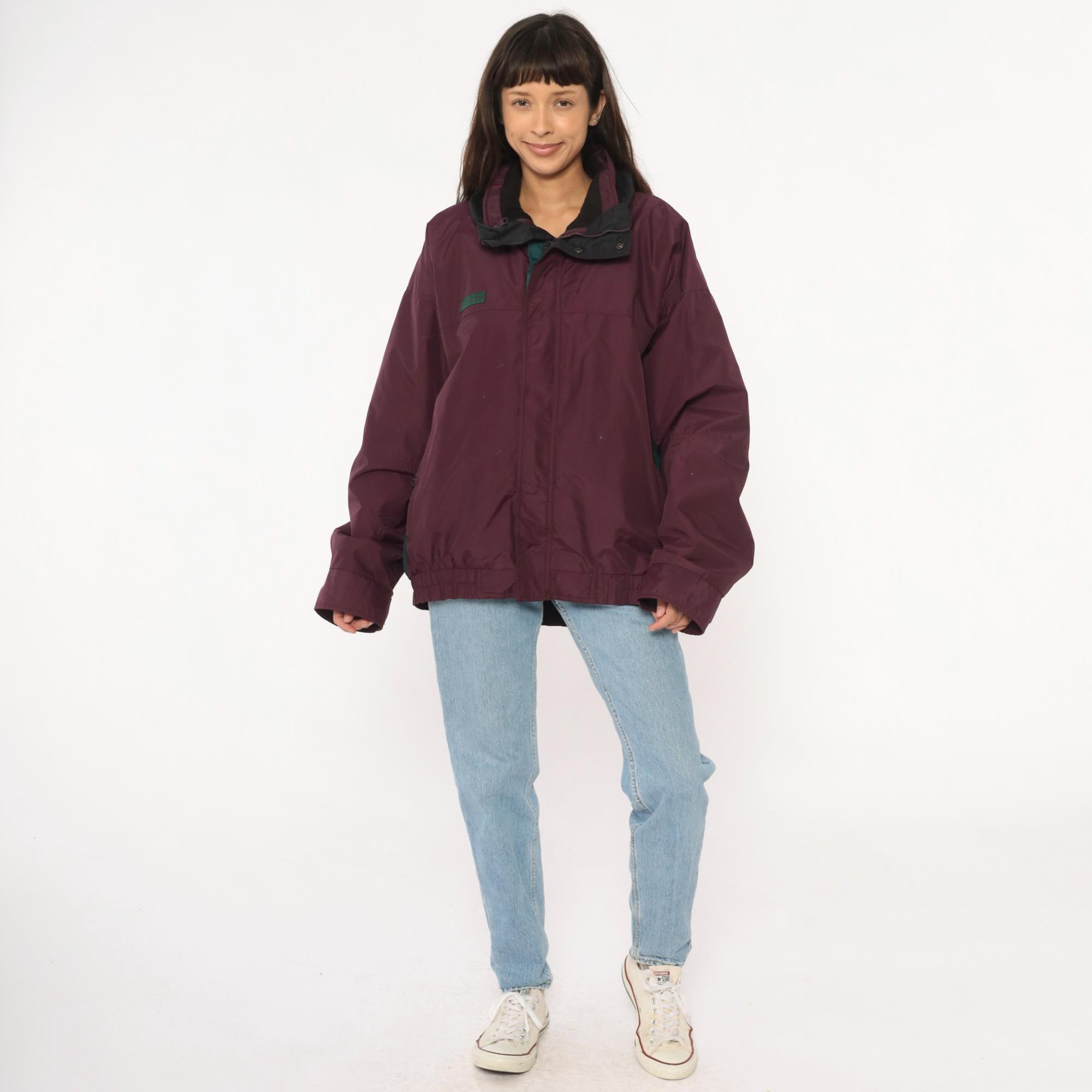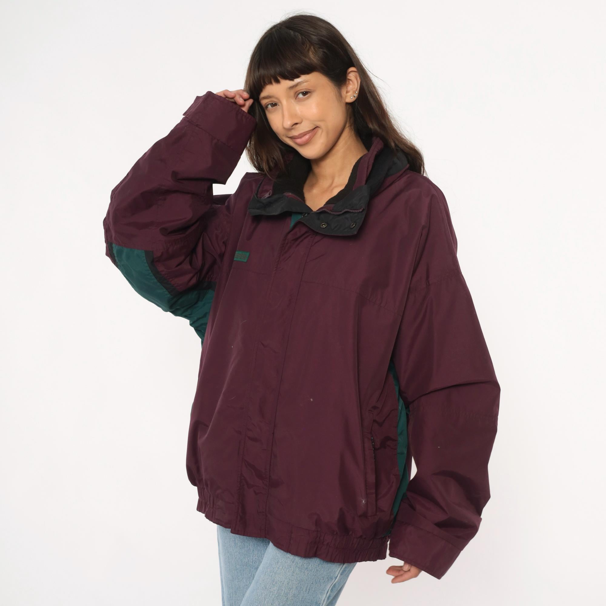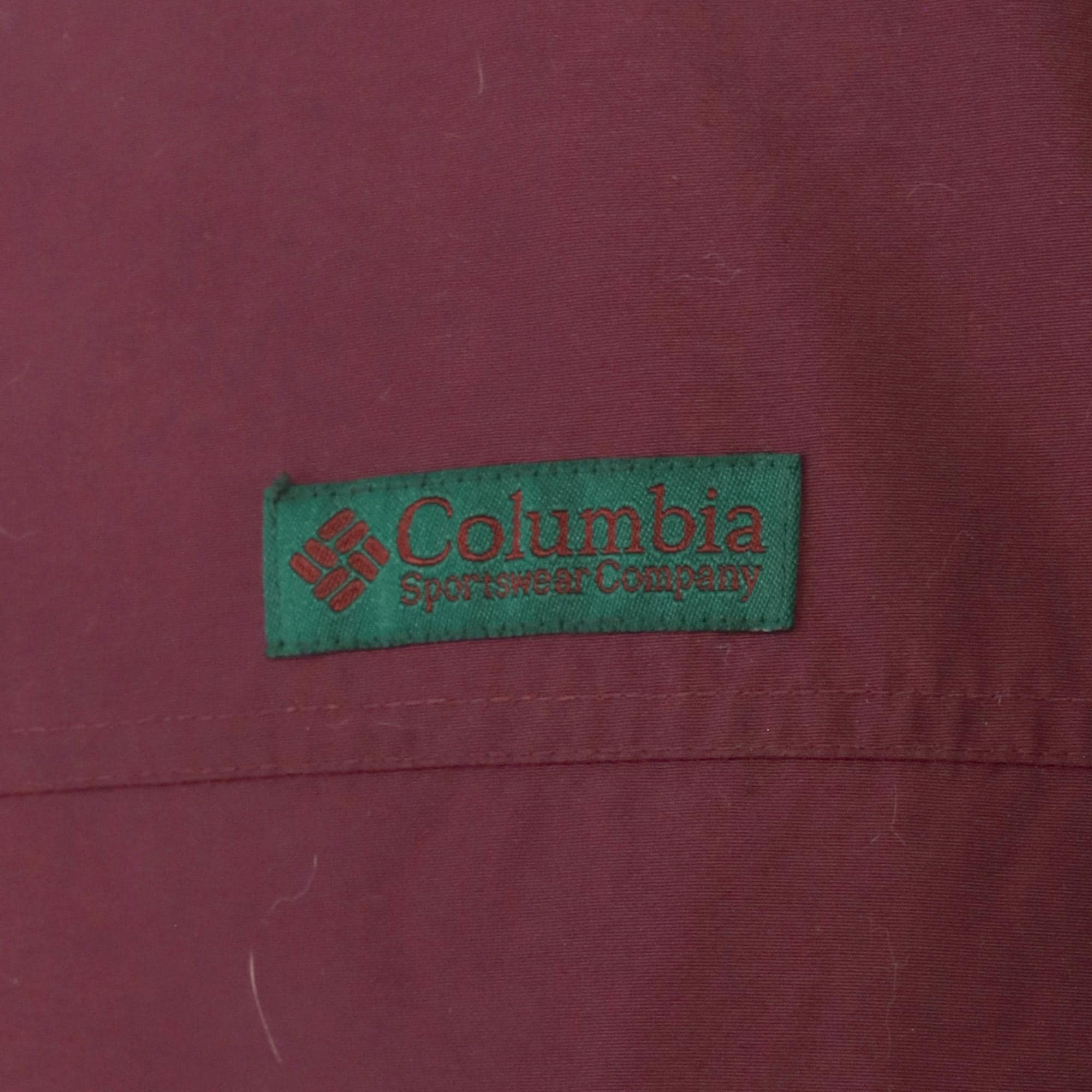 90s burgundy windbreaker from Columbia with dark green contrast panels on sleeves and full zip front closure. Black collar with hood, elastic cuffs and hem, side pockets.