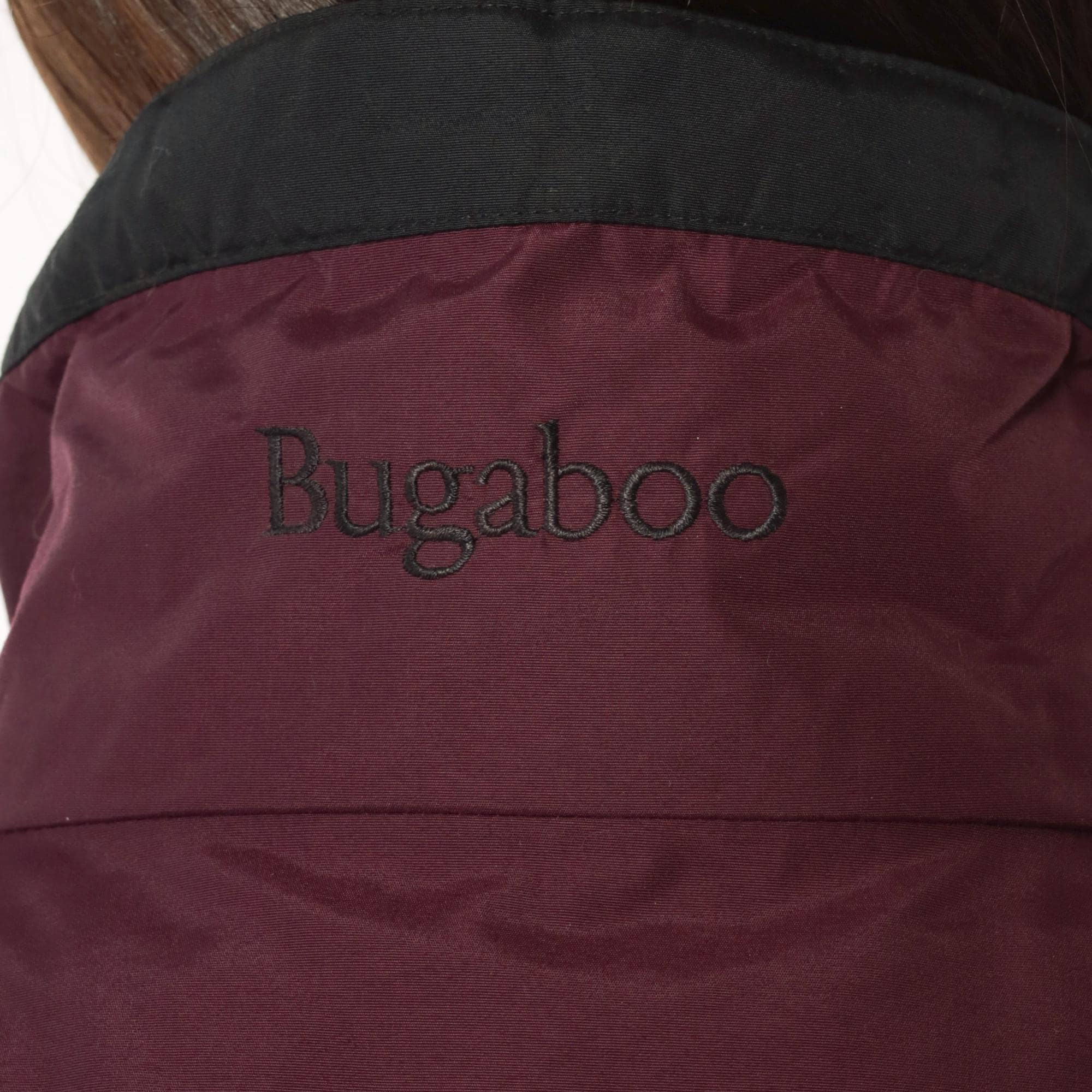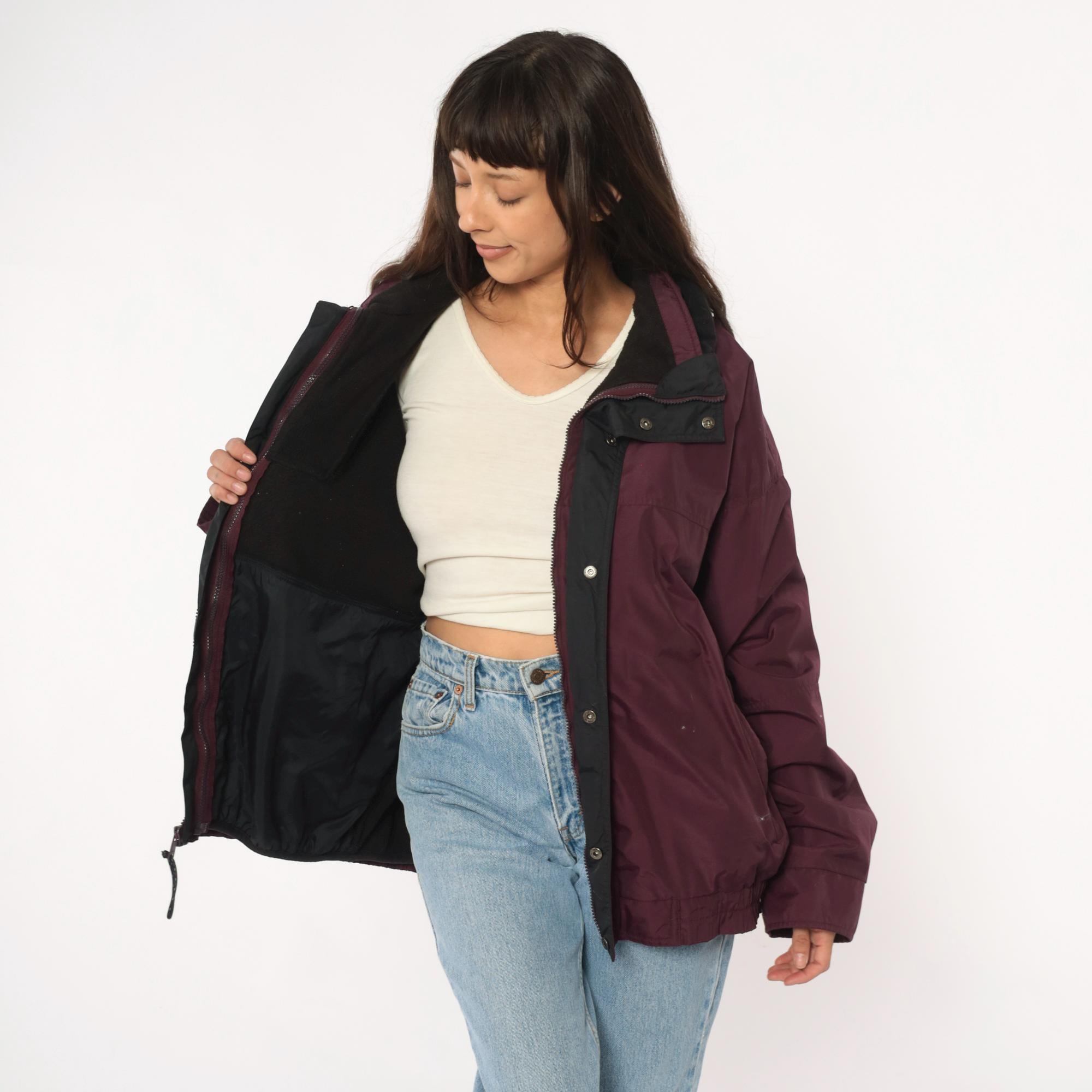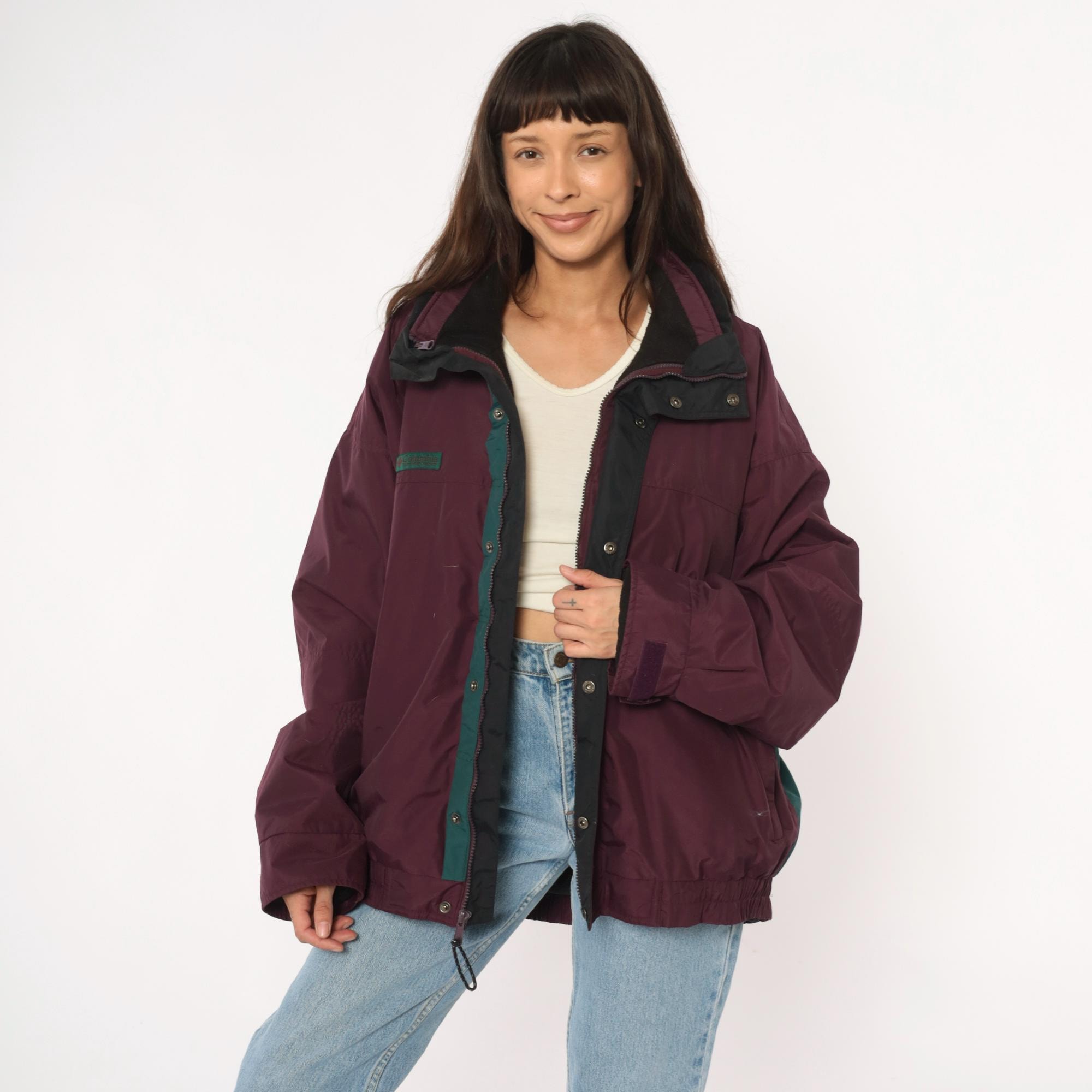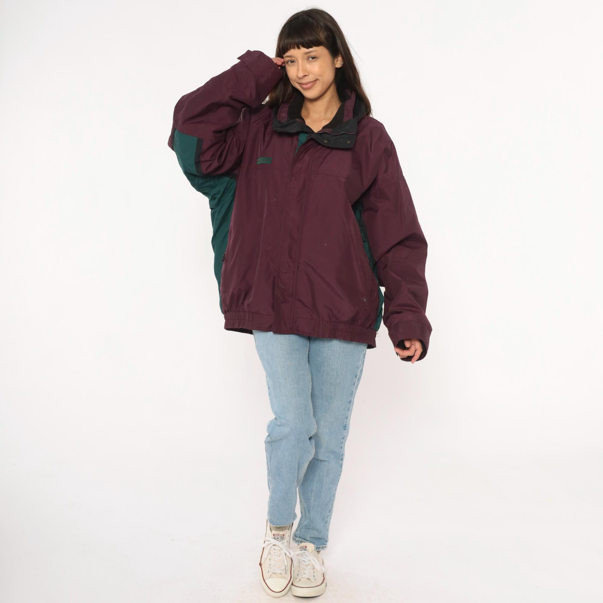 90s burgundy windbreaker from Columbia with dark green contrast panels on sleeves and full zip front closure. Black collar with hood, elastic cuffs and hem, side pockets.