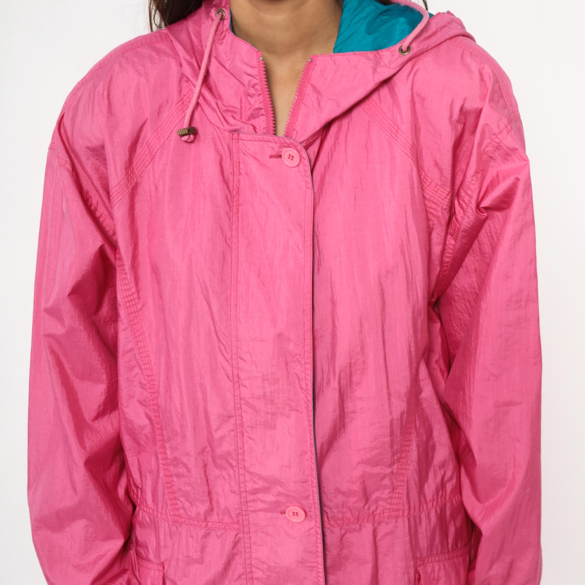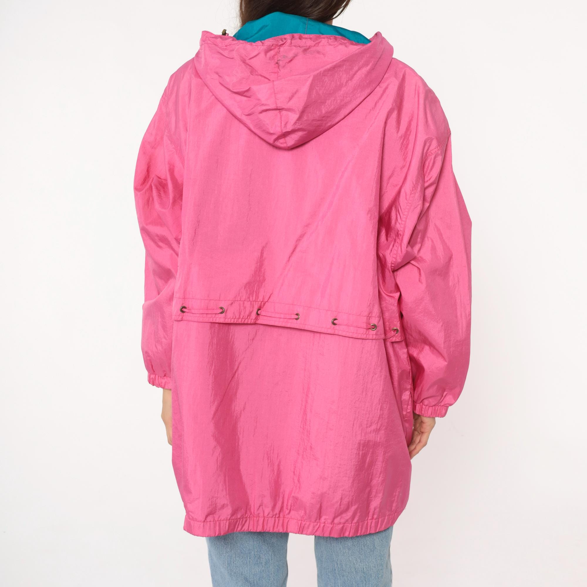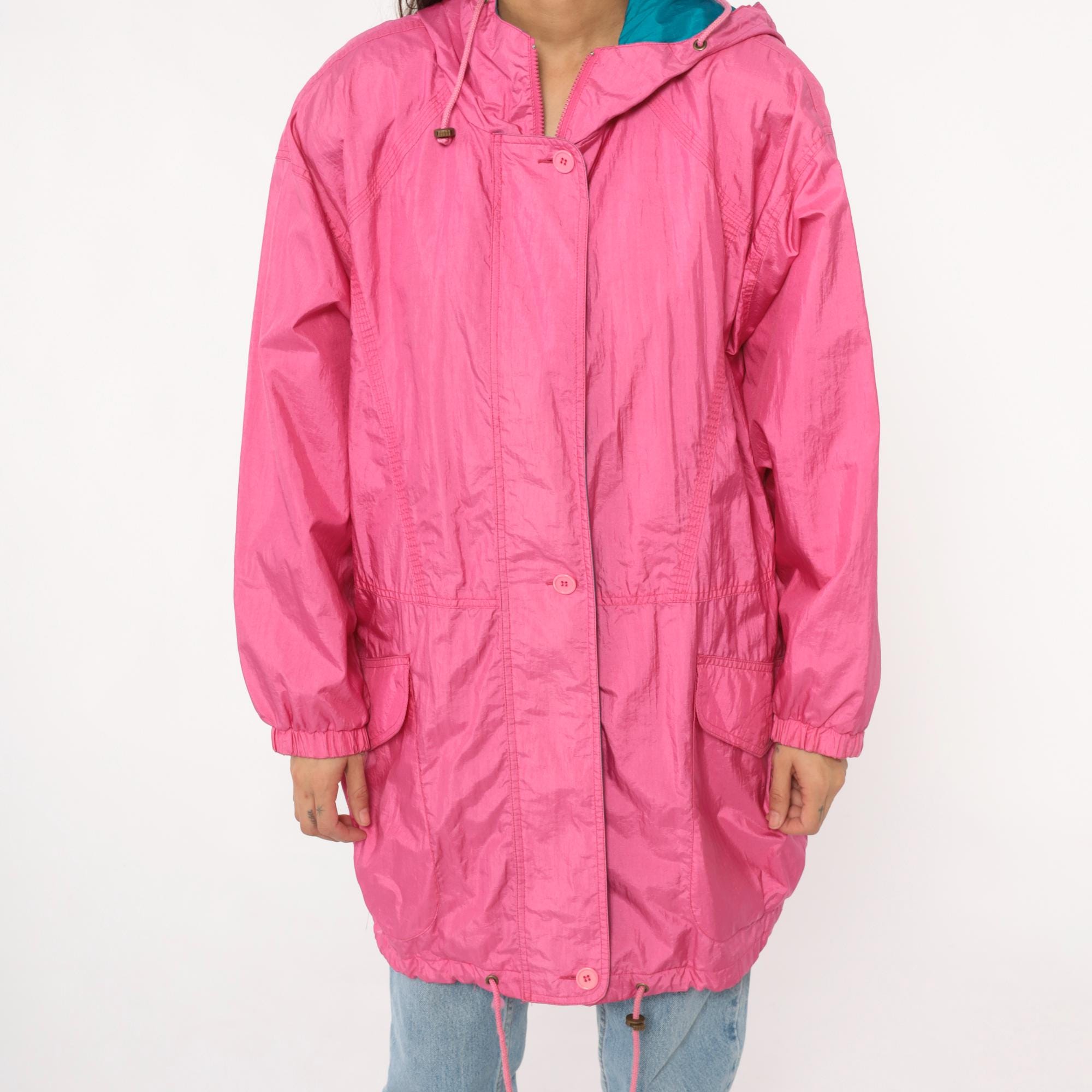 90s bubblegum pink windbreaker from Cabin Creek with teal lining visible at hood interior. Button front closure with hood and drawstring, elastic cuffs at sleeves, gathered elastic waist with drawstring ties. Two front patch pockets, extended length past hip.